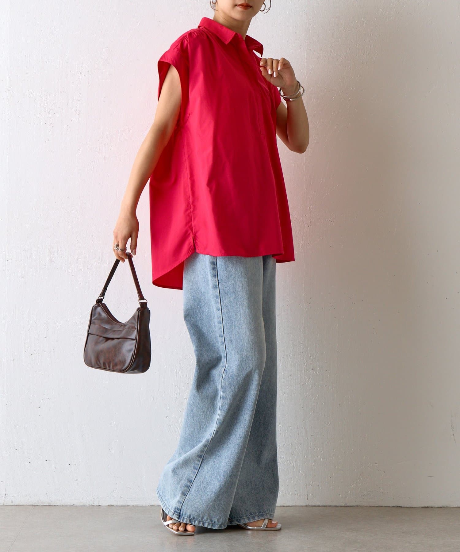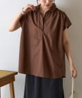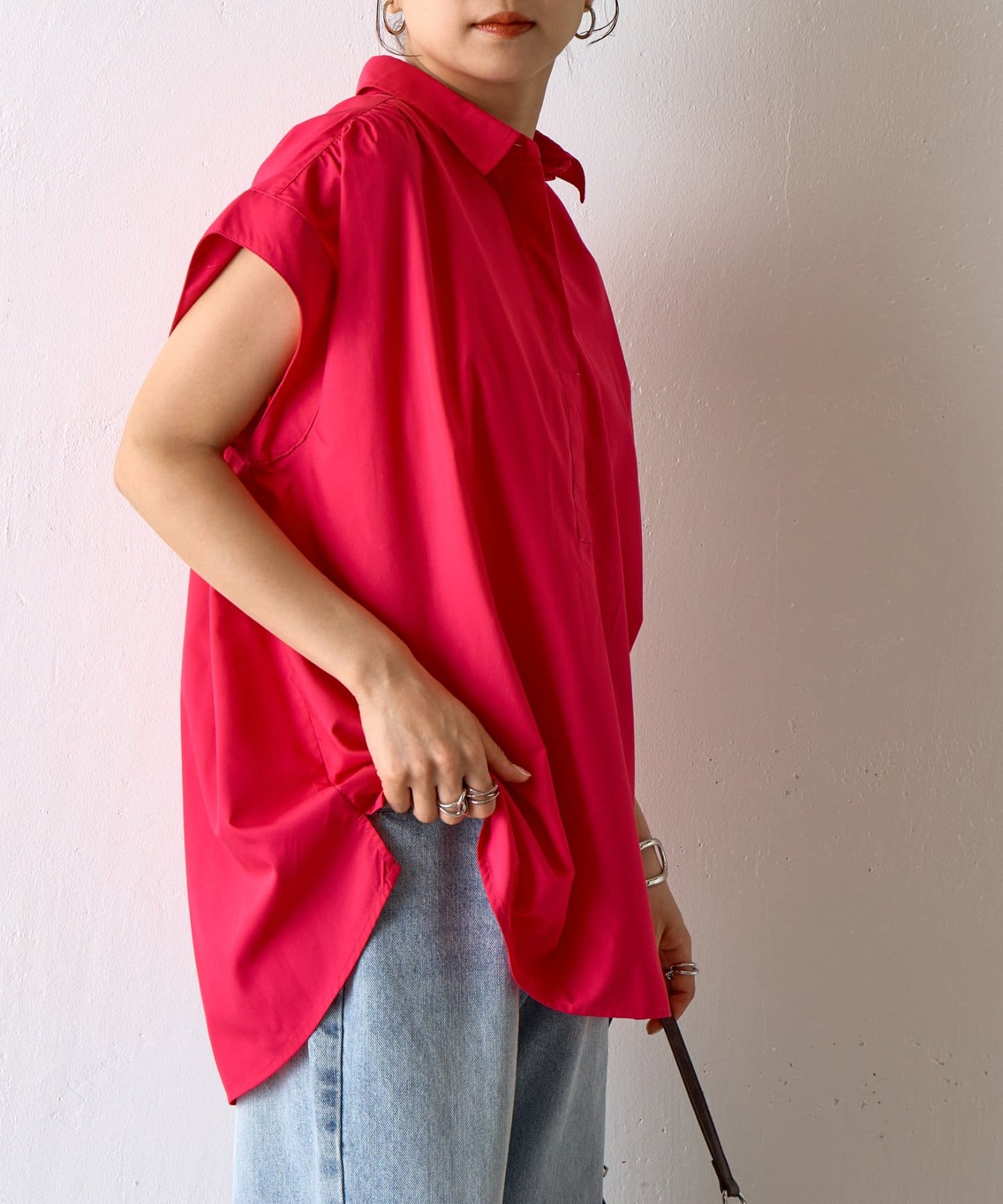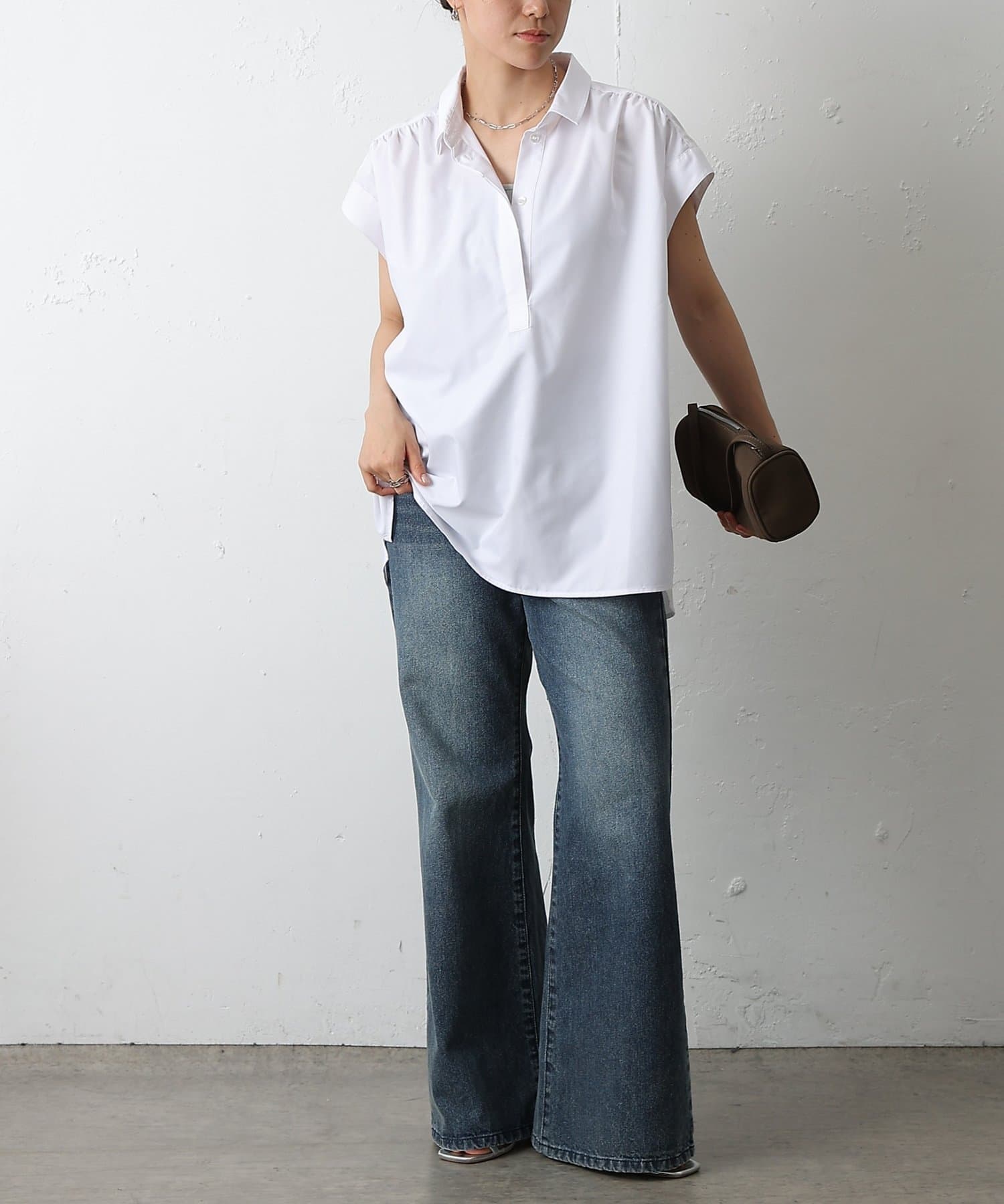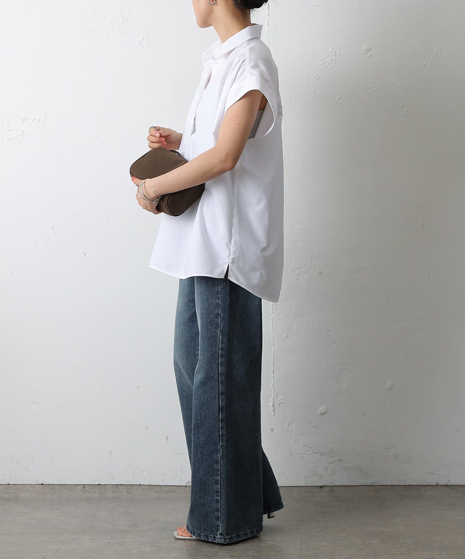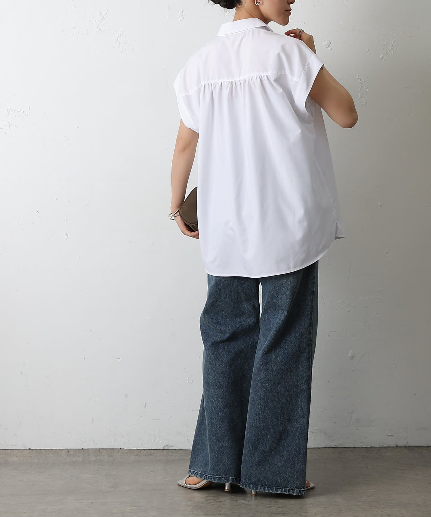 シンプルなデザインながらも、肩のギャザーがさりげないアクセントになったブラウス。露出が控えめなフレンチスリーブは、気になる二の腕をカバーしつつ、華奢見え効果も◎スキッパーネックは首元をすっきりと見せ、抜け感とこなれ感を演出。裾はラウンドヘムでボトムスとのバランスが取りやすく、気になるヒップラインをさりげなくカバーできるデザイン。インスタイルにしてもスタイリングが決まります。微光沢のある生地が高見えで上品な印象を与えてくれます。きれいめなパンツやスカートと合わせてオフィススタイルに、デニムと合わせてカジュアルスタイルにと、様々なシーンで活躍します。カーディガンやジャケットを羽織れば、ロングシーズン着用可能です。