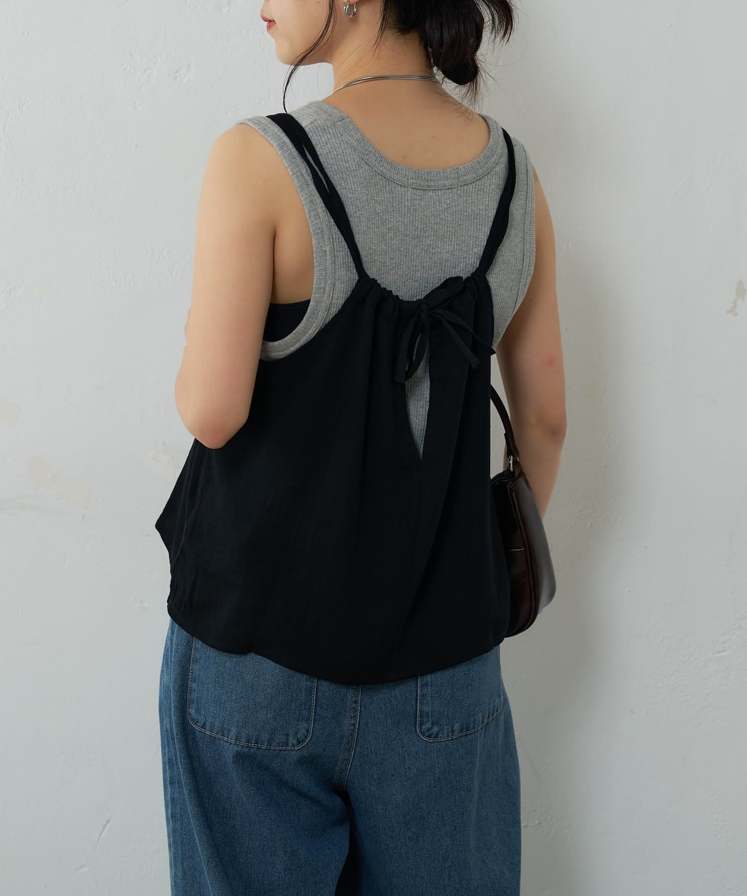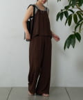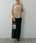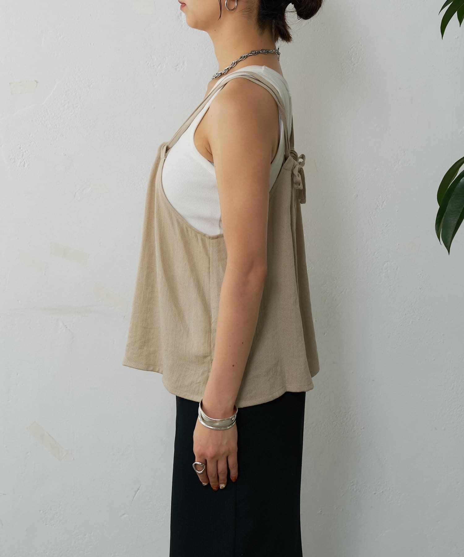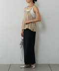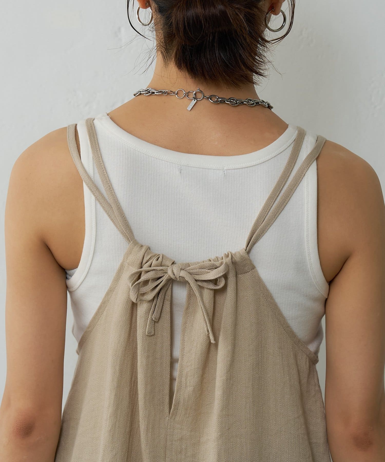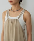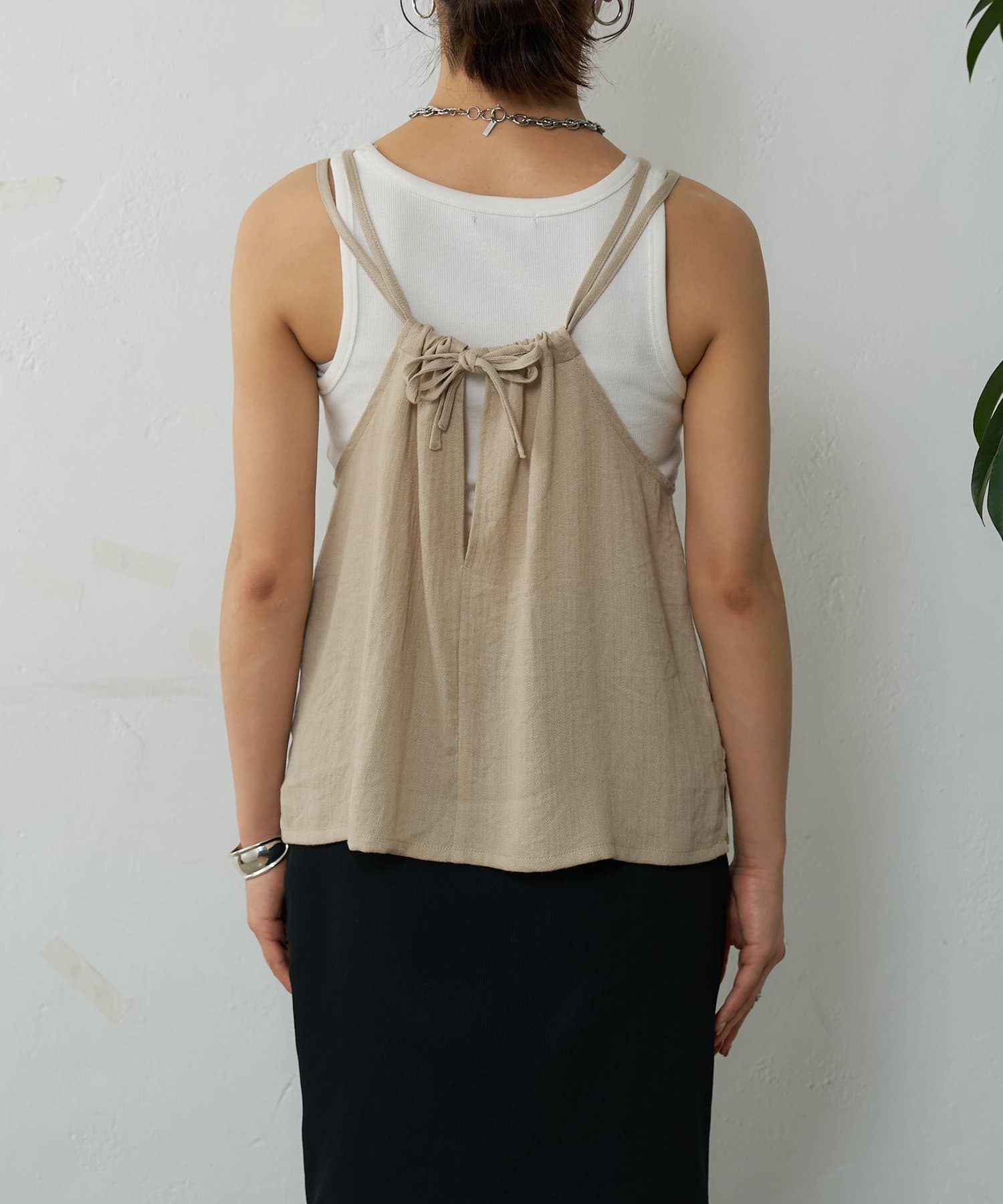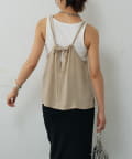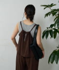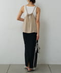 バックにさりげなく施されたリボンがアクセントとなり、細めの肩紐は華奢な印象を与えてくれます。Tシャツやカットソーにレイヤードすれば、いつものコーディネートがグッと旬なスタイルにアップデートしてくれます。同素材のボトムスとセットアップで合わせれば、こなれ感のある大人カジュアルが完成。デイリーユースだけではなく、リゾートや夏のお出かけにも活躍まちがいなしの1着。