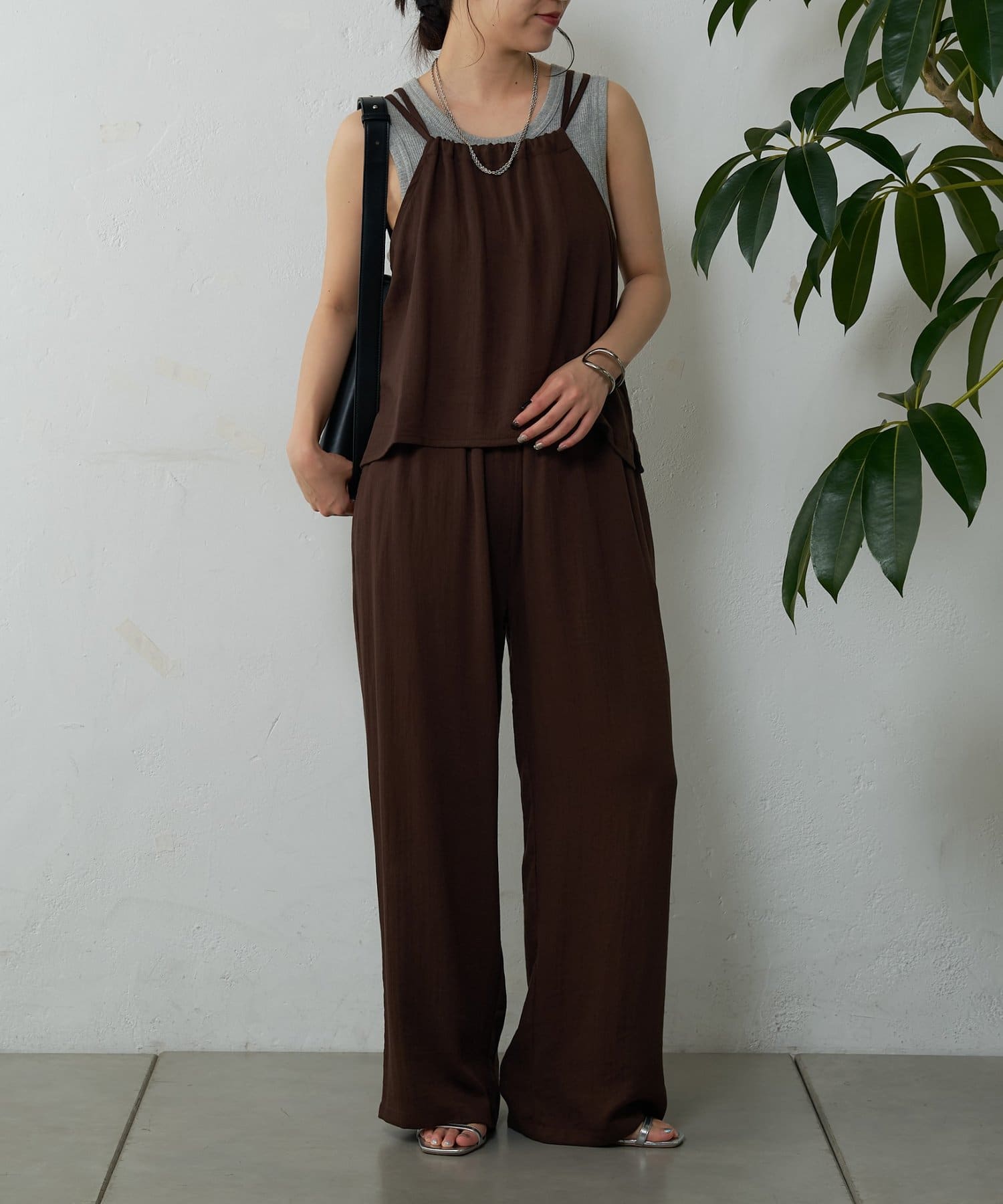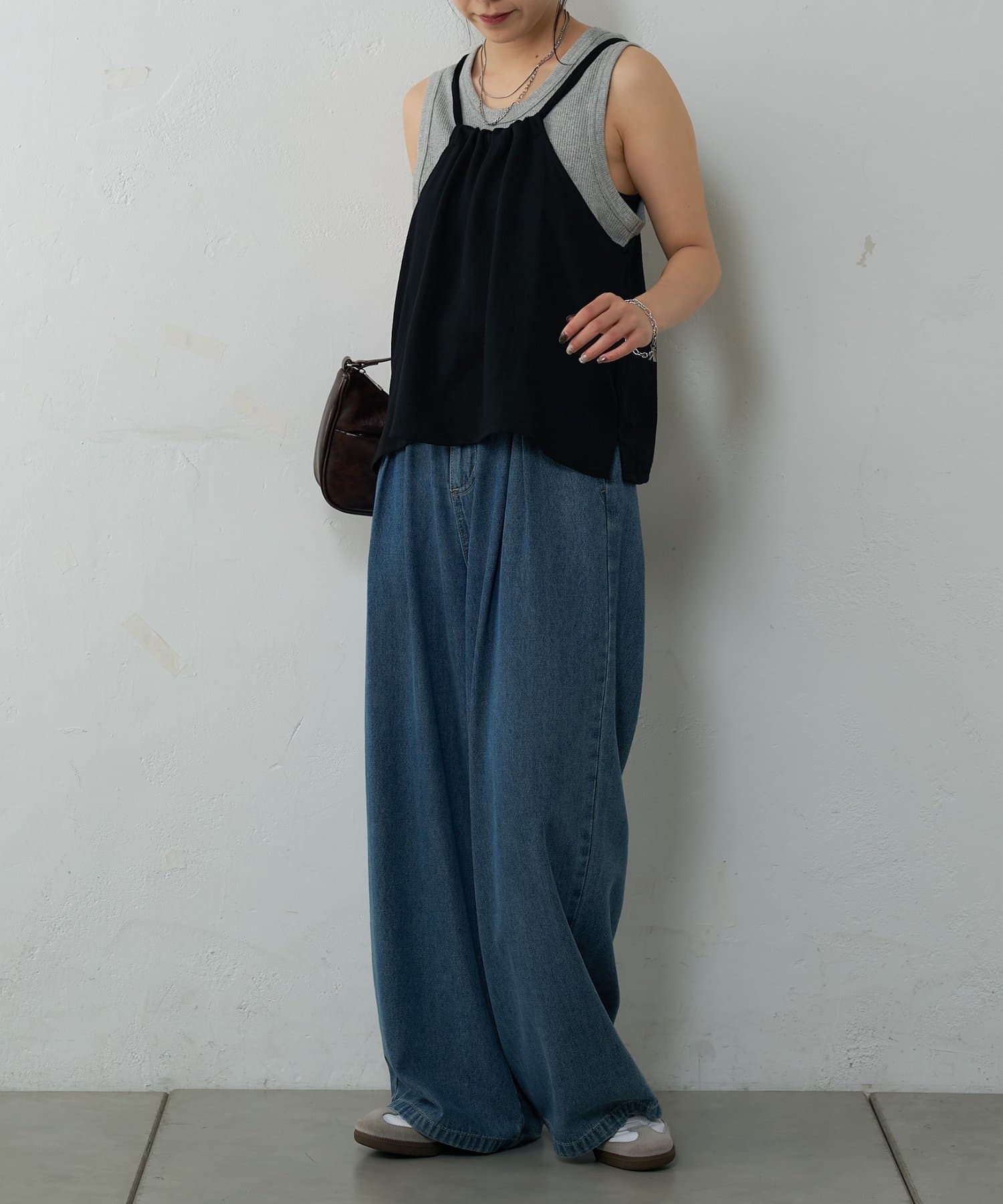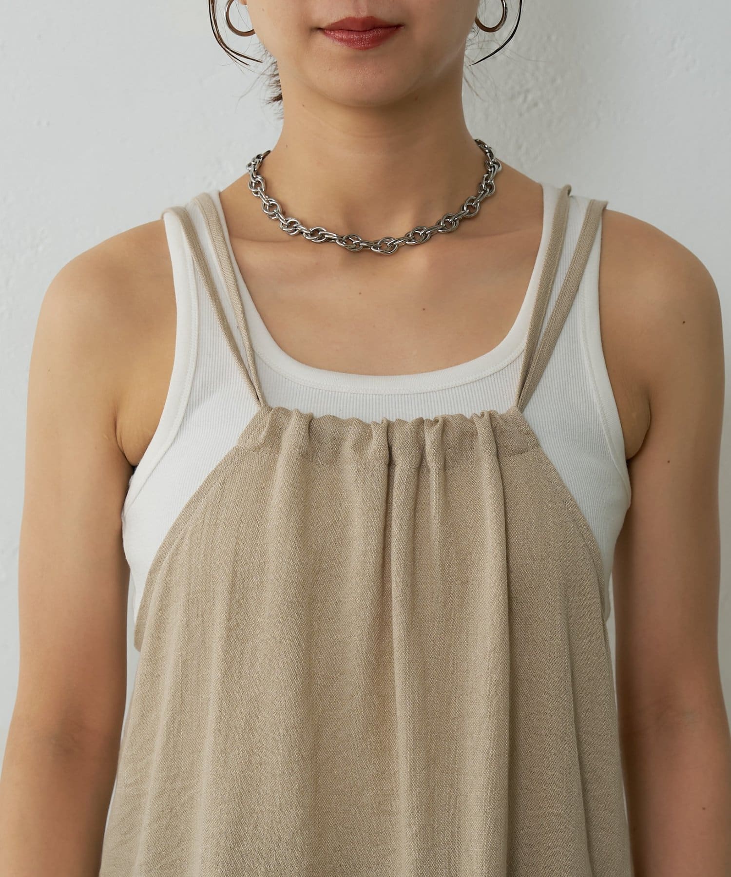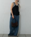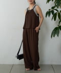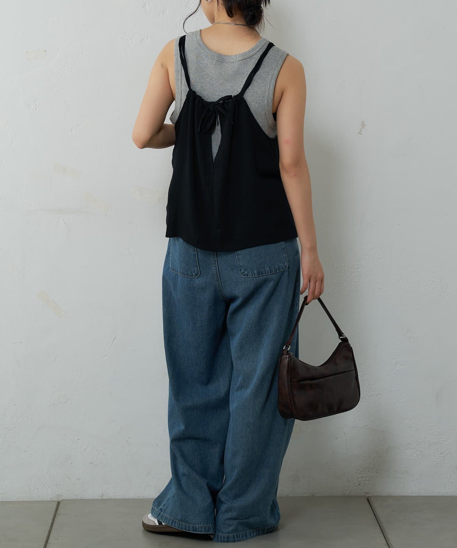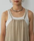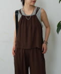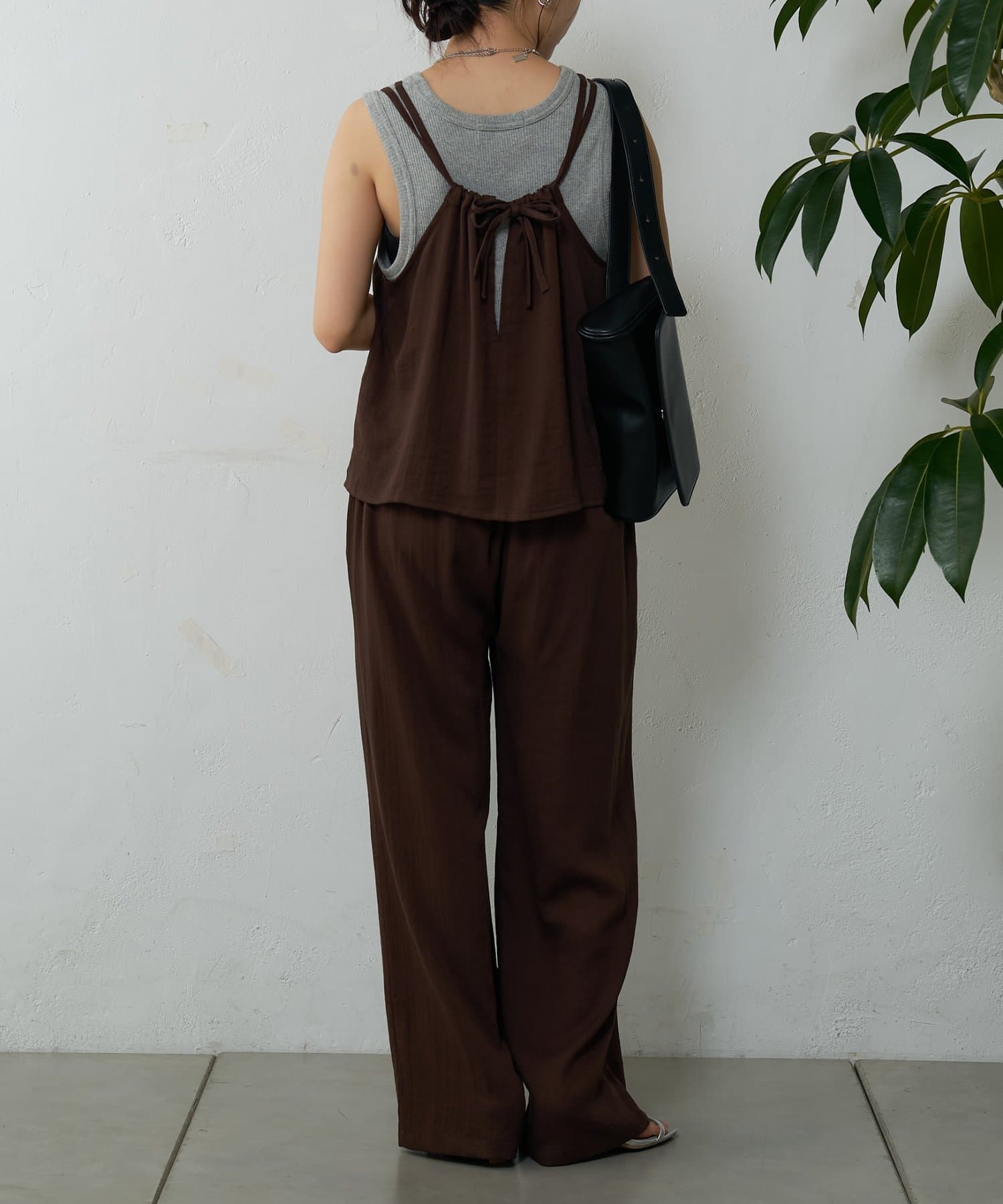 バックにさりげなく施されたリボンがアクセントとなり、細めの肩紐は華奢な印象を与えてくれます。Tシャツやカットソーにレイヤードすれば、いつものコーディネートがグッと旬なスタイルにアップデートしてくれます。同素材のボトムスとセットアップで合わせれば、こなれ感のある大人カジュアルが完成。デイリーユースだけではなく、リゾートや夏のお出かけにも活躍まちがいなしの1着。