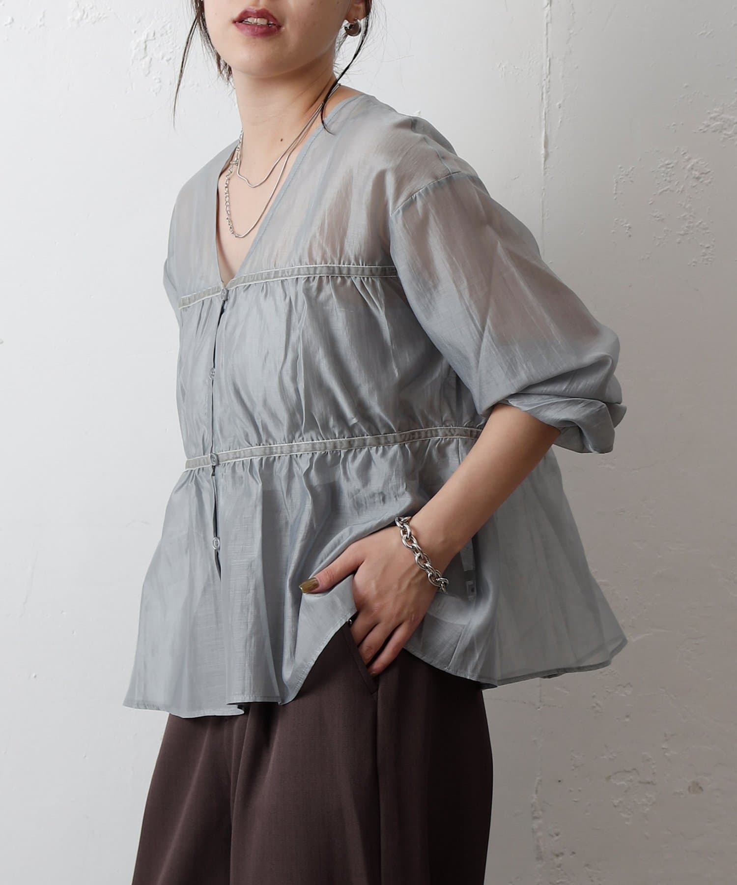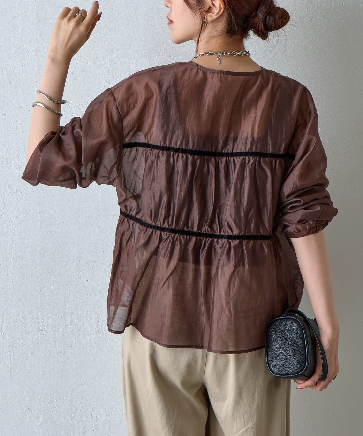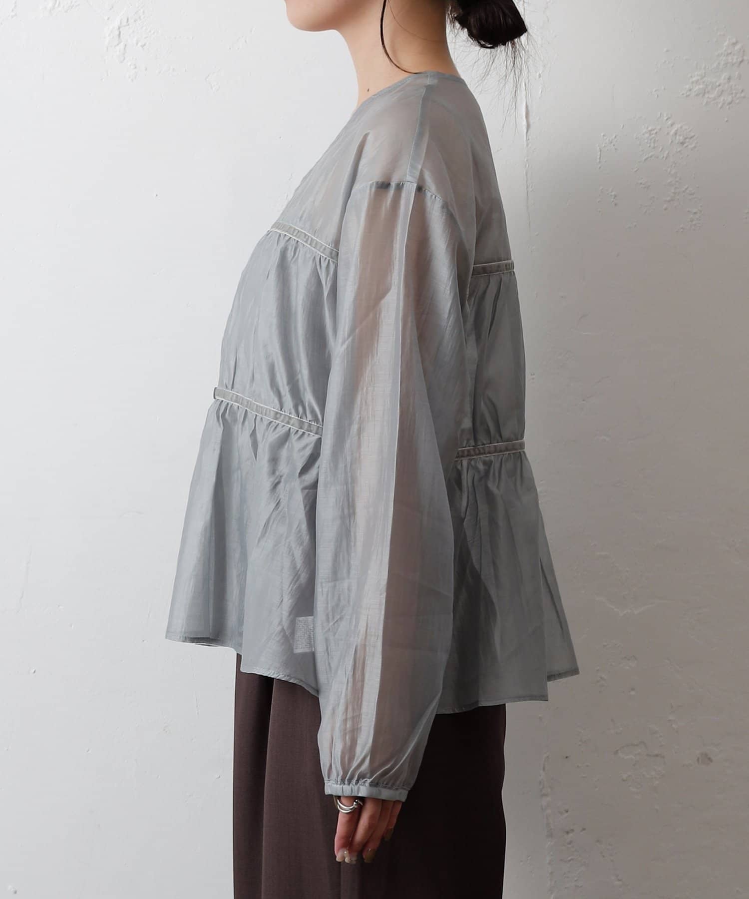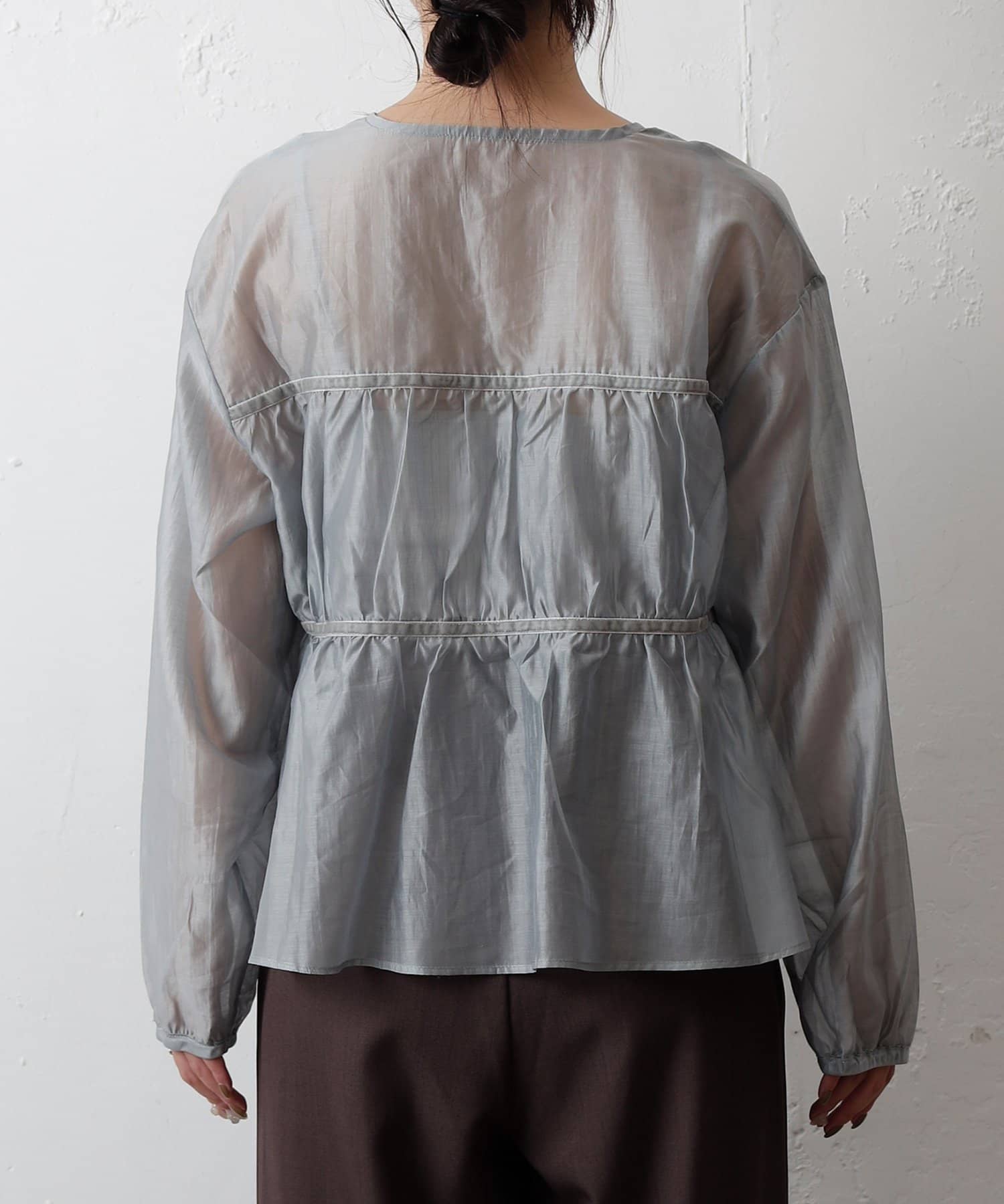 ふんわりと軽やかなシアー素材に、立体感のあるティアードデザインを施した長袖ブラウス。