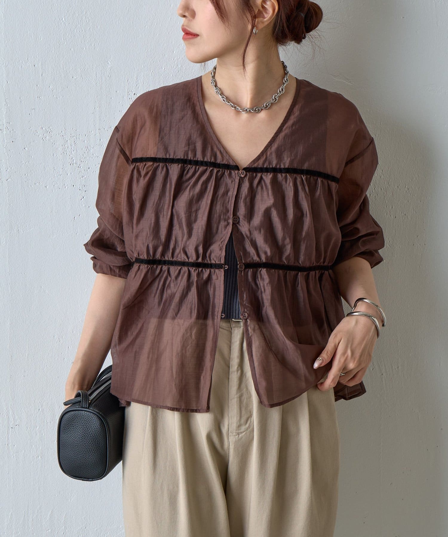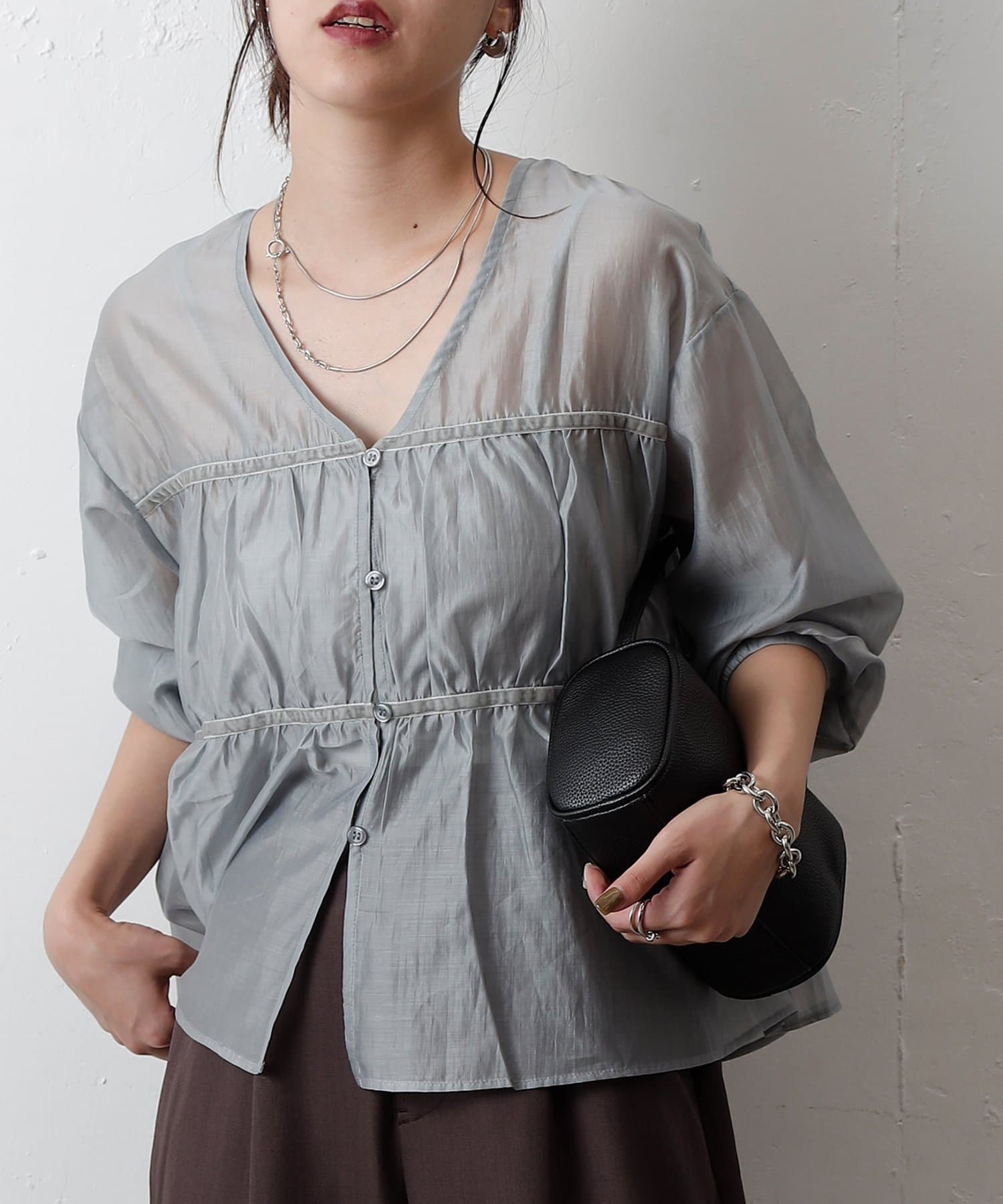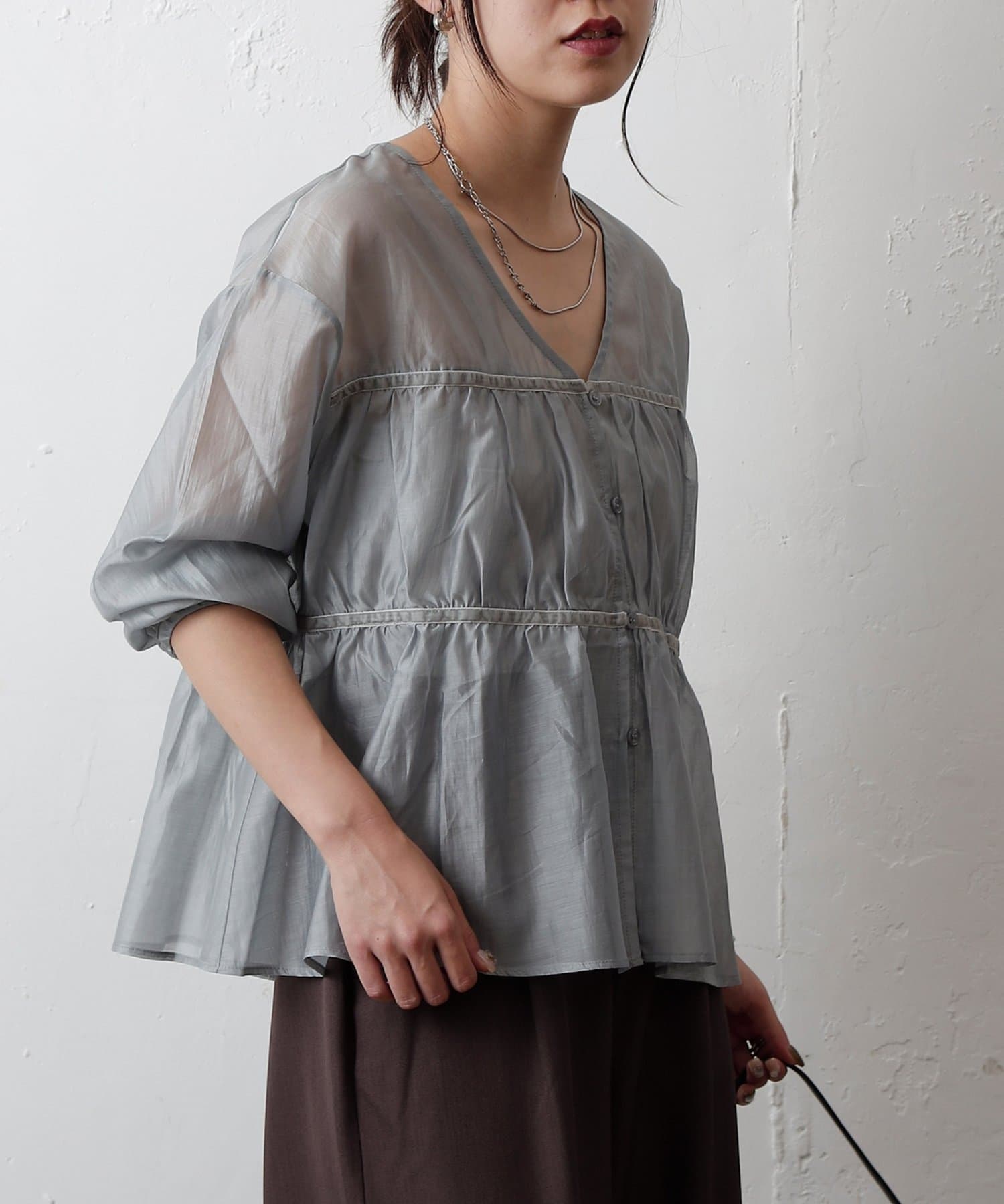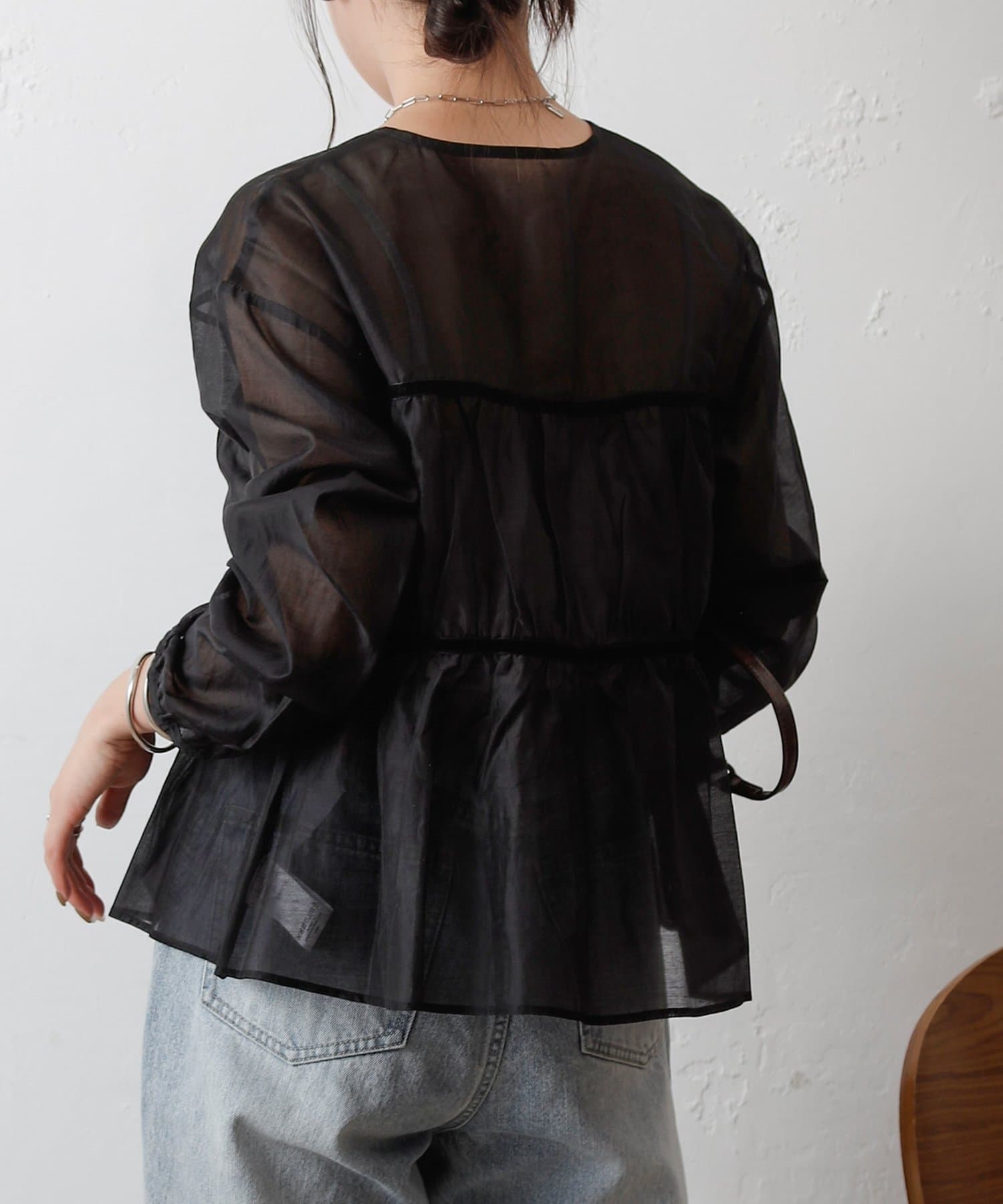 ふんわりと軽やかなシアー素材に、立体感のあるティアードデザインを施した長袖ブラウス。