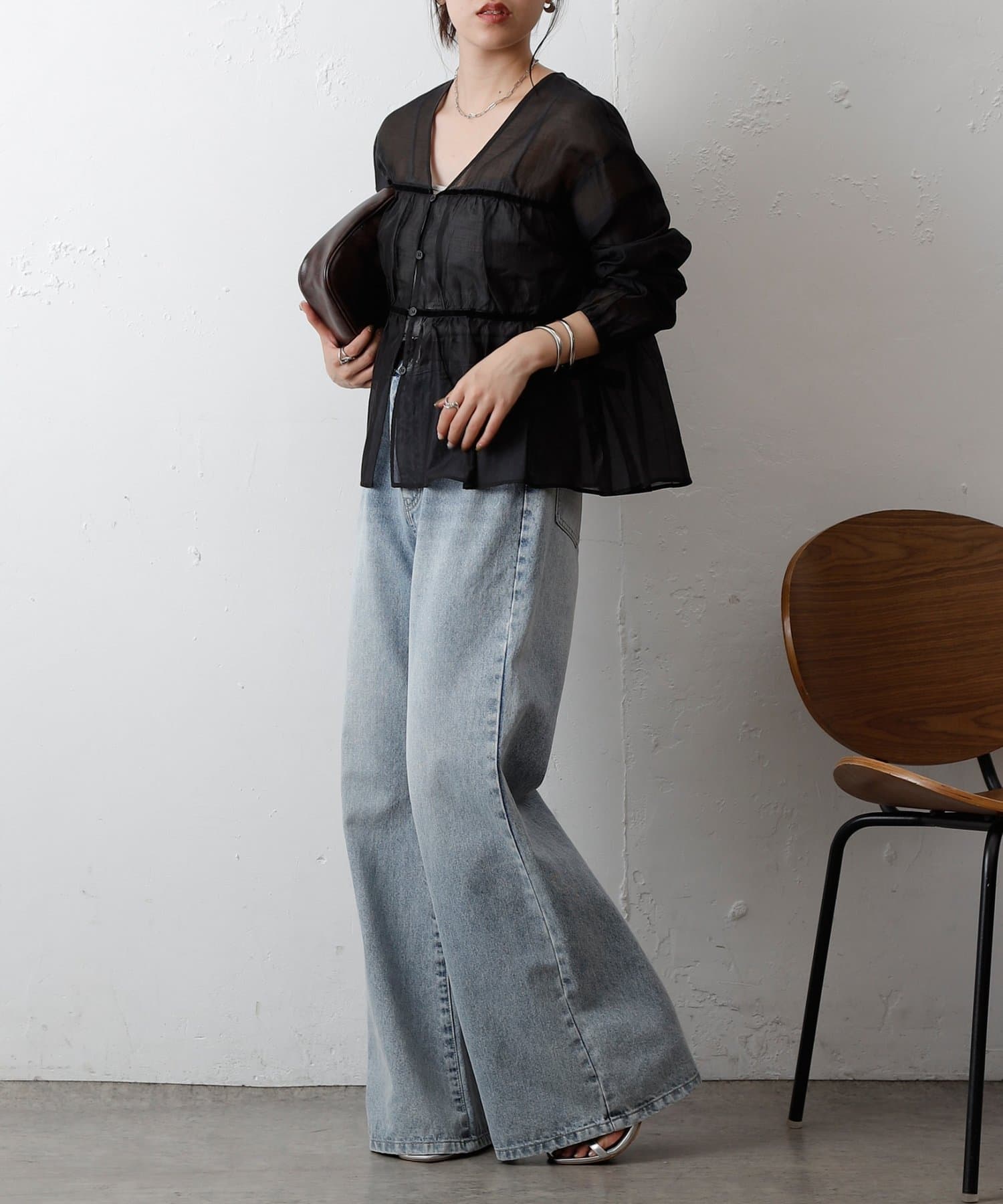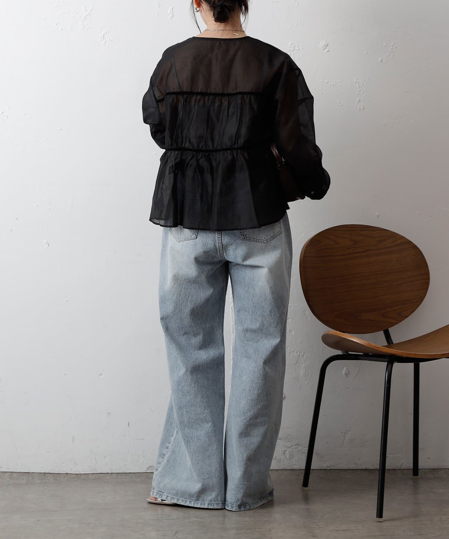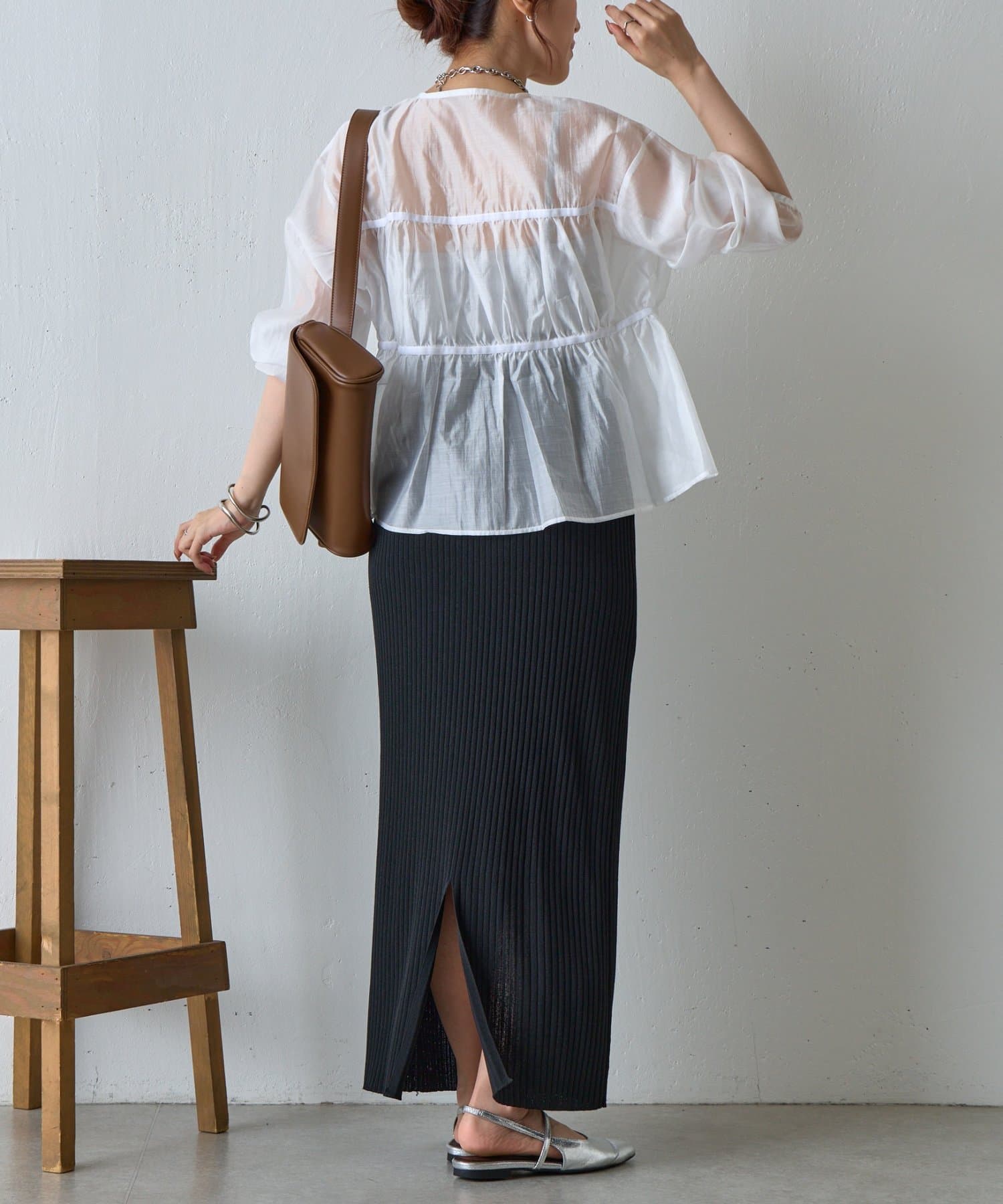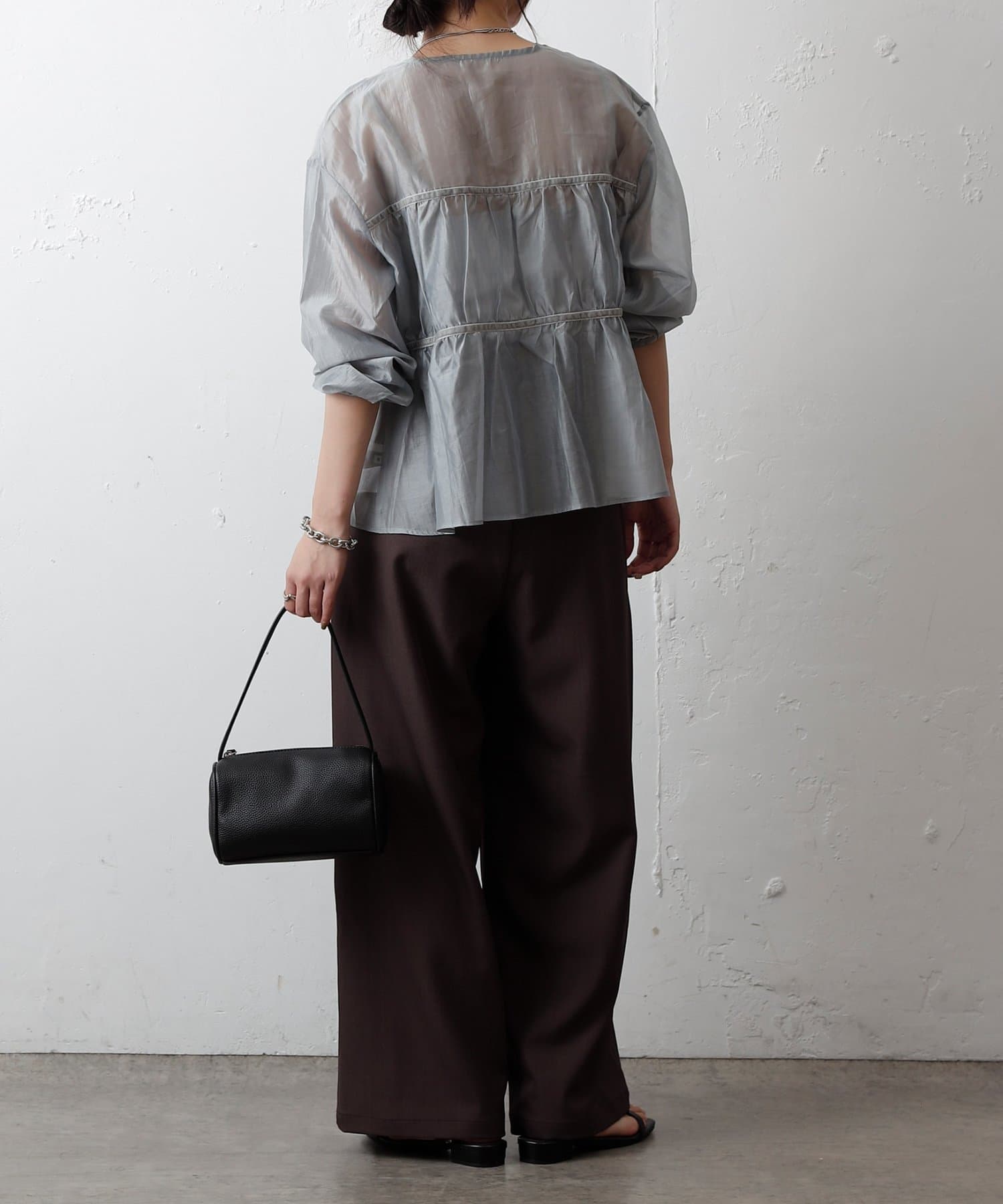 ふんわりと軽やかなシアー素材に、立体感のあるティアードデザインを施した長袖ブラウス。