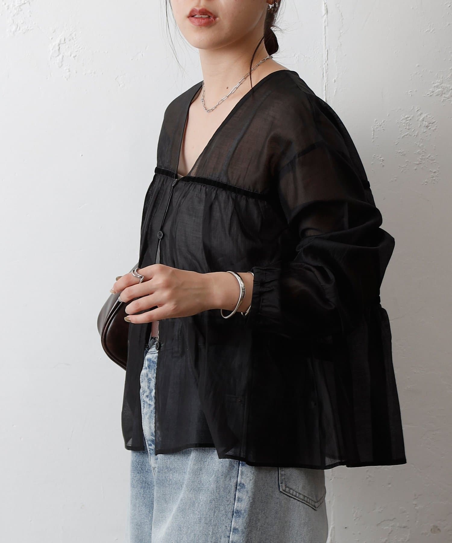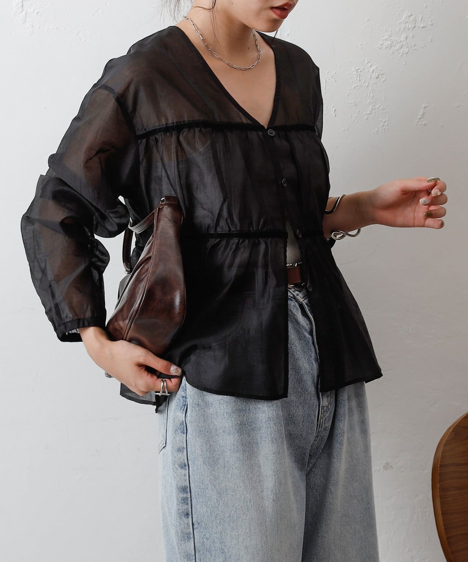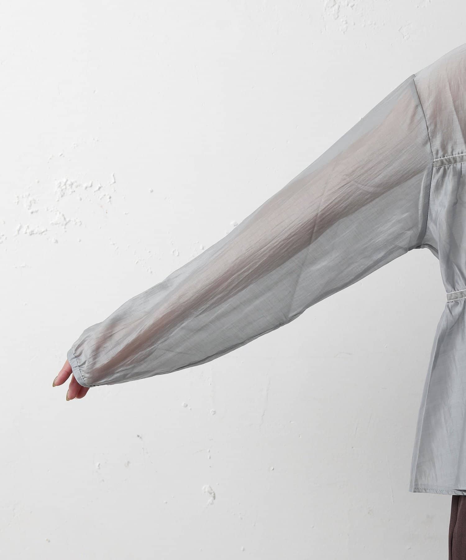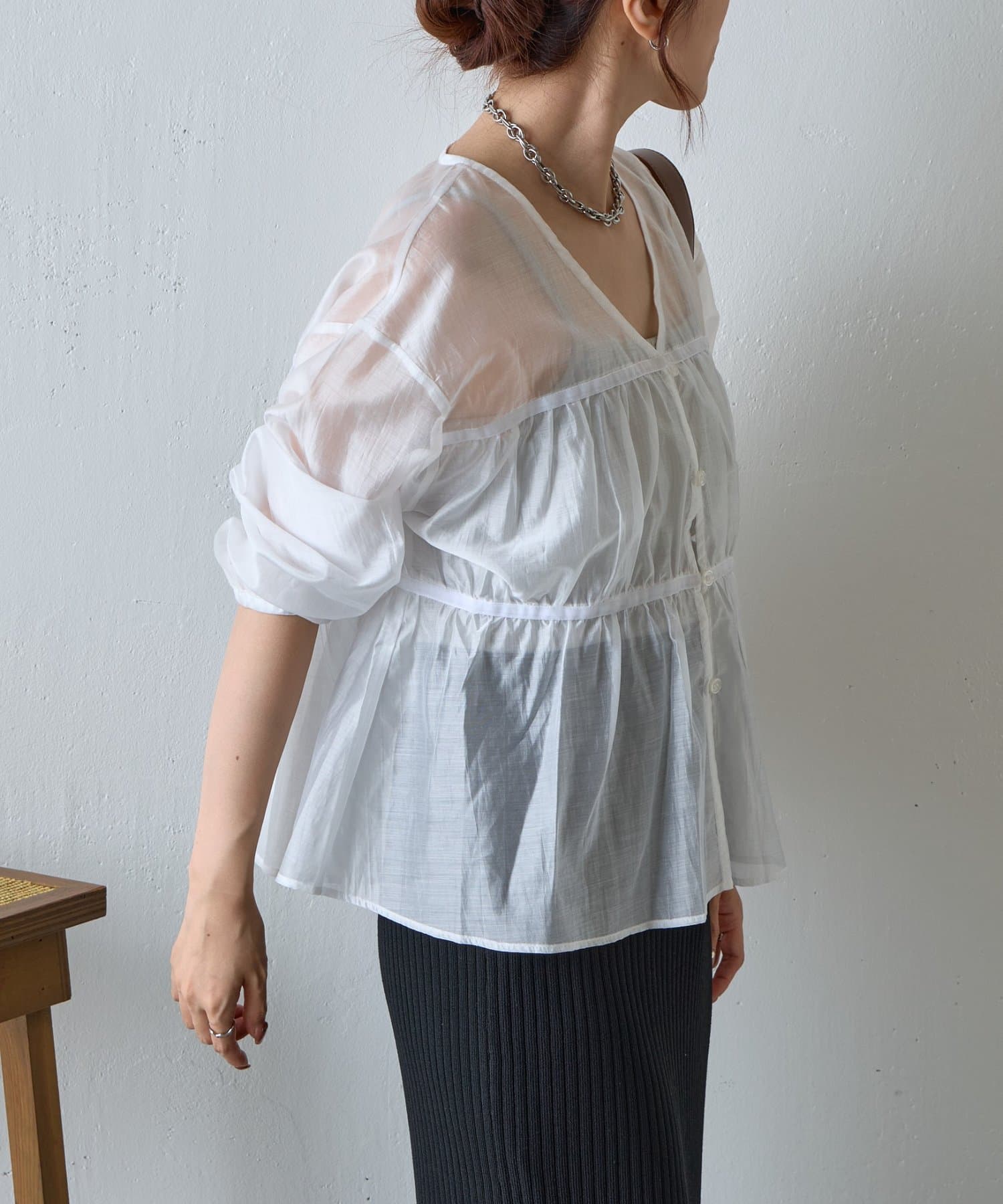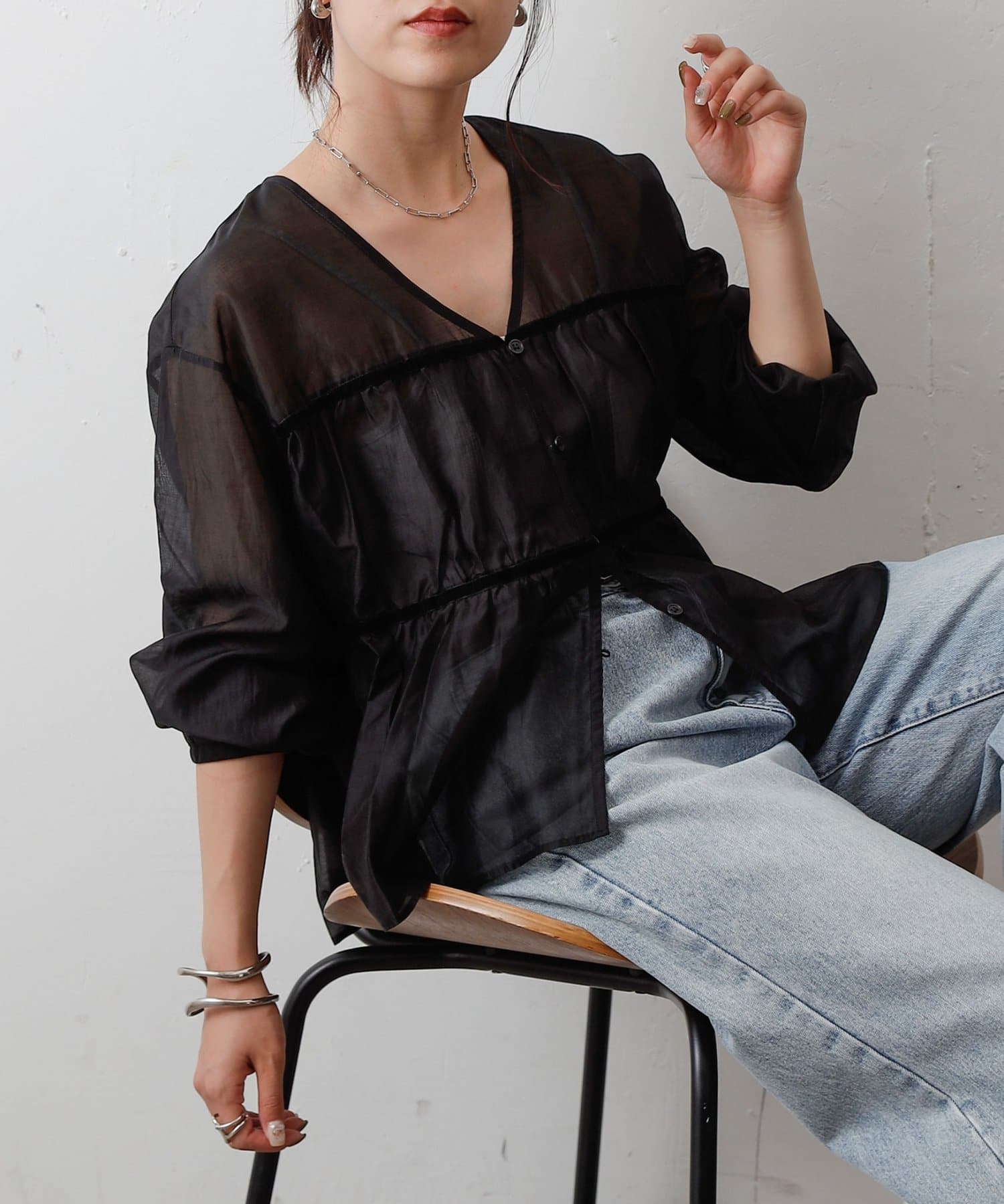 透け感のある素材が女性らしい柔らかさと抜け感を演出します。
