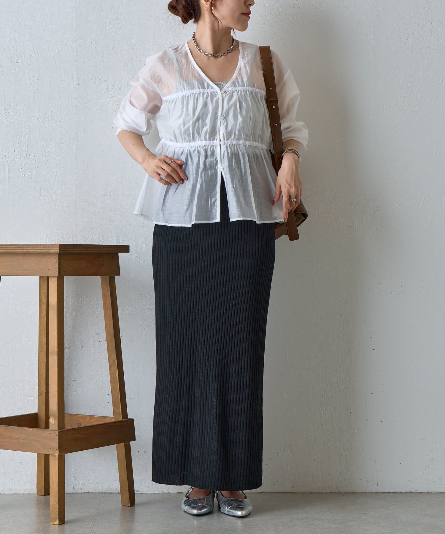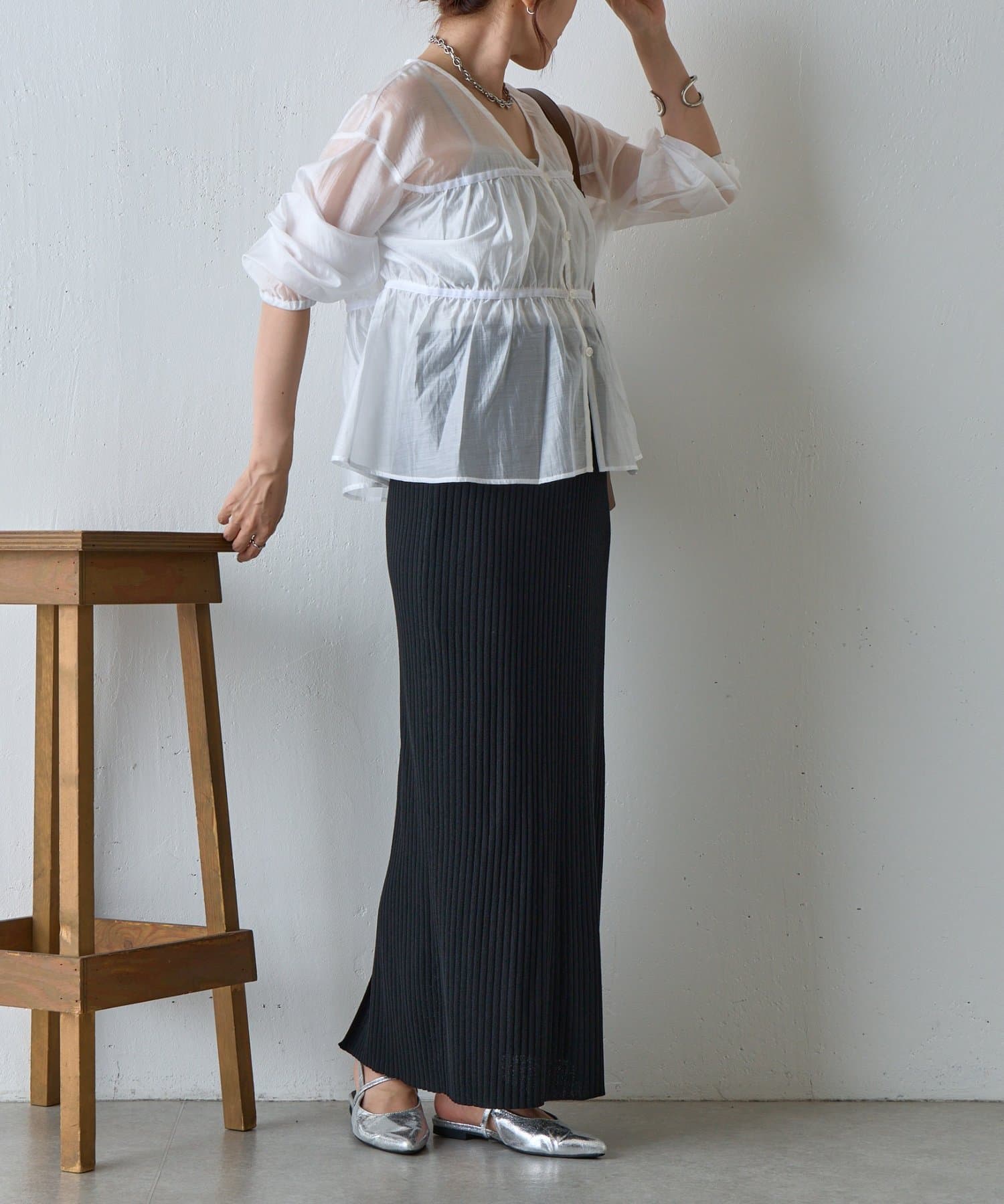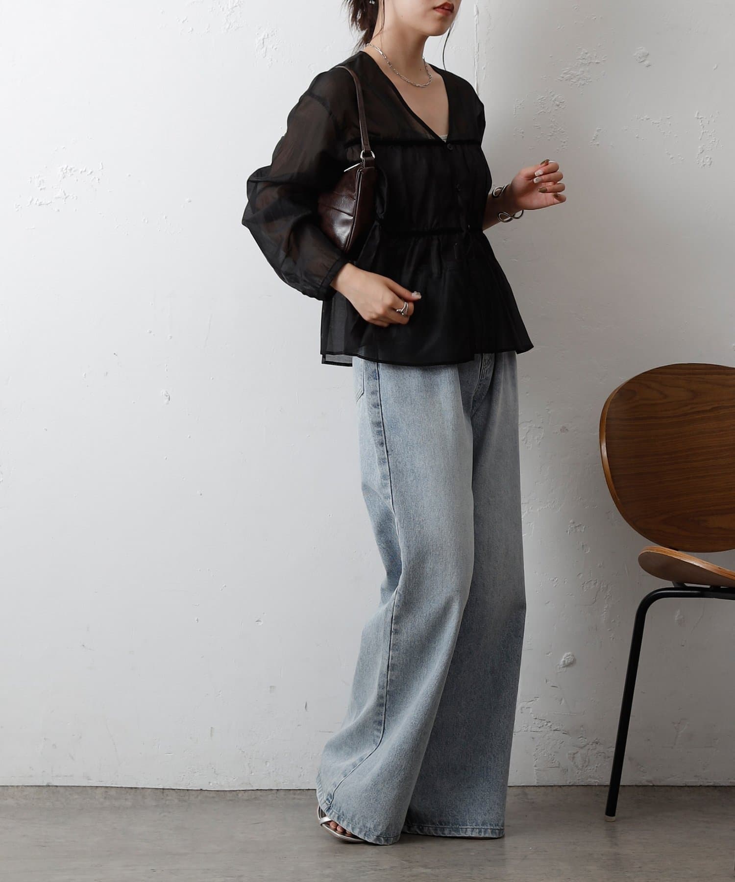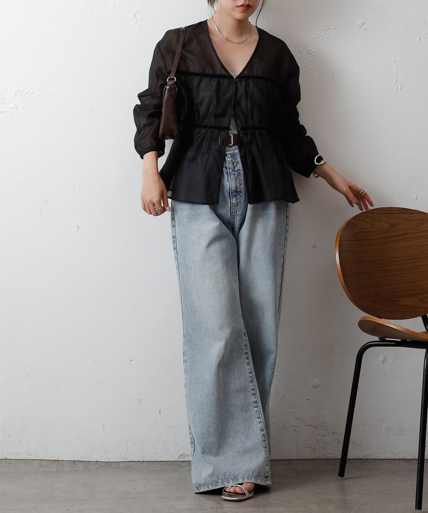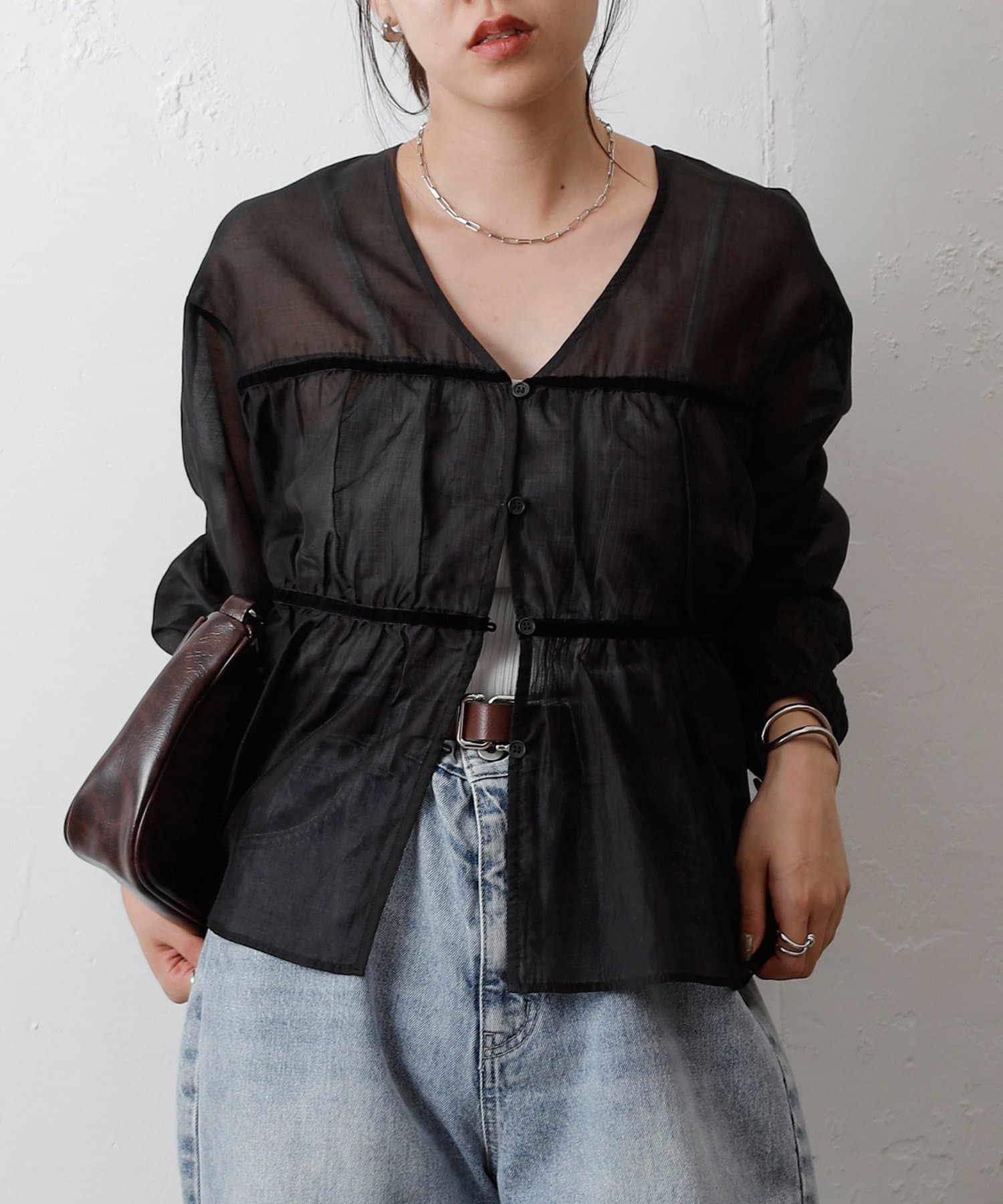 透け感のある素材が女性らしい柔らかさと抜け感を演出します。