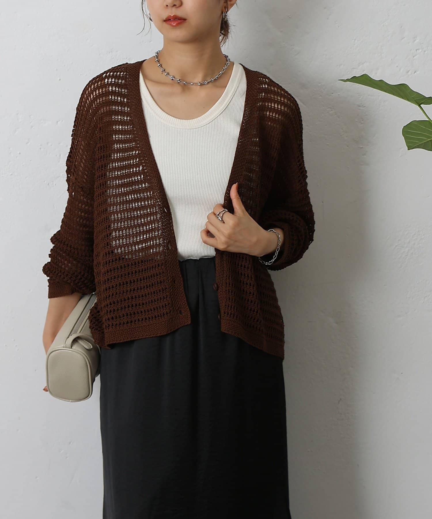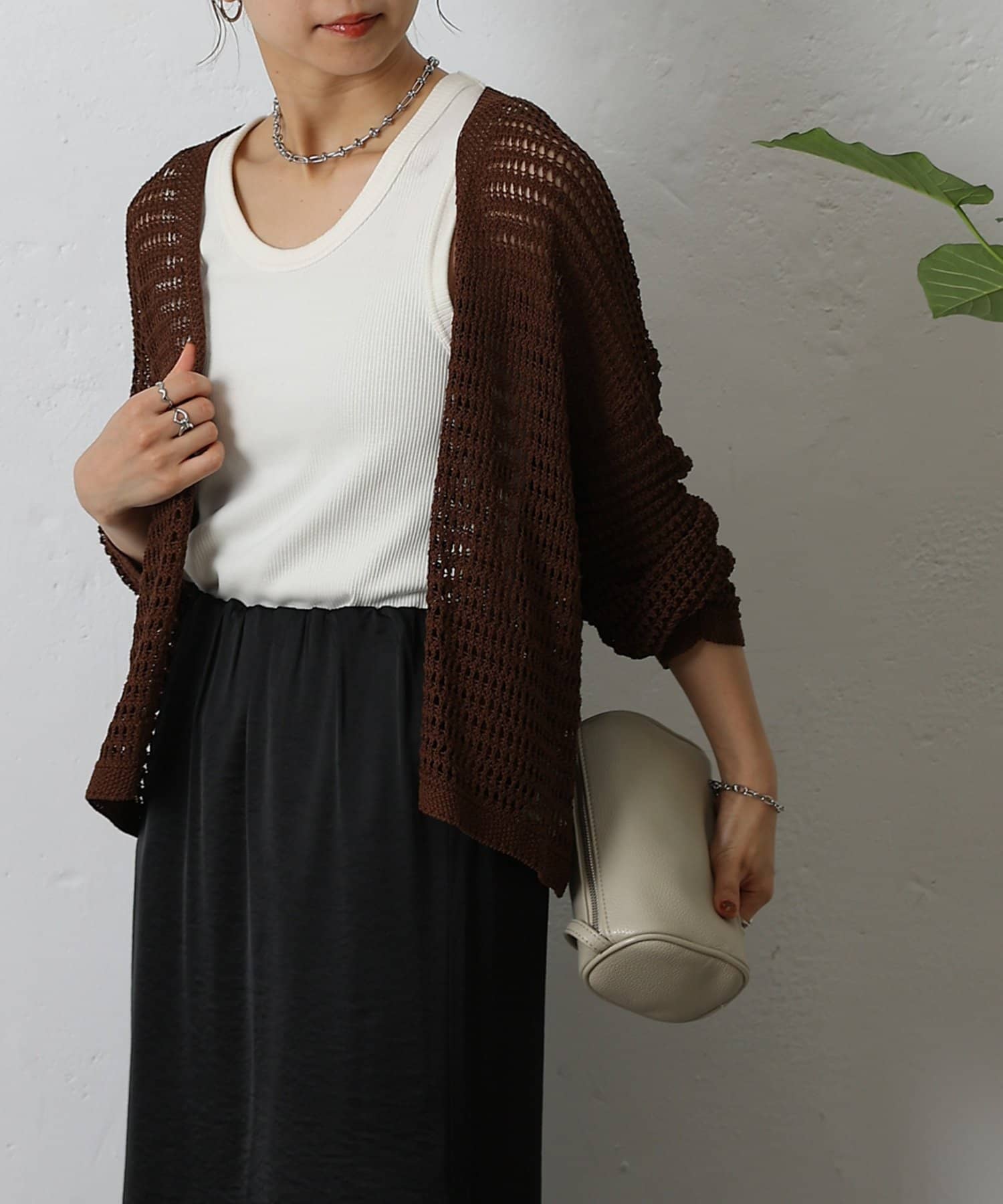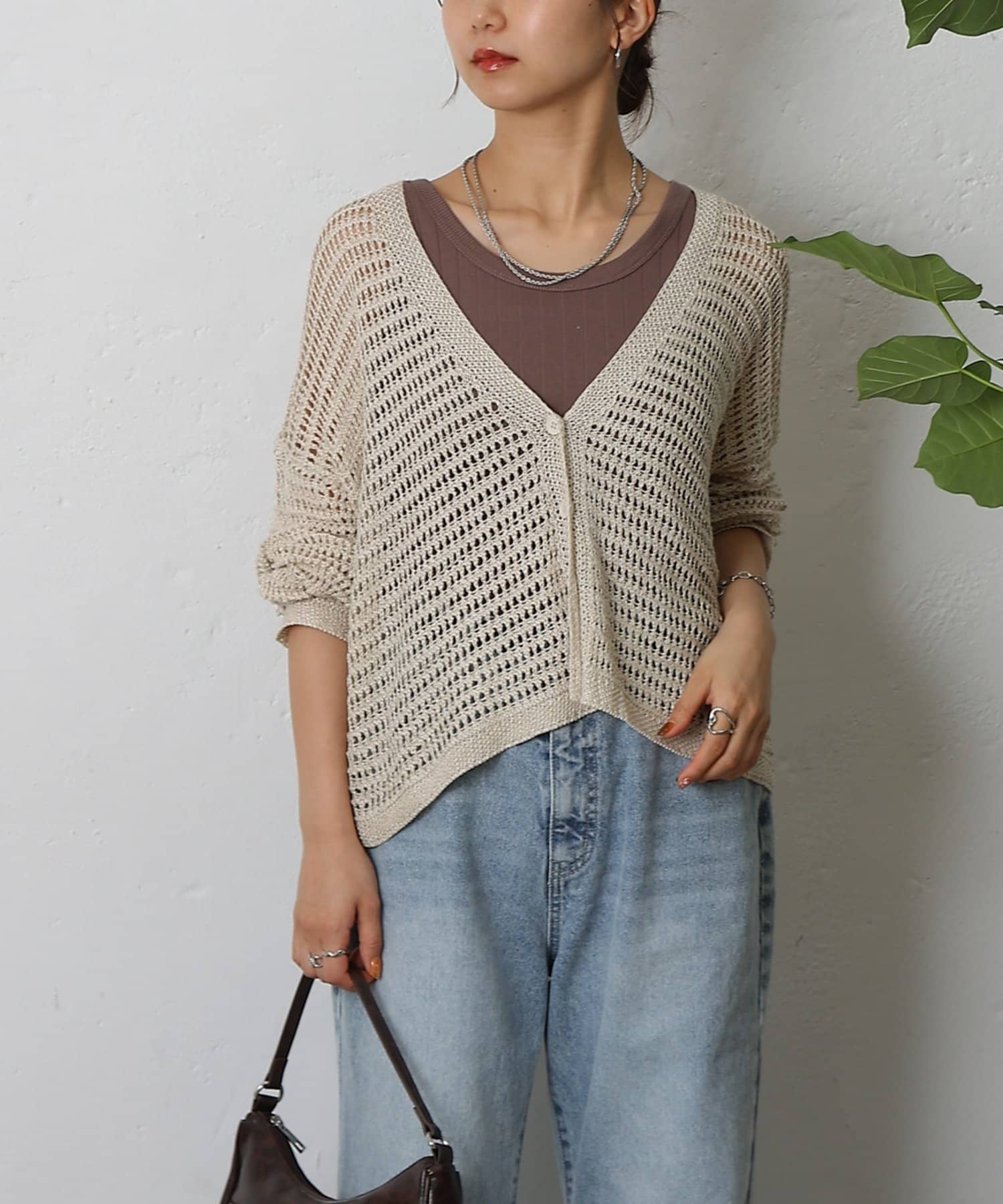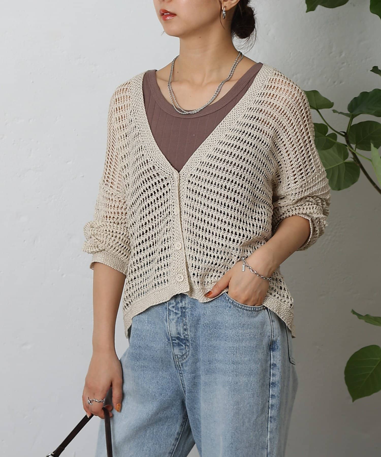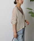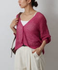 コーディネートに軽やかな風を吹き込む、ざっくりニットのメッシュ編みカーディガン。いつものスタイルにプラスするだけで、トレンド感あふれる着こなしが完成します。ざっくりとした編み目が、程よい抜け感を演出し、大人の余裕を感じさせるスタイルに。風通しの良いメッシュ編みは見た目にも涼しげで、これからの季節にぴったりです。タンクトップやキャミソールに重ねて、ヘルシーな肌見せを楽しむのはもちろん、ワンピースやブラウスに羽織って、上品なレイヤードスタイルを楽しむのもおすすめ。旅行などのちょっとしたお出かけにバッグに忍ばせておけば、必要な時にさっと羽織れてとっても便利。麻混素材なのでさらりとした肌触りで快適な着心地。天然素材の風合いを生かしたナチュラルな色合いは、どんなコーディネートにも合わせやすのがうれしいポイント◎春夏秋とロングシーズン活躍間違いなしの頼れる1着です。