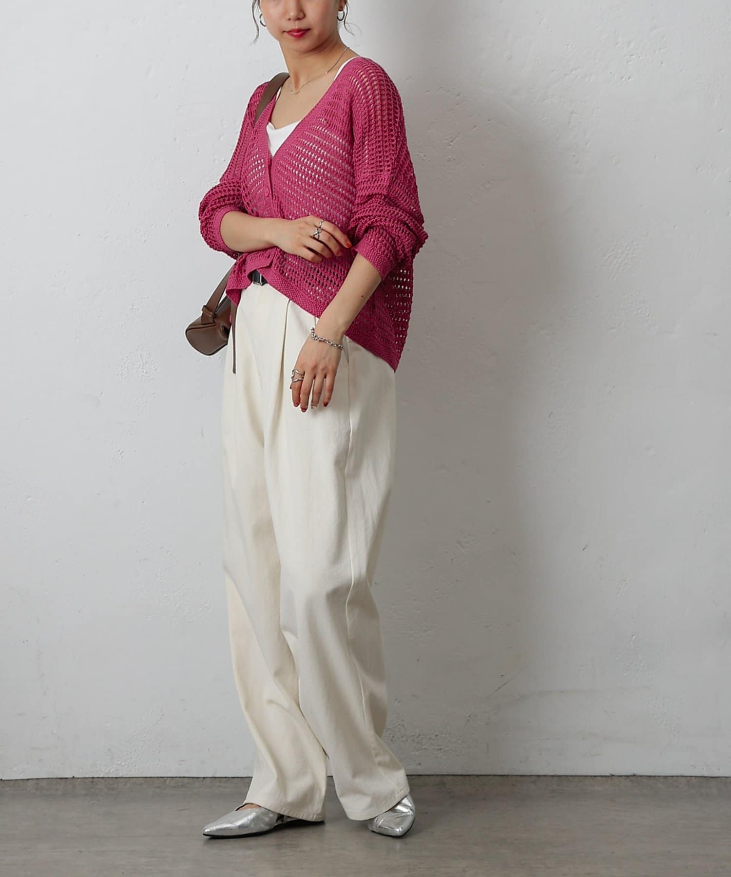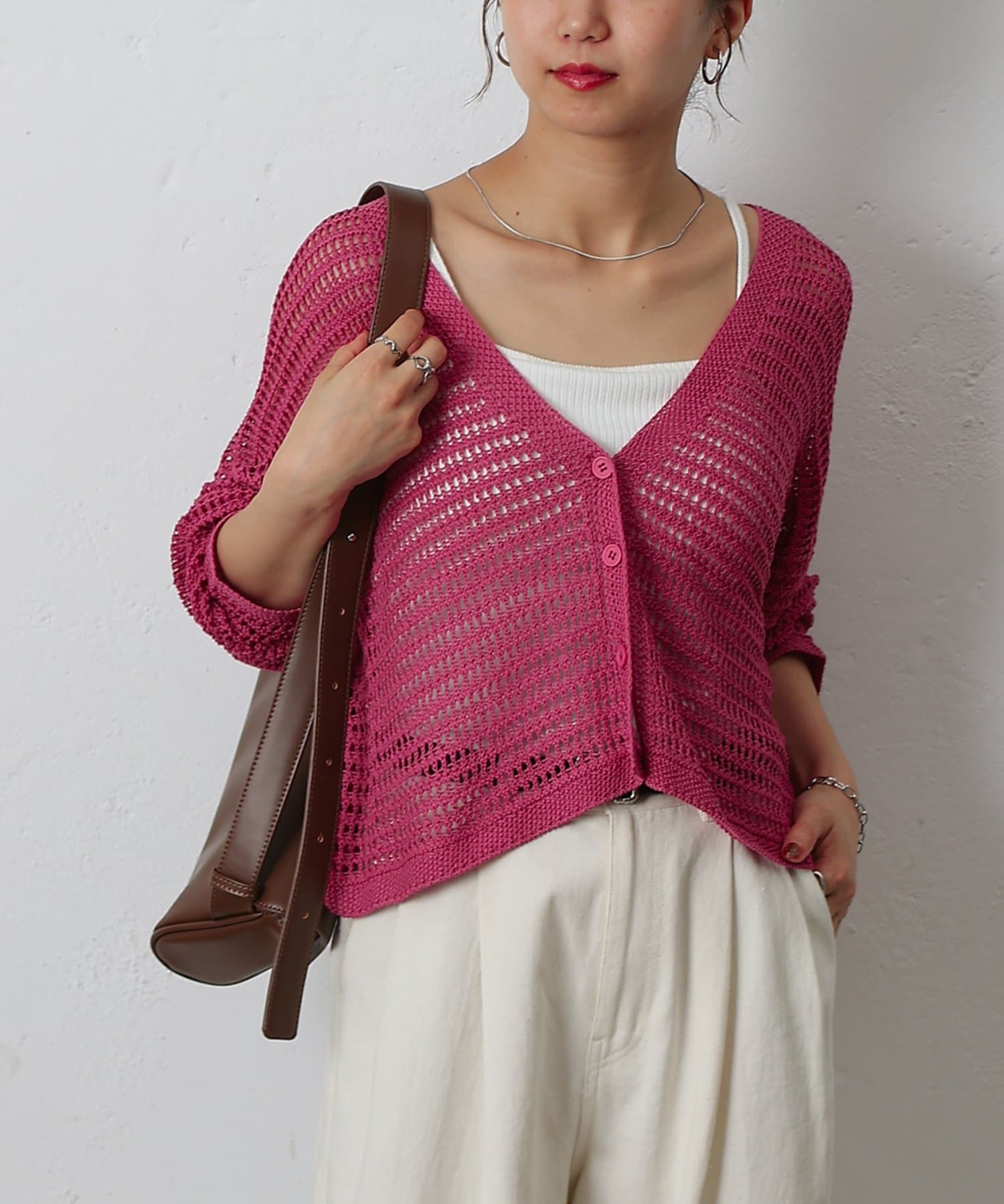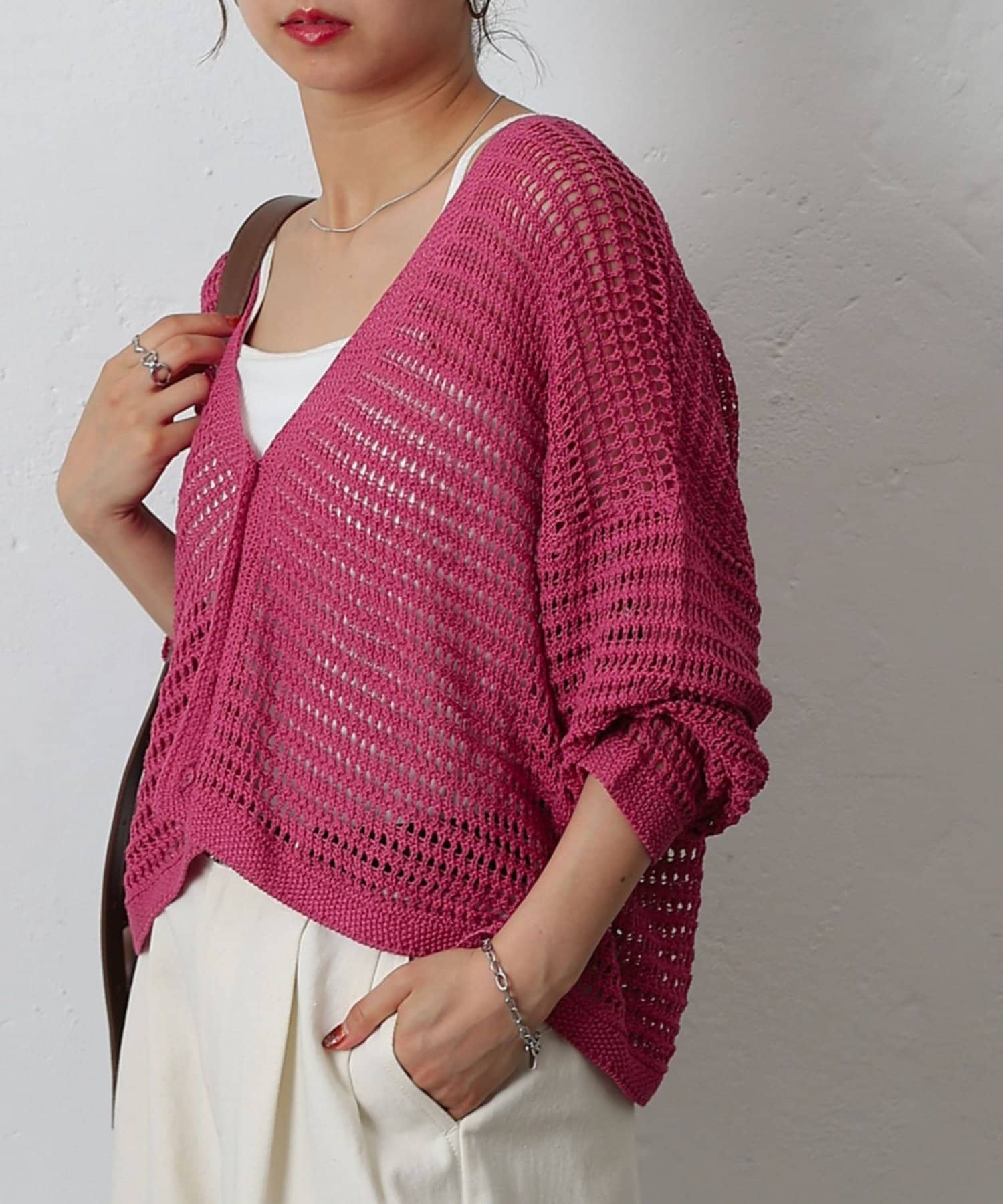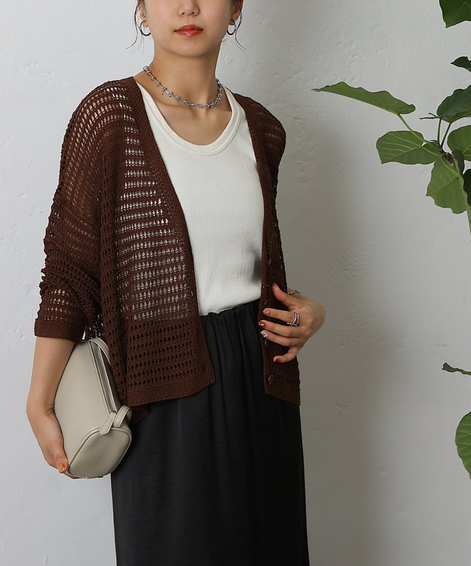 コーディネートに軽やかな風を吹き込む、ざっくりニットのメッシュ編みカーディガン。いつものスタイルにプラスするだけで、トレンド感あふれる着こなしが完成します。ざっくりとした編み目が、程よい抜け感を演出し、大人の余裕を感じさせるスタイルに。風通しの良いメッシュ編みは見た目にも涼しげで、これからの季節にぴったりです。タンクトップやキャミソールに重ねて、ヘルシーな肌見せを楽しむのはもちろん、ワンピースやブラウスに羽織って、上品なレイヤードスタイルを楽しむのもおすすめ。旅行などのちょっとしたお出かけにバッグに忍ばせておけば、必要な時にさっと羽織れてとっても便利。麻混素材なのでさらりとした肌触りで快適な着心地。天然素材の風合いを生かしたナチュラルな色合いは、どんなコーディネートにも合わせやすのがうれしいポイント◎春夏秋とロングシーズン活躍間違いなしの頼れる1着です。