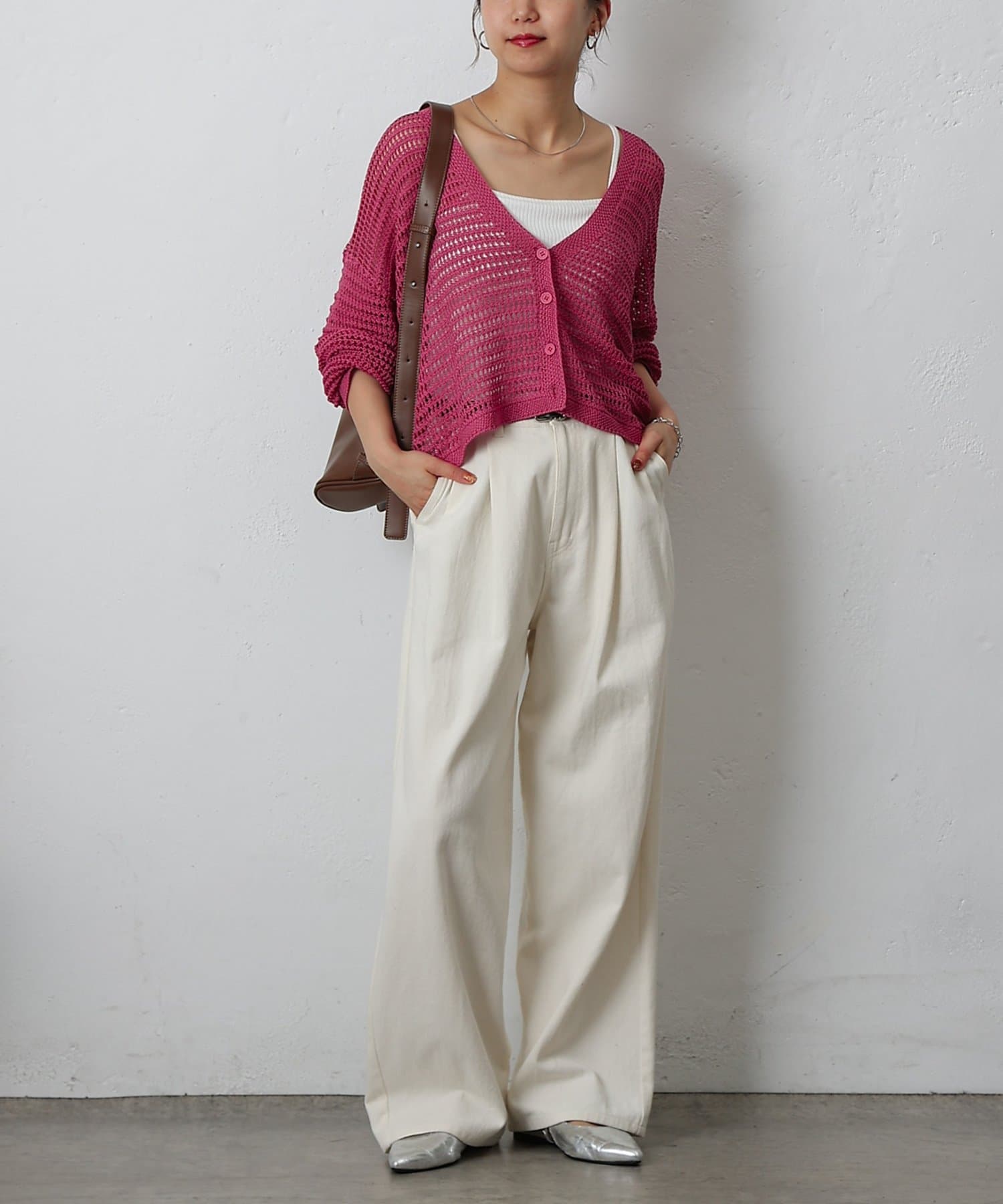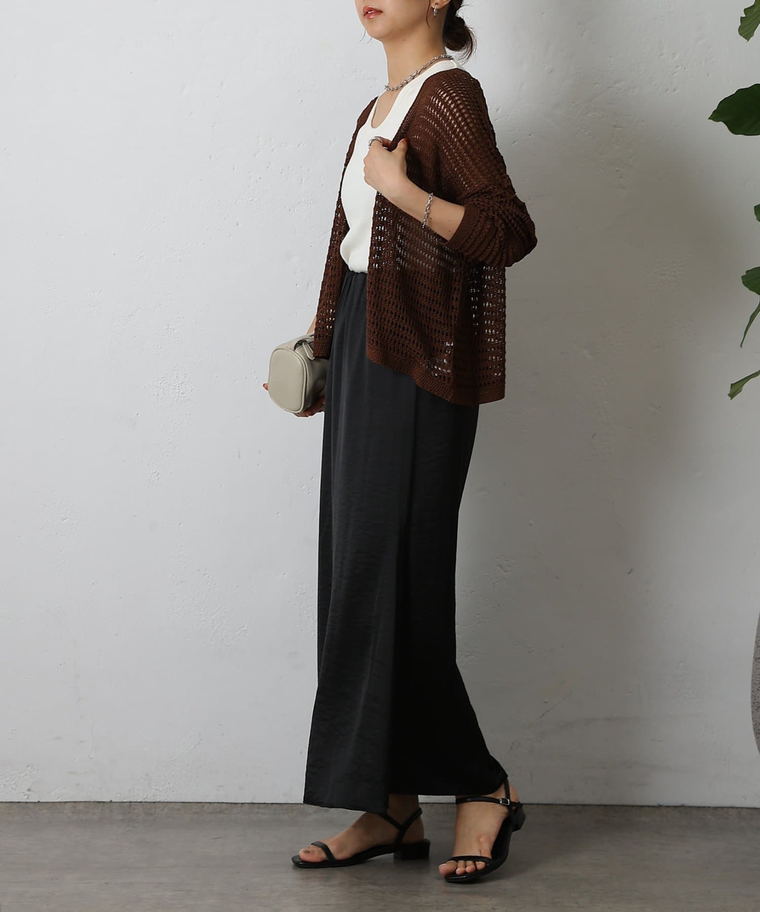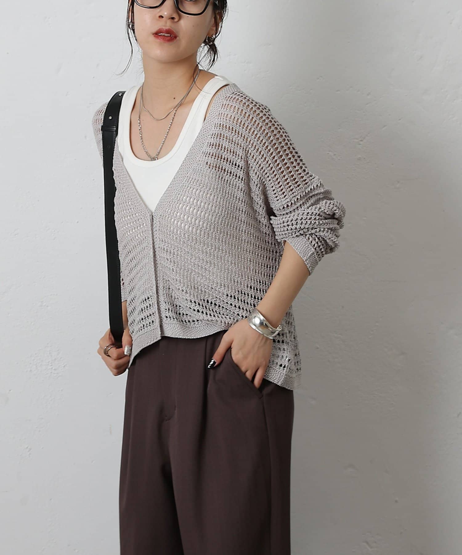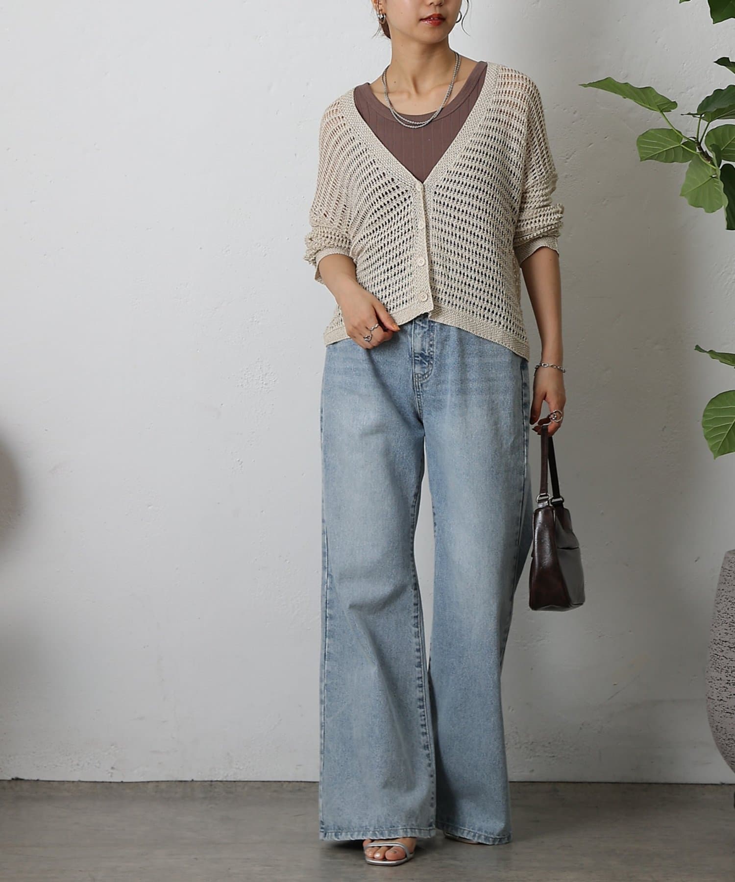 コーディネートに軽やかな風を吹き込む、ざっくりニットのメッシュ編みカーディガン。いつものスタイルにプラスするだけで、トレンド感あふれる着こなしが完成します。ざっくりとした編み目が、程よい抜け感を演出し、大人の余裕を感じさせるスタイルに。風通しの良いメッシュ編みは見た目にも涼しげで、これからの季節にぴったりです。タンクトップやキャミソールに重ねて、ヘルシーな肌見せを楽しむのはもちろん、ワンピースやブラウスに羽織って、上品なレイヤードスタイルを楽しむのもおすすめ。旅行などのちょっとしたお出かけにバッグに忍ばせておけば、必要な時にさっと羽織れてとっても便利。麻混素材なのでさらりとした肌触りで快適な着心地。天然素材の風合いを生かしたナチュラルな色合いは、どんなコーディネートにも合わせやすのがうれしいポイント◎春夏秋とロングシーズン活躍間違いなしの頼れる1着です。