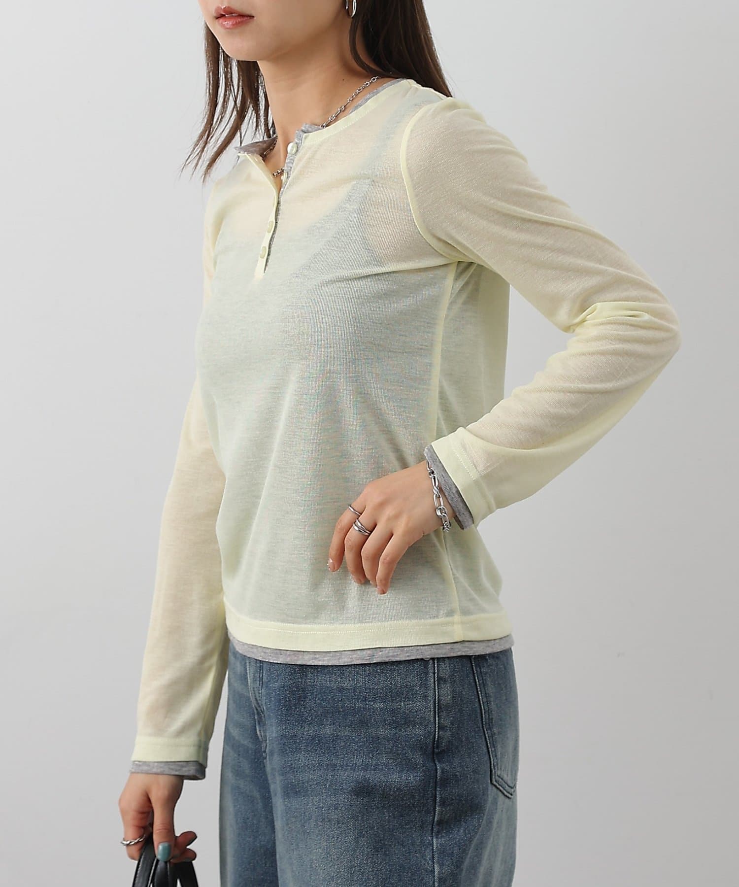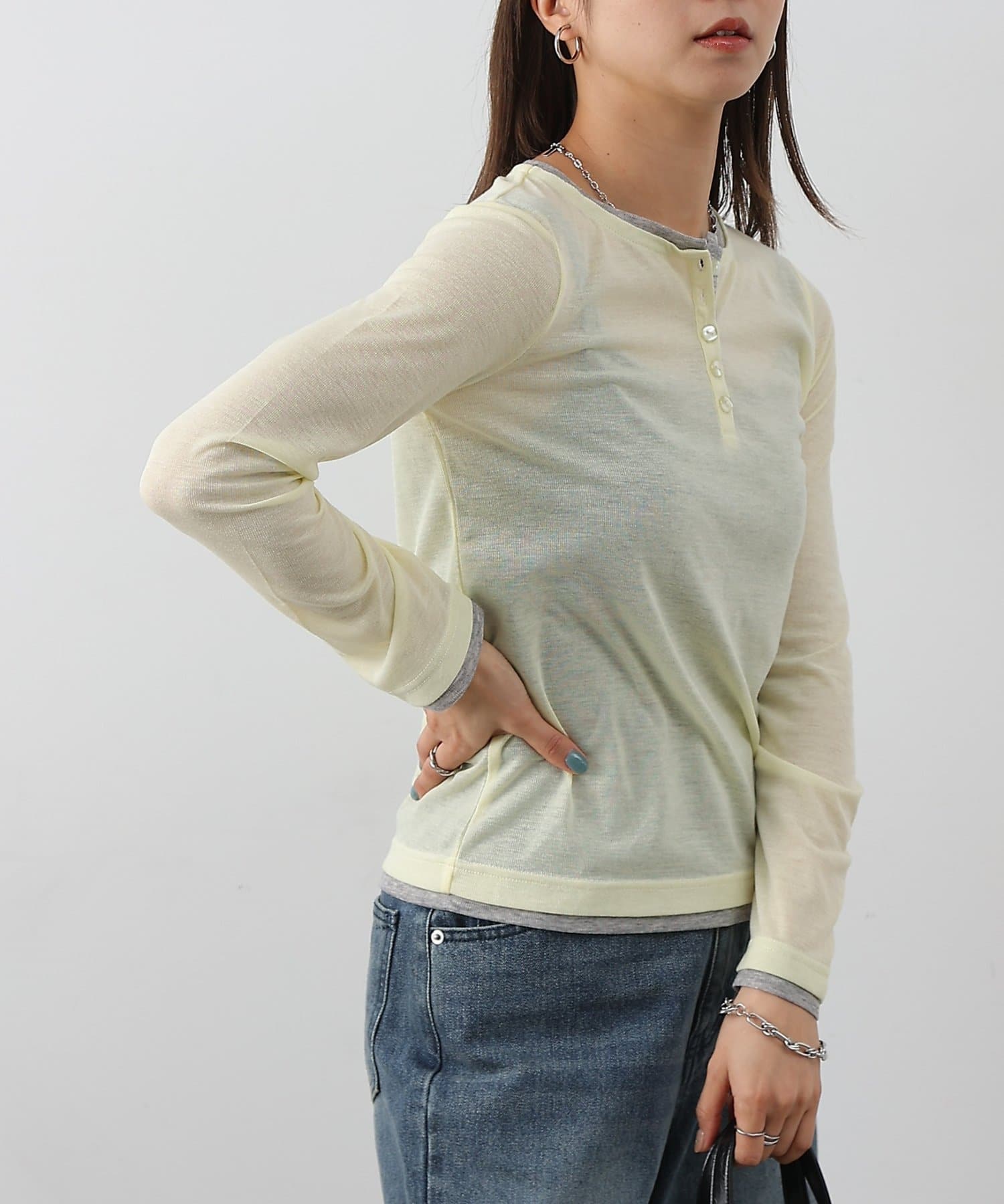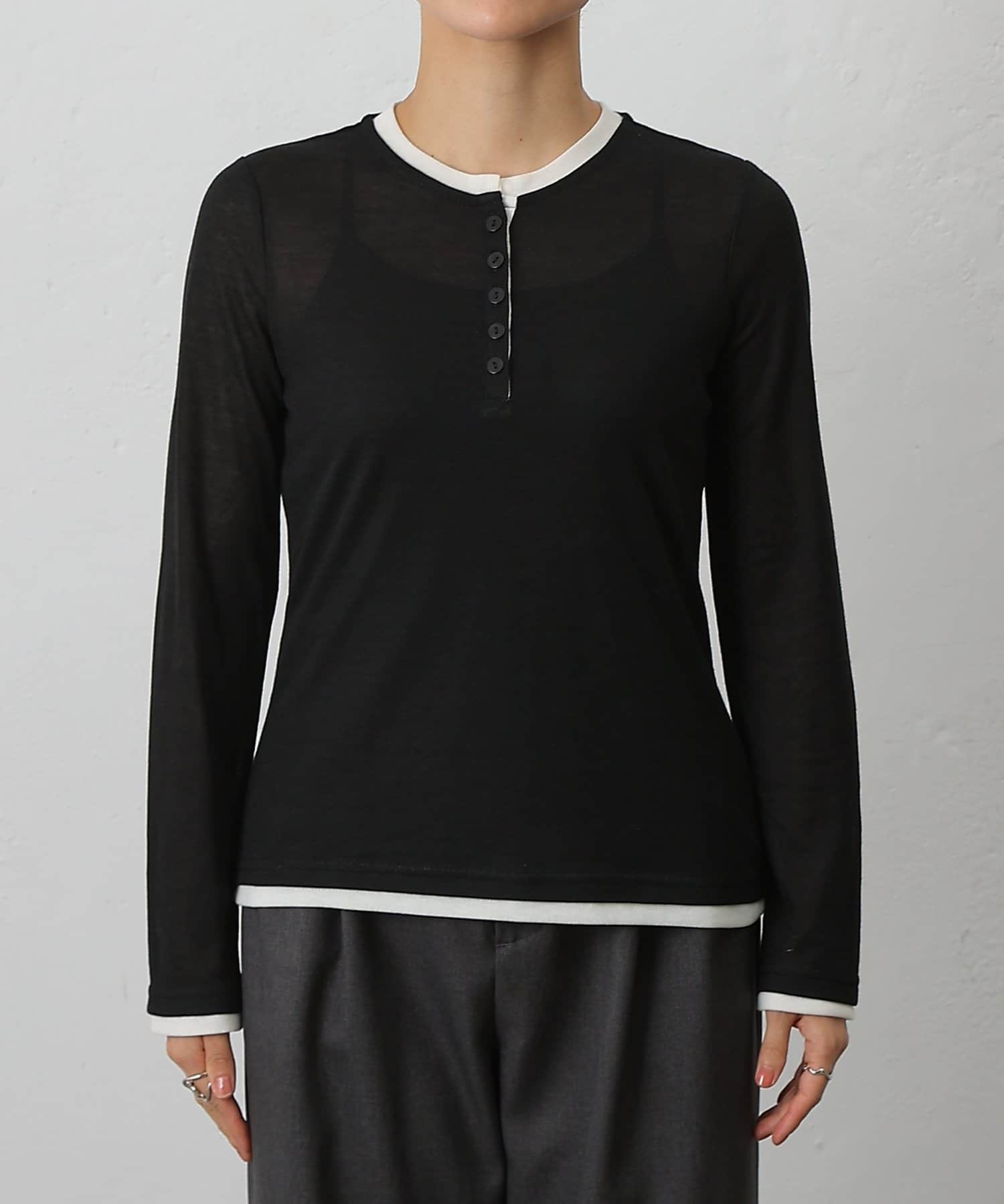 【1枚でレイヤード上手に、フェイクレイヤード×ヘンリーネックトップス】