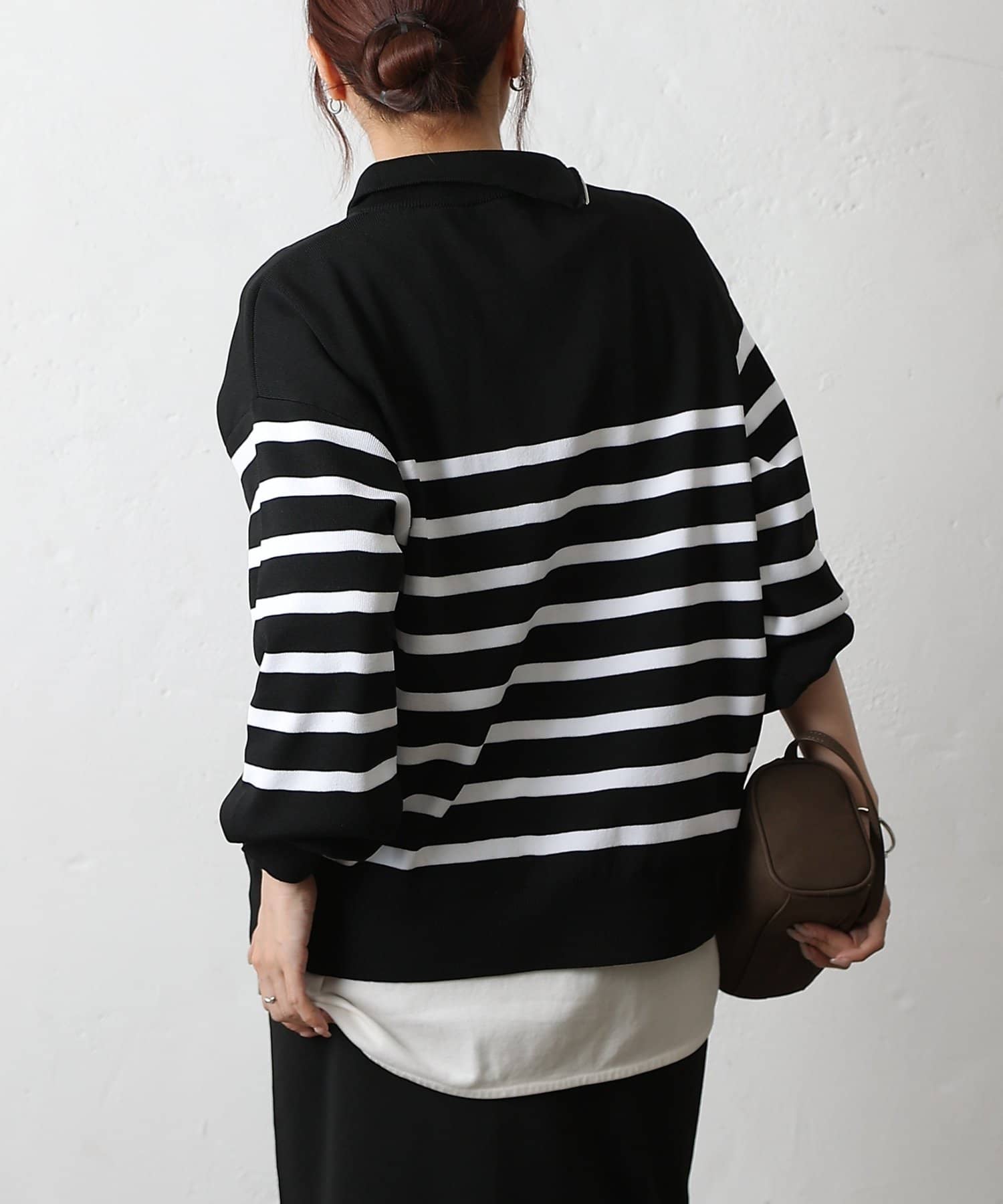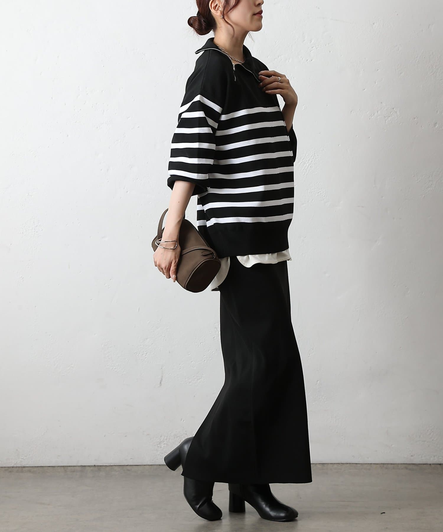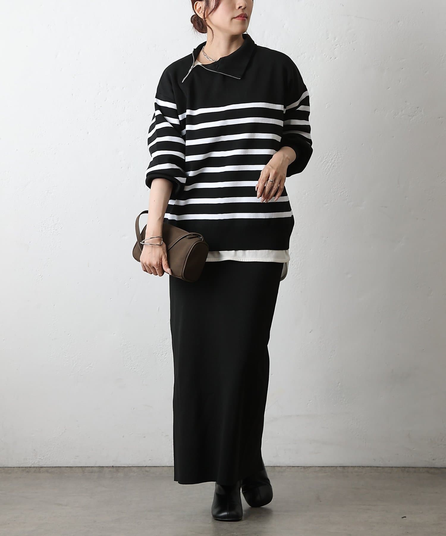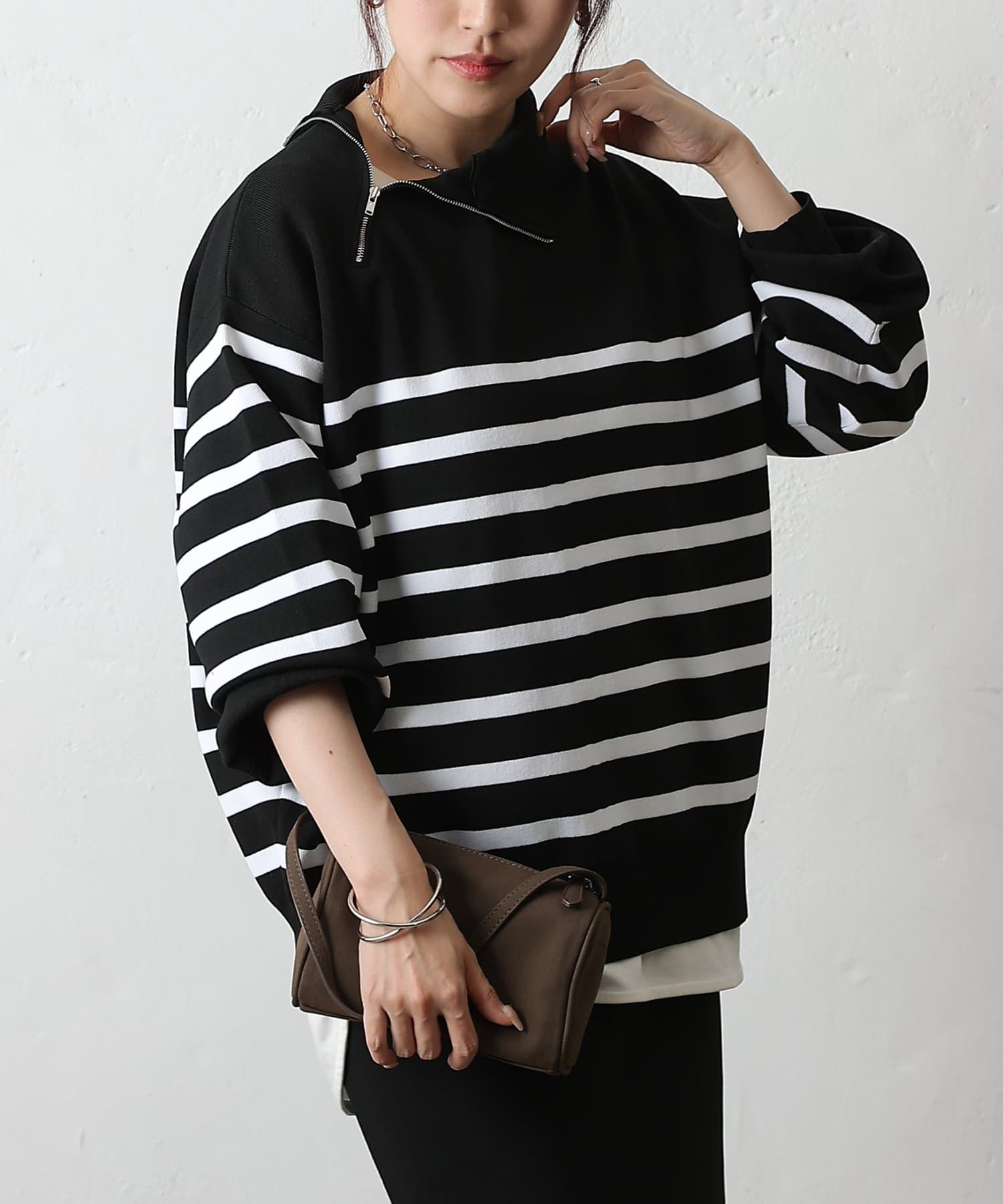 ベーシックなボーダーニットに、首元のジップがアクセントになったエステルヤーンニットです。