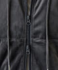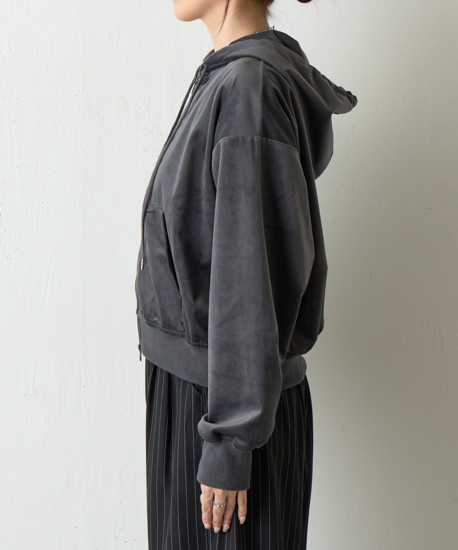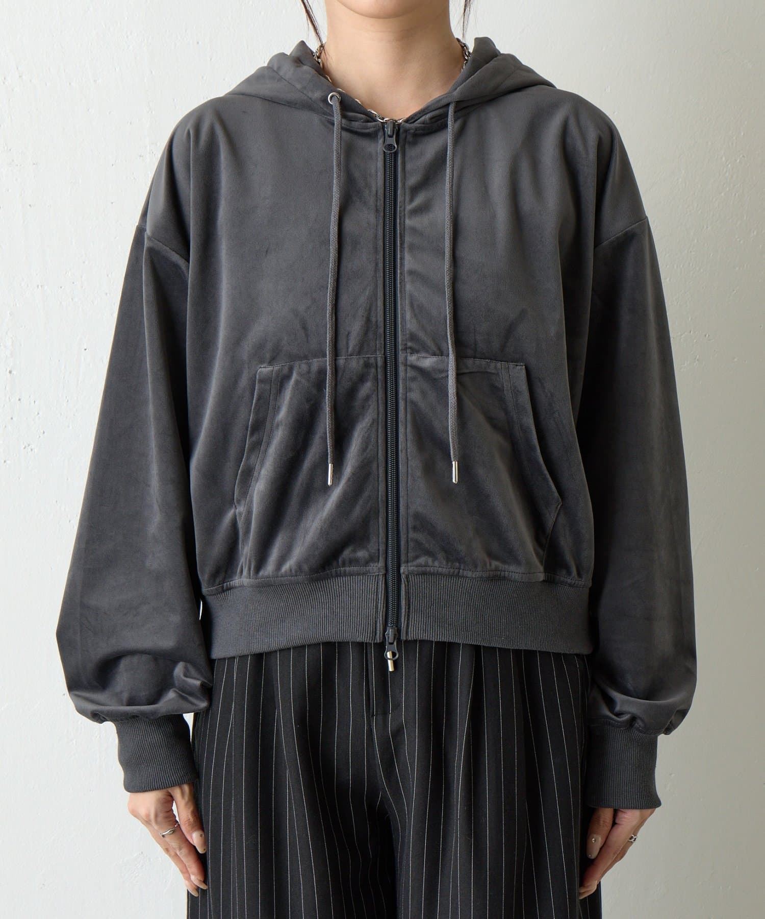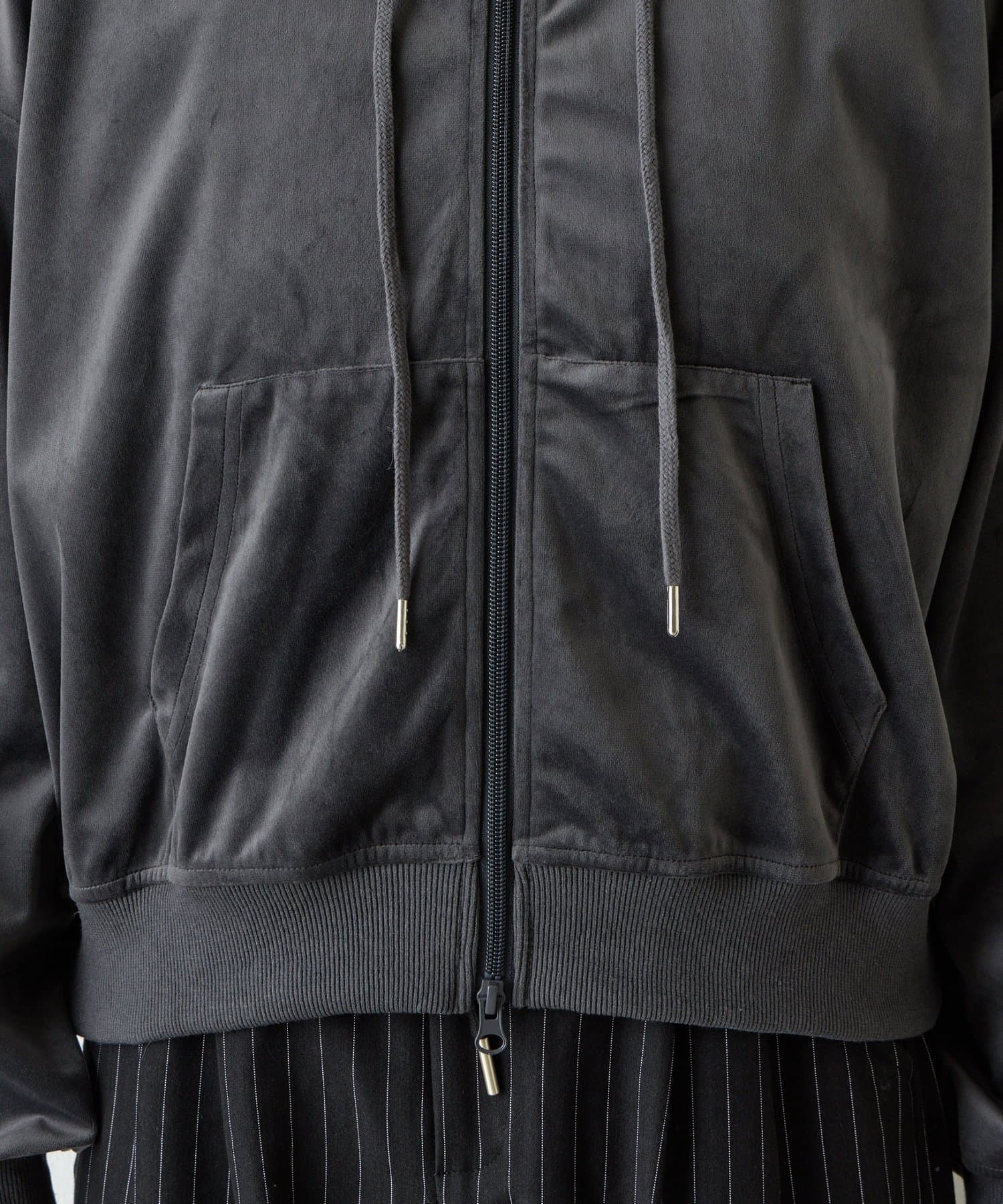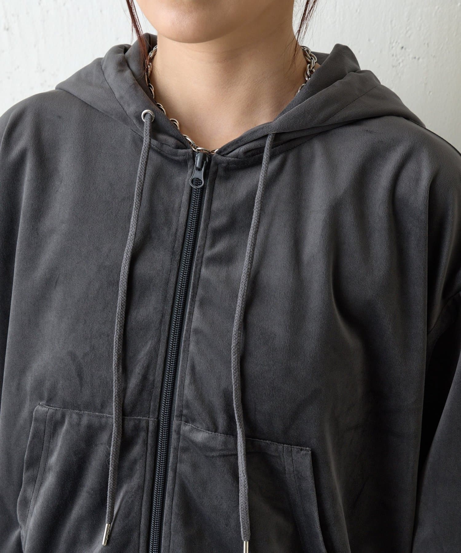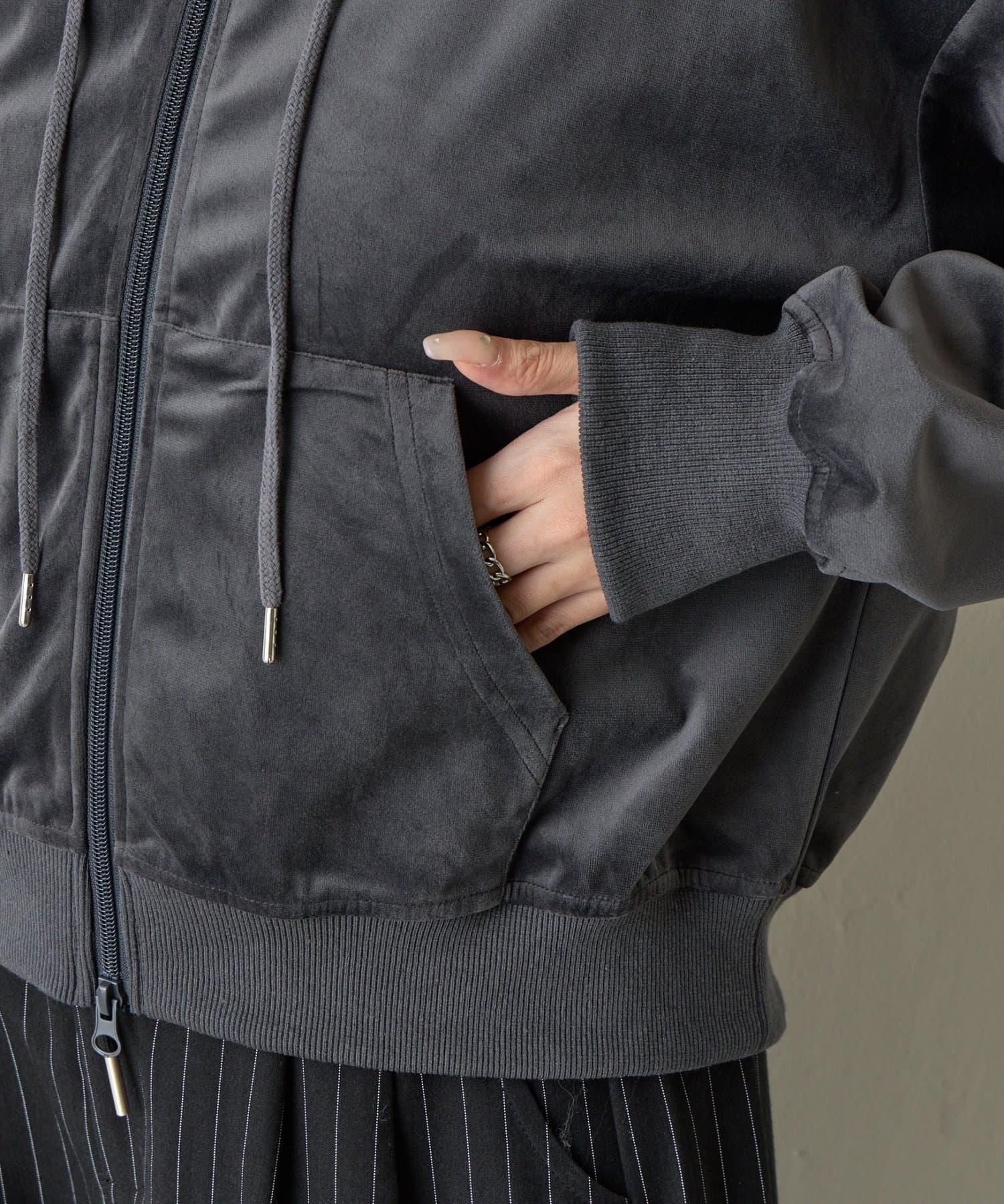 ベロア素材のやさしい肌触りと、上品な光沢が大人の余裕を感じさせるZIPパーカーです。