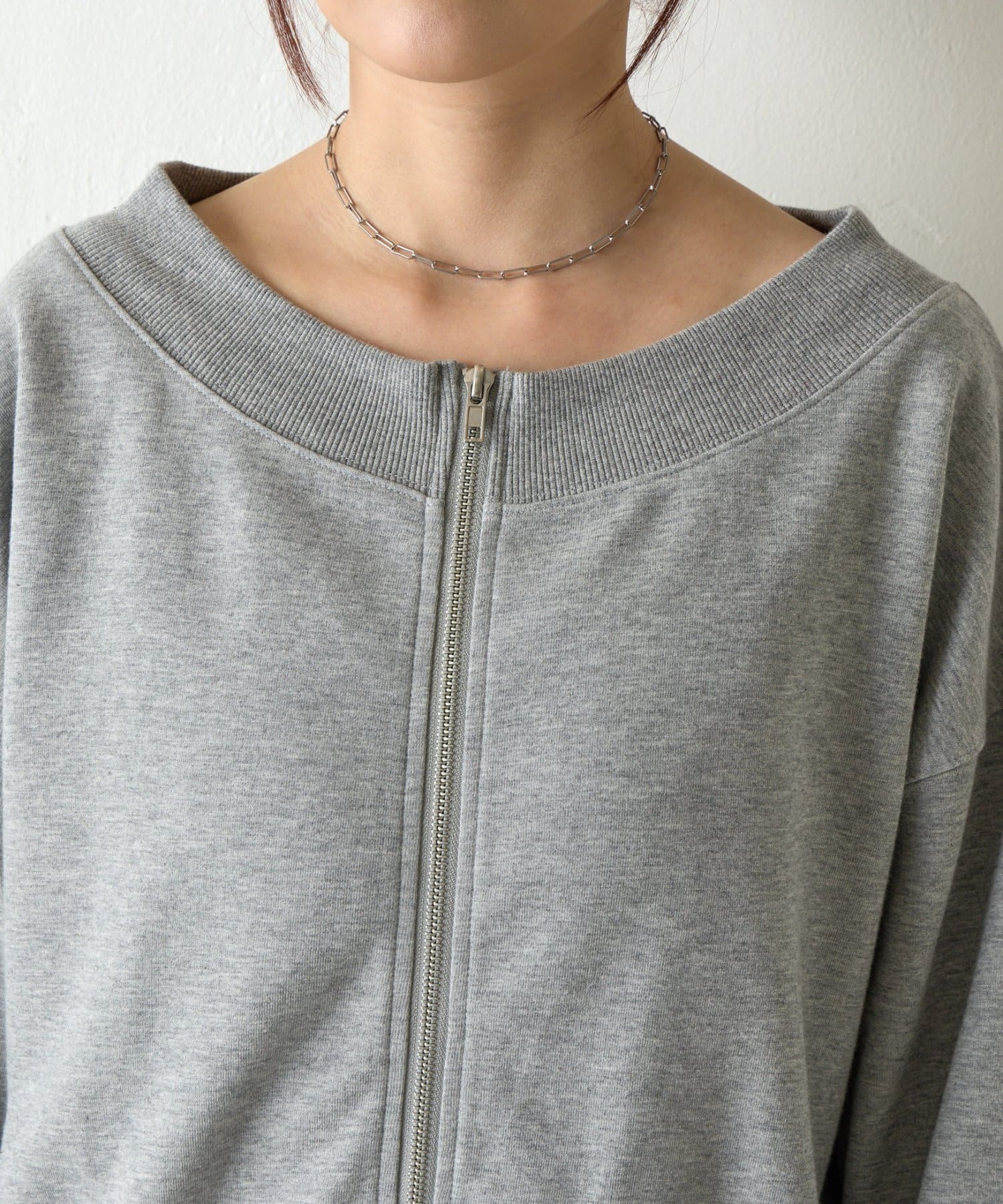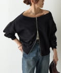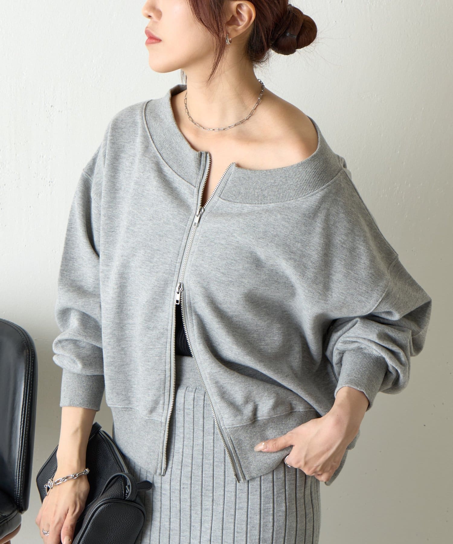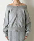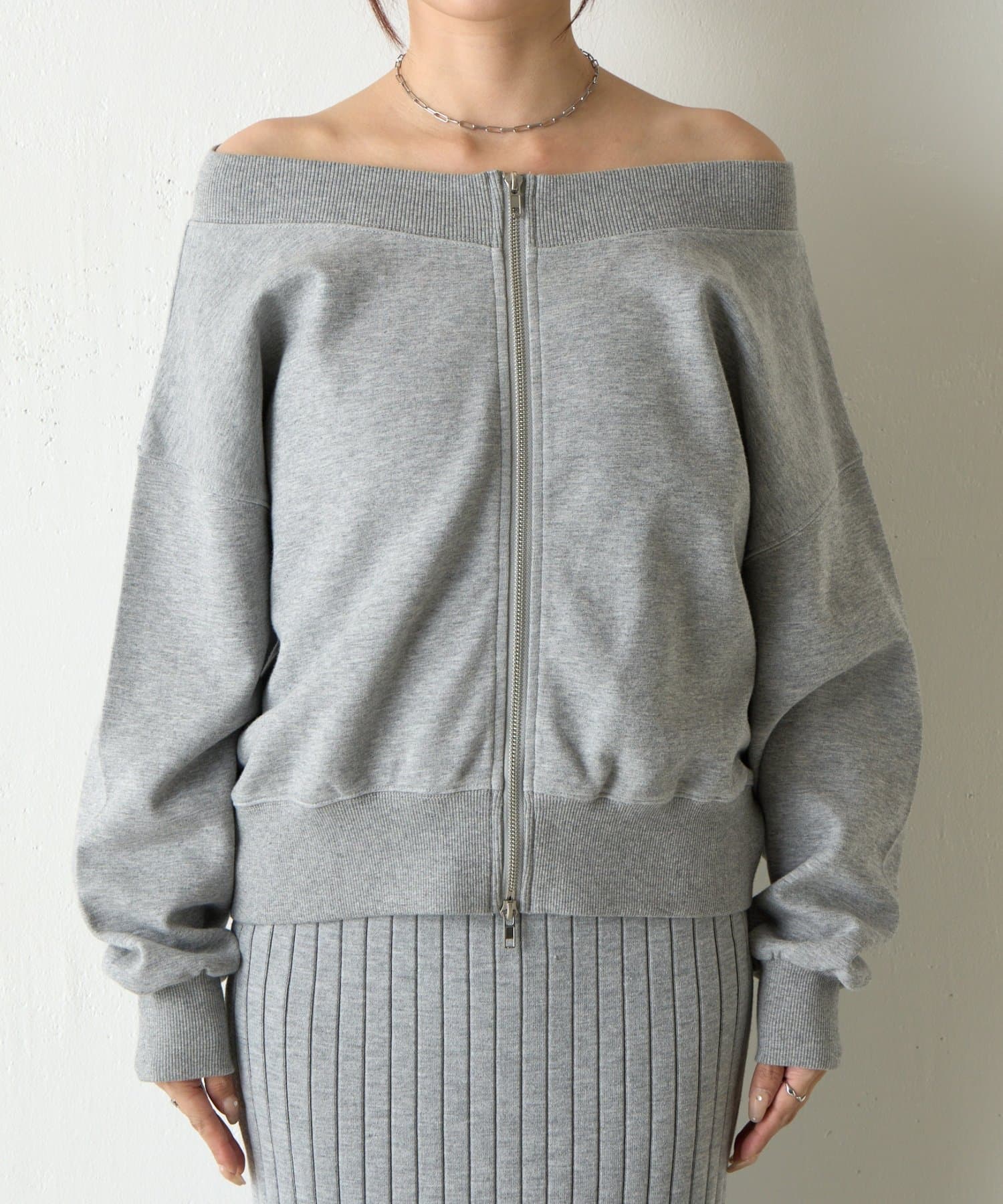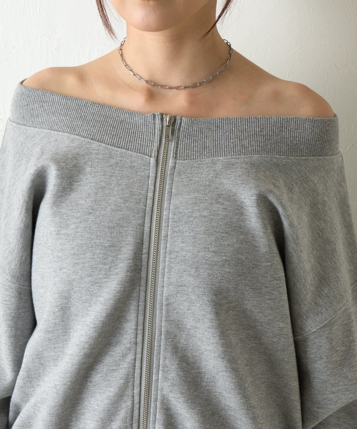 首元から肩にかけて広めに開いたオフショルデザインに、ZIPを効かせることで甘さを抑えた大人っぽい仕上がりに。
