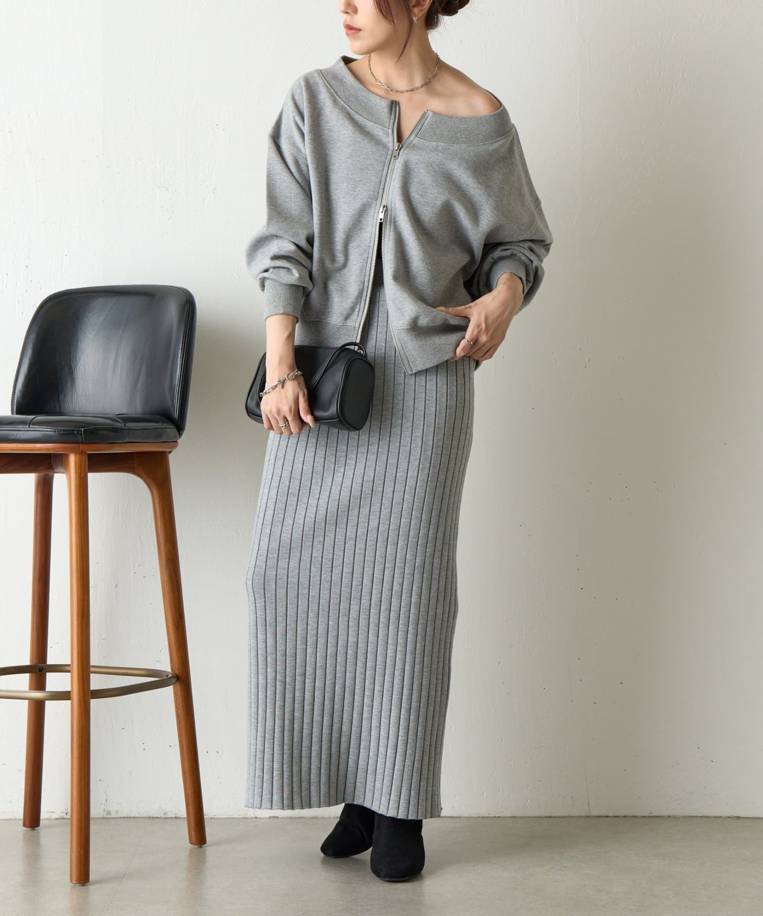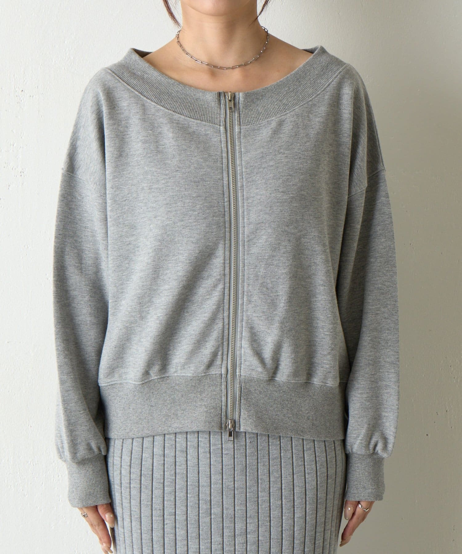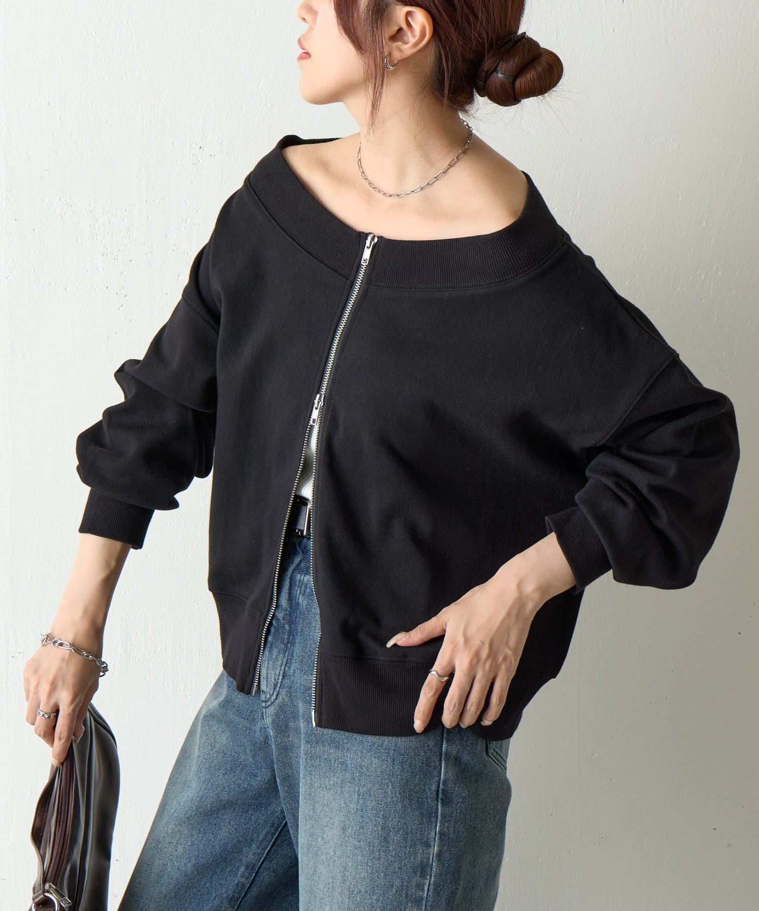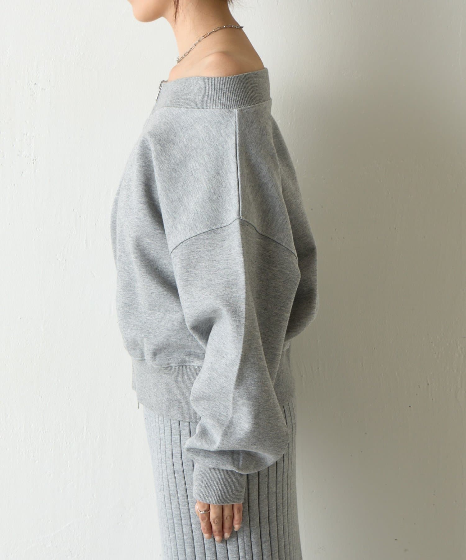 首元から肩にかけて広めに開いたオフショルデザインに、ZIPを効かせることで甘さを抑えた大人っぽい仕上がりに。