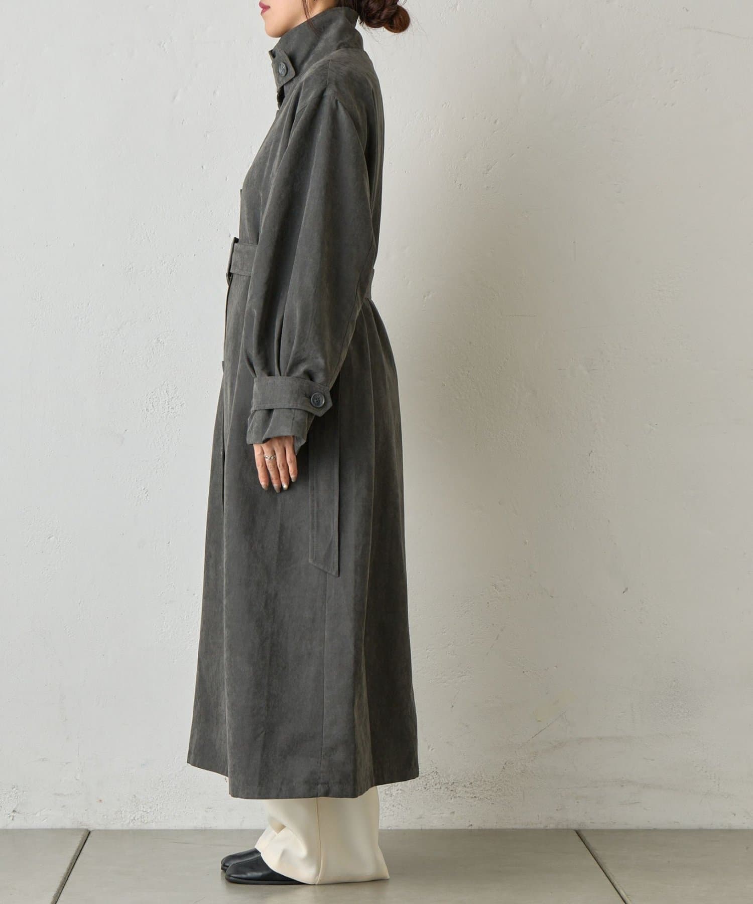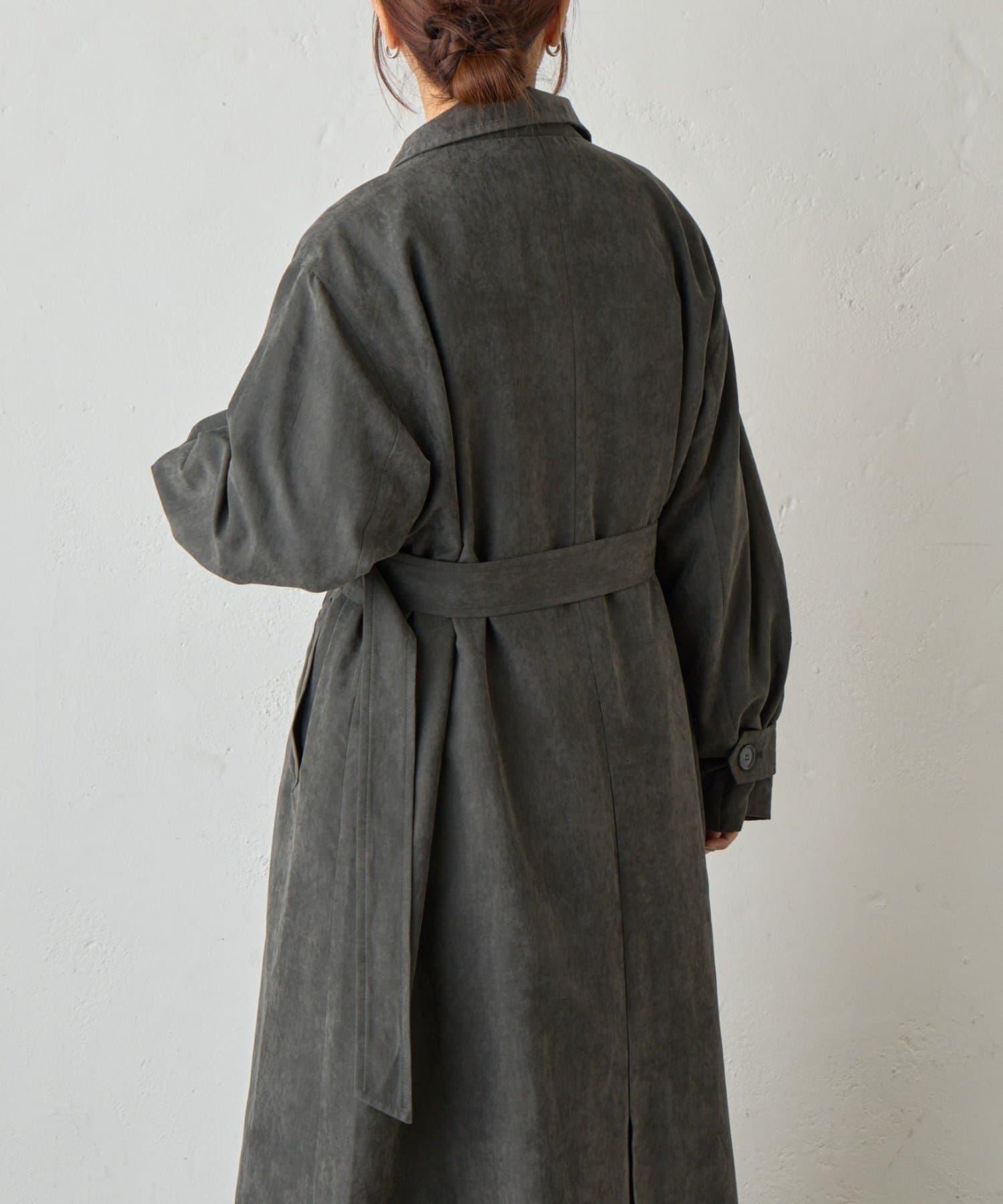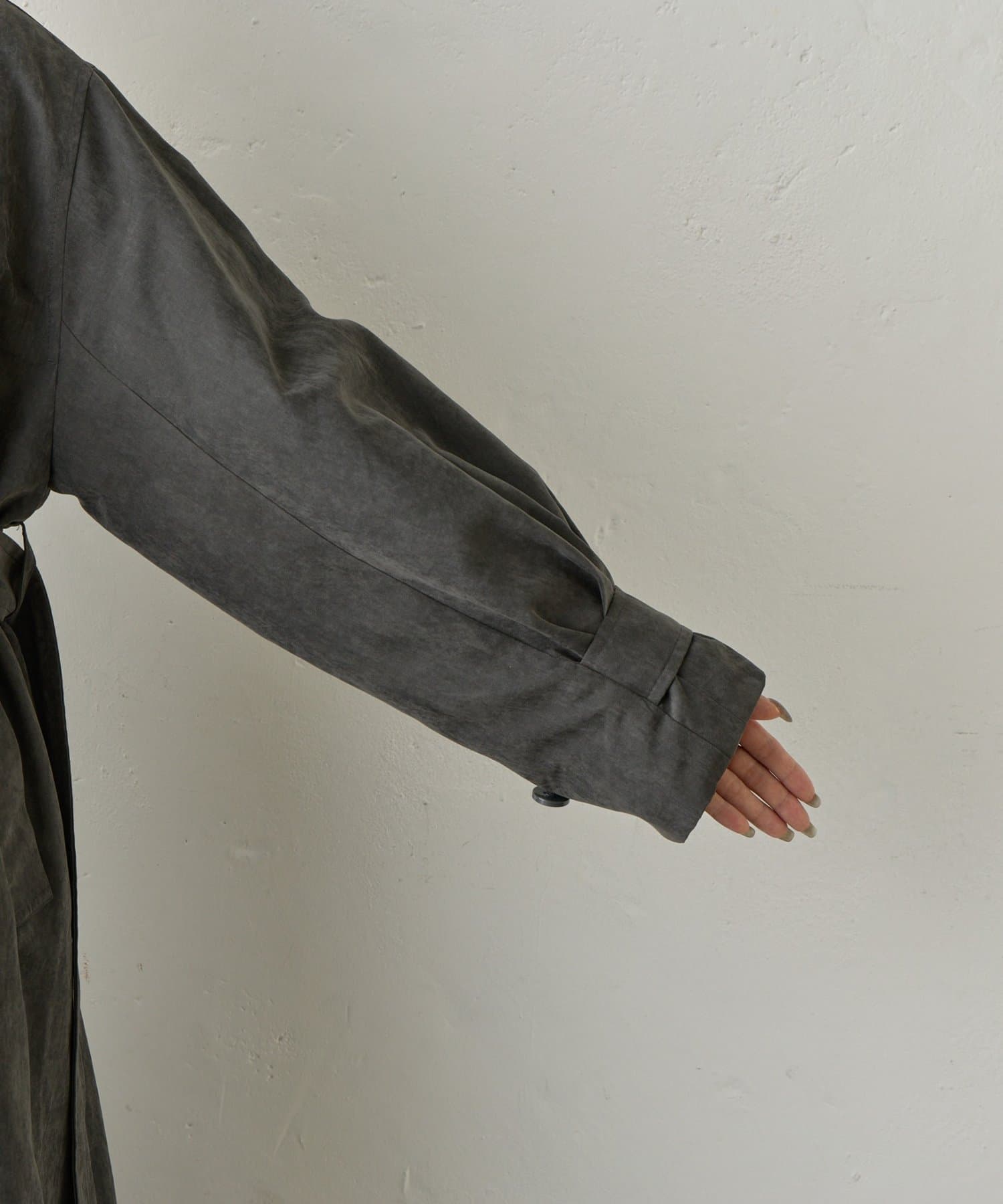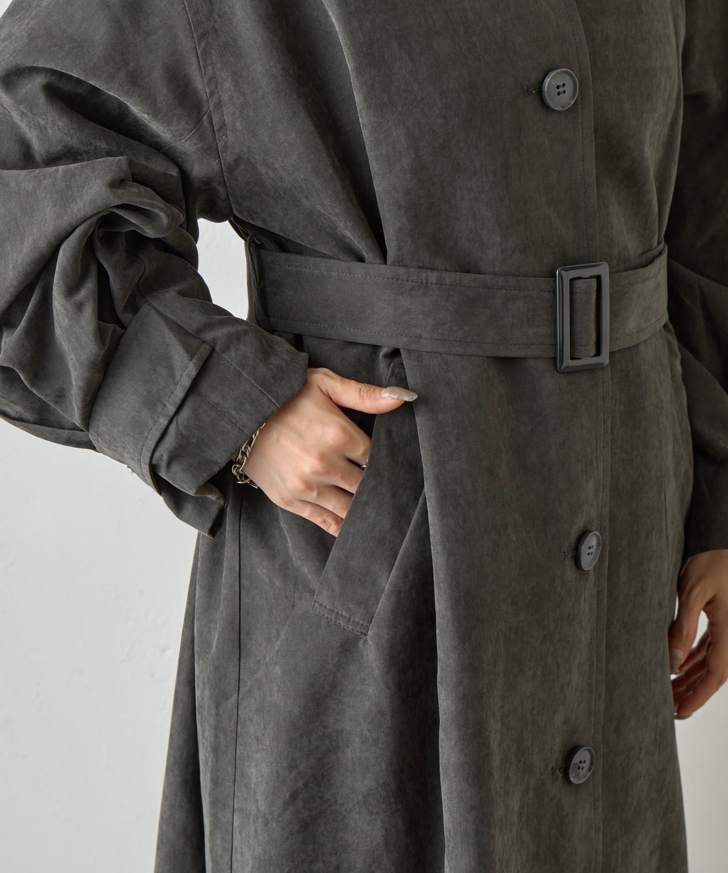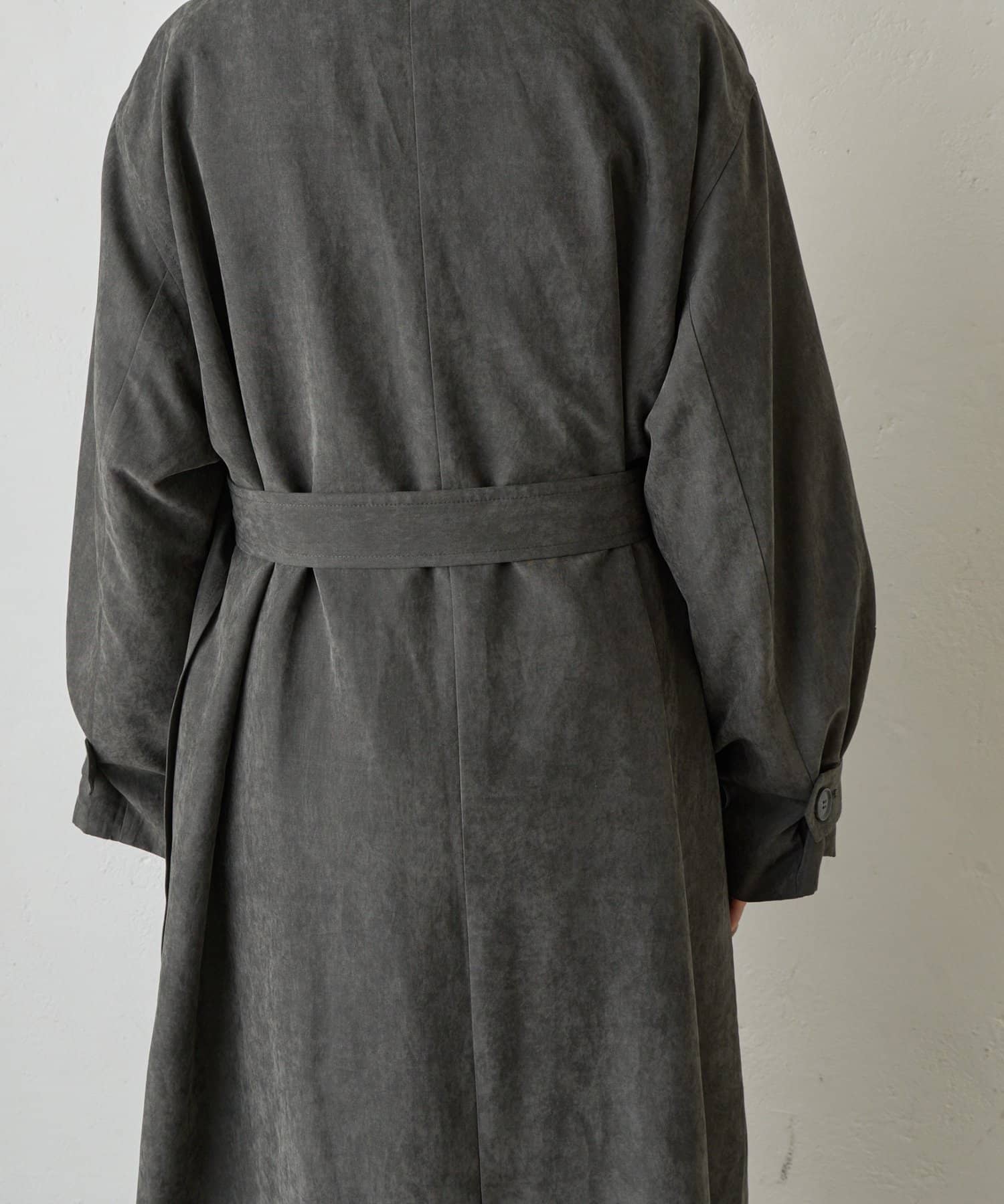 しなやかで肌ざわりの良いピーチスキン素材を使用したロング丈のトレンチコートです。