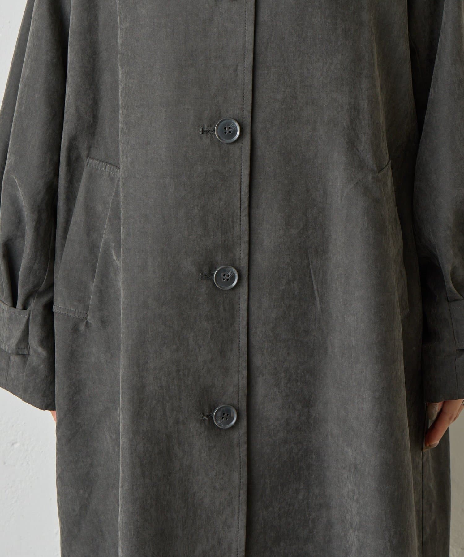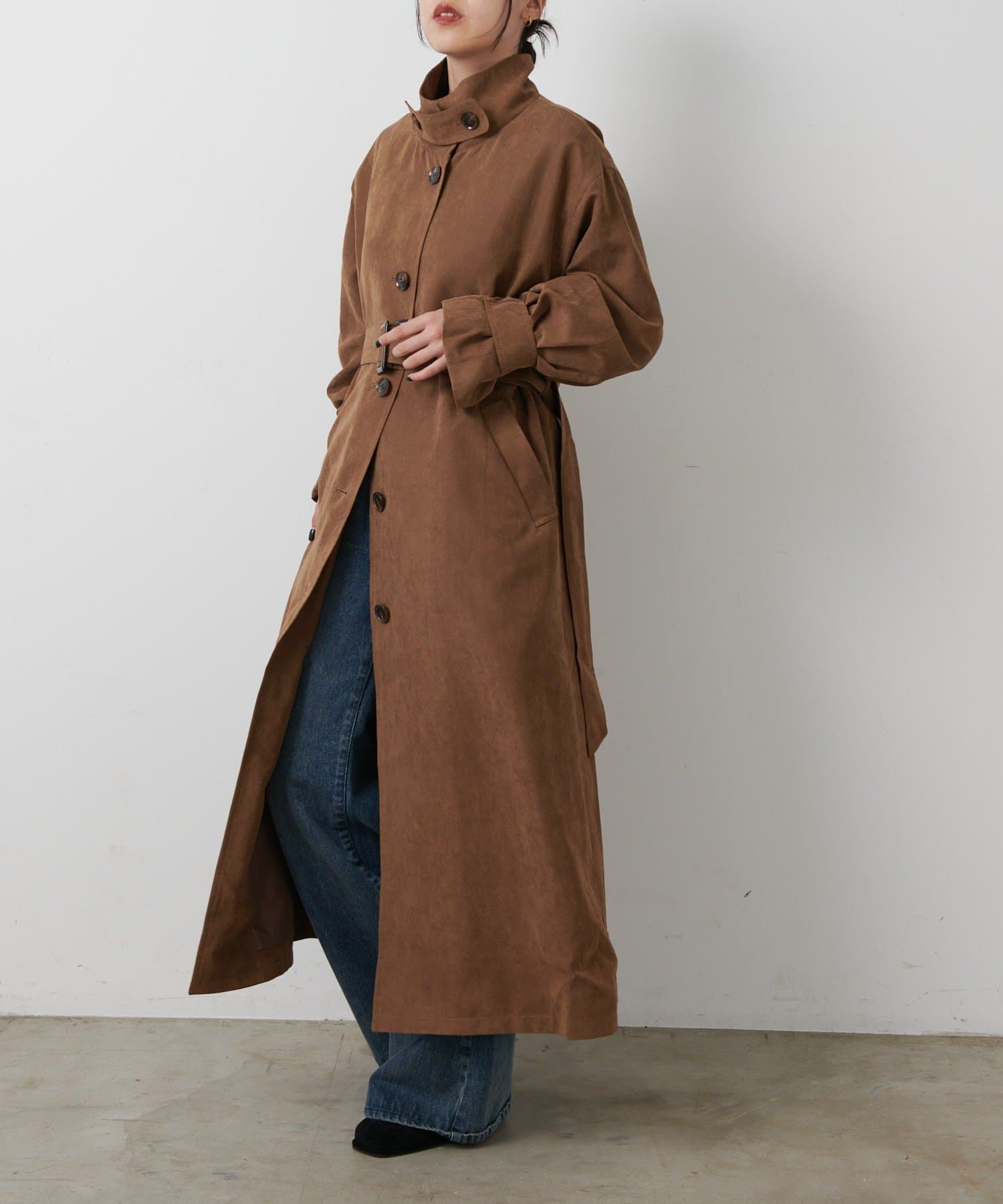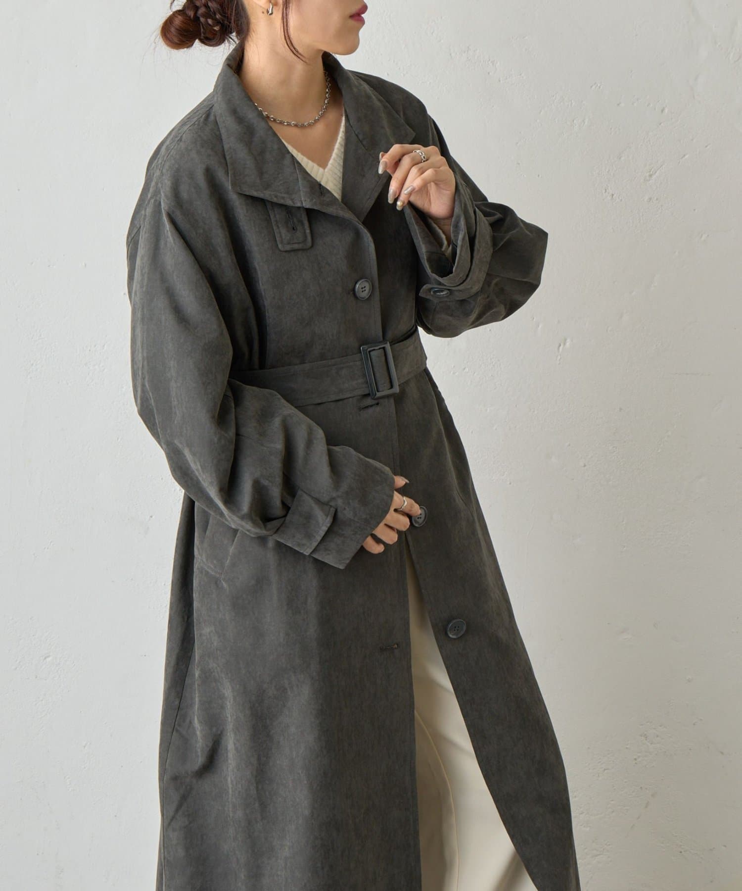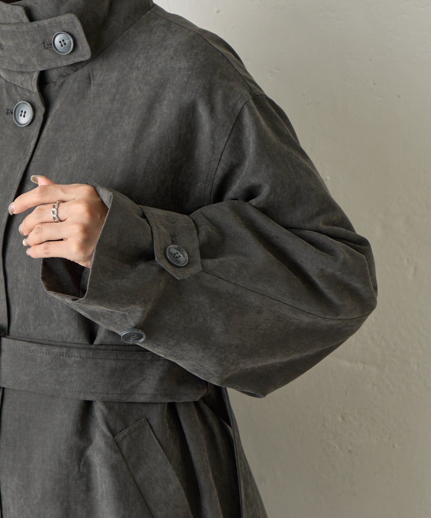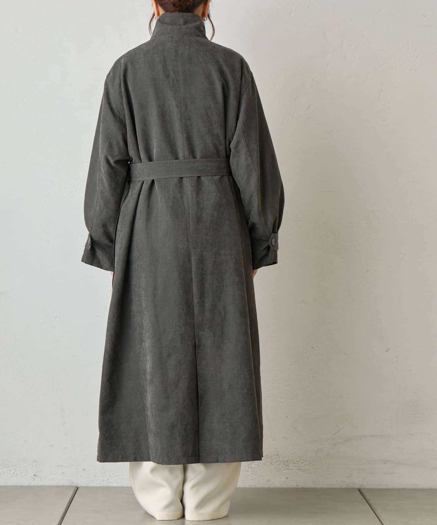 しなやかで肌ざわりの良いピーチスキン素材を使用したロング丈のトレンチコートです。