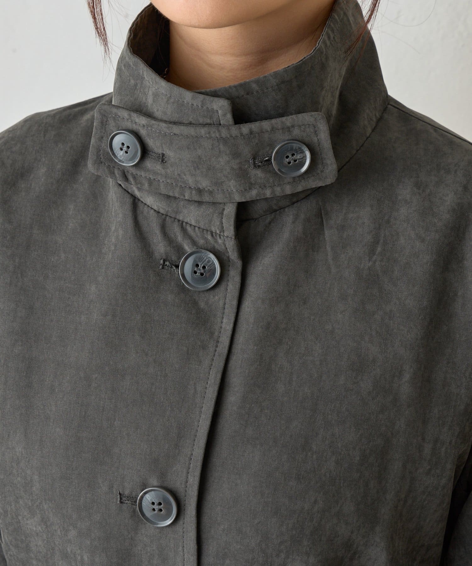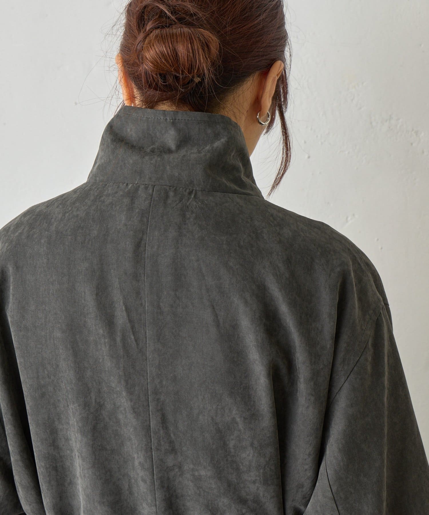 マットな質感と微起毛のやさしい風合いが特徴で、上品な佇まいと自然な落ち感が魅力の一着です。