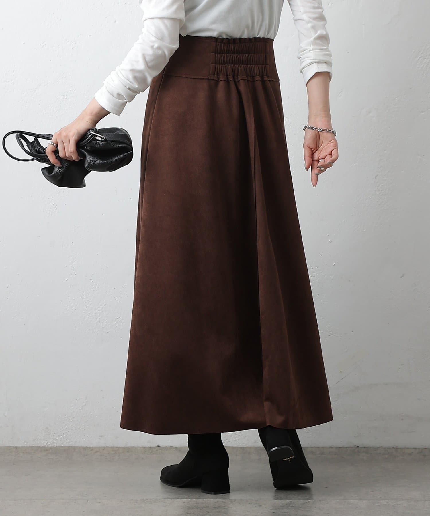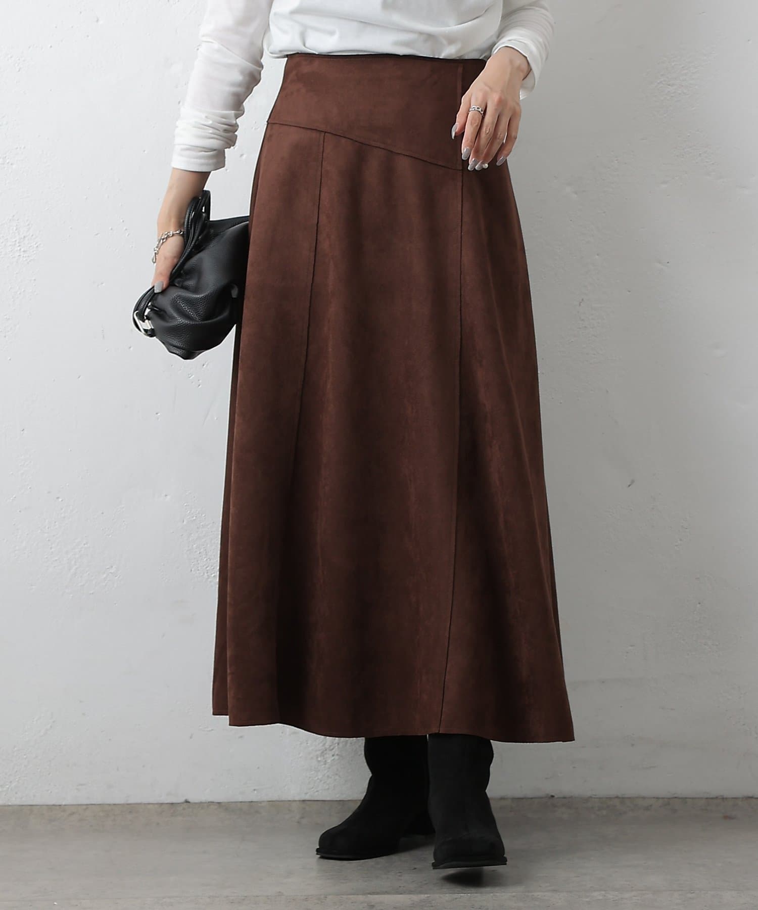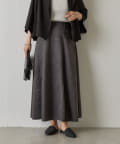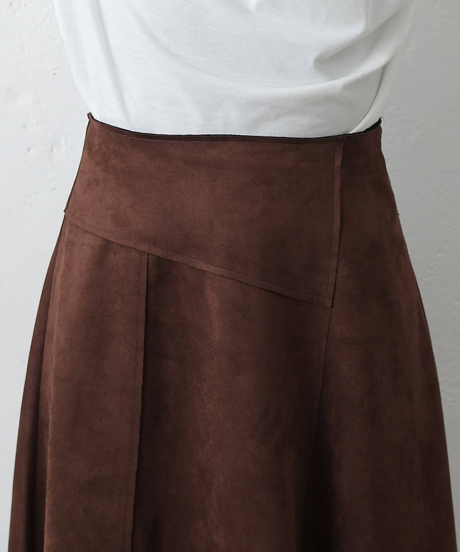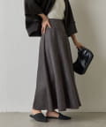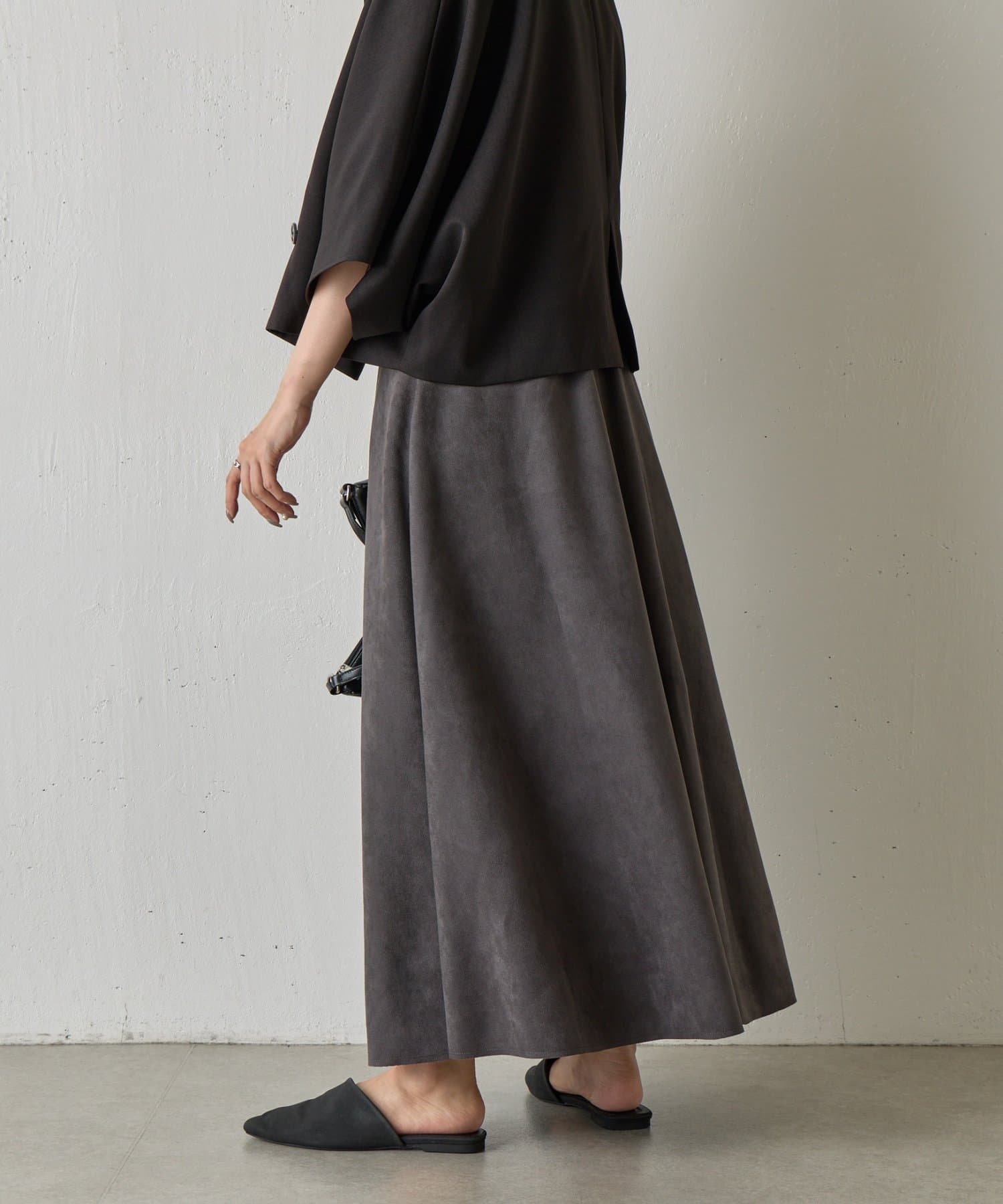 しっとりとした手触りと上品な光沢が魅力のスエードポンチ素材を使用した女性らしい切替フレアスカートです。