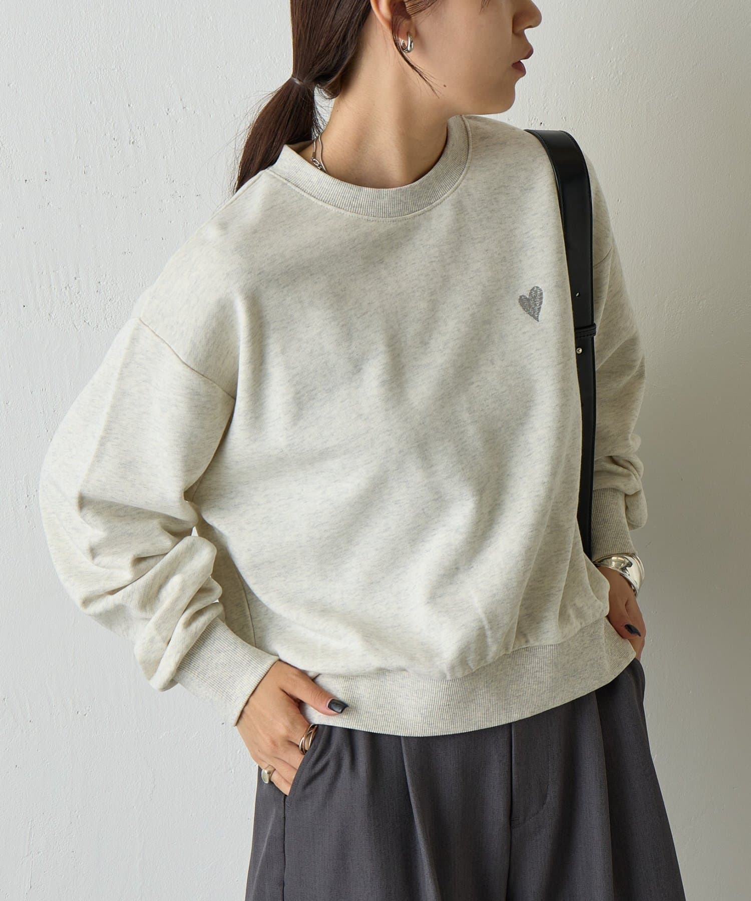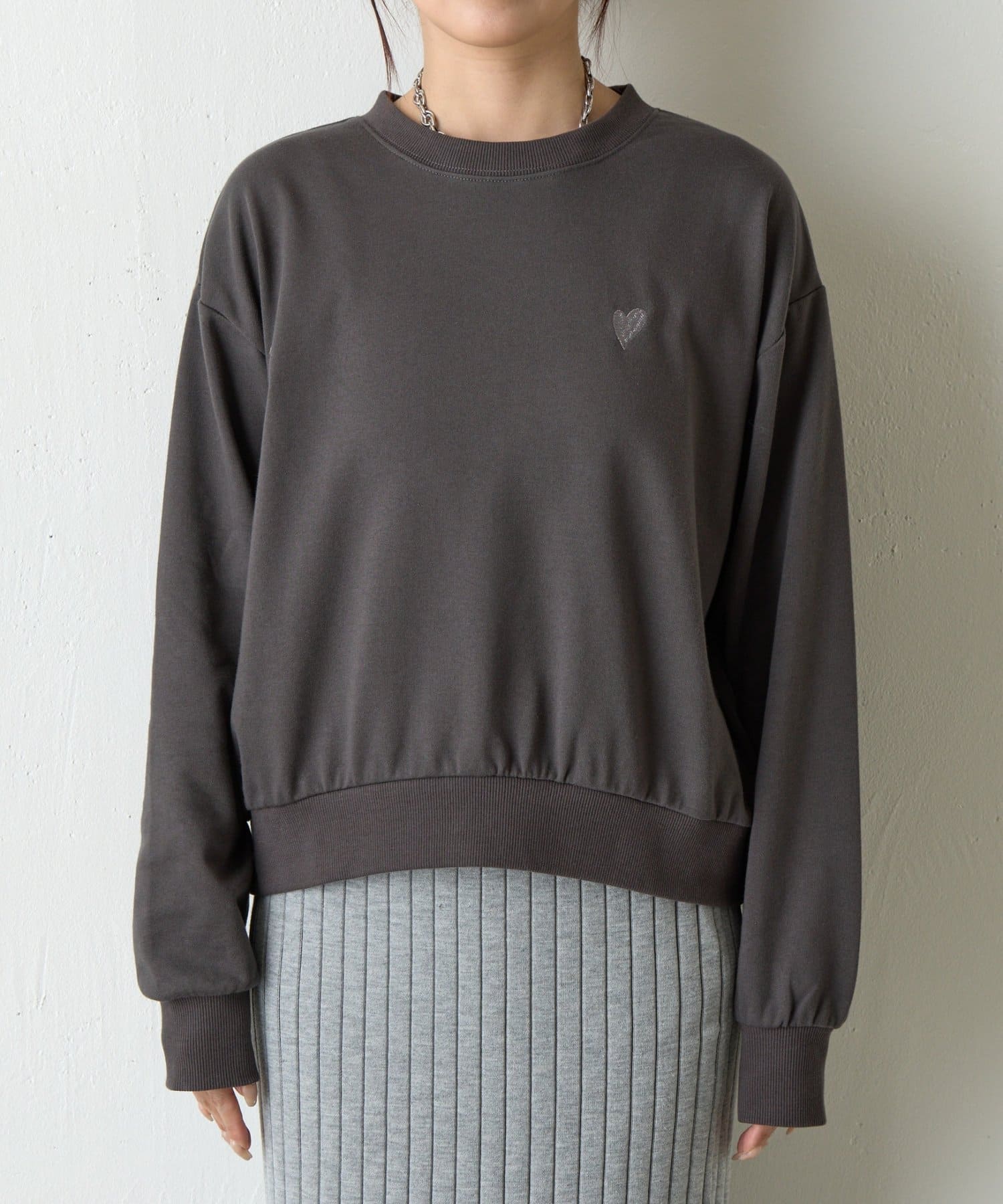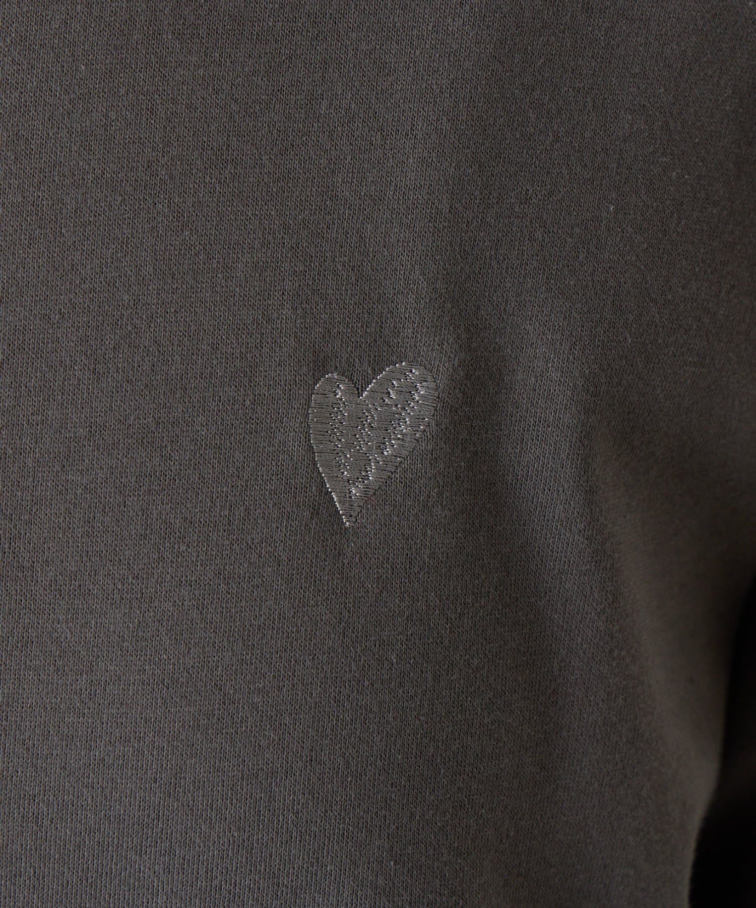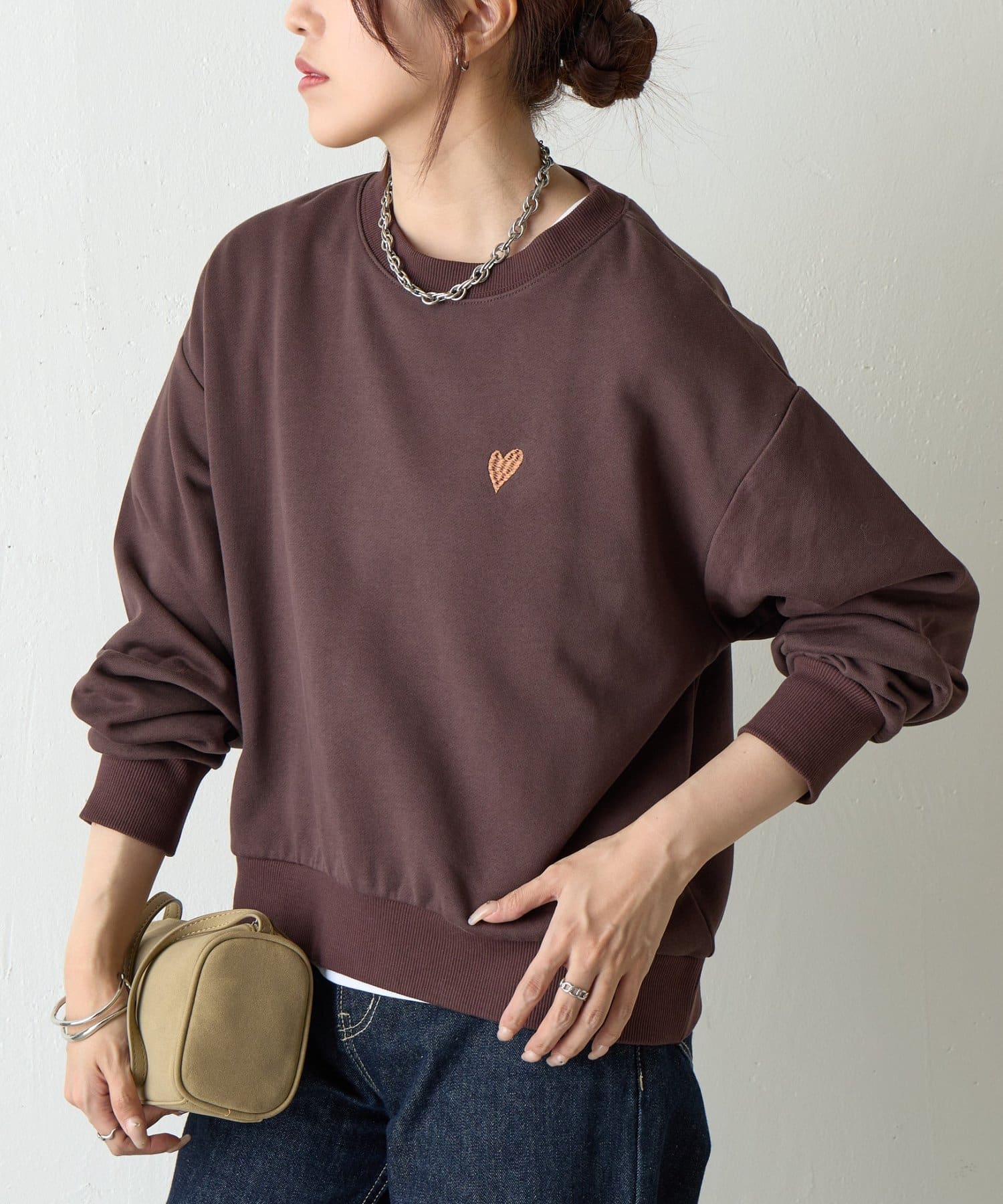 全体の色味と同系色の刺繍がさりげないワンポイントのハート刺繍プルオーバーです。