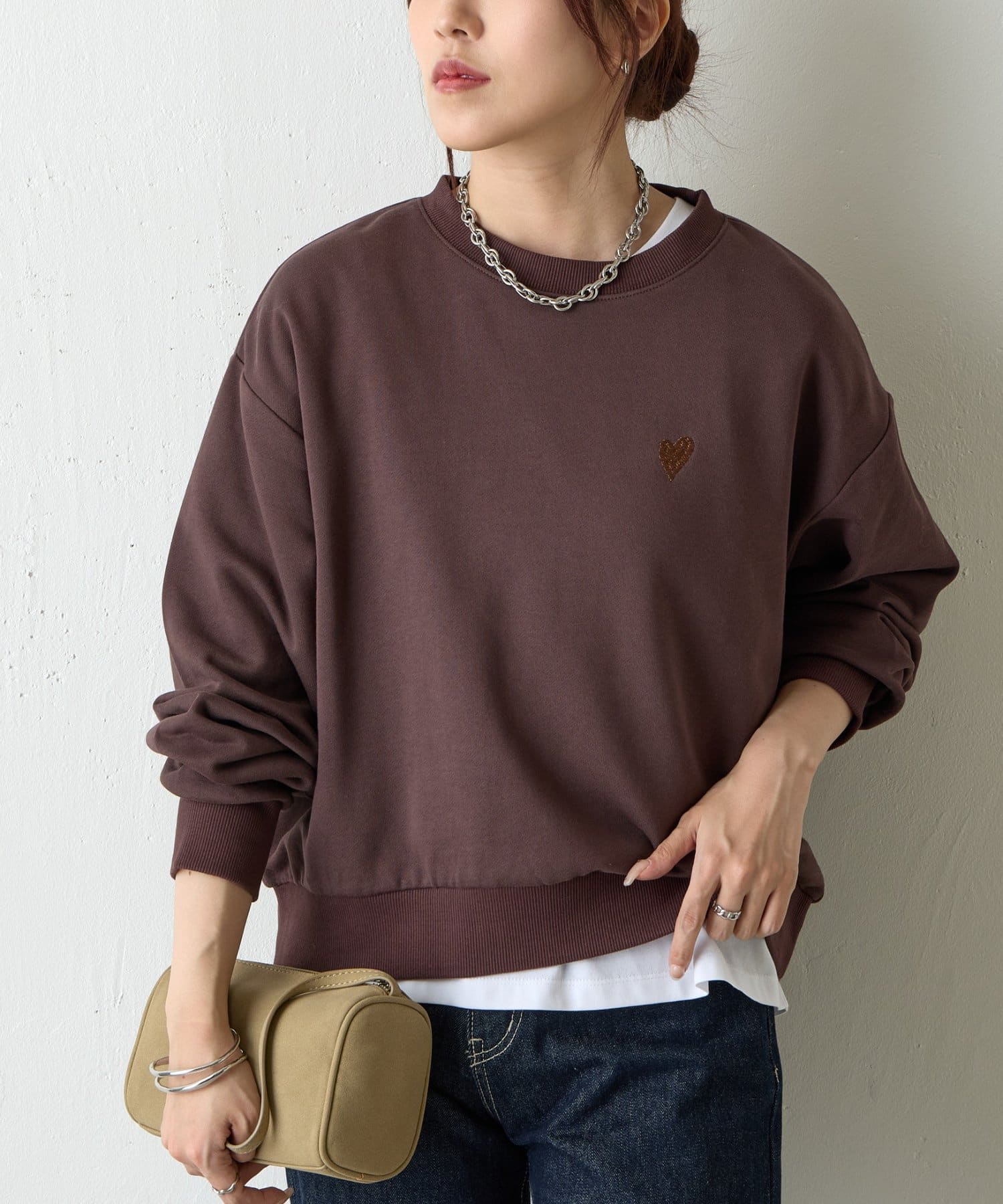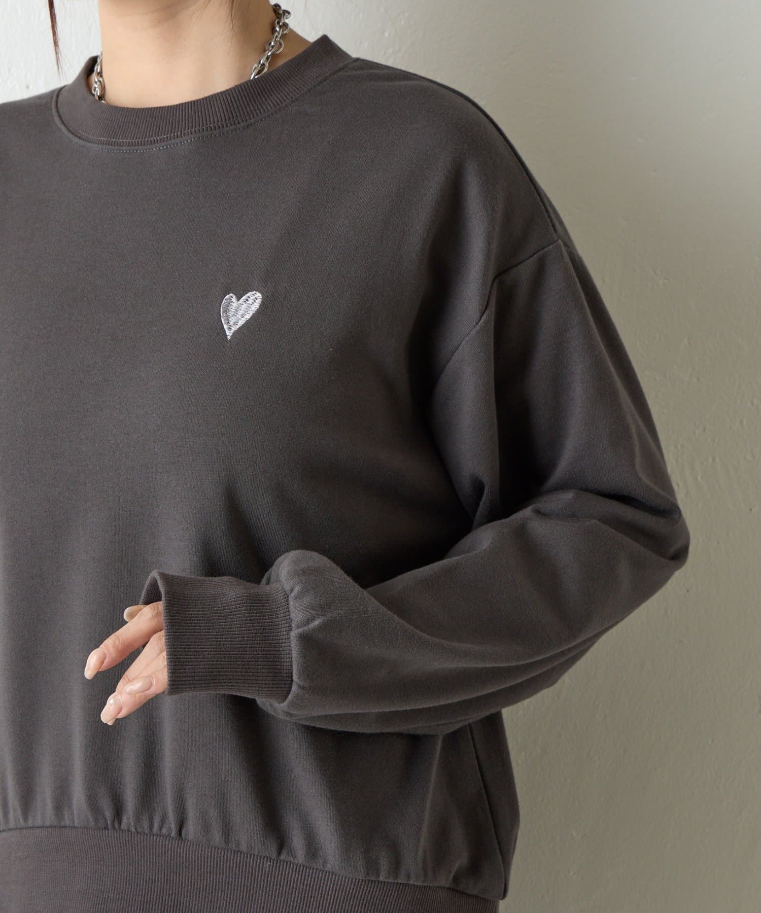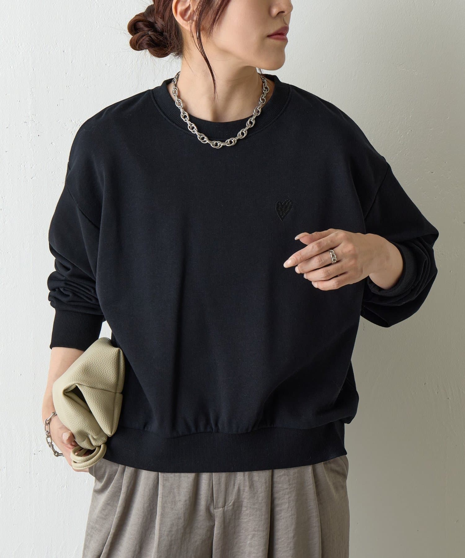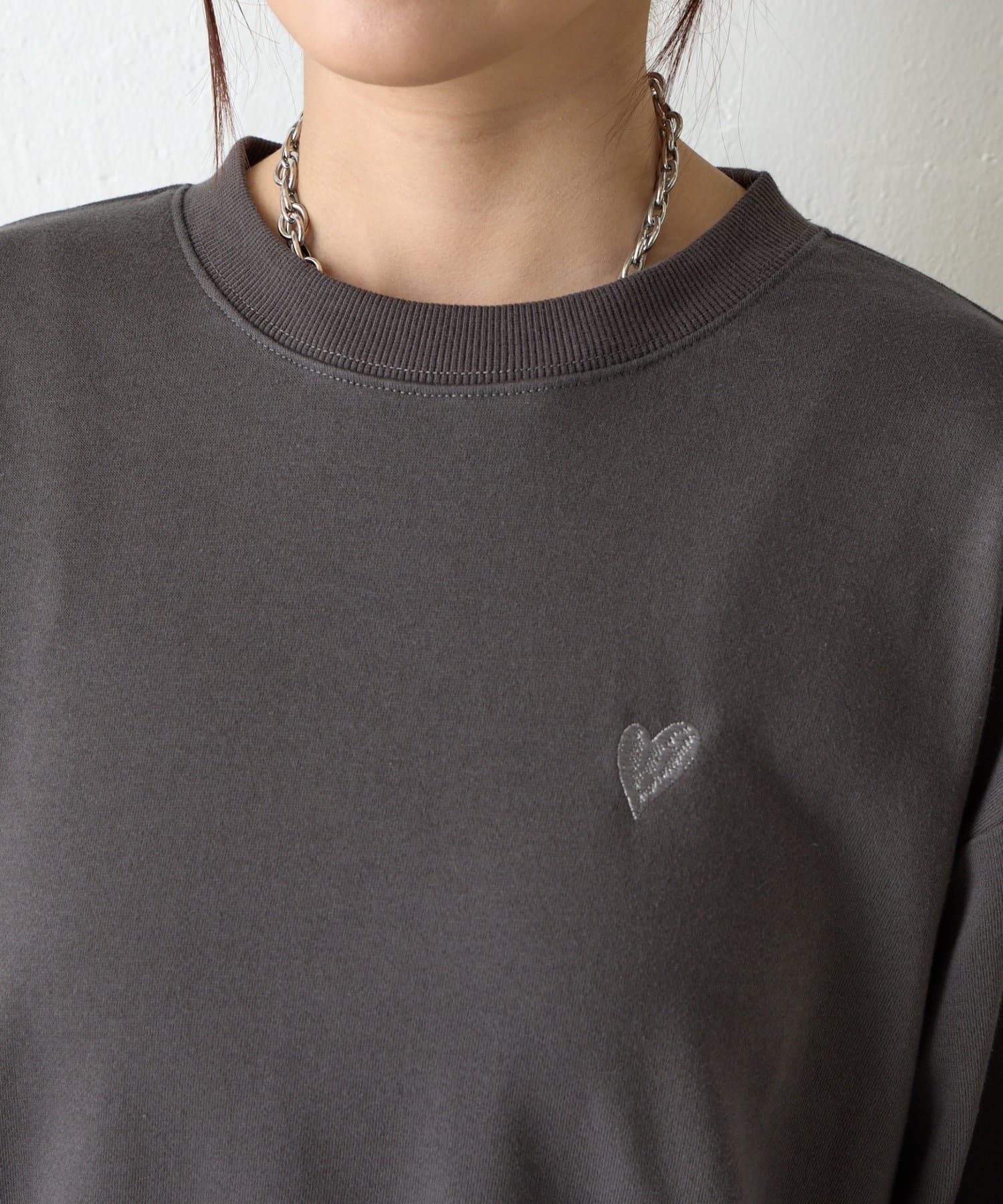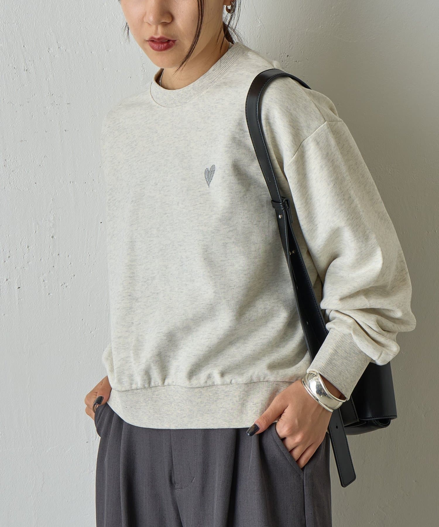 全体の色味と同系色の刺繍がさりげないワンポイントのハート刺繍プルオーバーです。