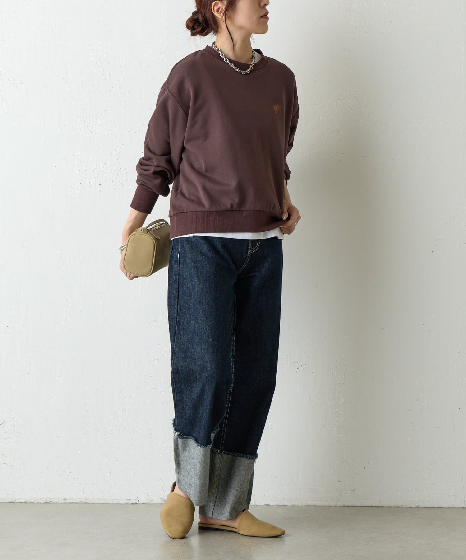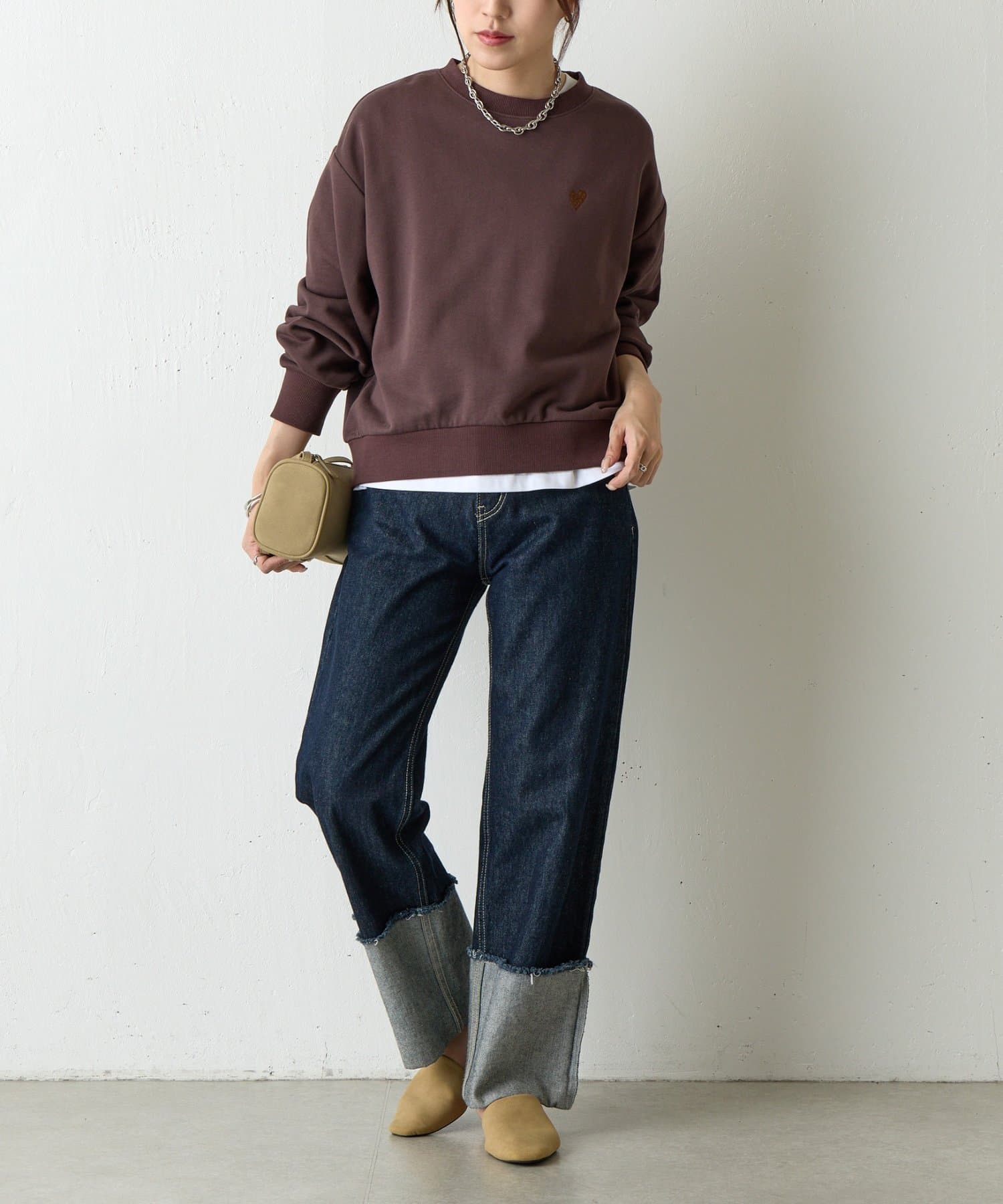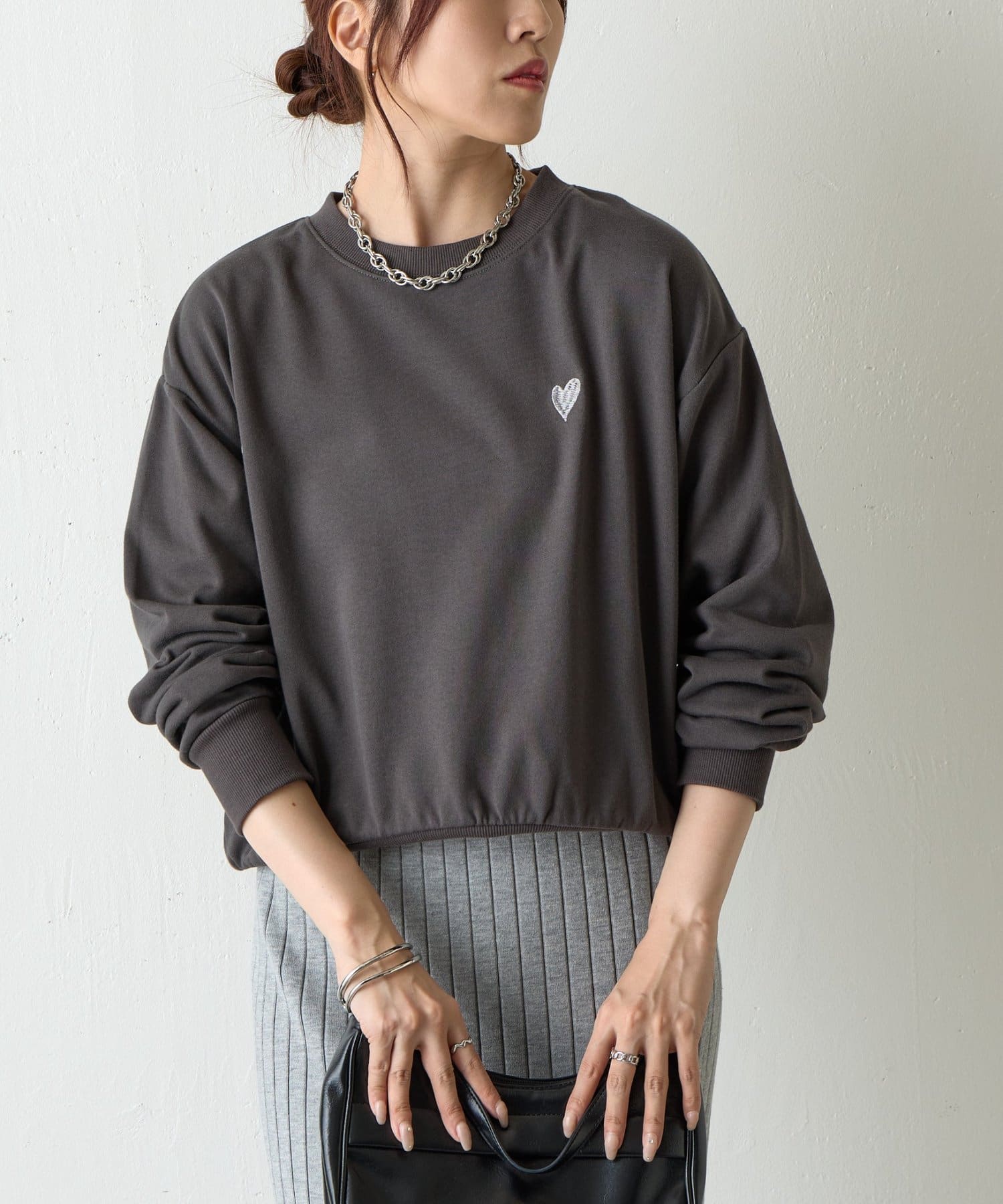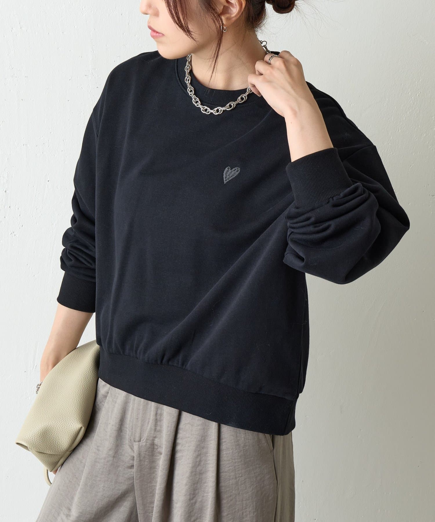全体の色味と同系色の刺繍がさりげないワンポイントのハート刺繍プルオーバーです。