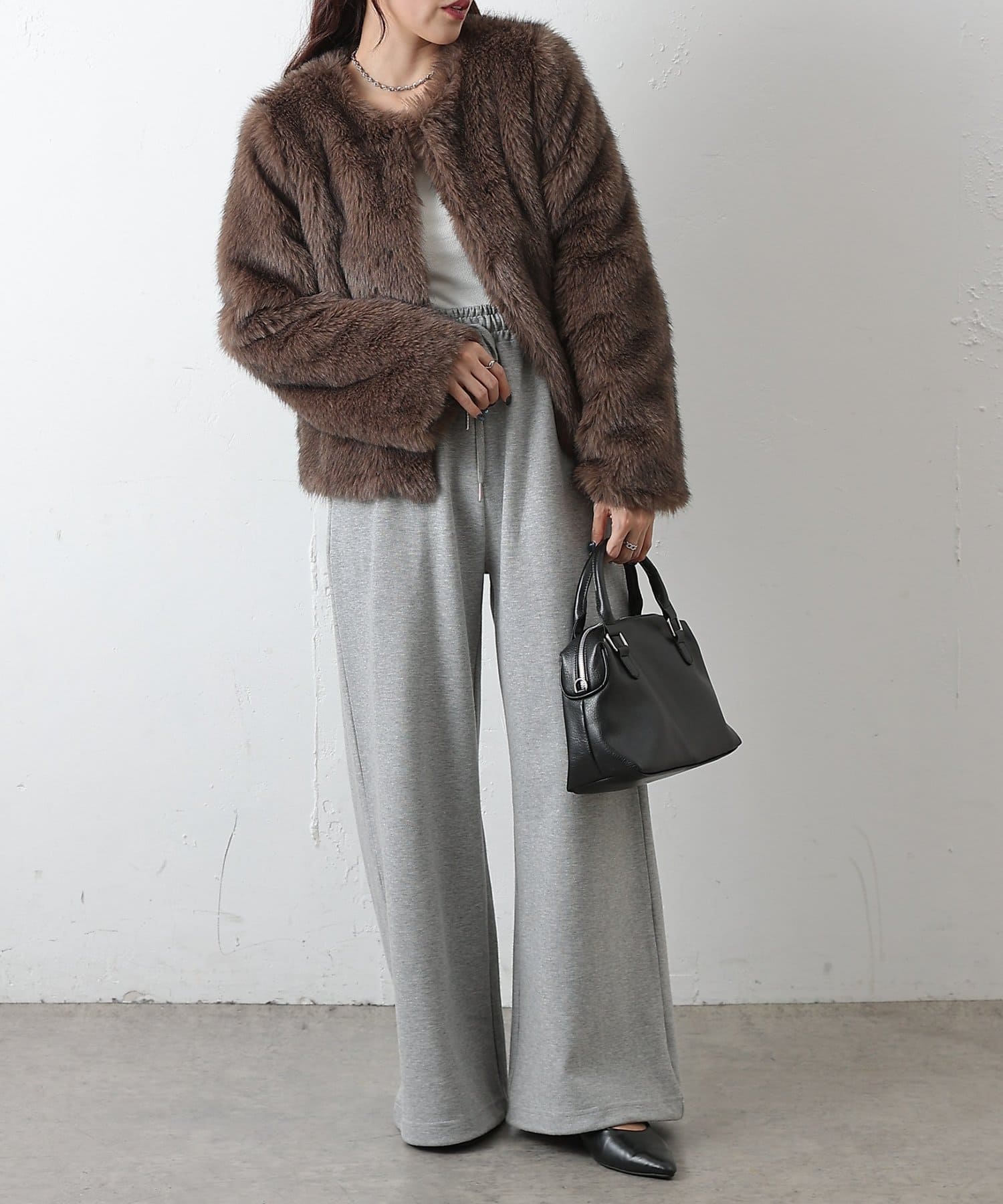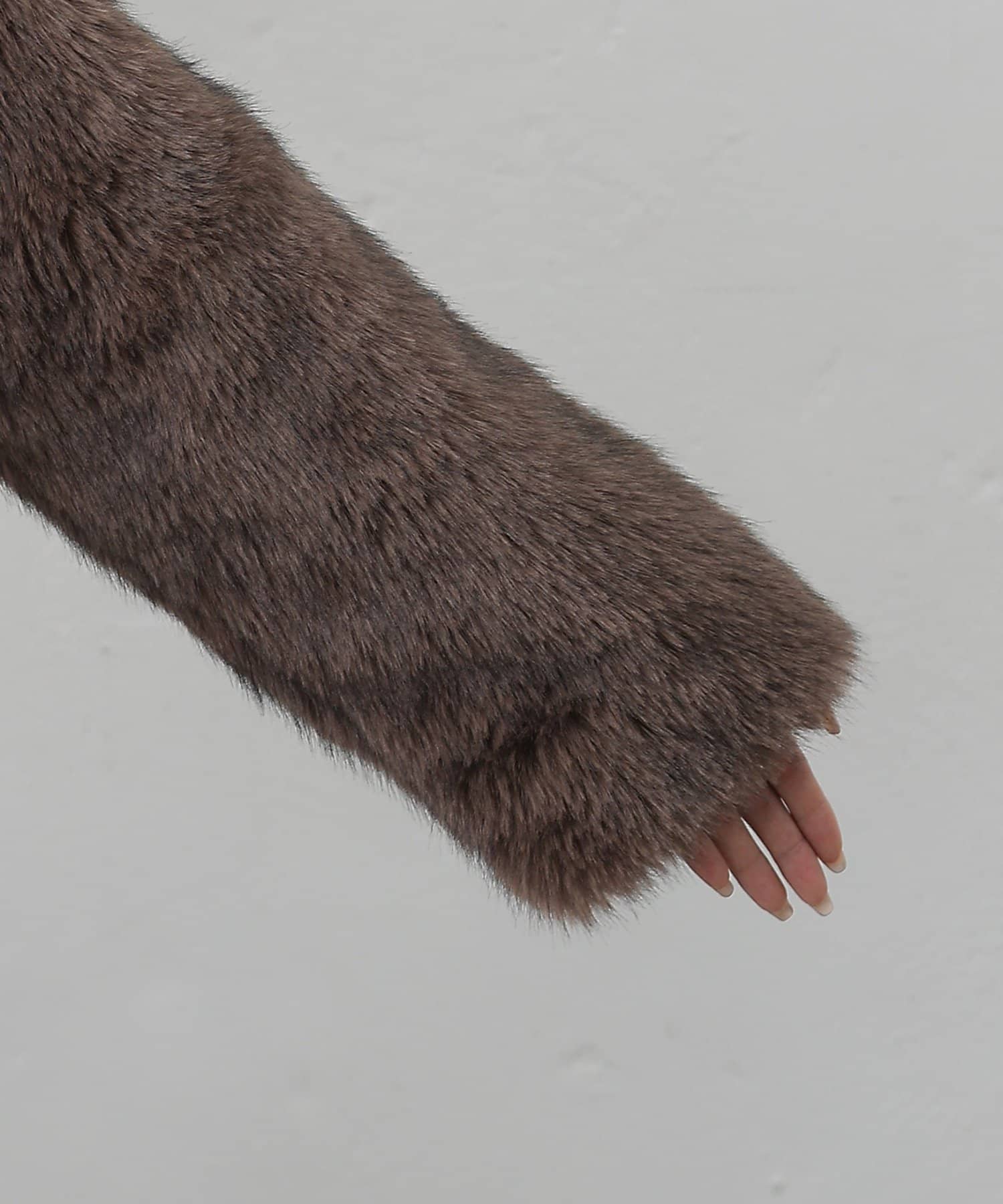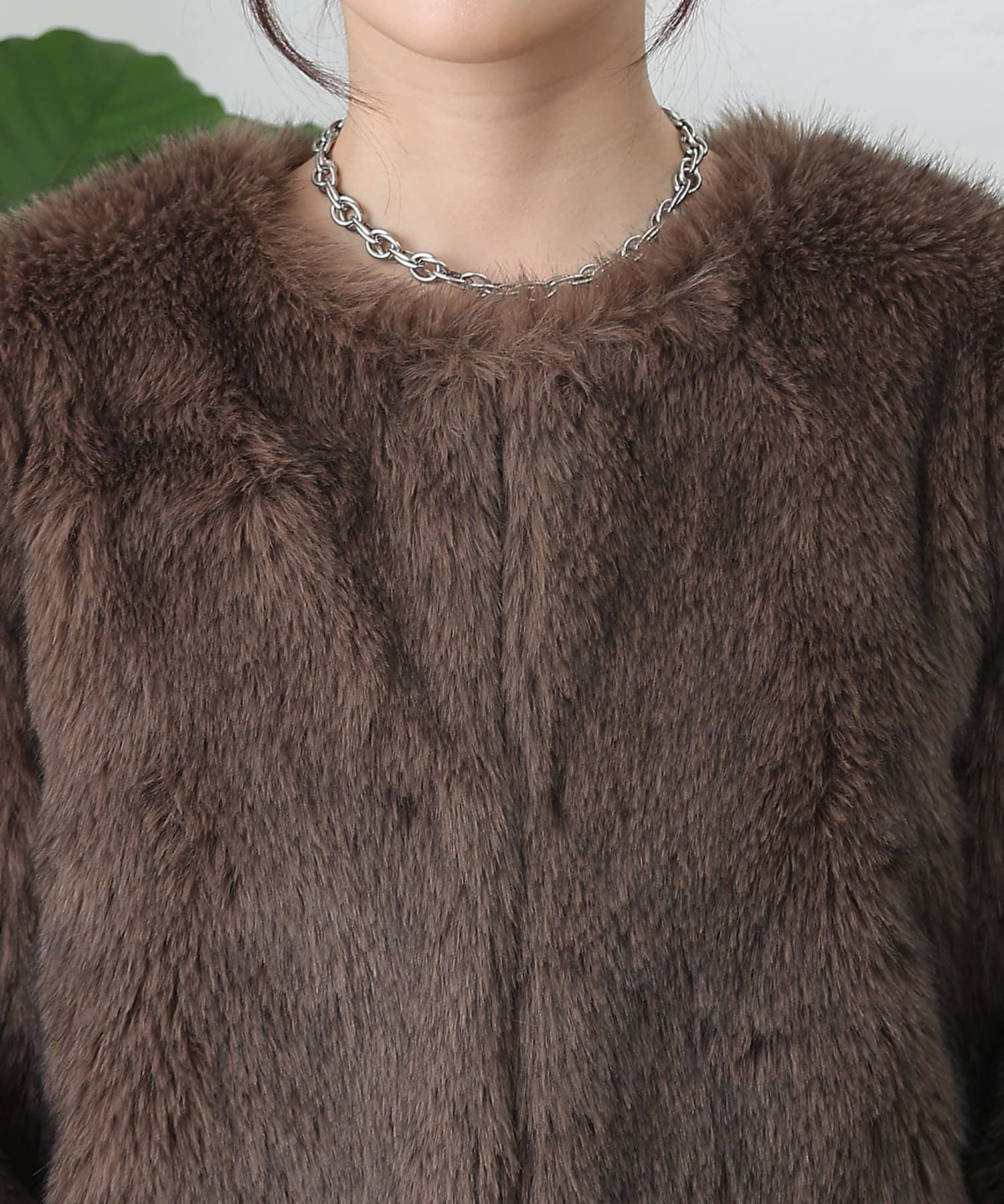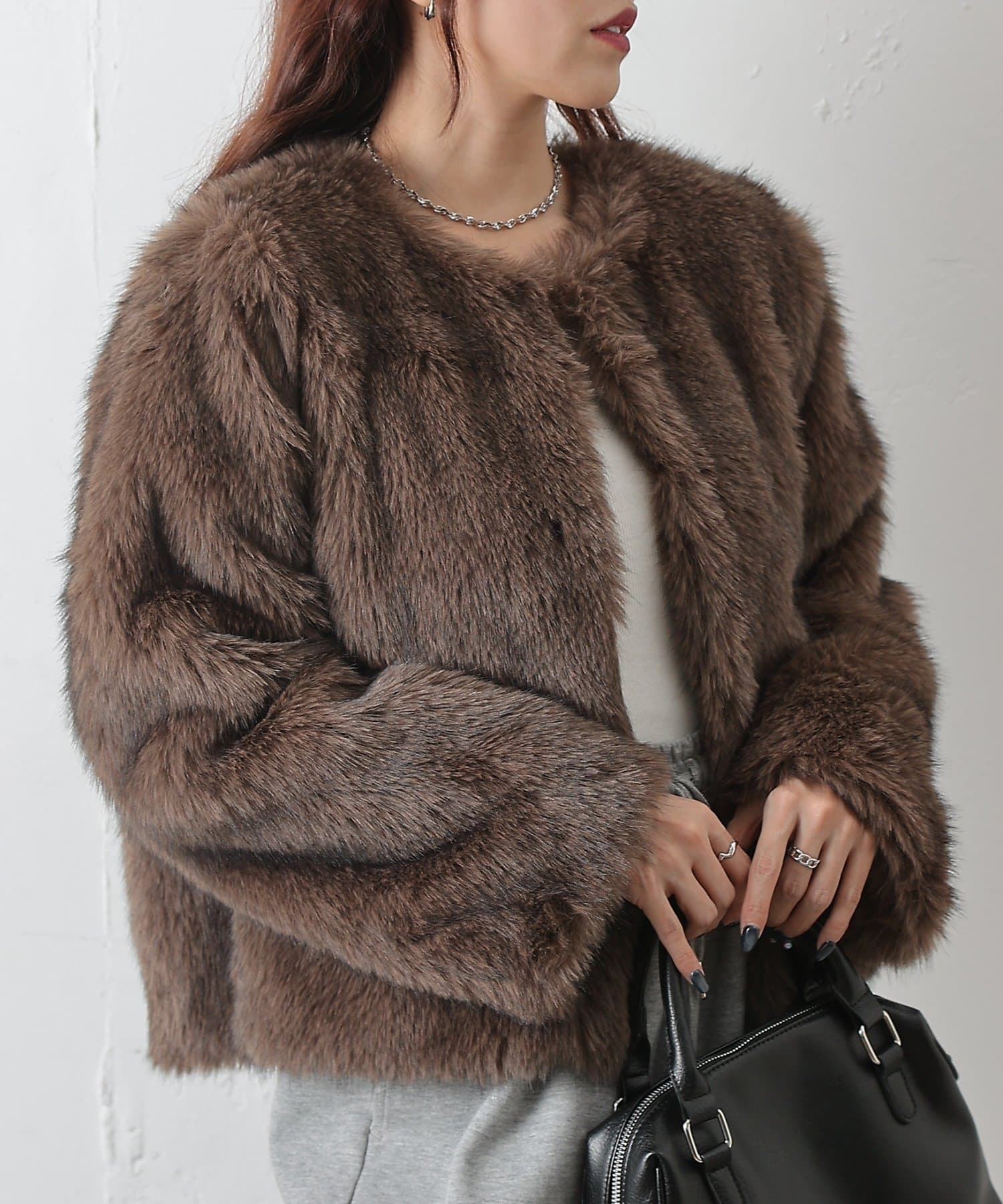 ふわっと軽くて暖かい、柔らかなフェイクファーを使用したノーカラーファージャケット。