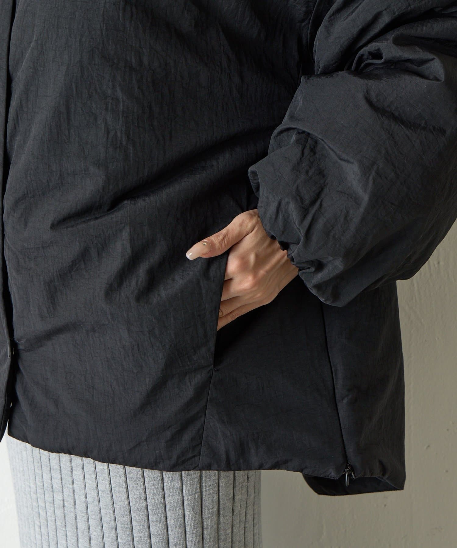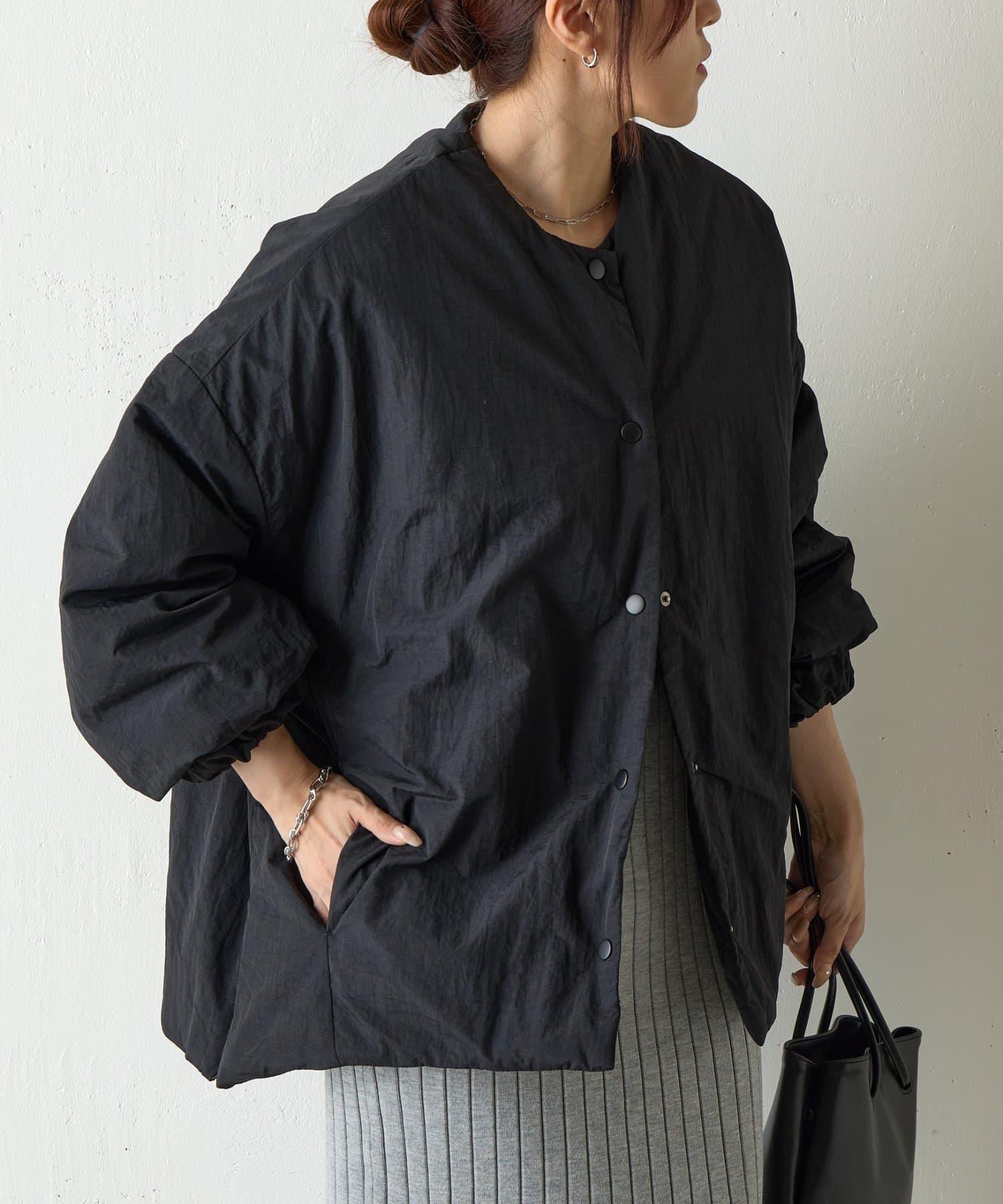 ミニマルなデザインに機能性をプラスした、サイドジップ付きのノーカラー中綿ジャケットです。