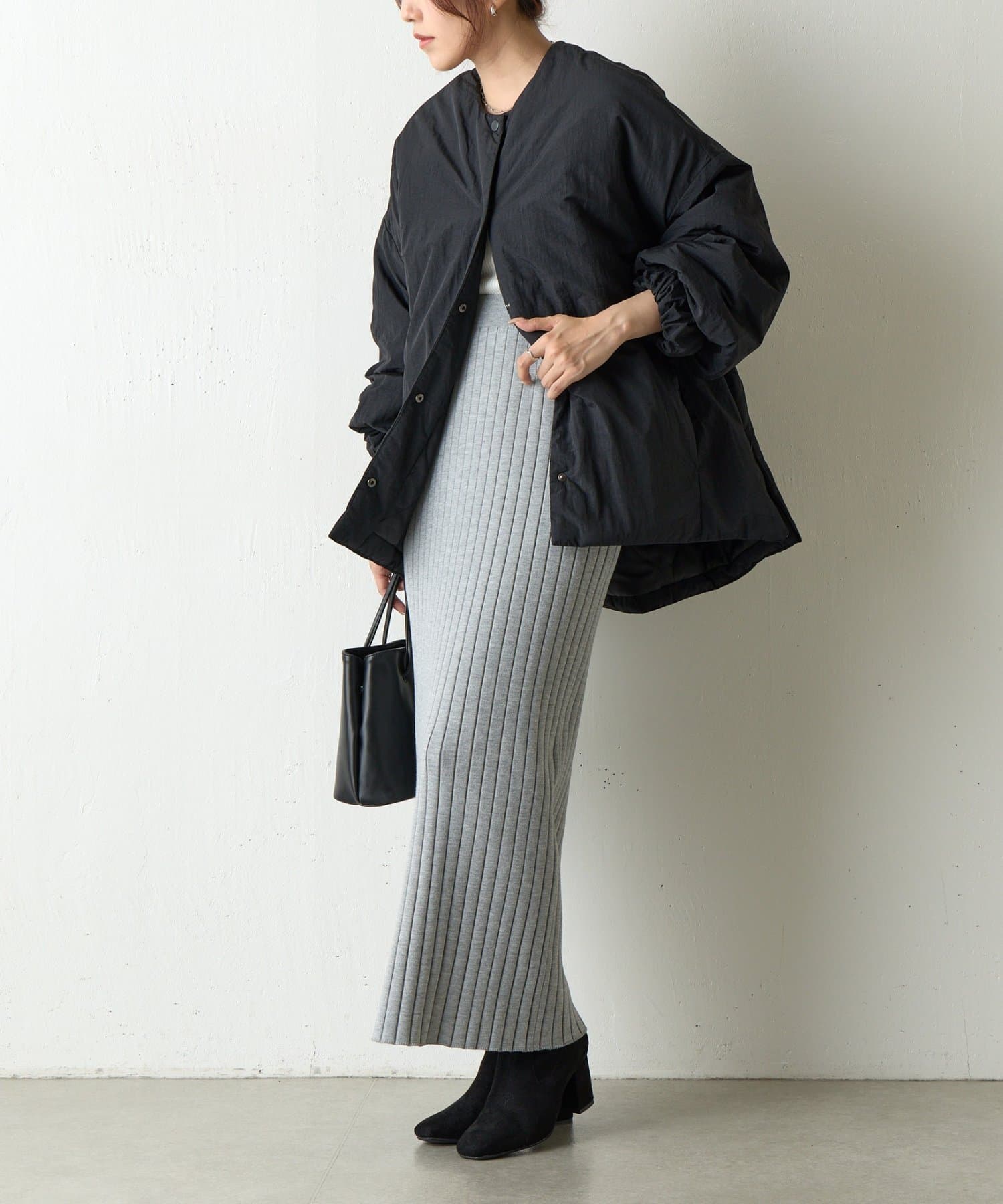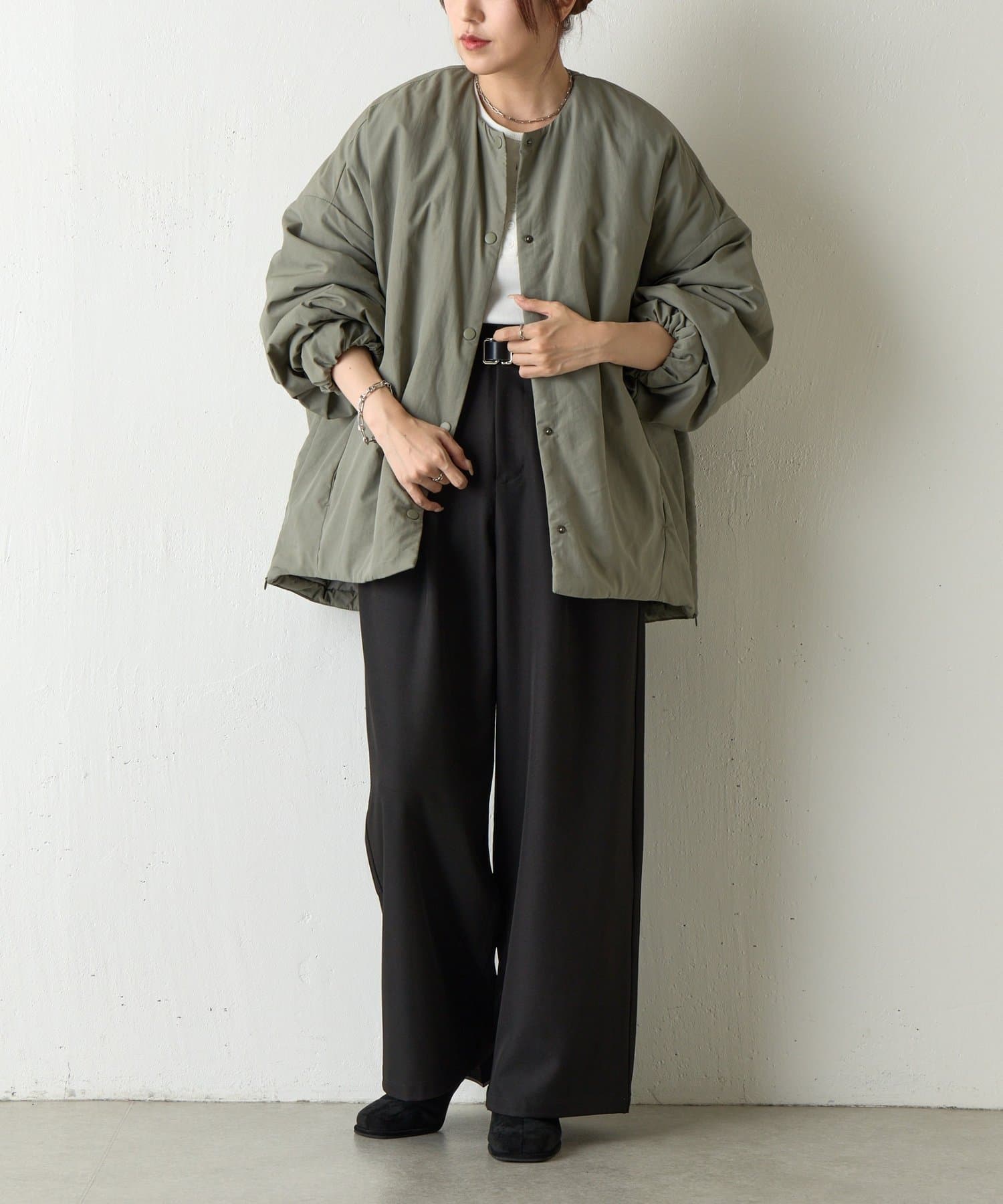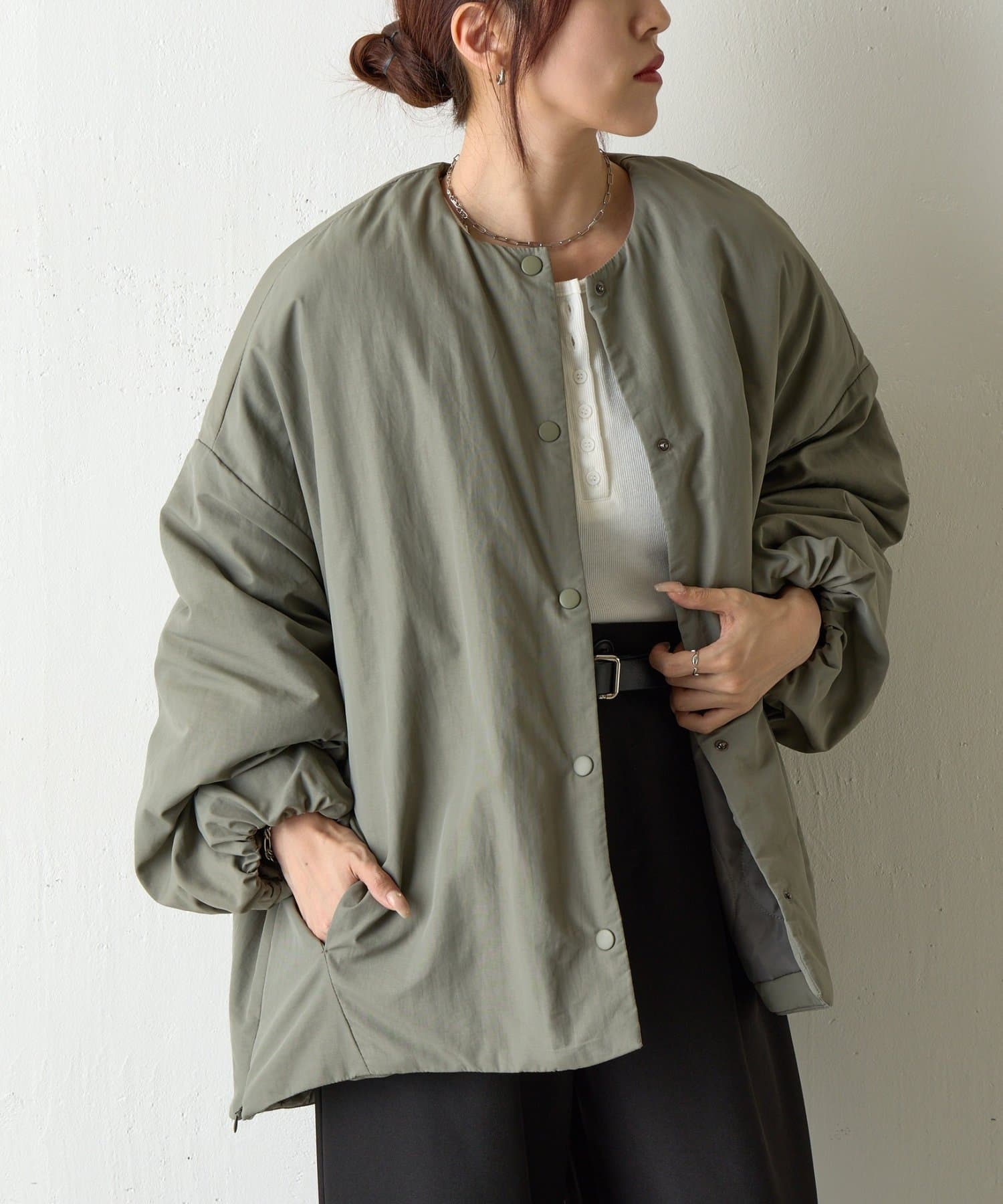 ノーカラーで首元がすっきりしているのでハイネックのトップスなどと合わせても◎