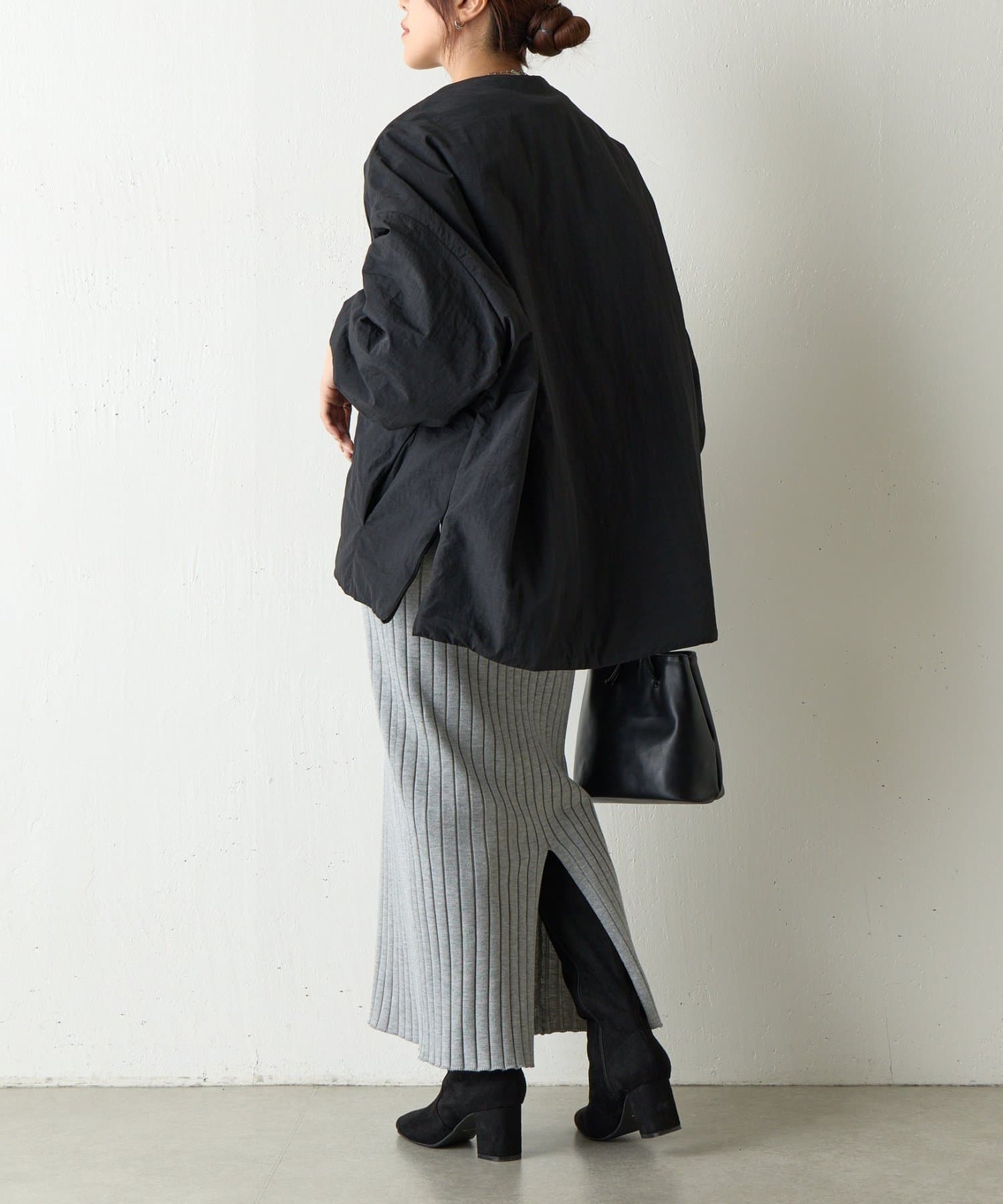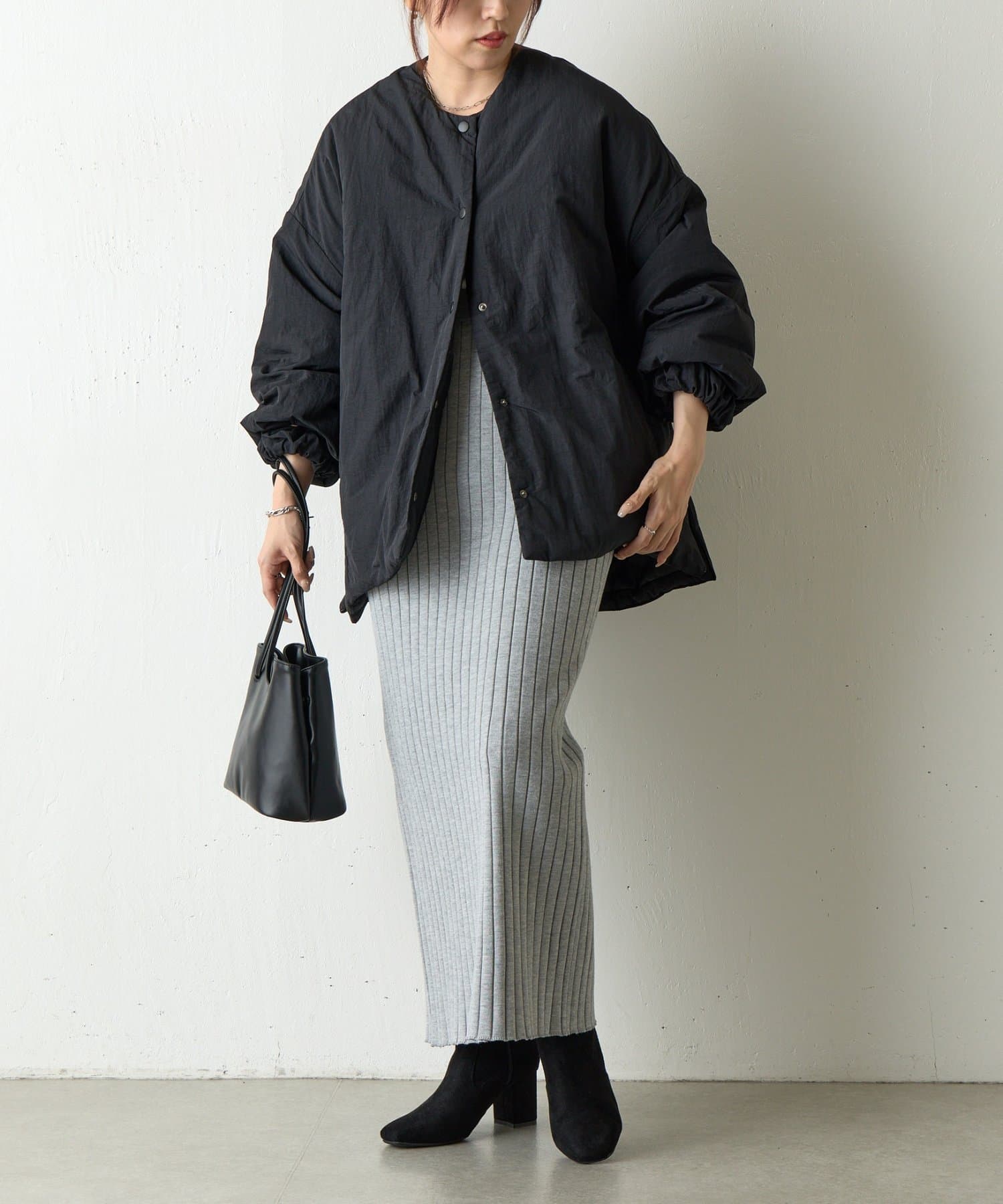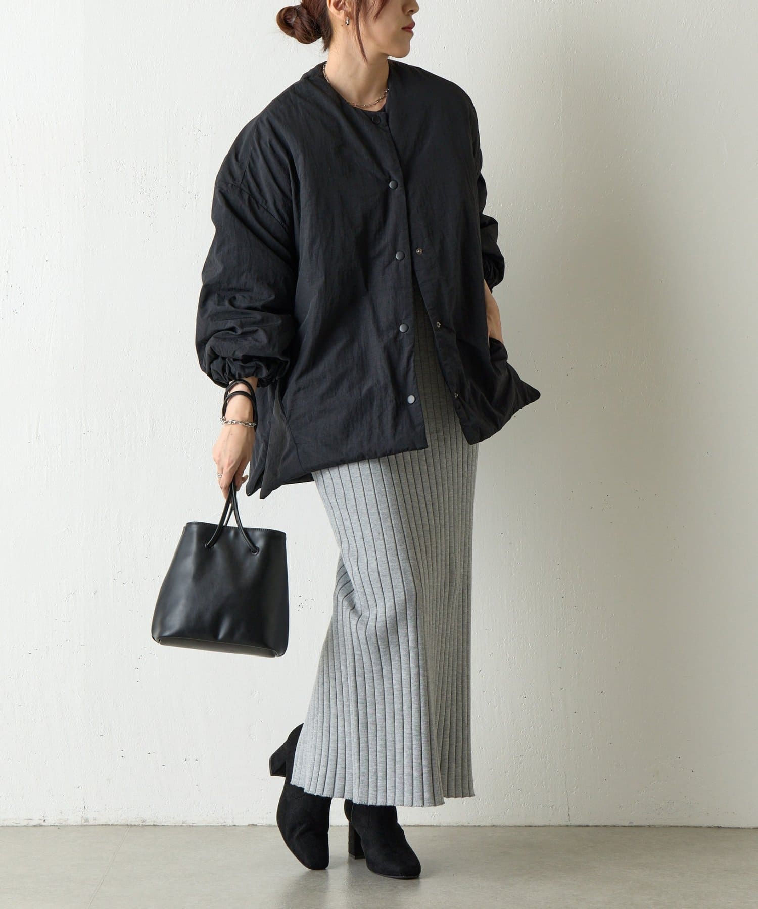 ノーカラーで首元がすっきりしているのでハイネックのトップスなどと合わせても◎