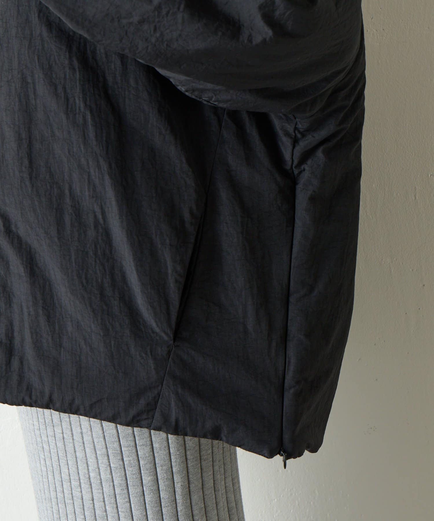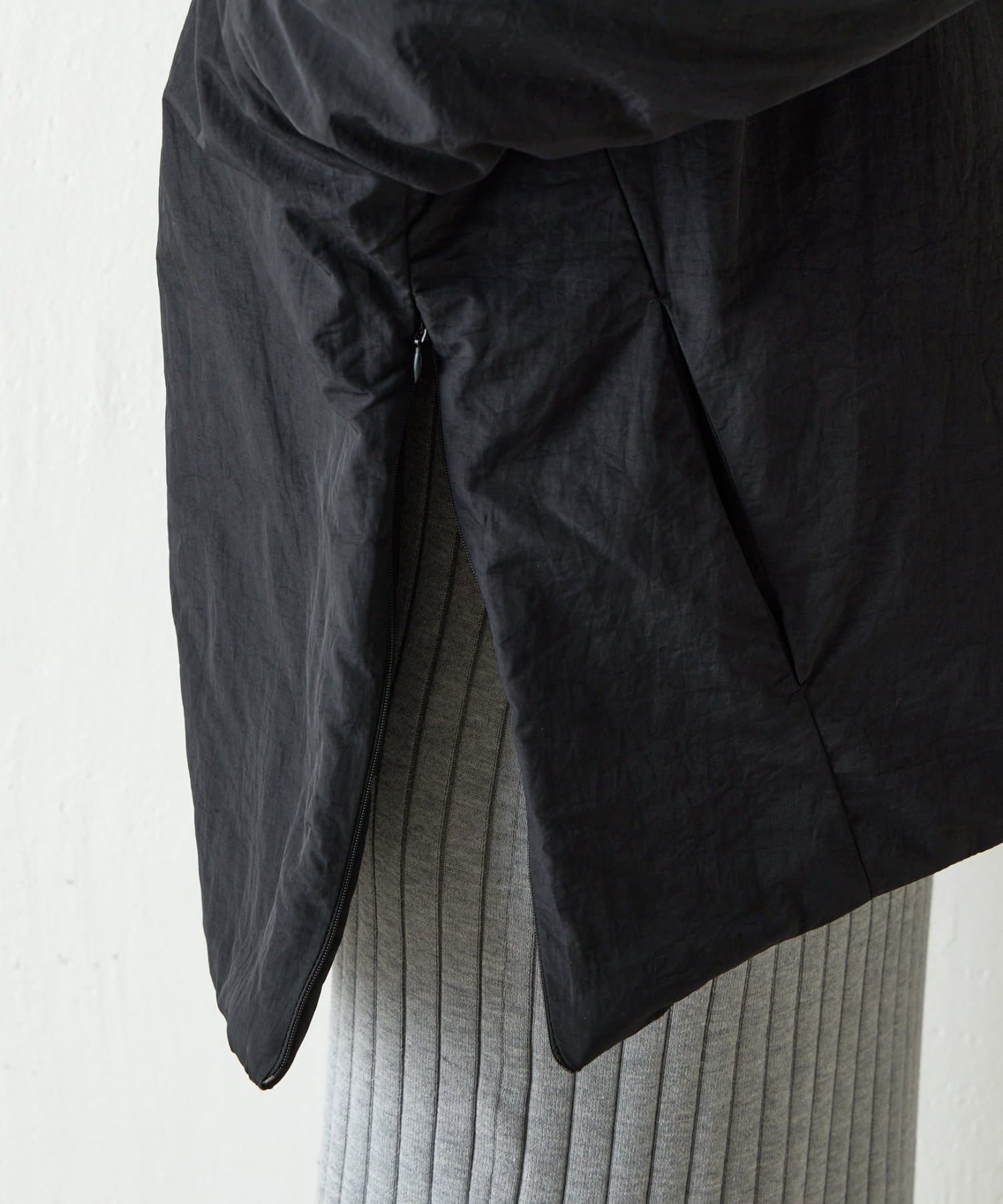 サイドの裾にはジップがついていて開閉可能なのでシルエットを変えて楽しめるアウターになっています。