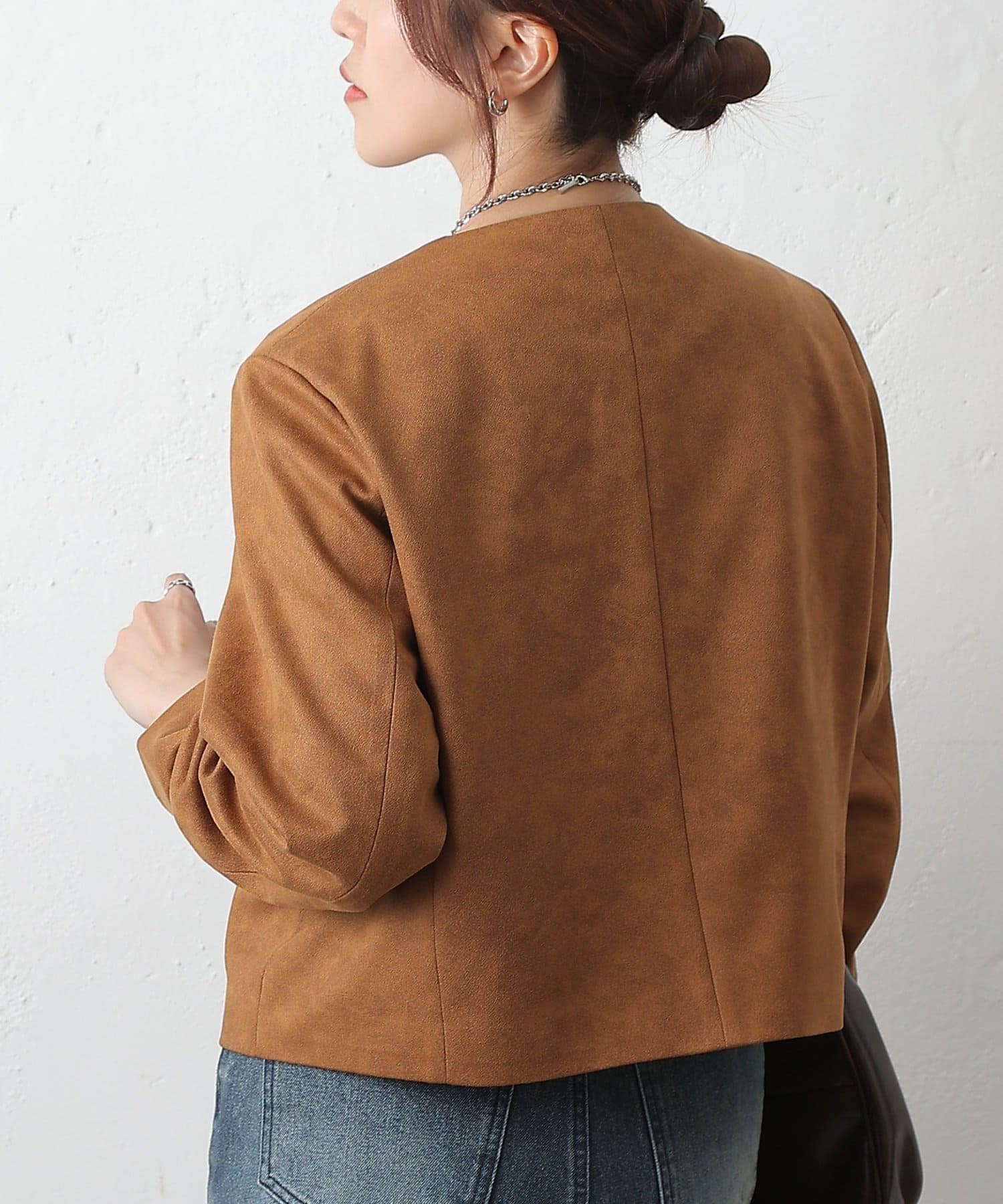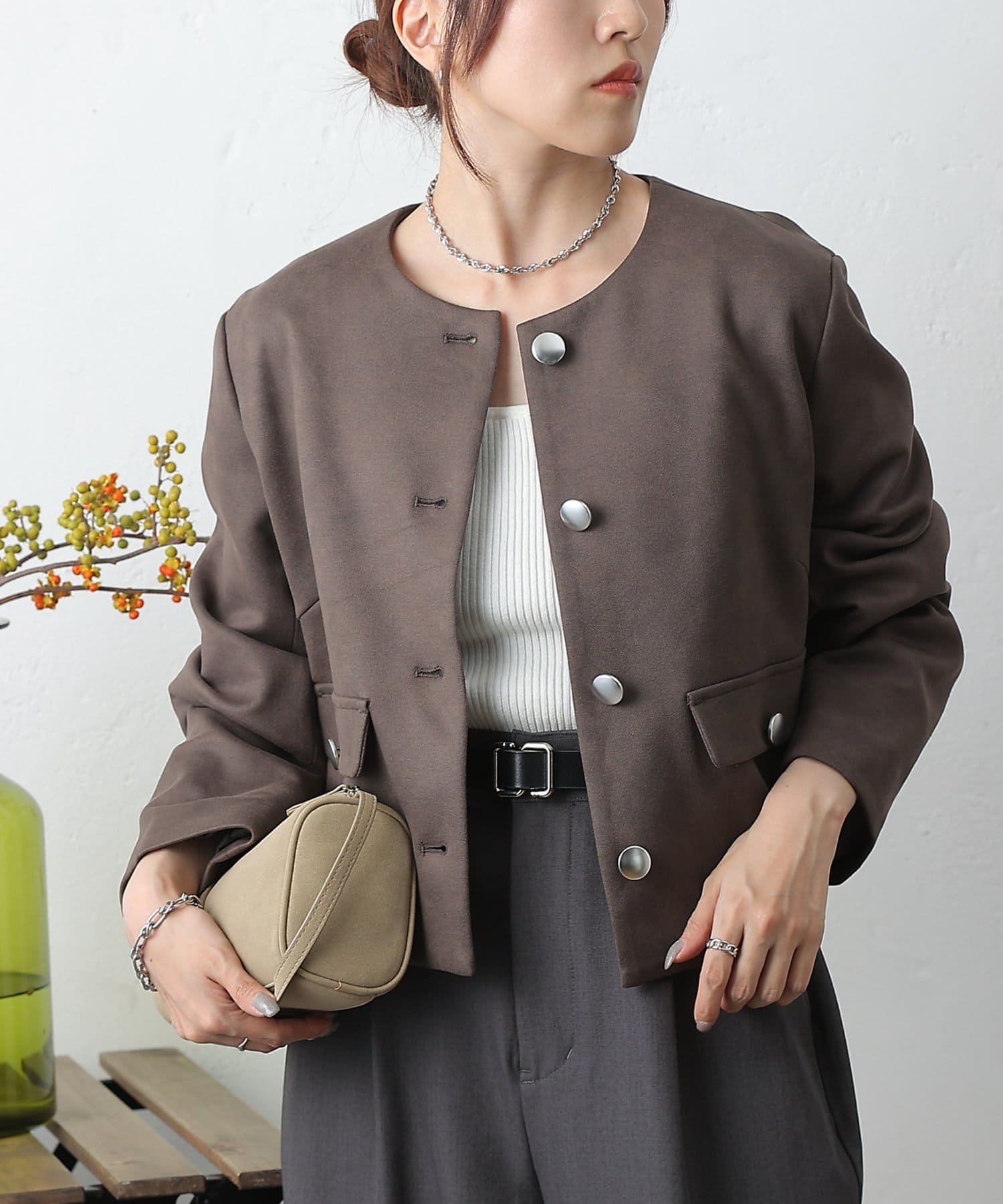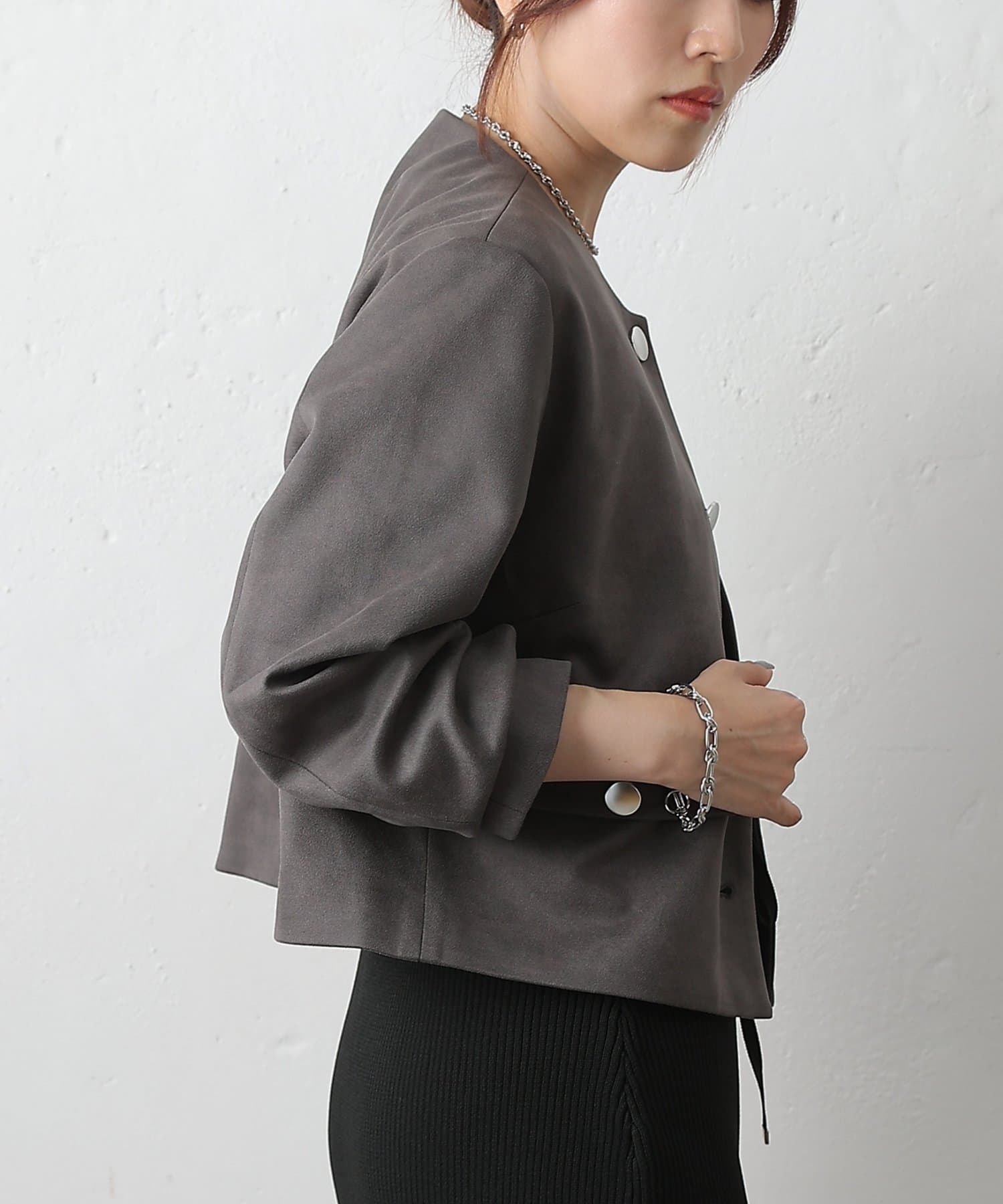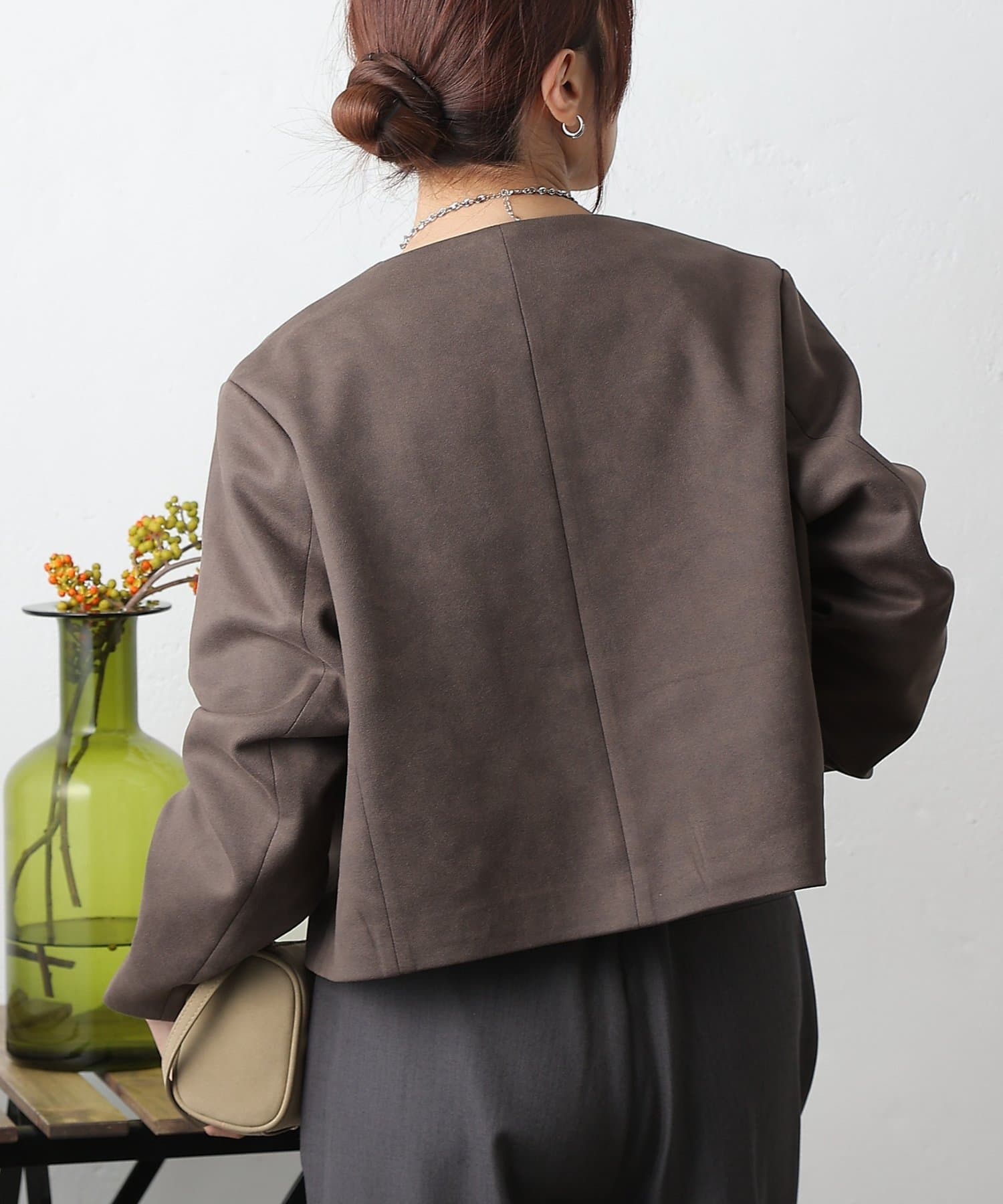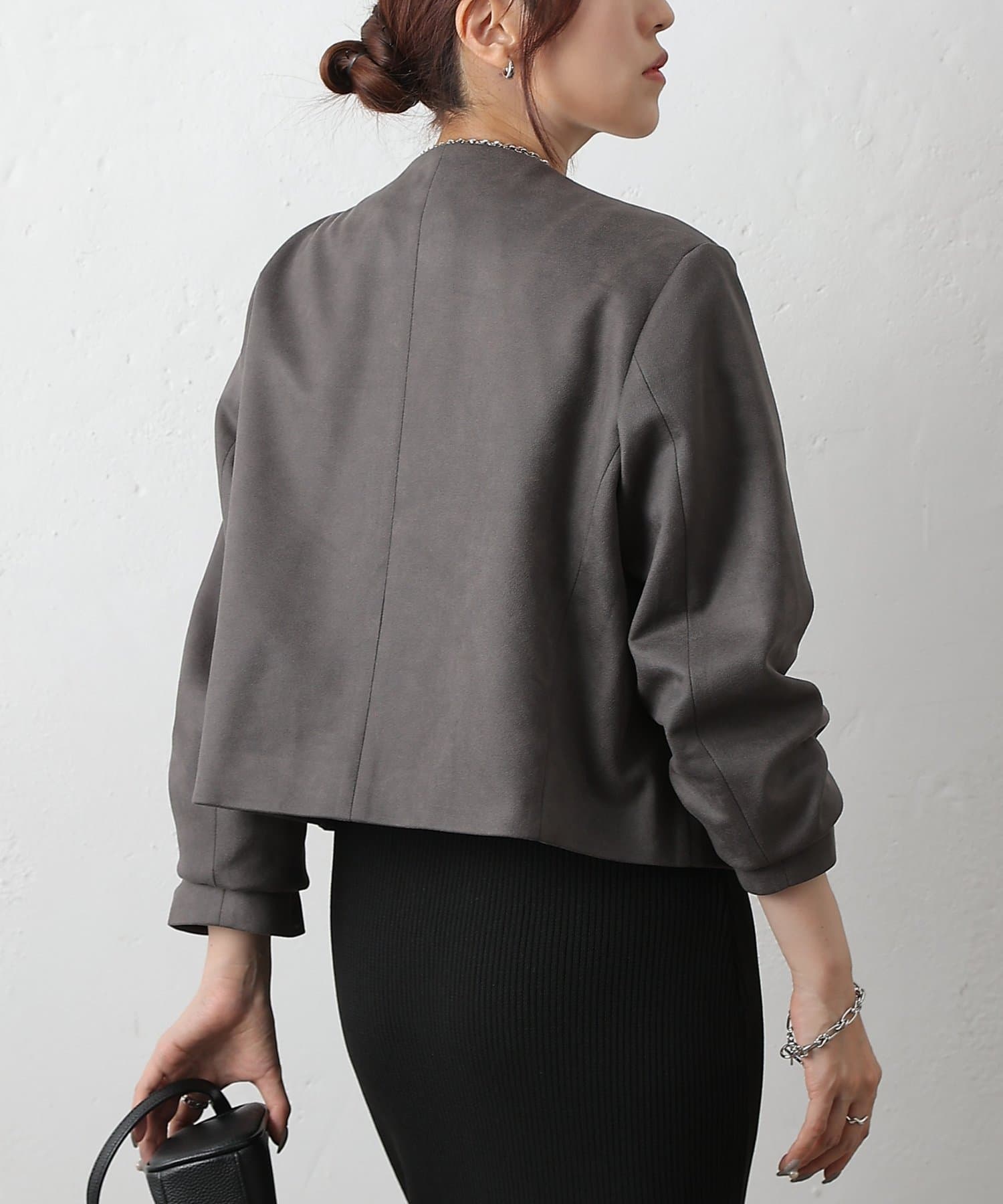 しっとりとした質感とほどよいハリ感が魅力のスエードポンチ素材を使用した上品な印象のノーカラージャケットです。