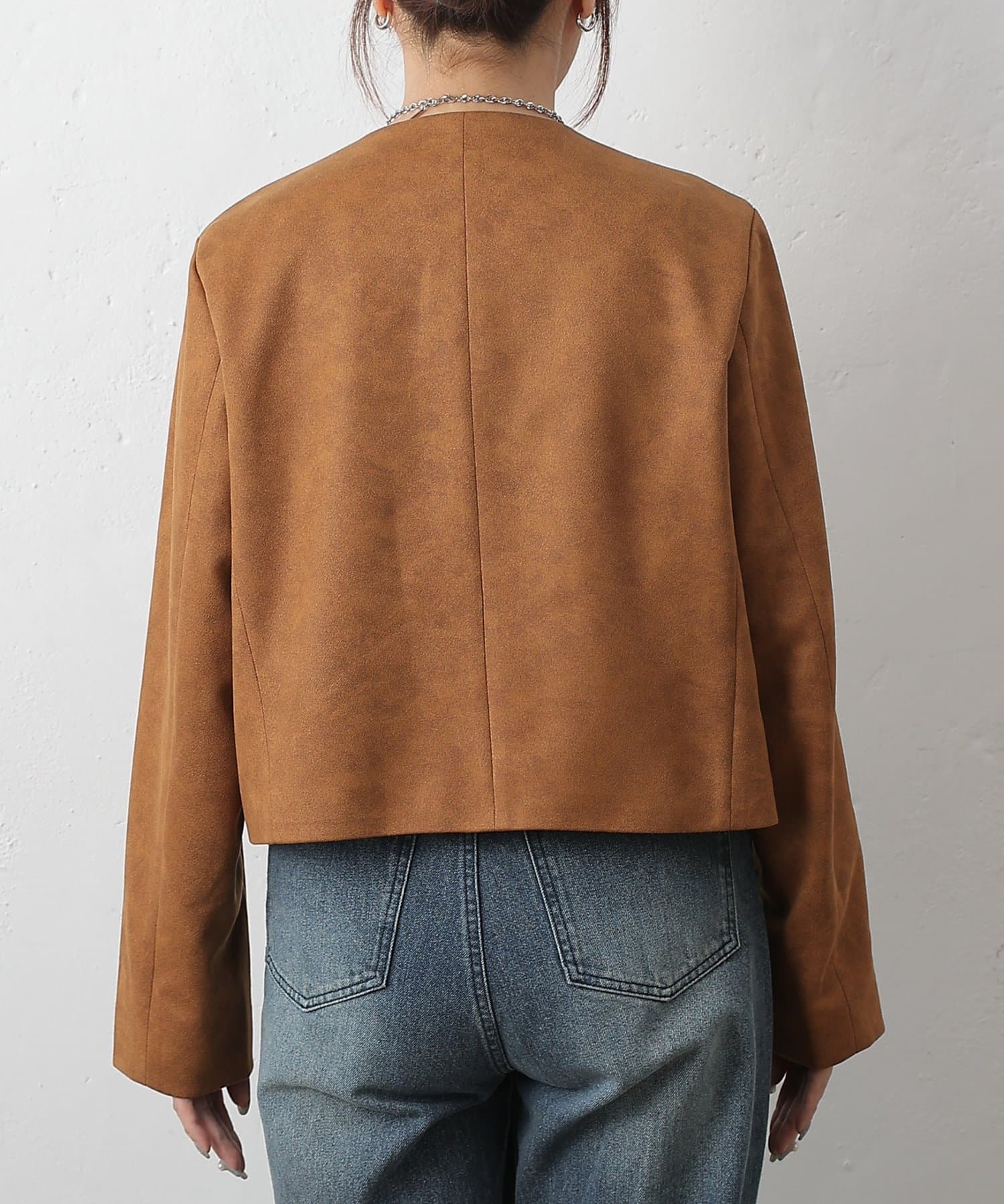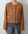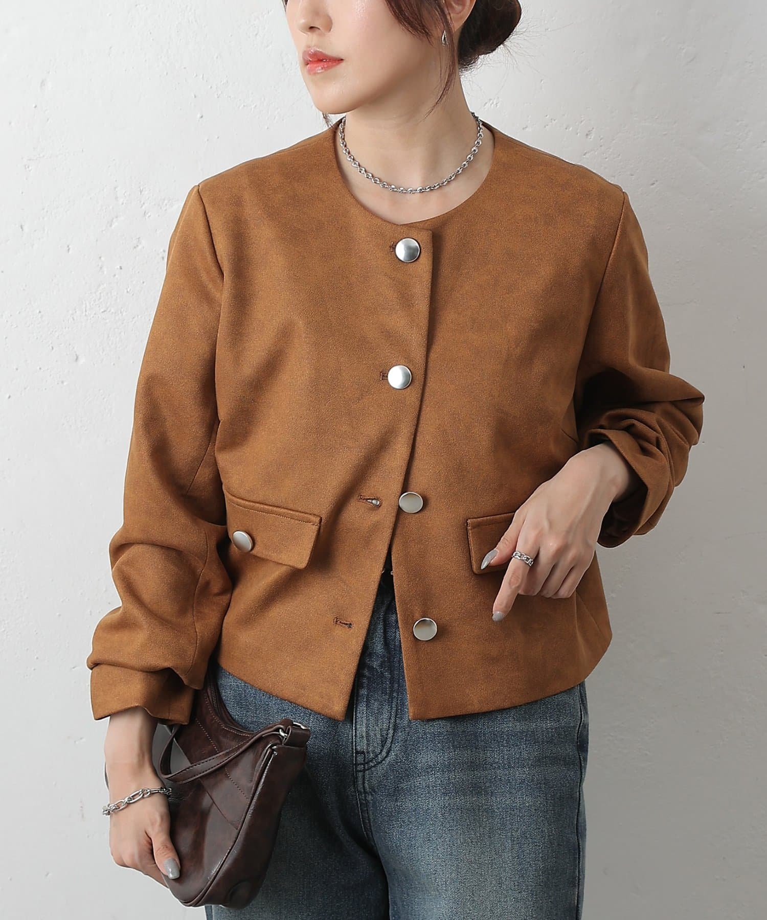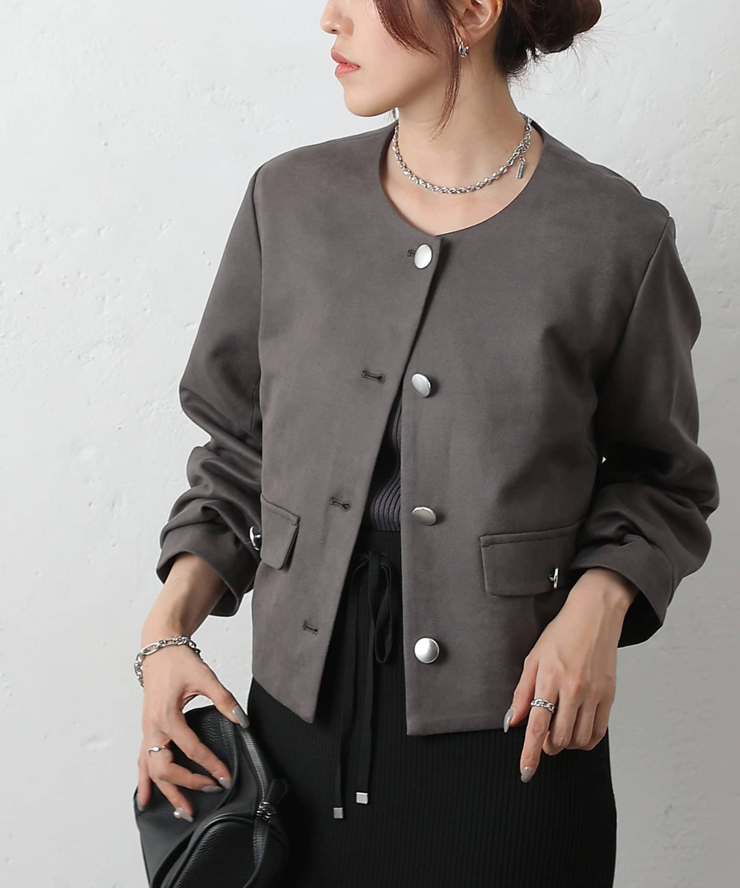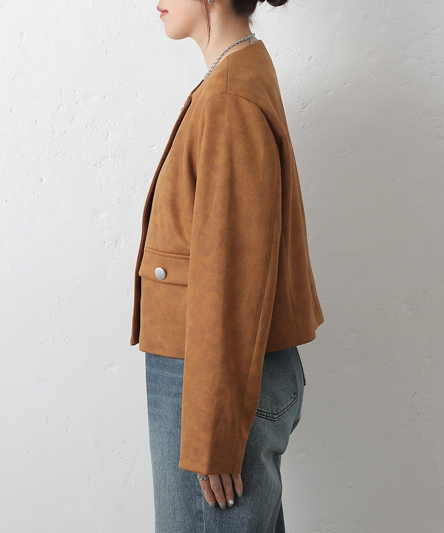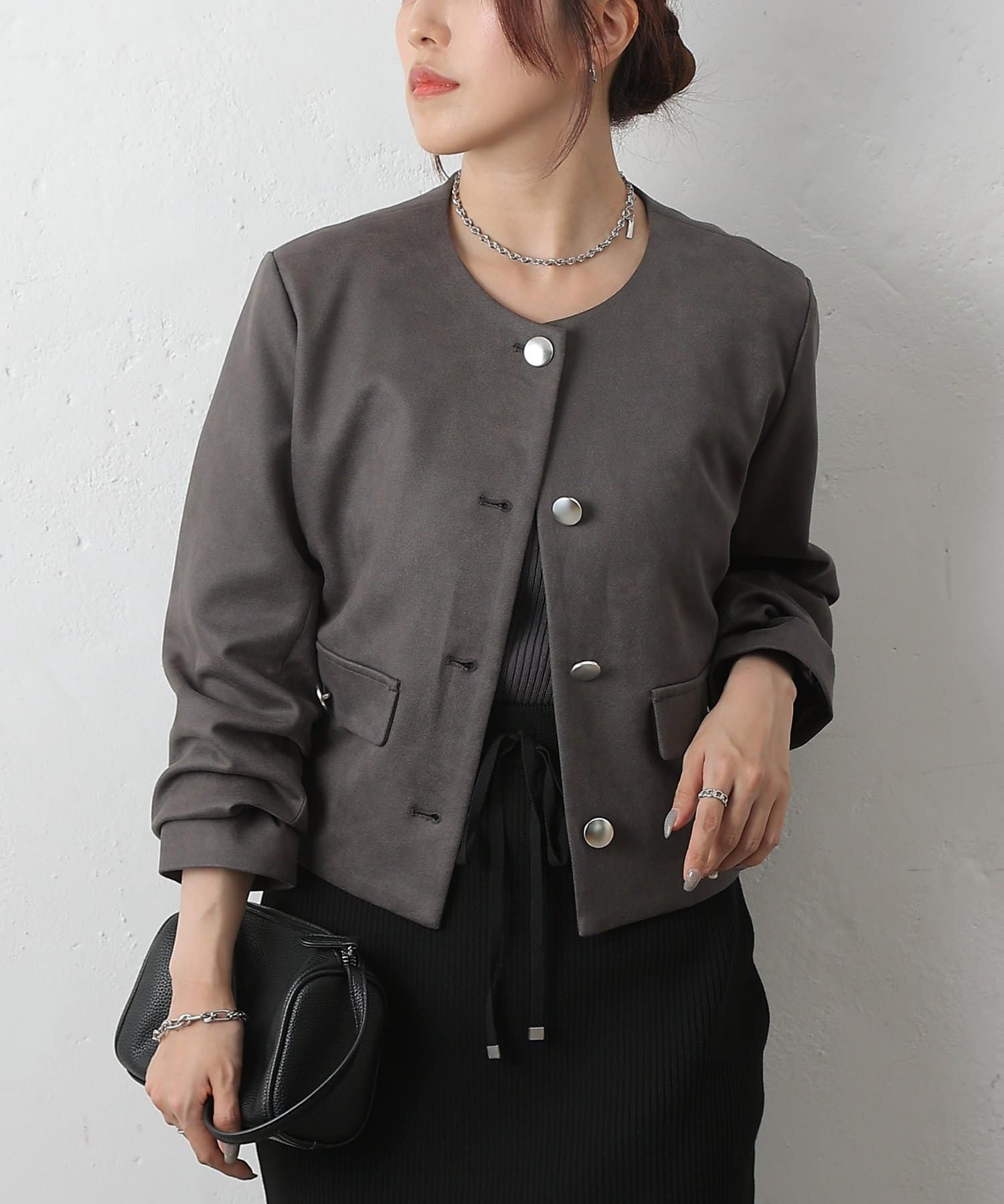 しっとりとした質感とほどよいハリ感が魅力のスエードポンチ素材を使用した上品な印象のノーカラージャケットです。