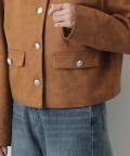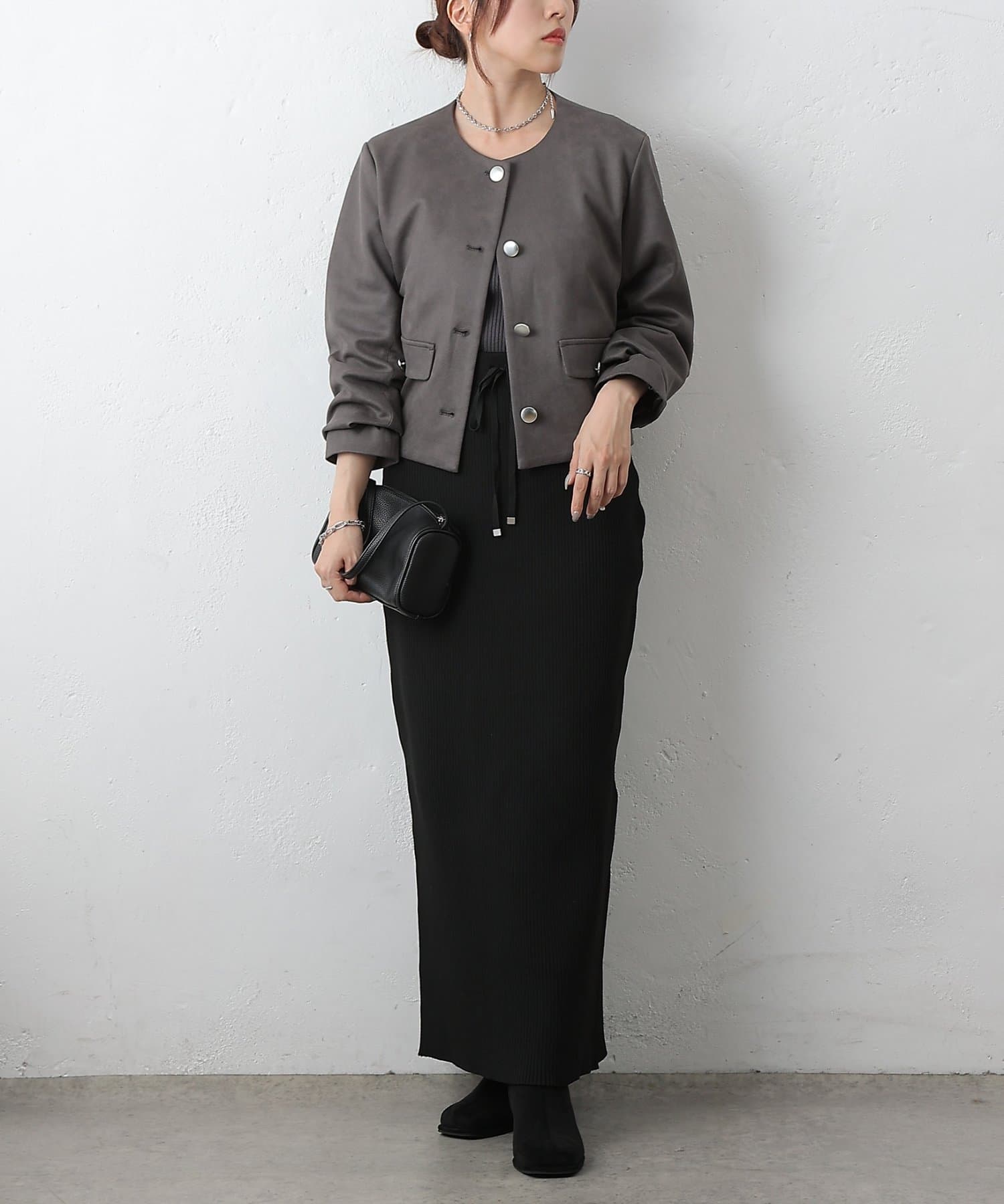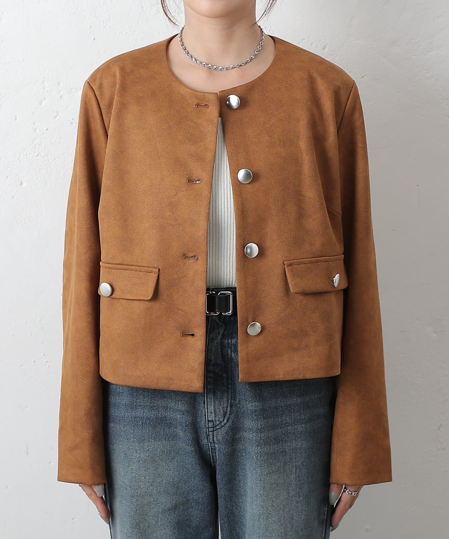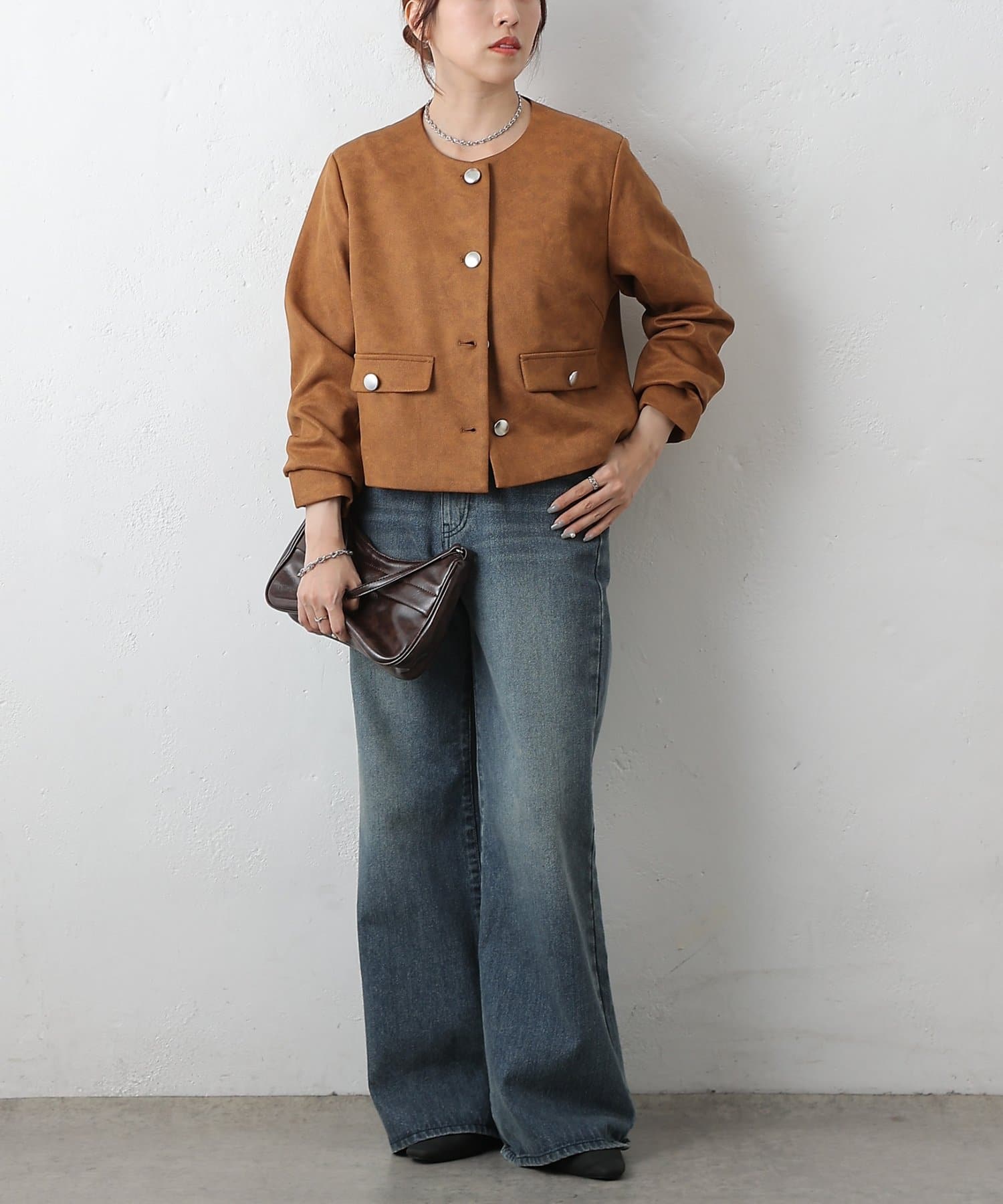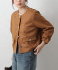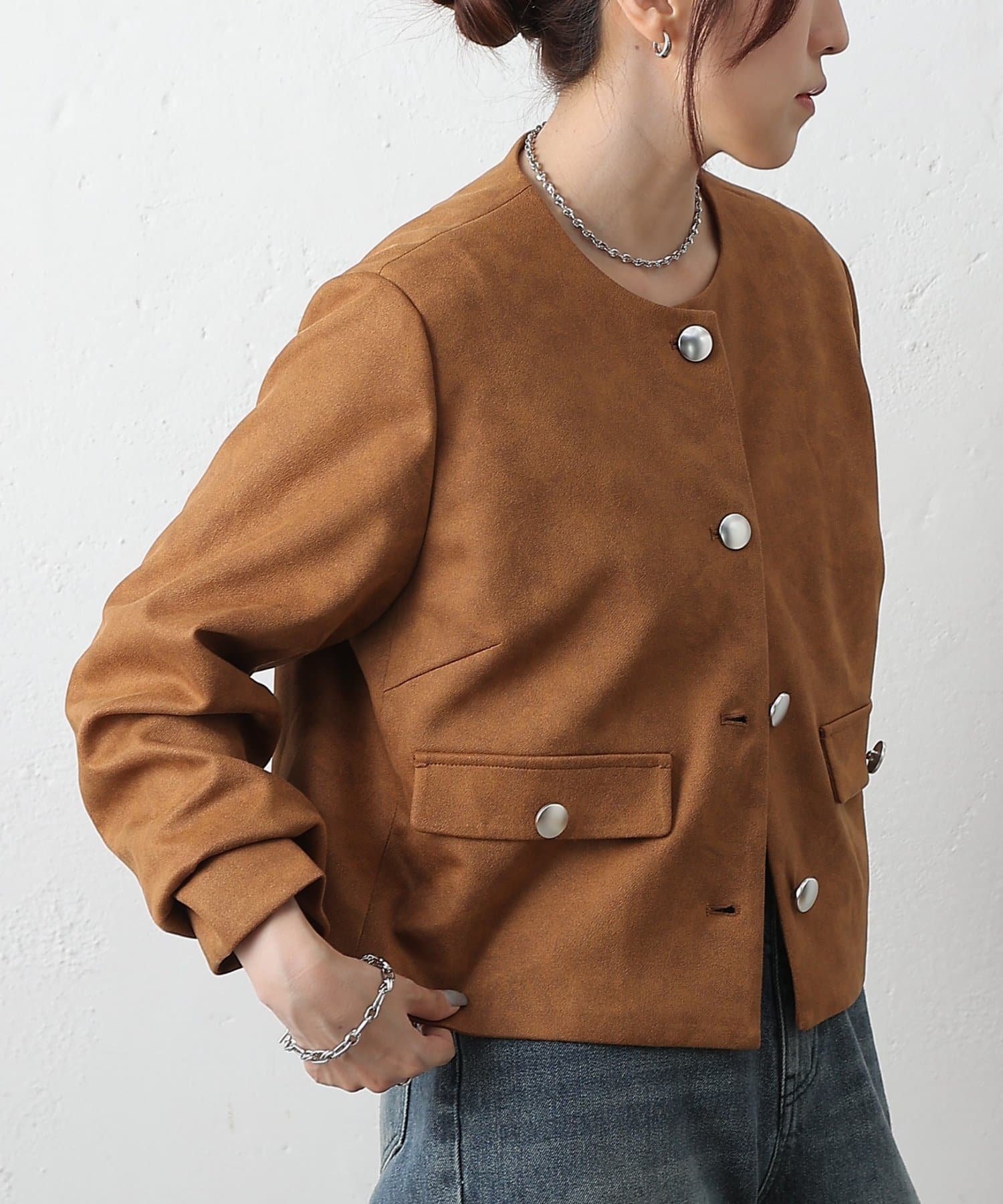 しっとりとした質感とほどよいハリ感が魅力のスエードポンチ素材を使用した上品な印象のノーカラージャケットです。