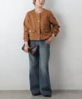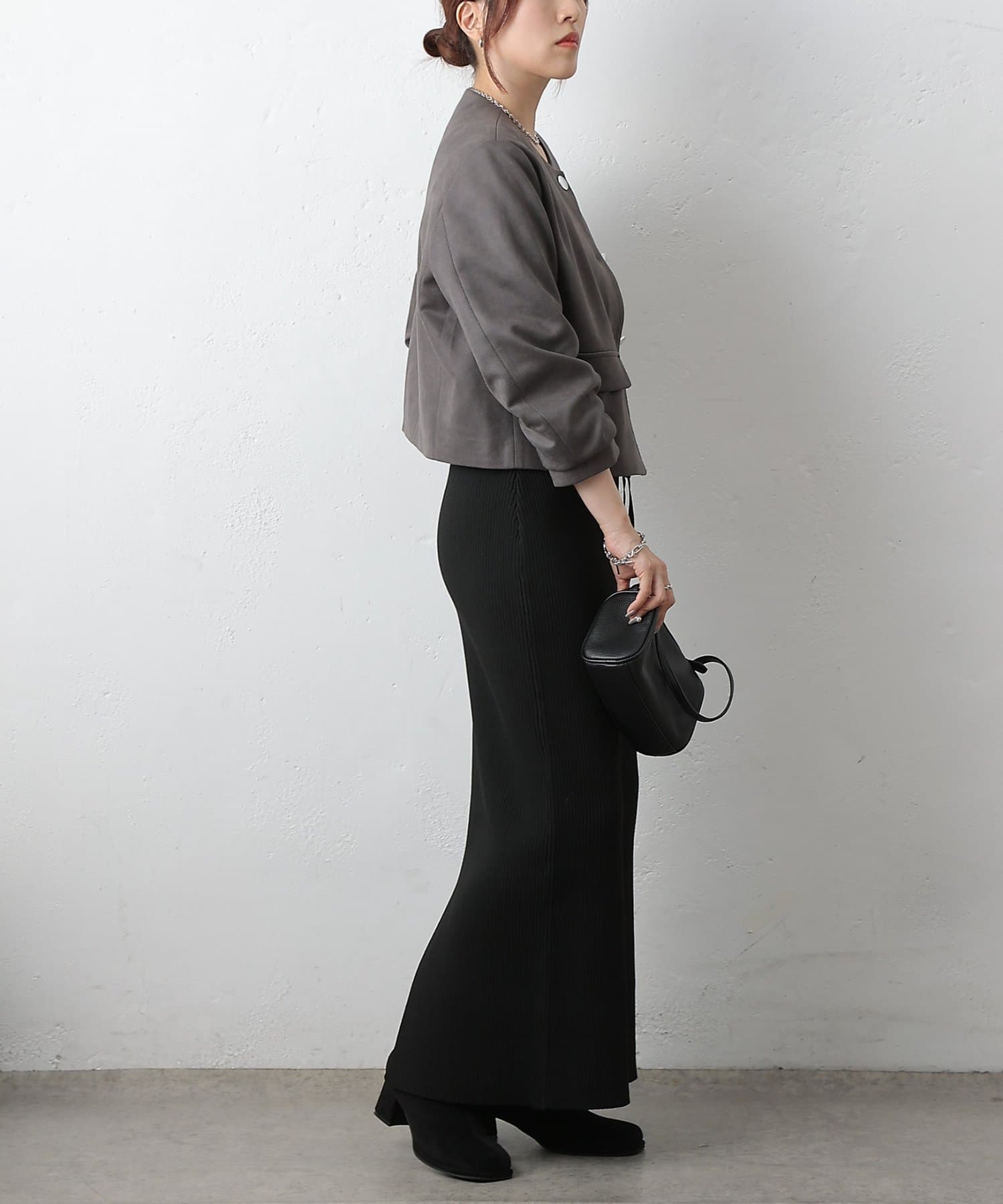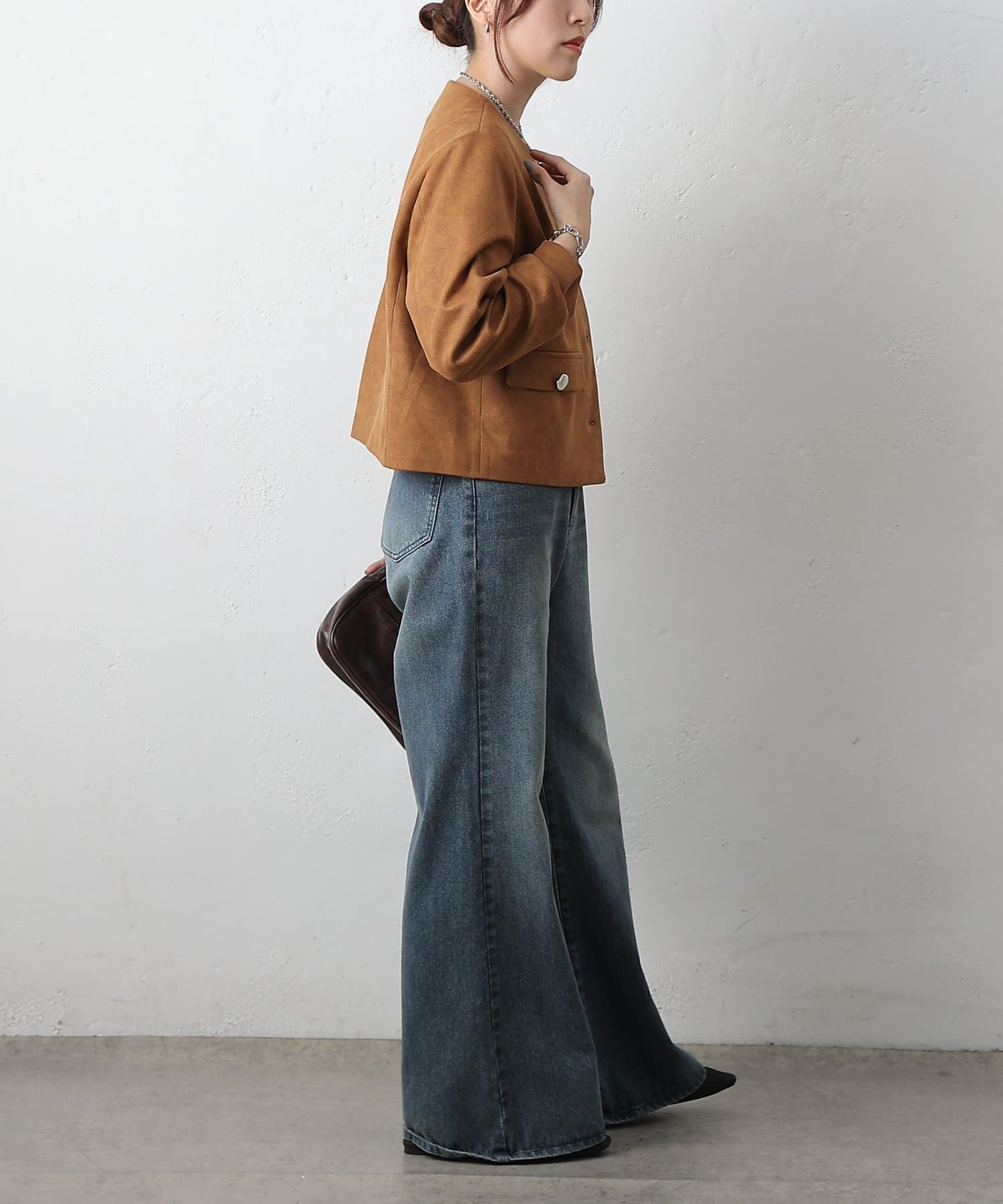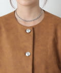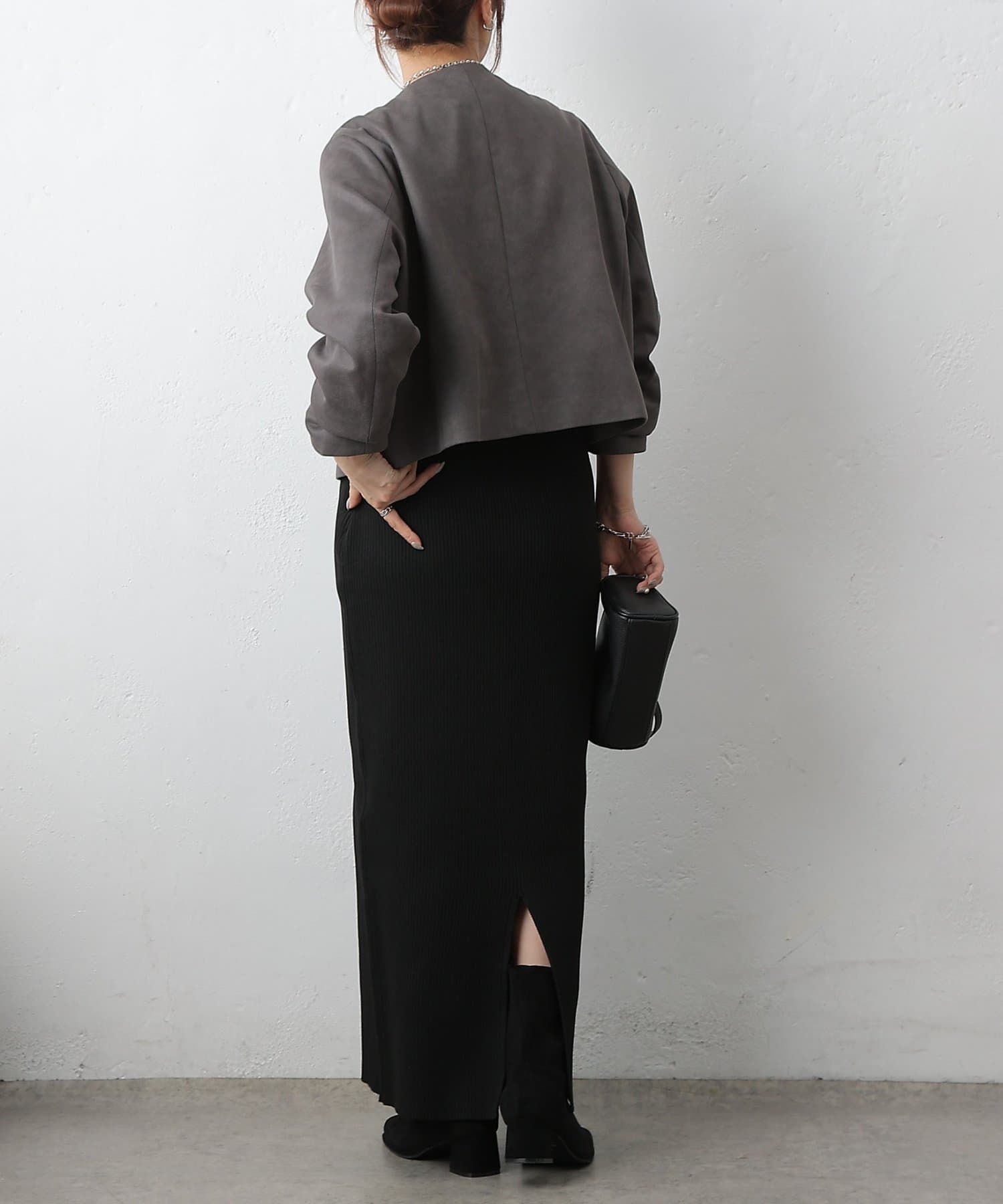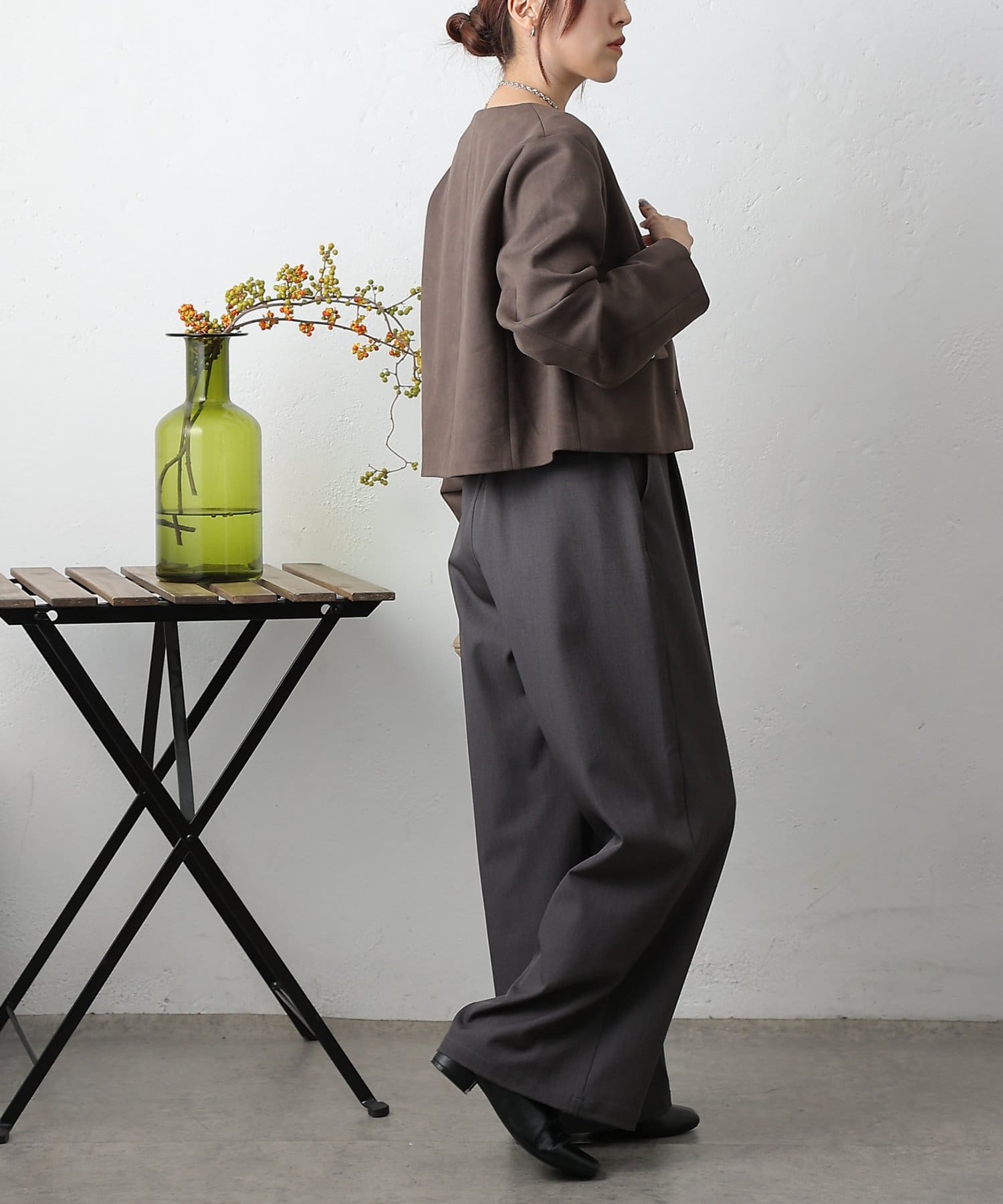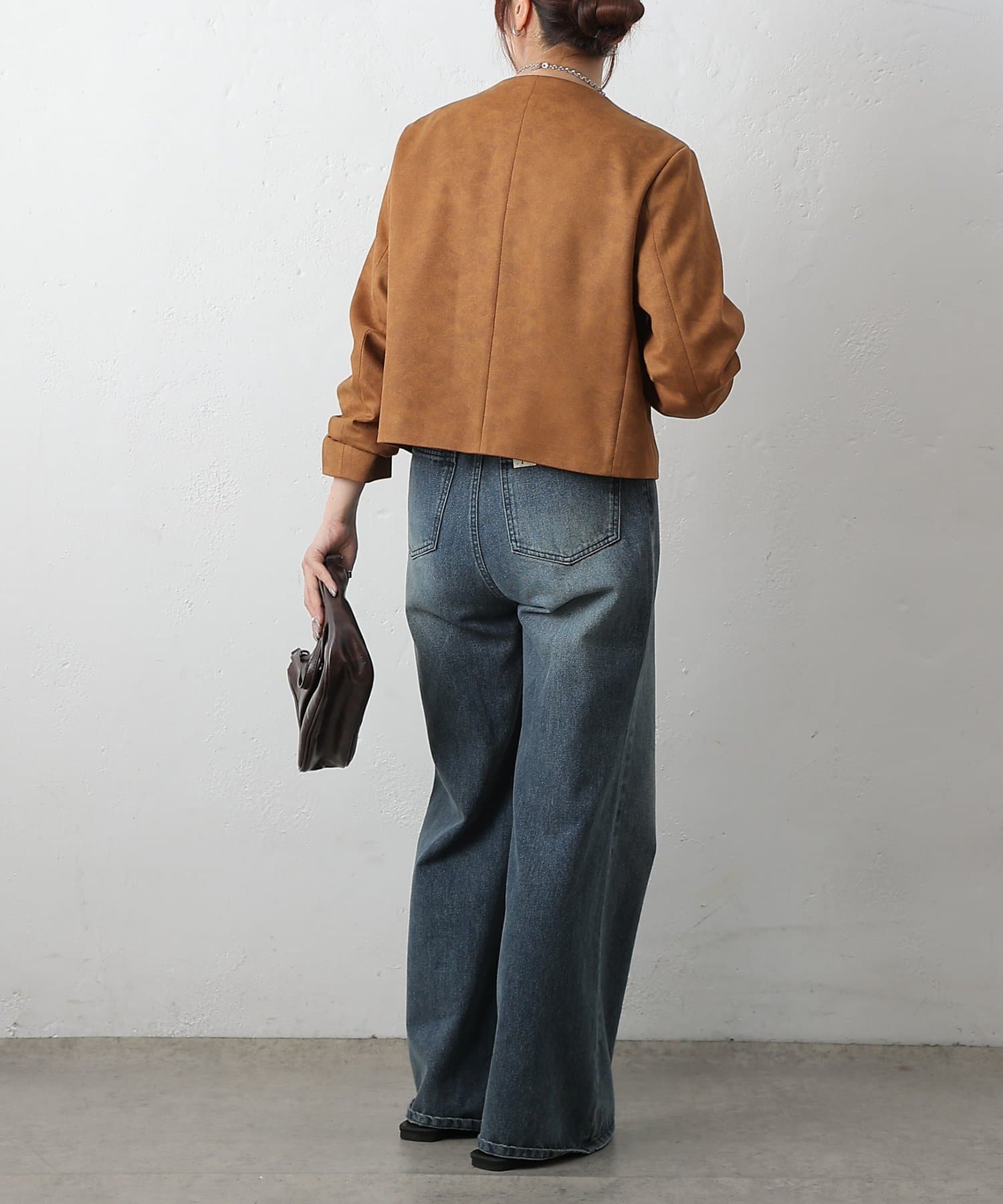 しっとりとした質感とほどよいハリ感が魅力のスエードポンチ素材を使用した上品な印象のノーカラージャケットです。
