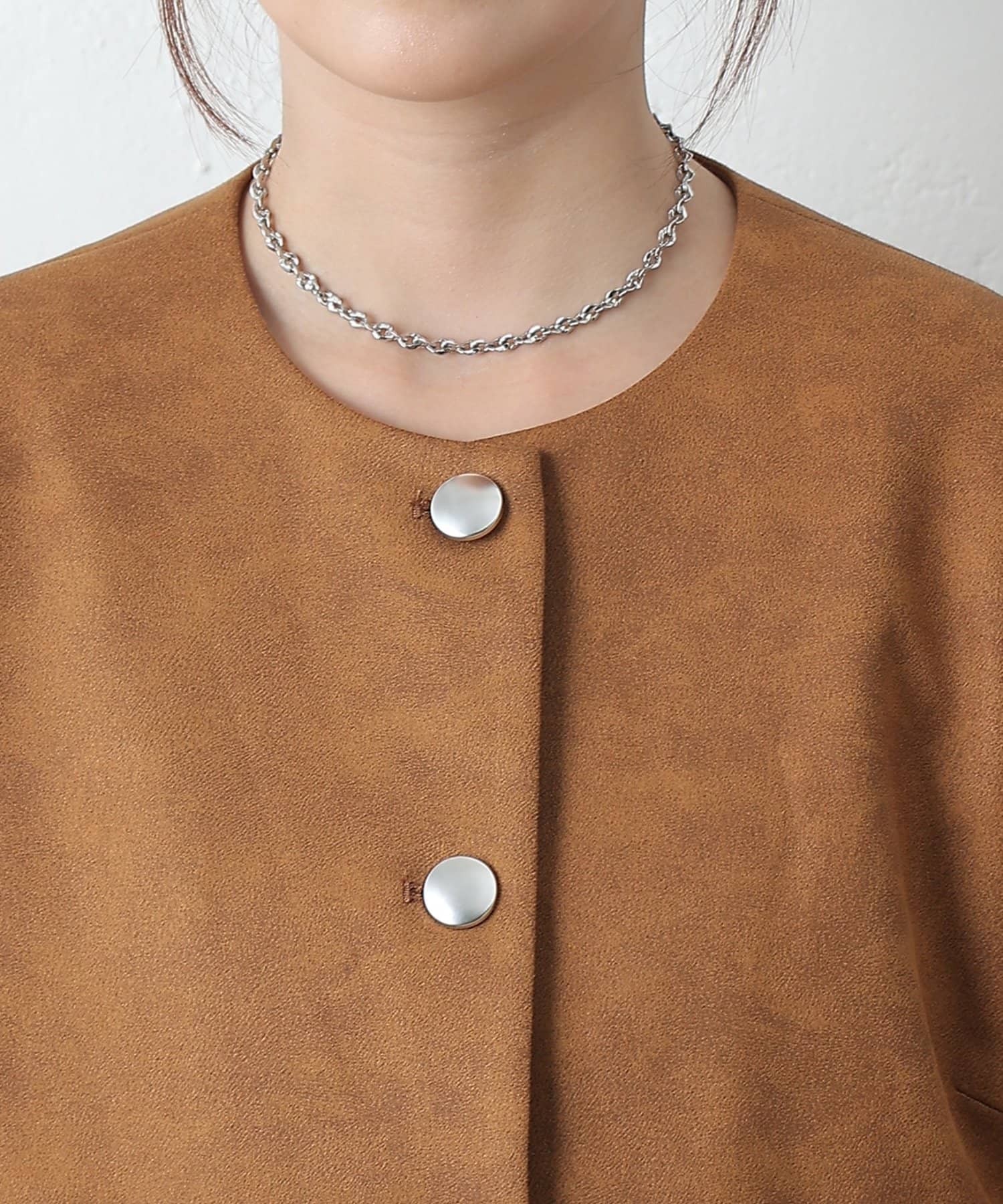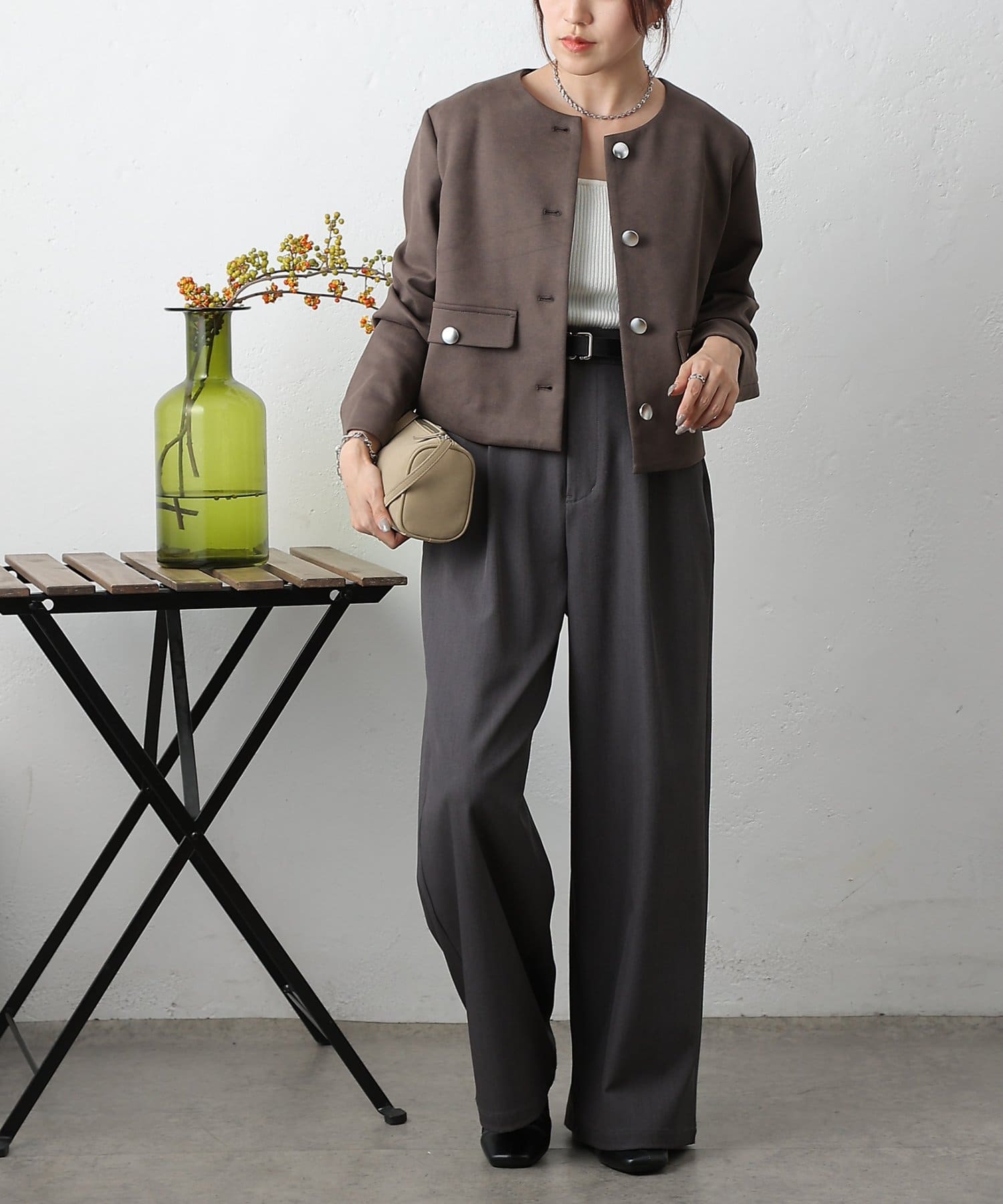 すっきりとしたノーカラーデザインが顔まわりをすっきり見せ、ブラウスやタートルネックとの相性も抜群。