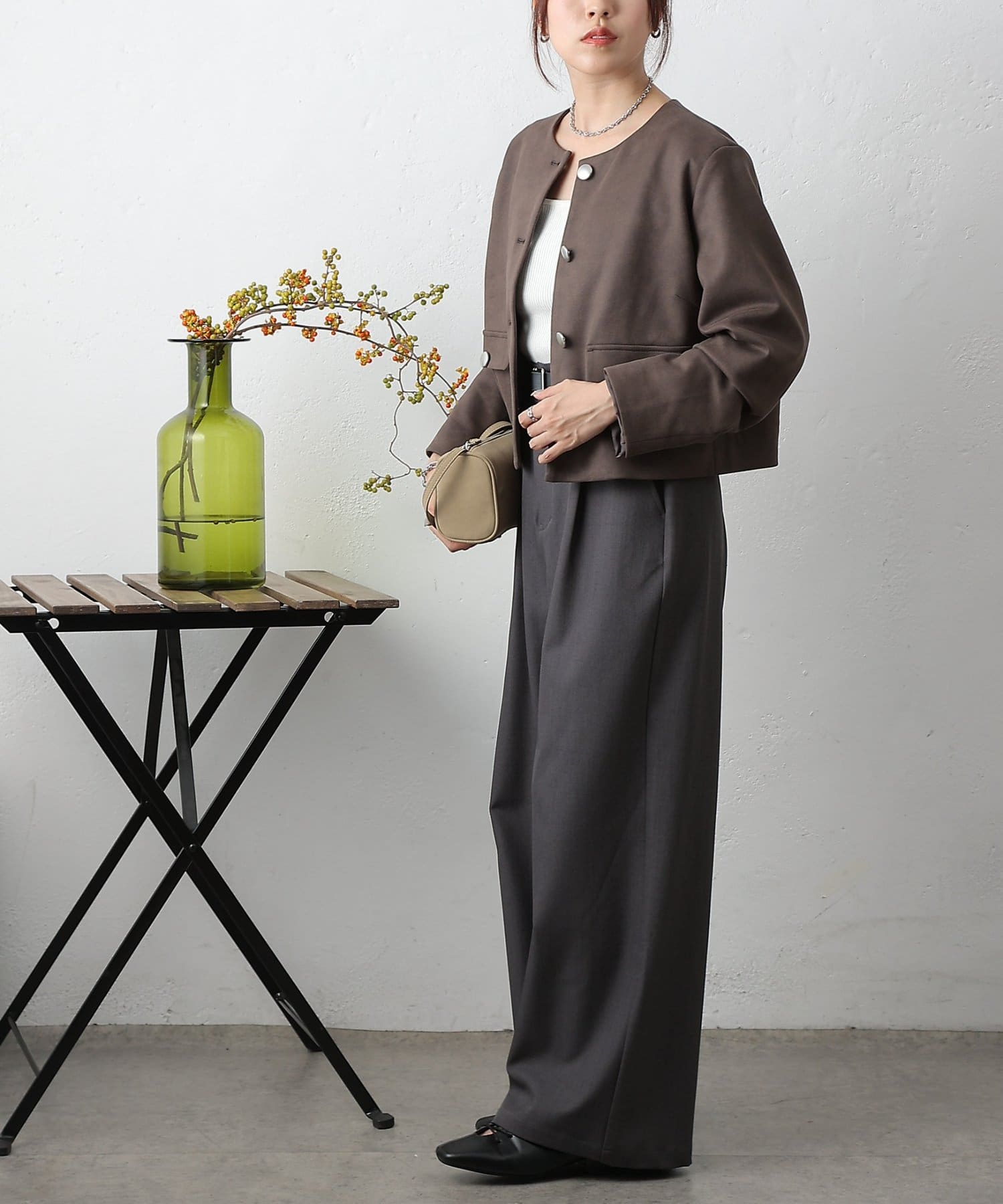 【きちんと見えと軽やかさを両立したノーカラージャケット】