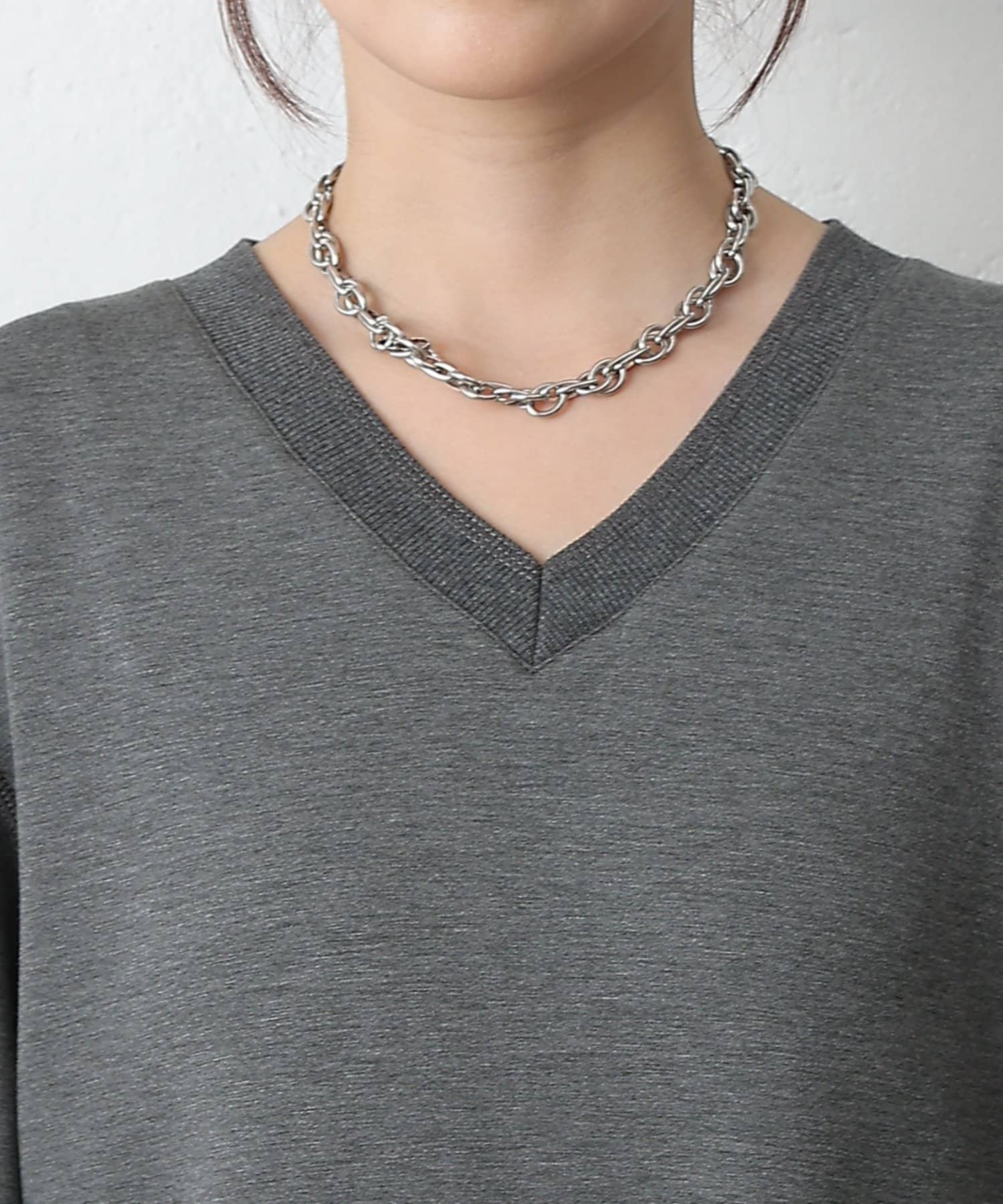 顔まわりをすっきり見せてくれるVネックデザインで抜け感も演出。