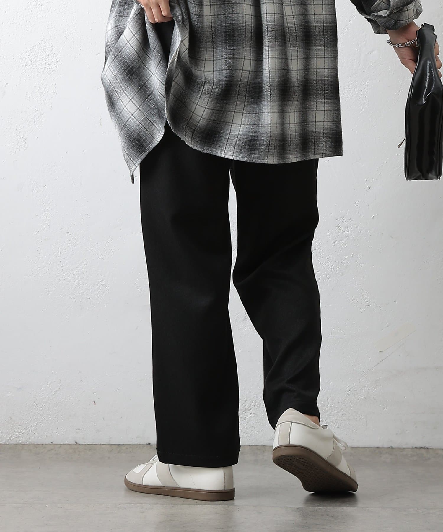 ウールのような高級感のある素材を使用しつつストレスフリーな履き心地を実現したテーパードパンツです。