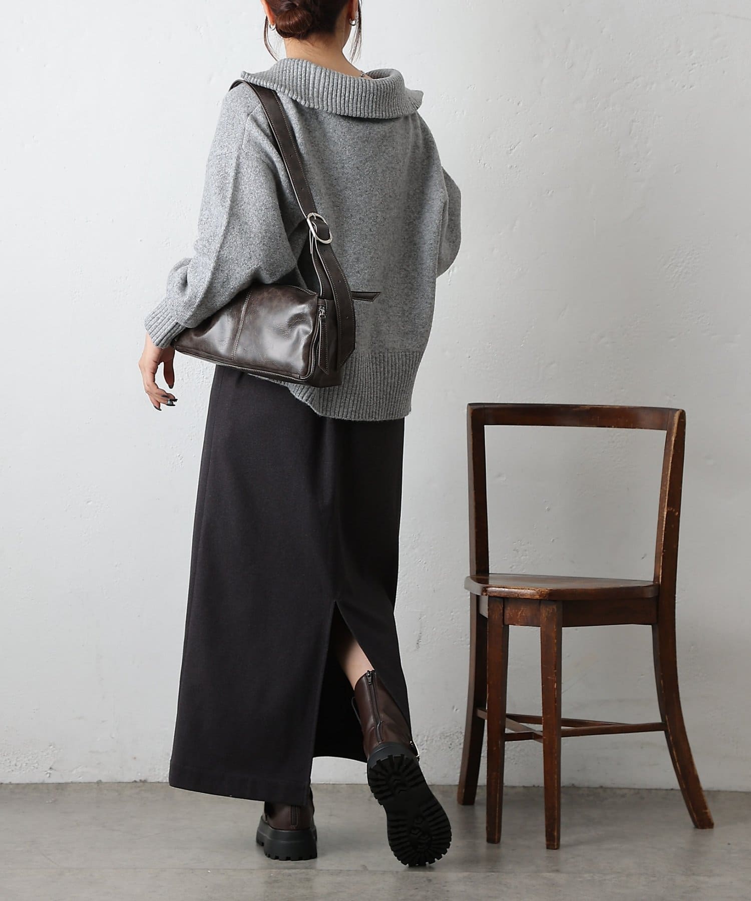 裾は前後差のあるデザインで、前側はやや短めに設定されており、自然とスタイルアップ効果も◎