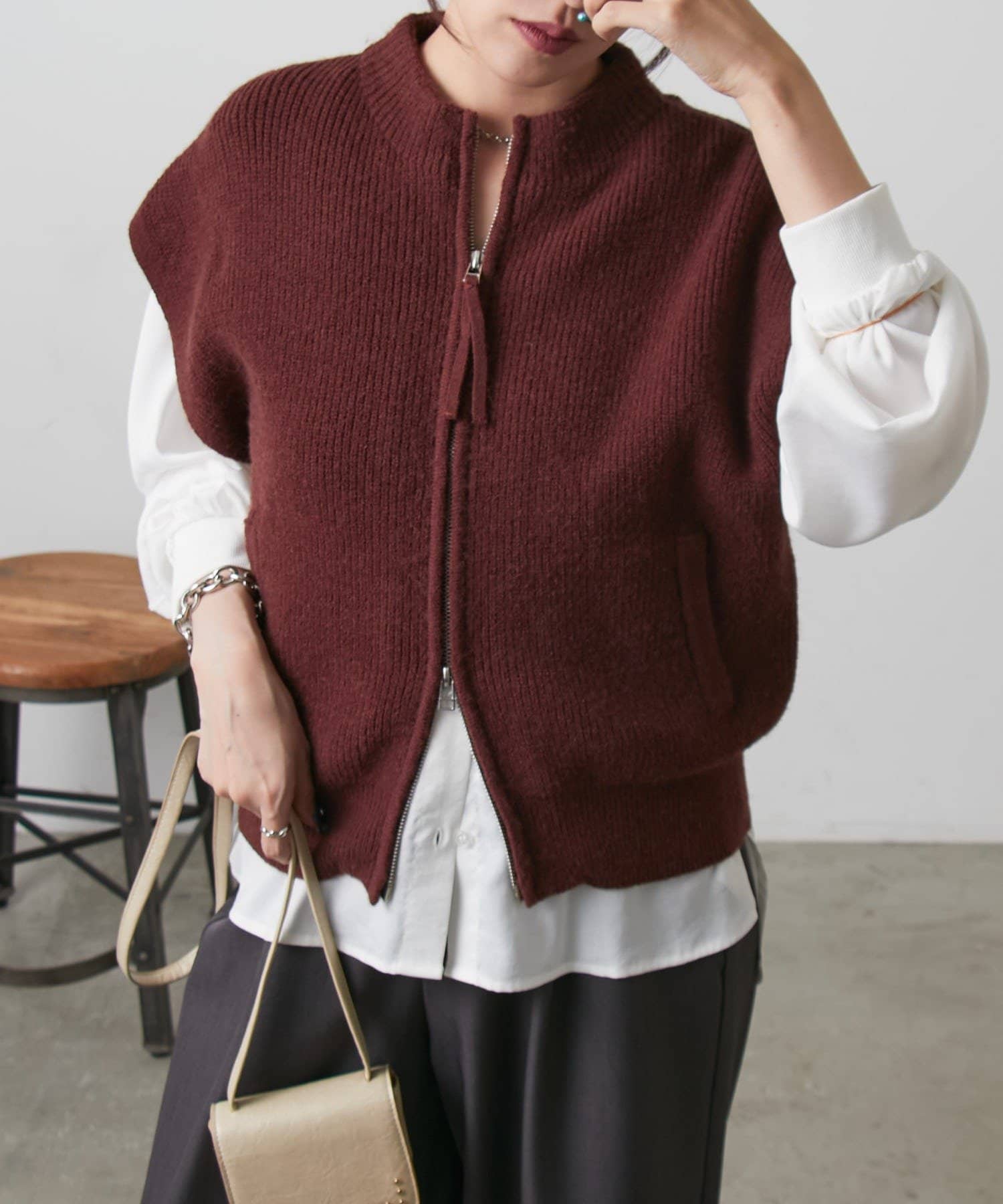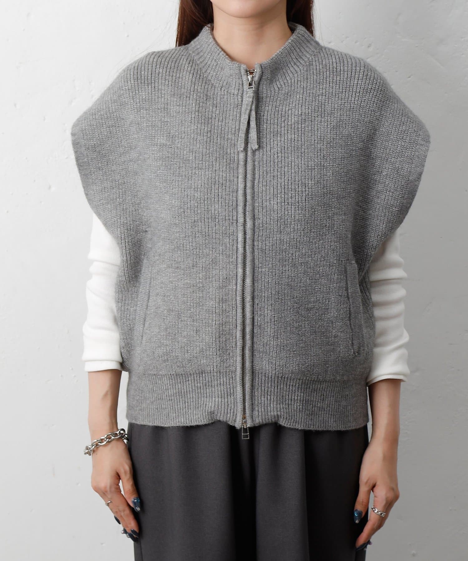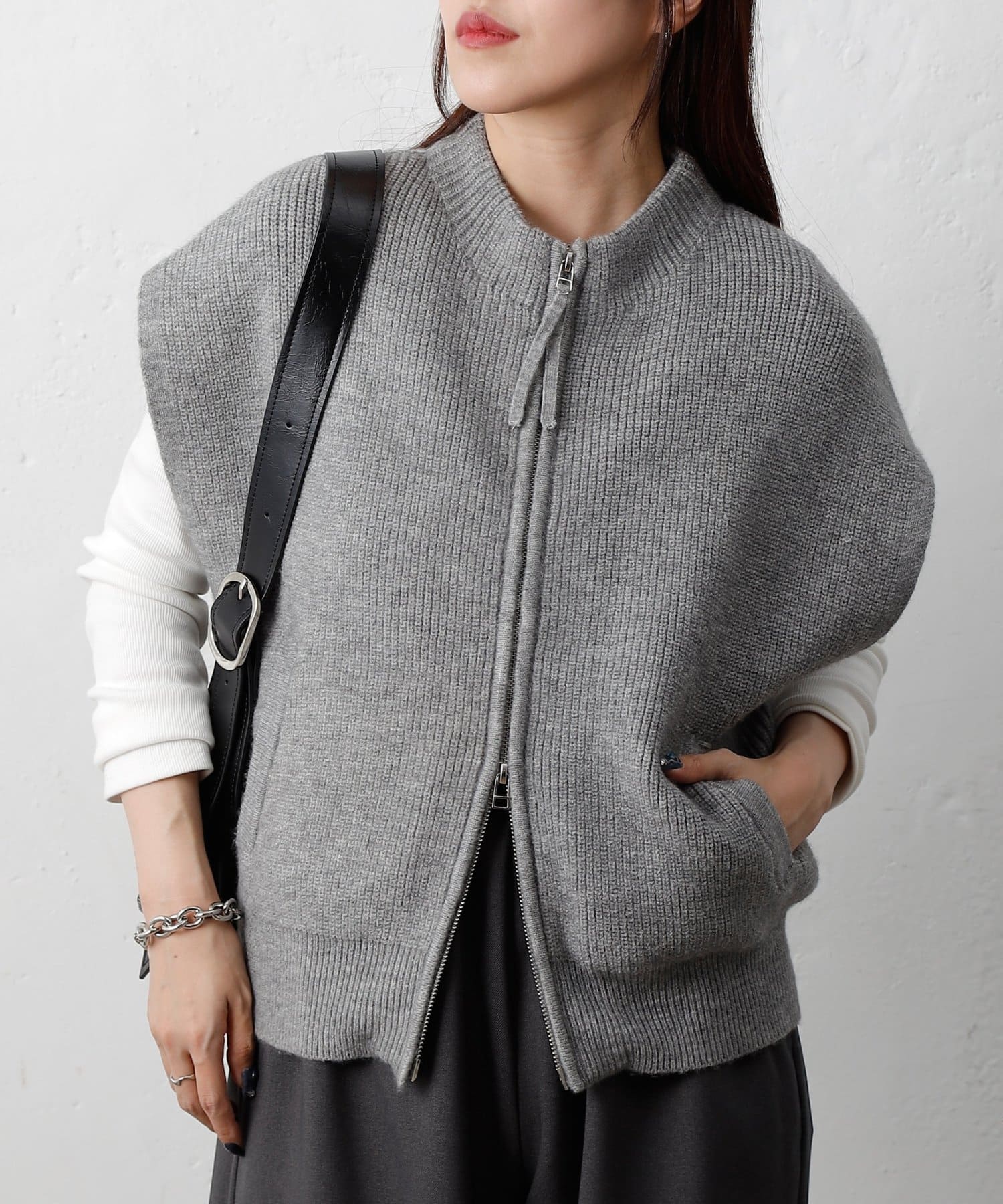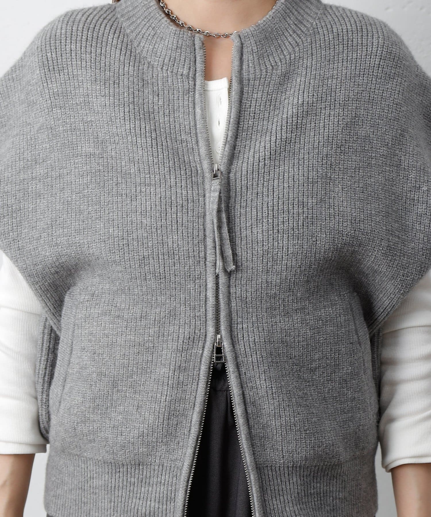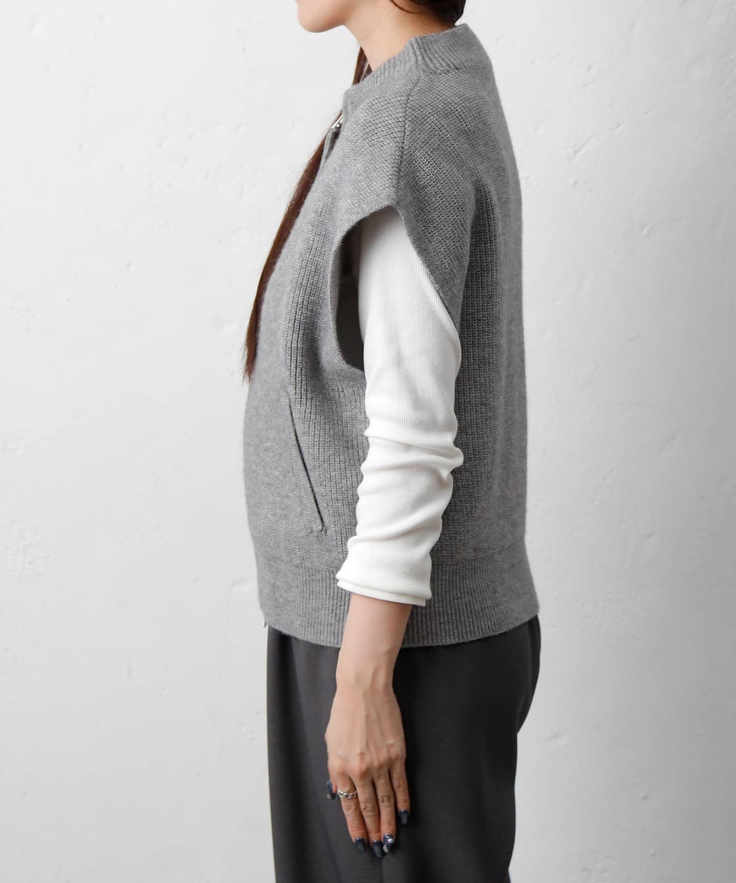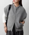 凹凸のある片畦編みが生み出す自然な立体感がかわいいジップアップベストです。