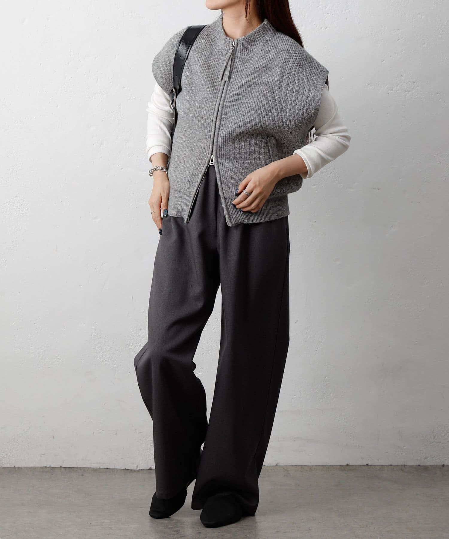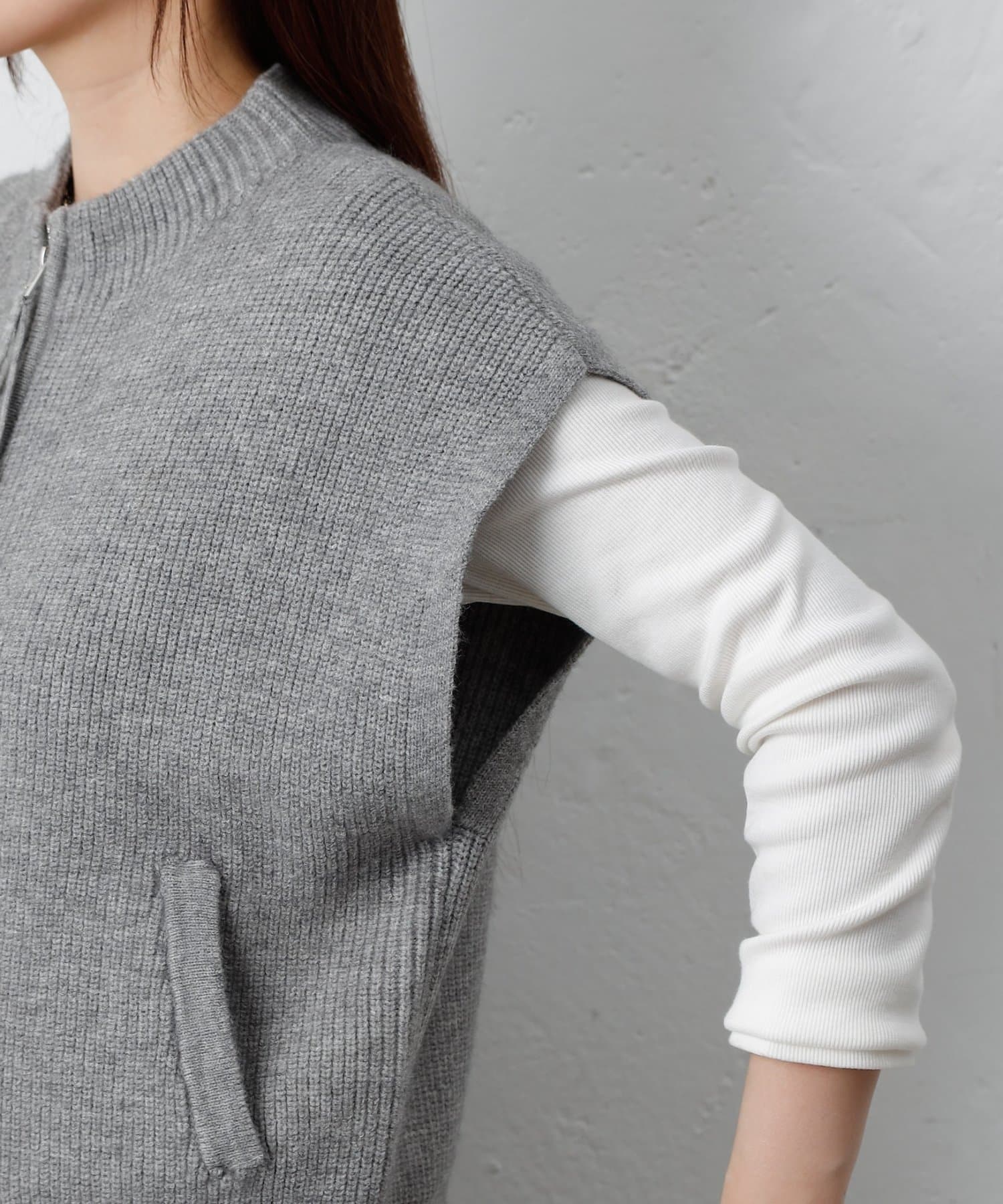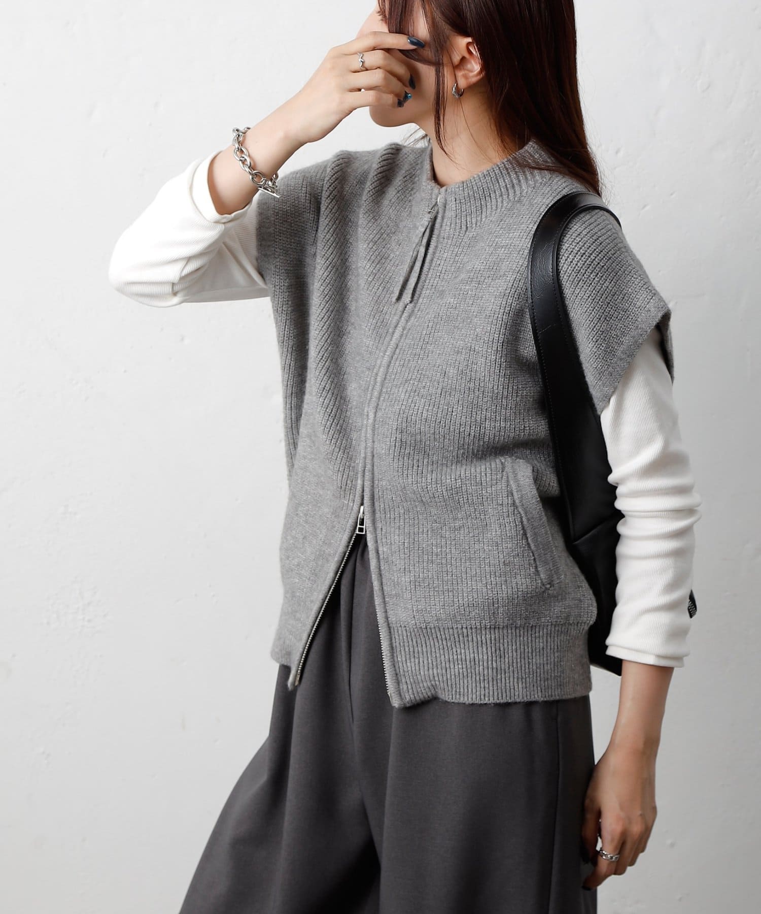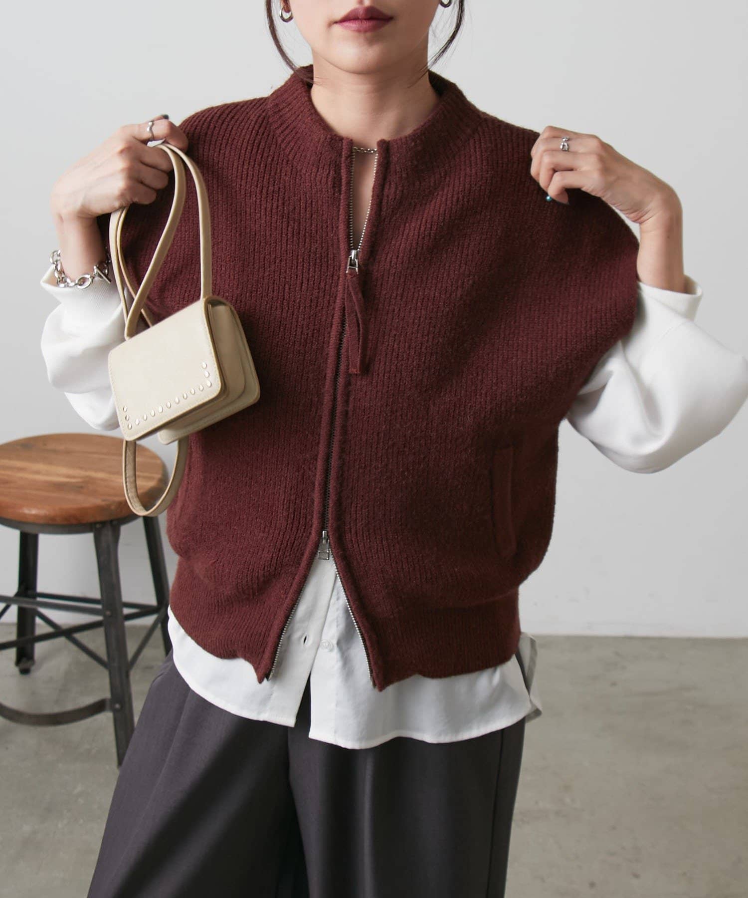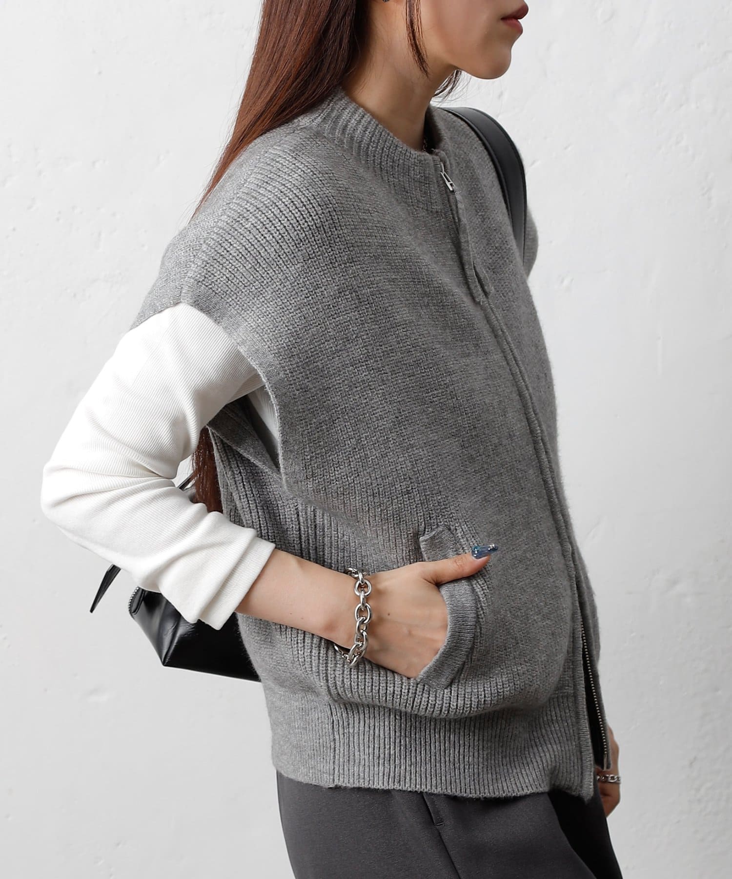 凹凸のある片畦編みが生み出す自然な立体感がかわいいジップアップベストです。