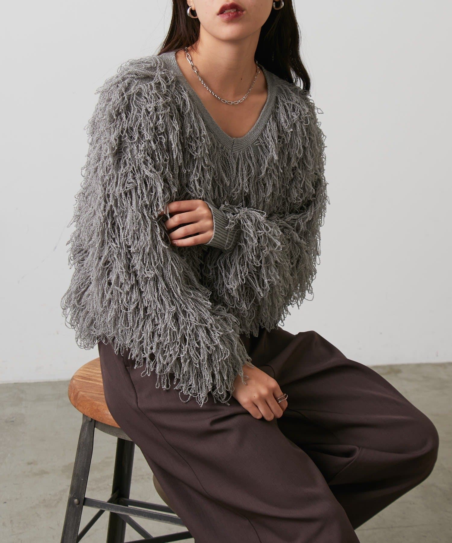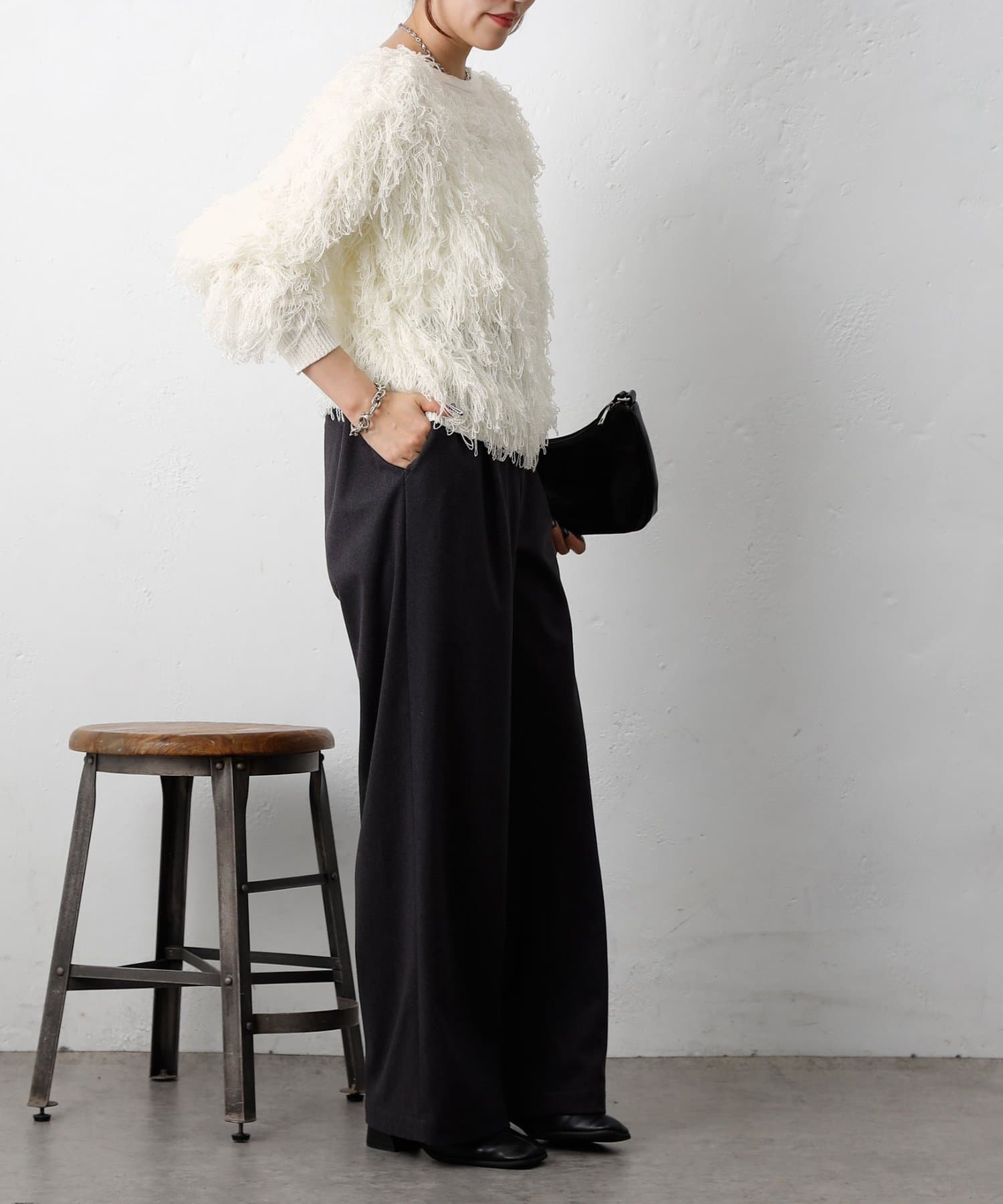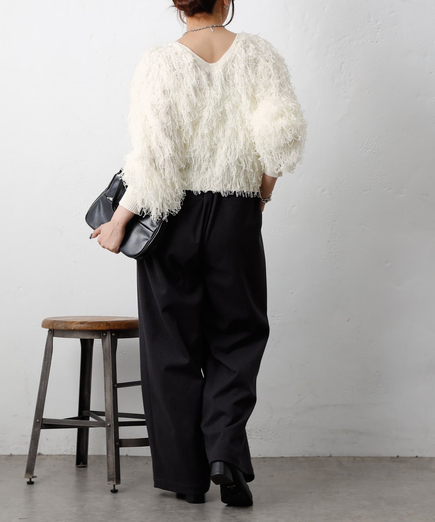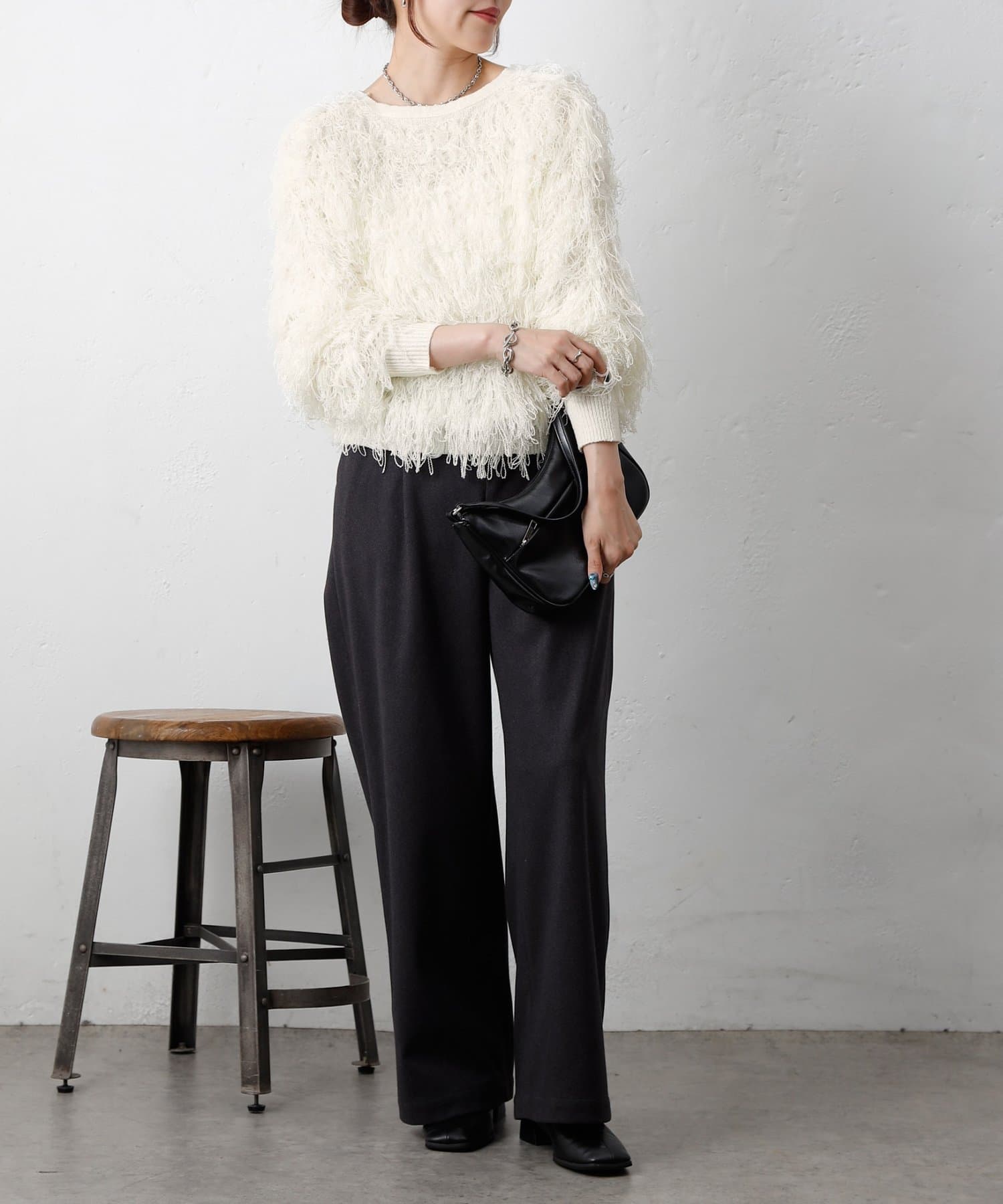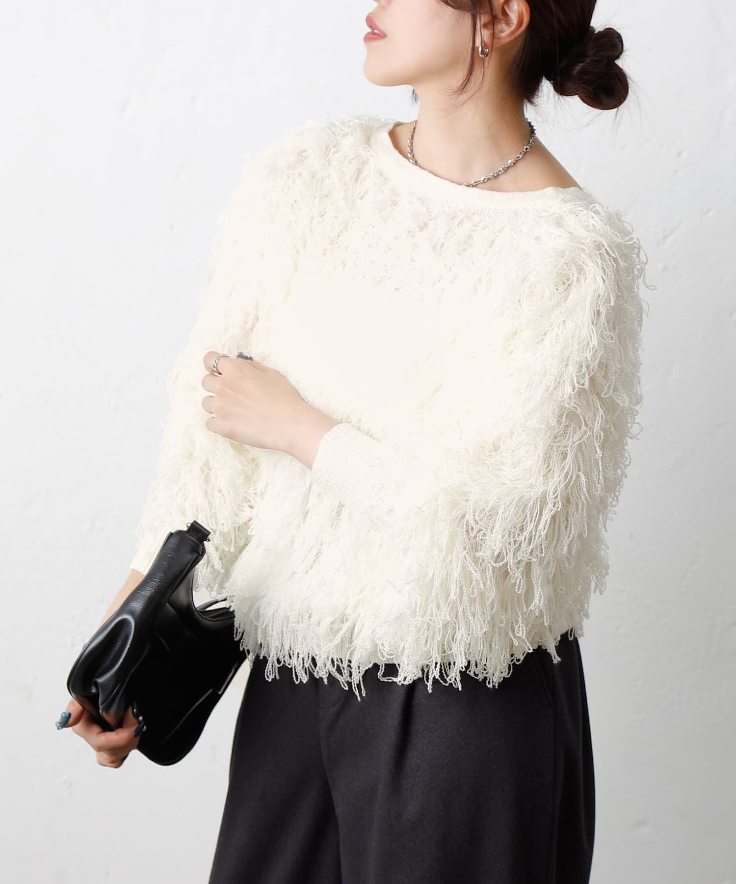 【華やかフリンジが目を惹く、着回し自在なデザインニット】