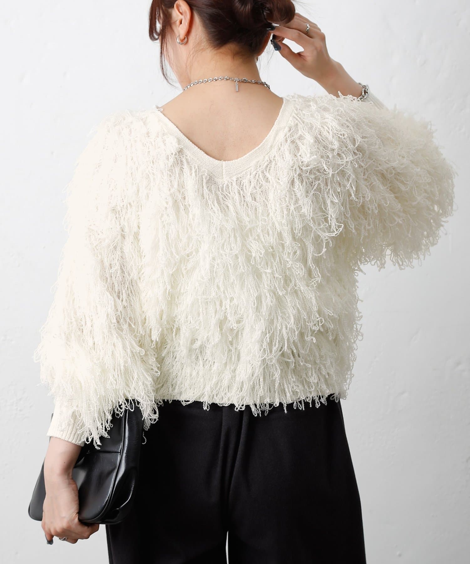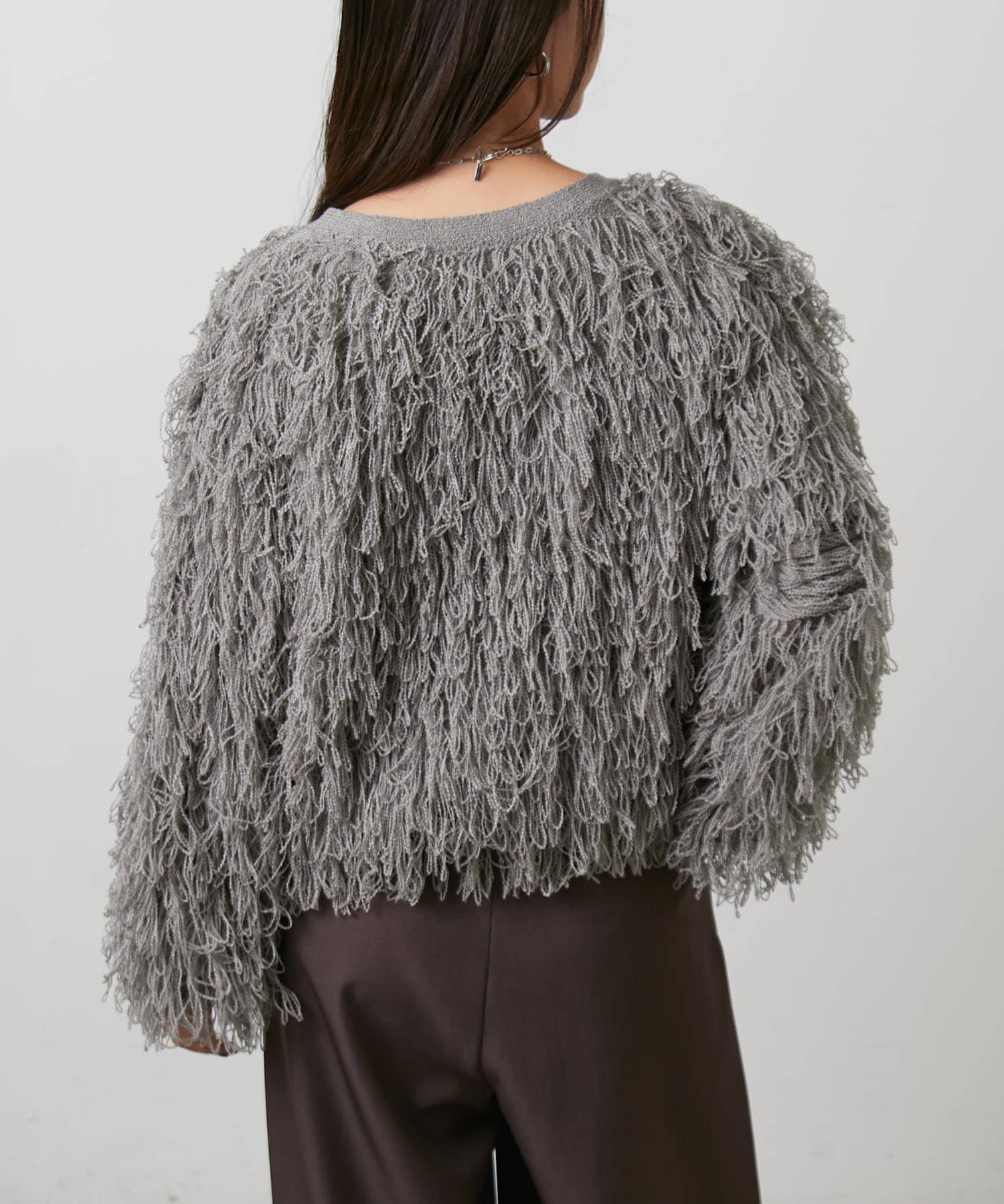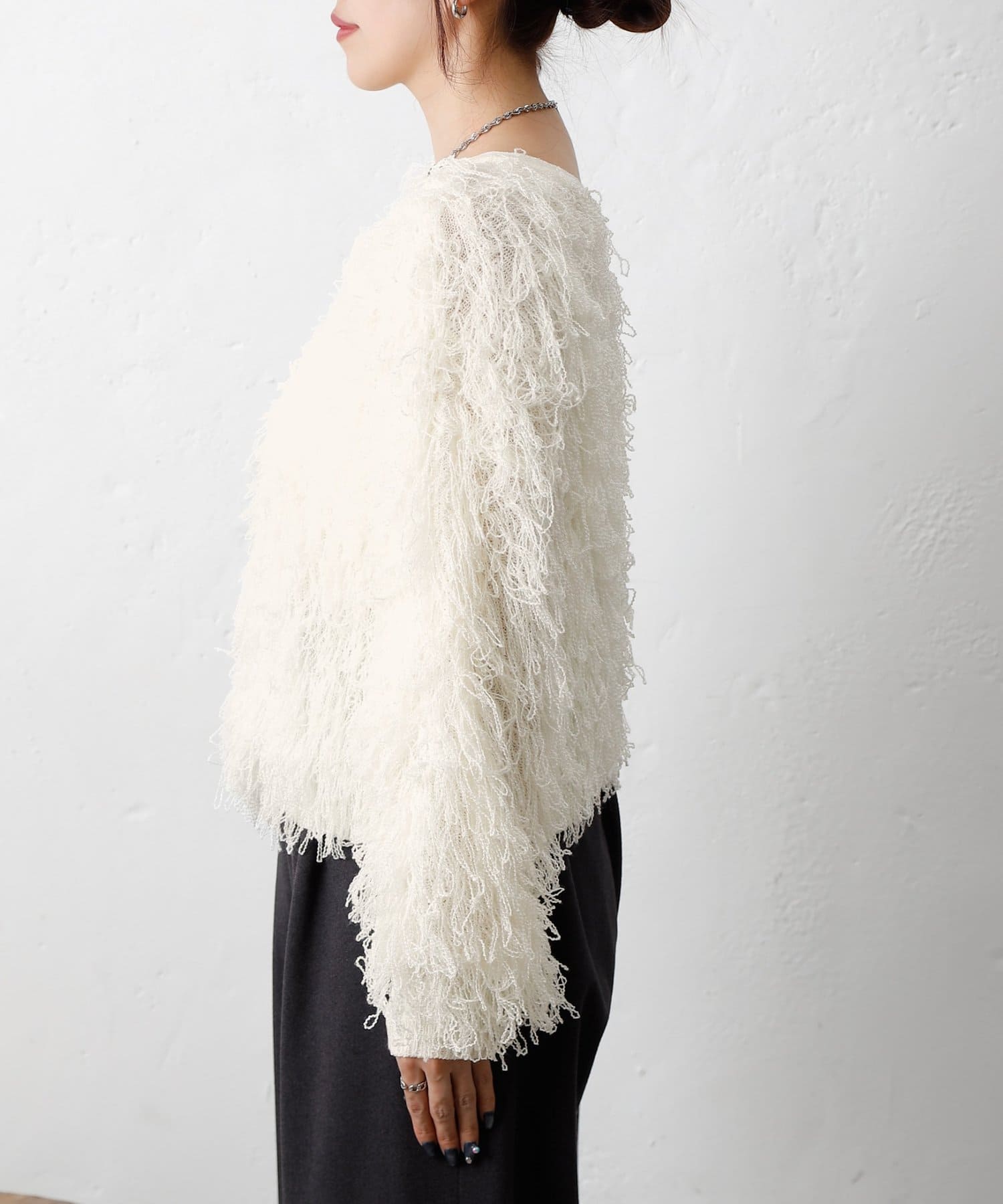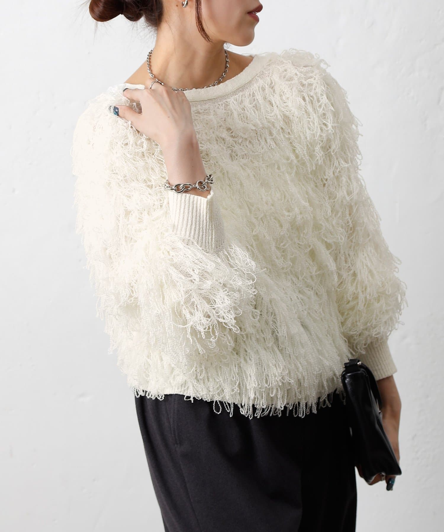 立体感のあるループフリンジをたっぷりとあしらった、存在感抜群の2WAYニットです。