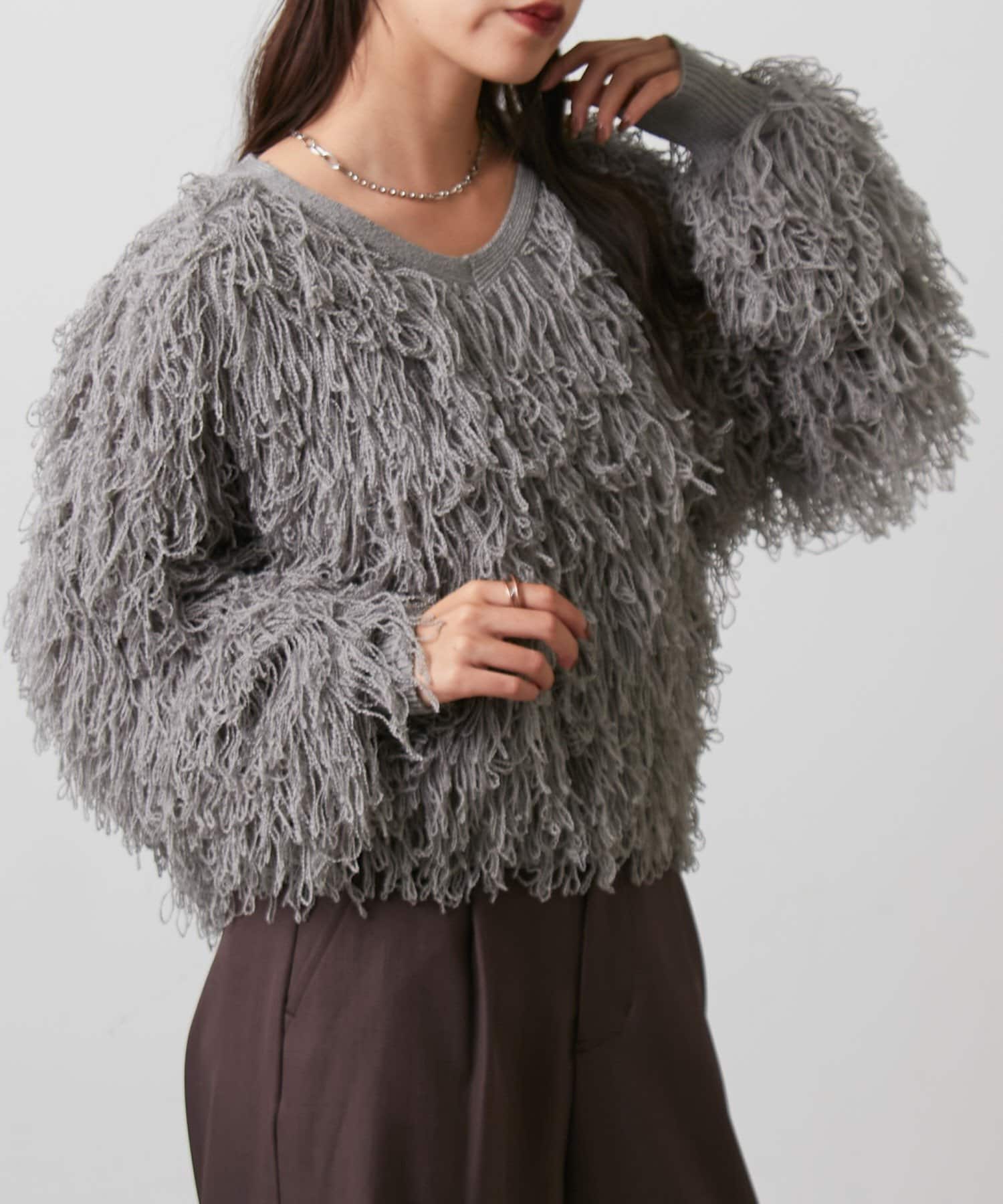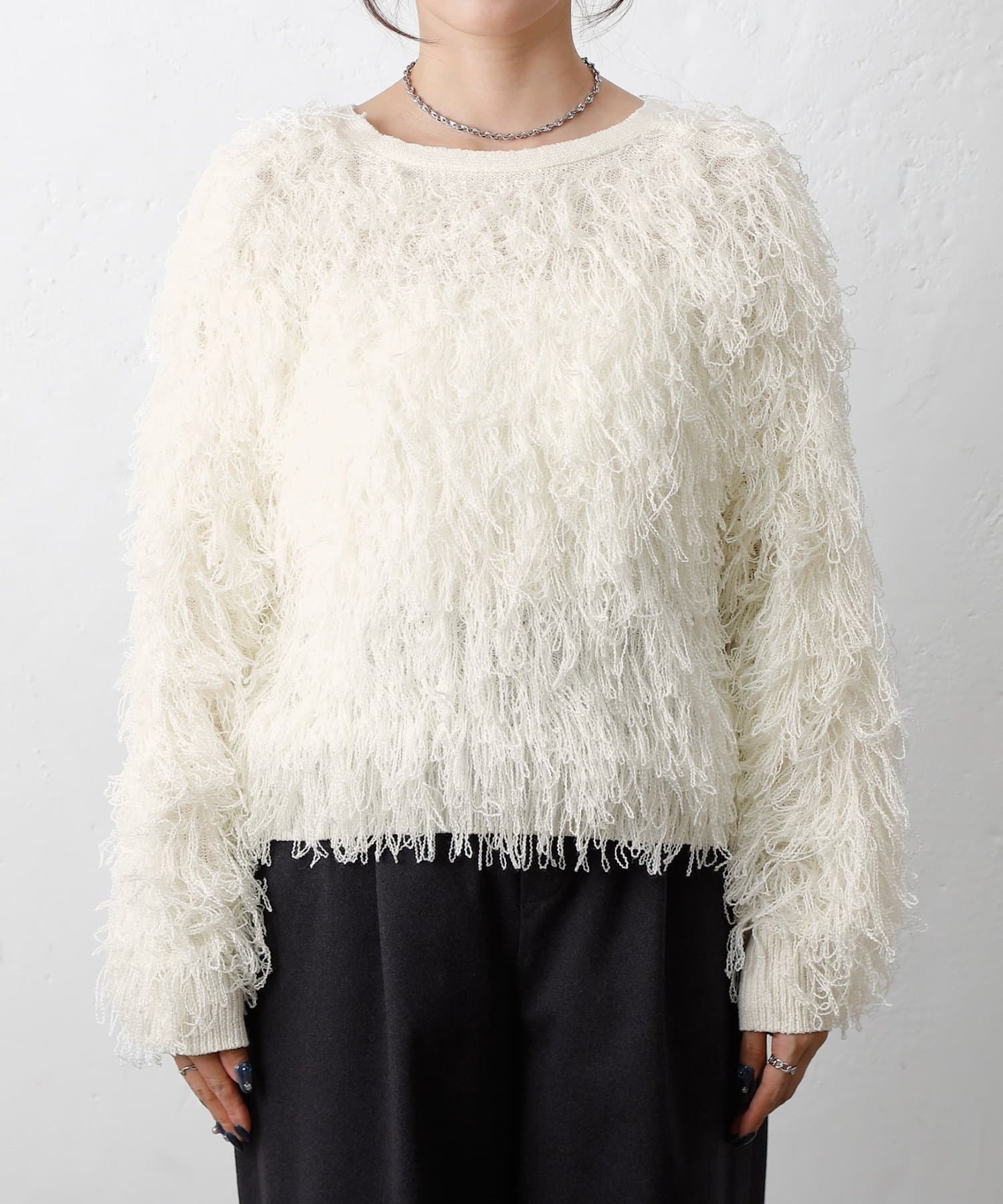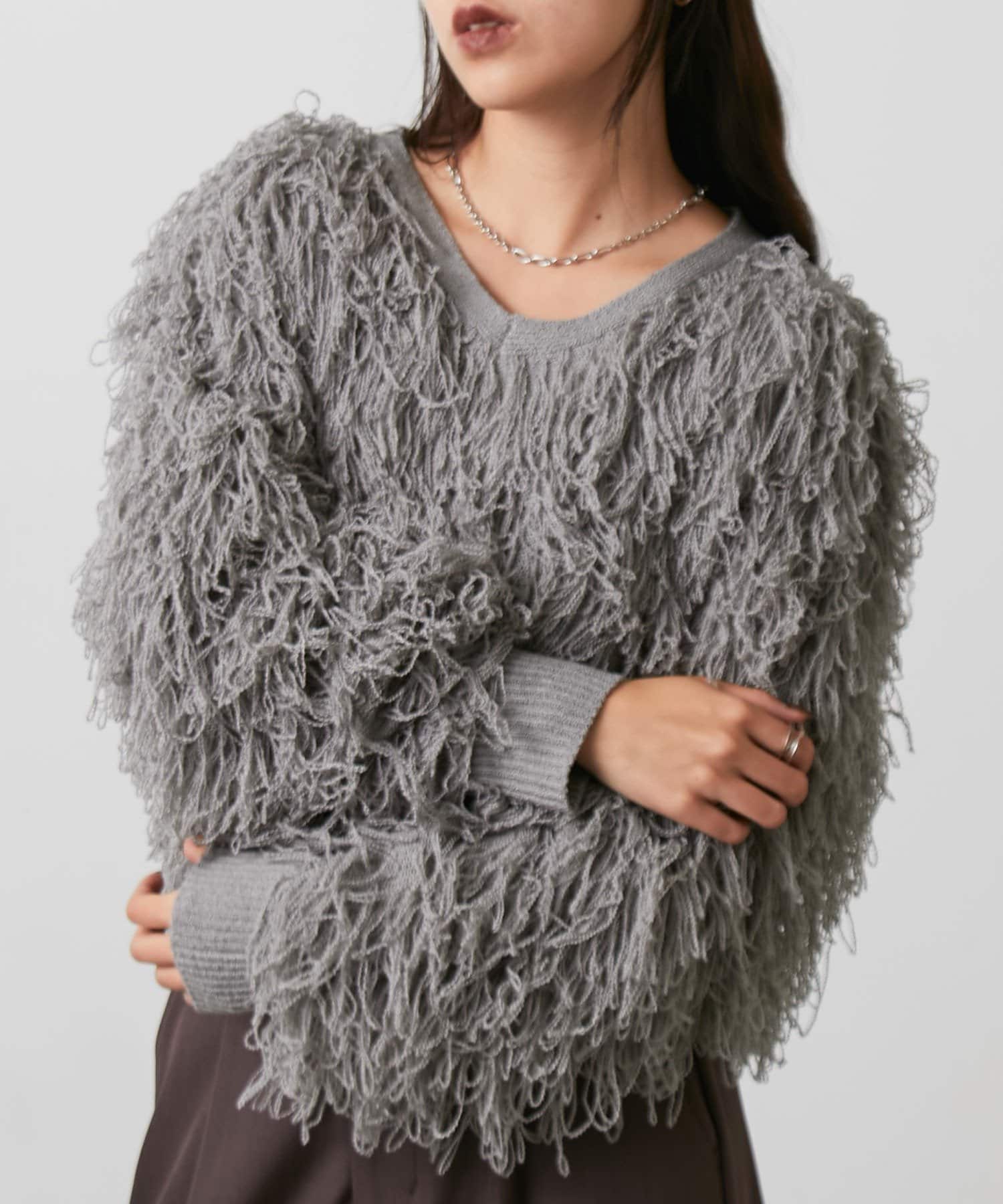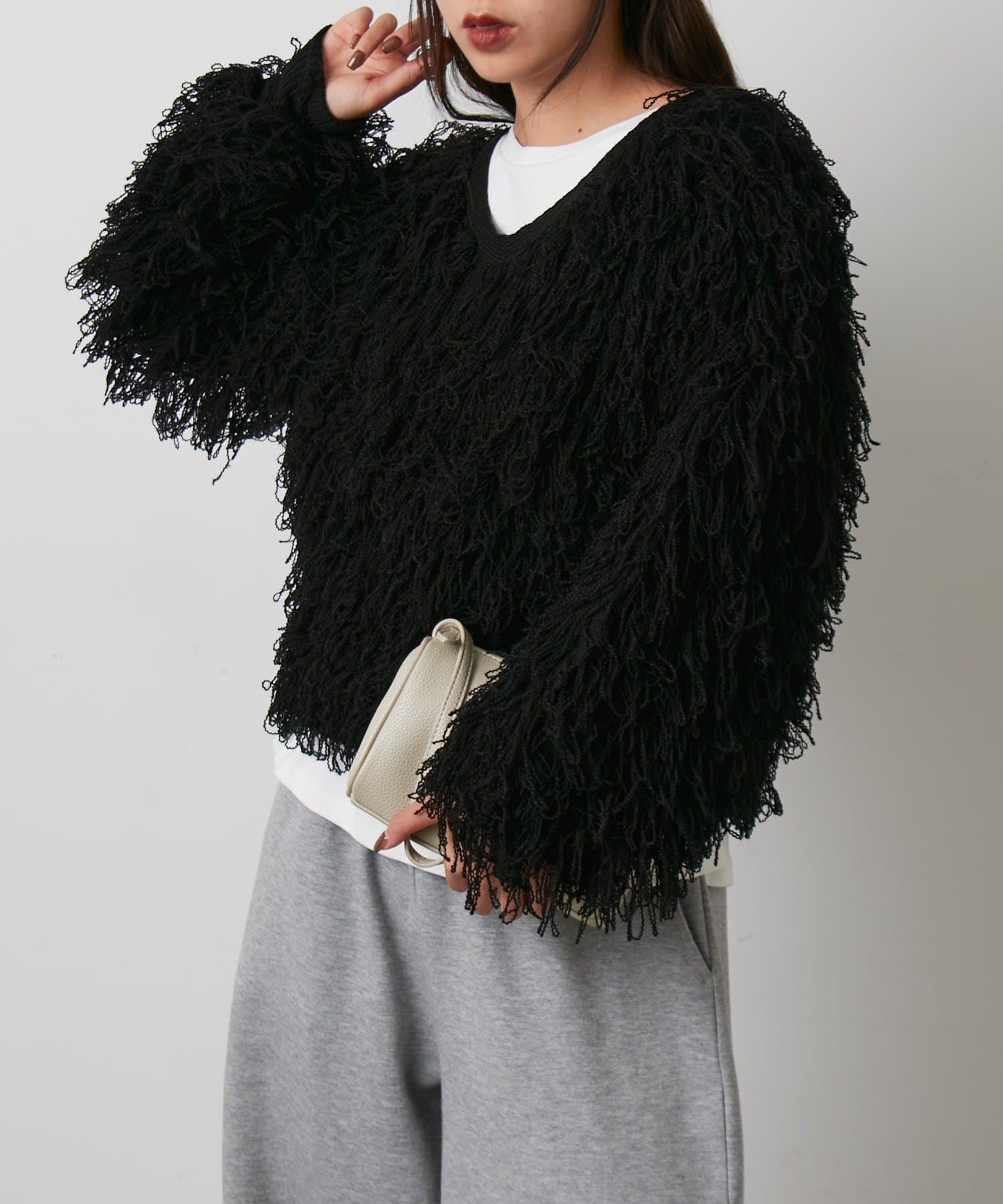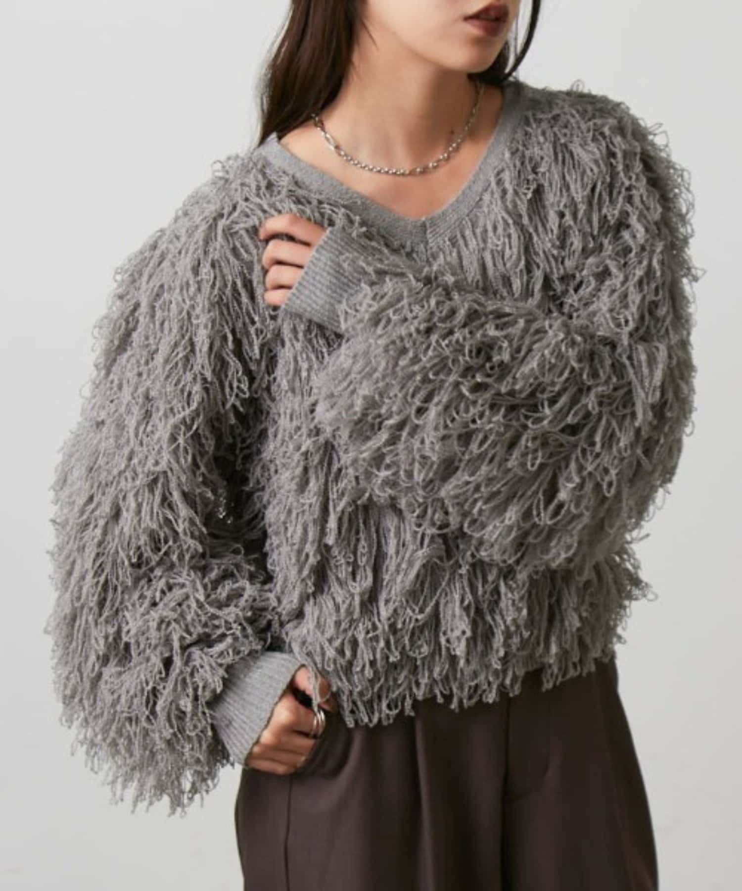 立体感のあるループフリンジをたっぷりとあしらった、存在感抜群の2WAYニットです。