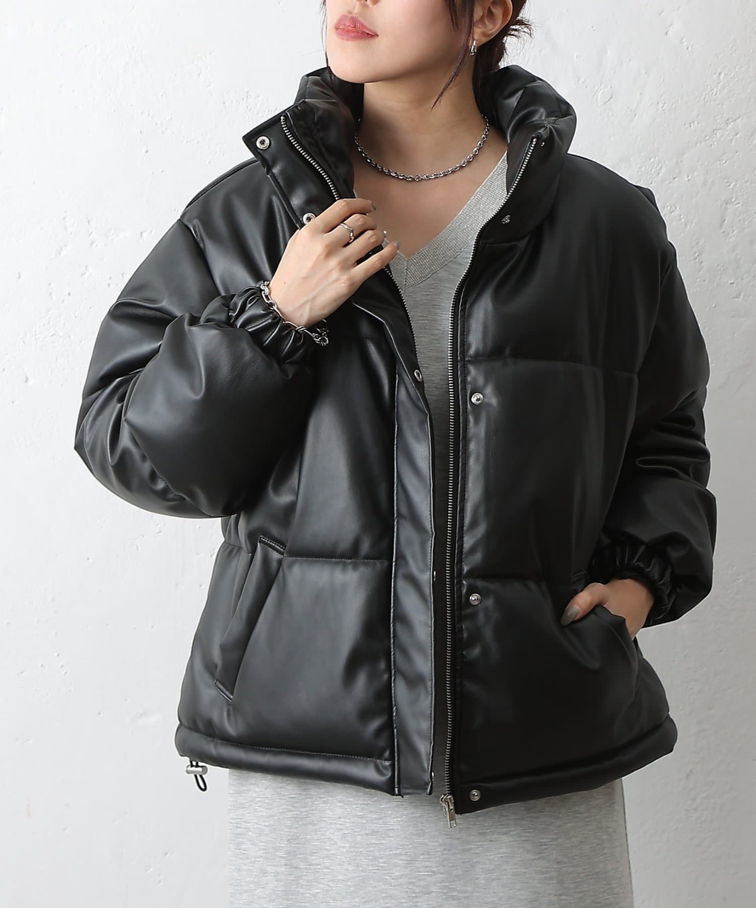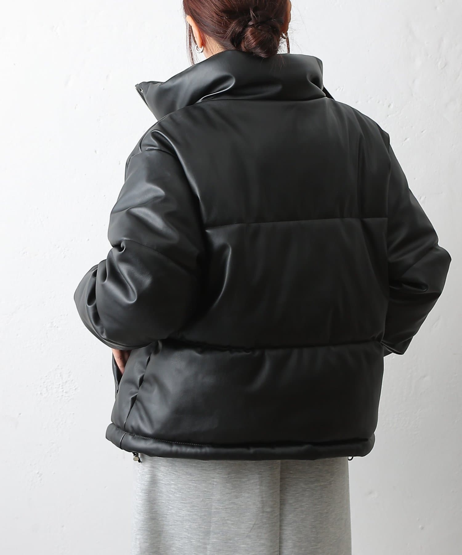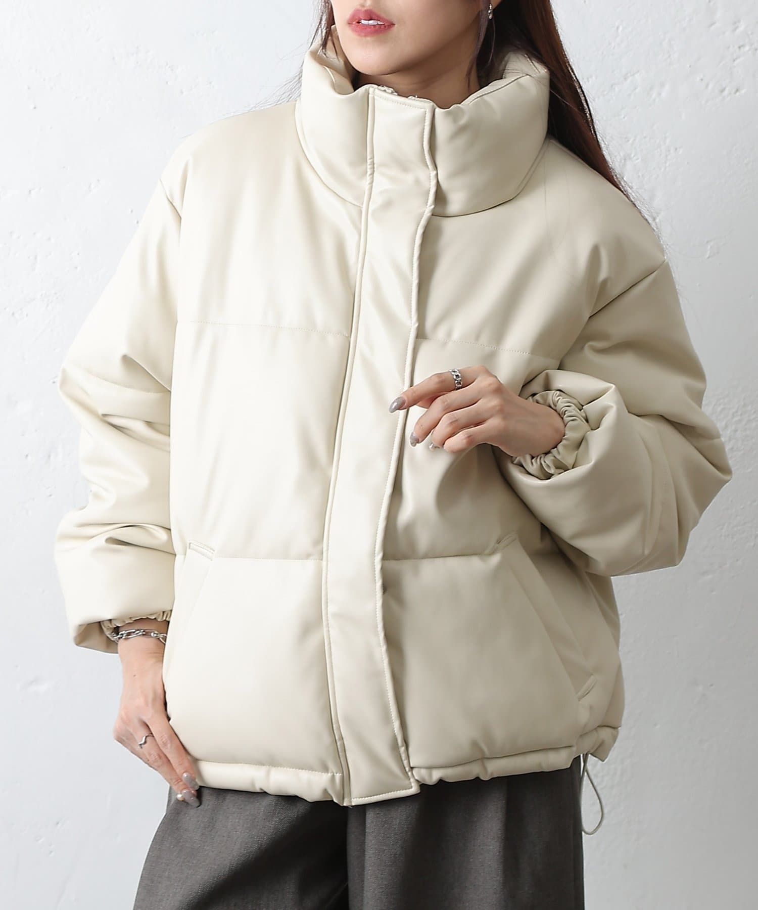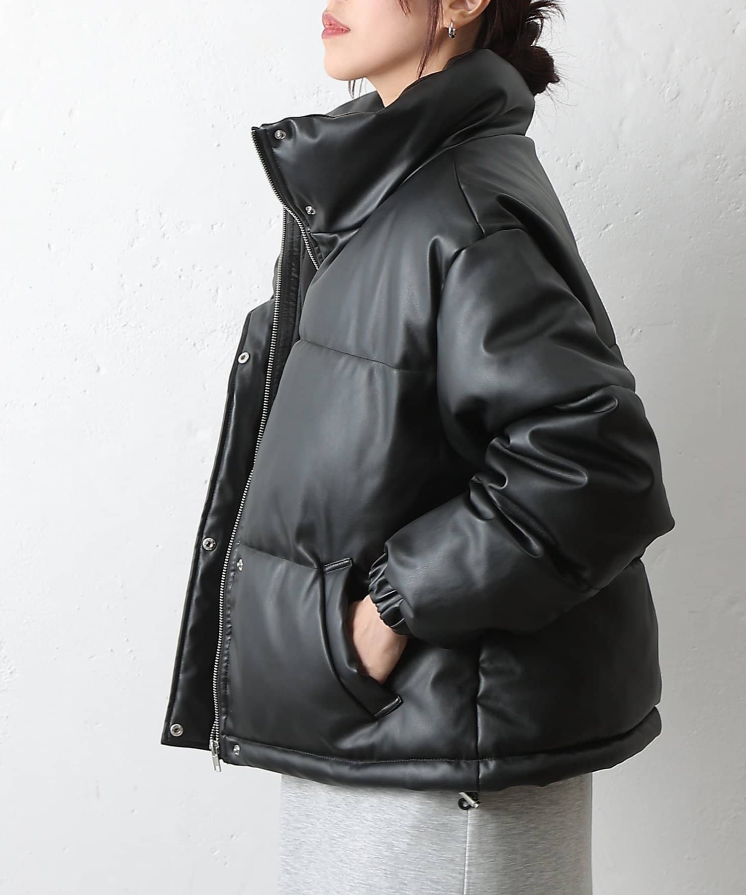 女性らしい柔らかな印象を残しつつ、クールで洗練された雰囲気をまとえるソフトレザーの中綿スタンドカラーブルゾンです。