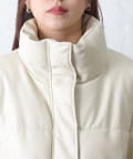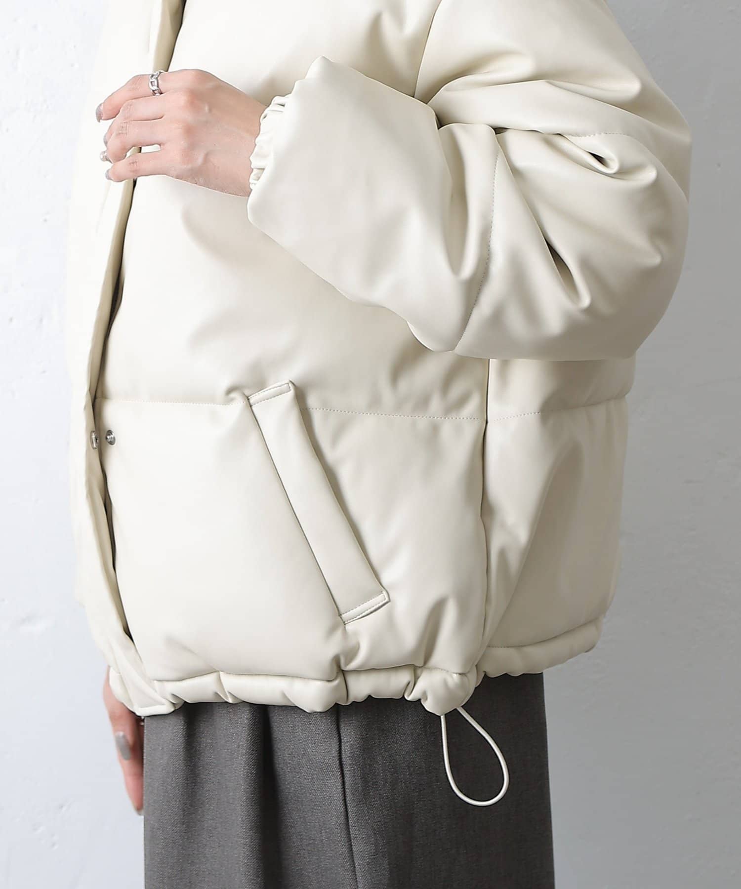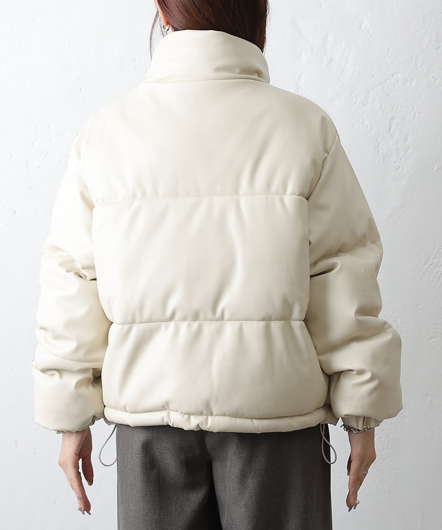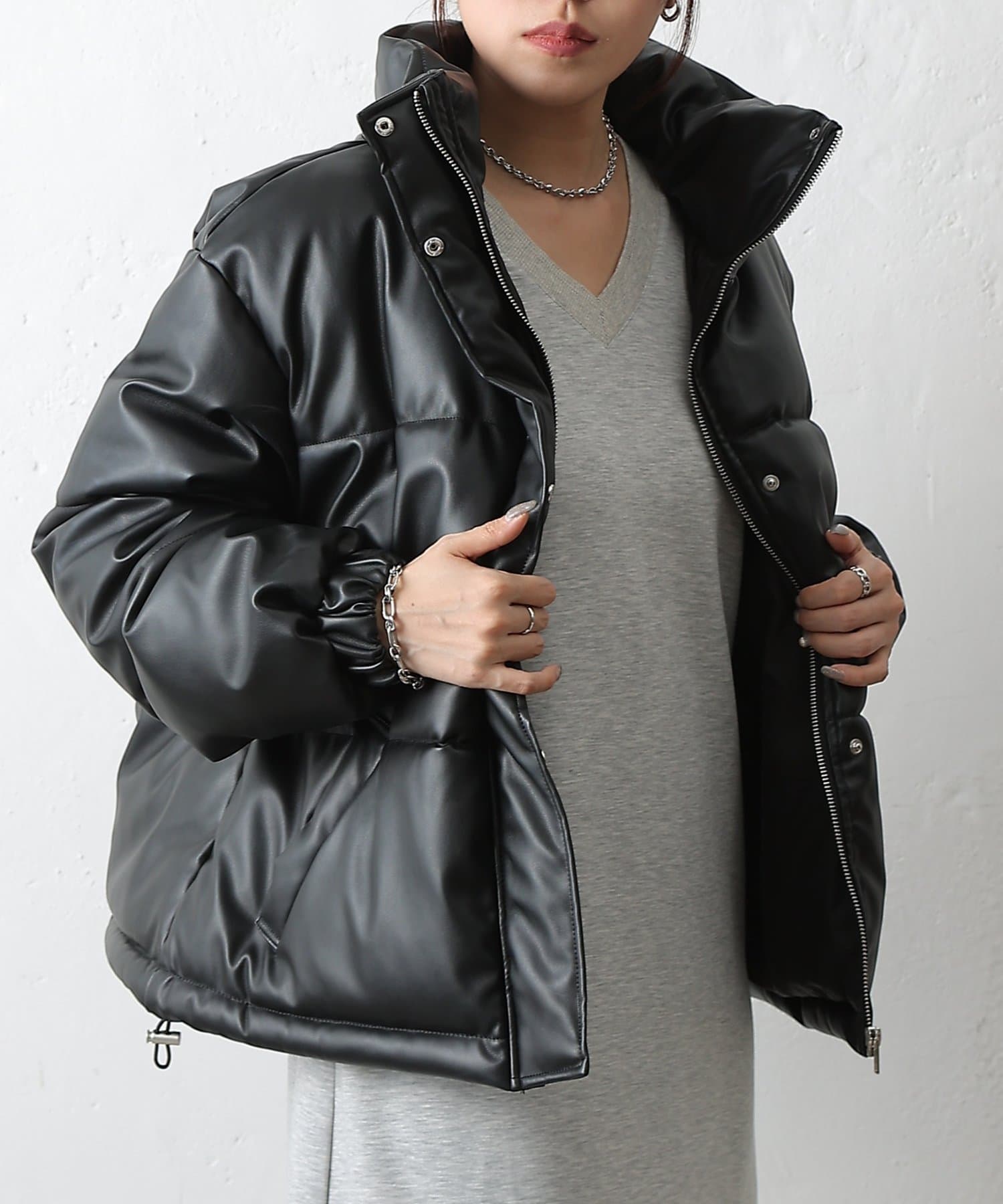 女性らしい柔らかな印象を残しつつ、クールで洗練された雰囲気をまとえるソフトレザーの中綿スタンドカラーブルゾンです。