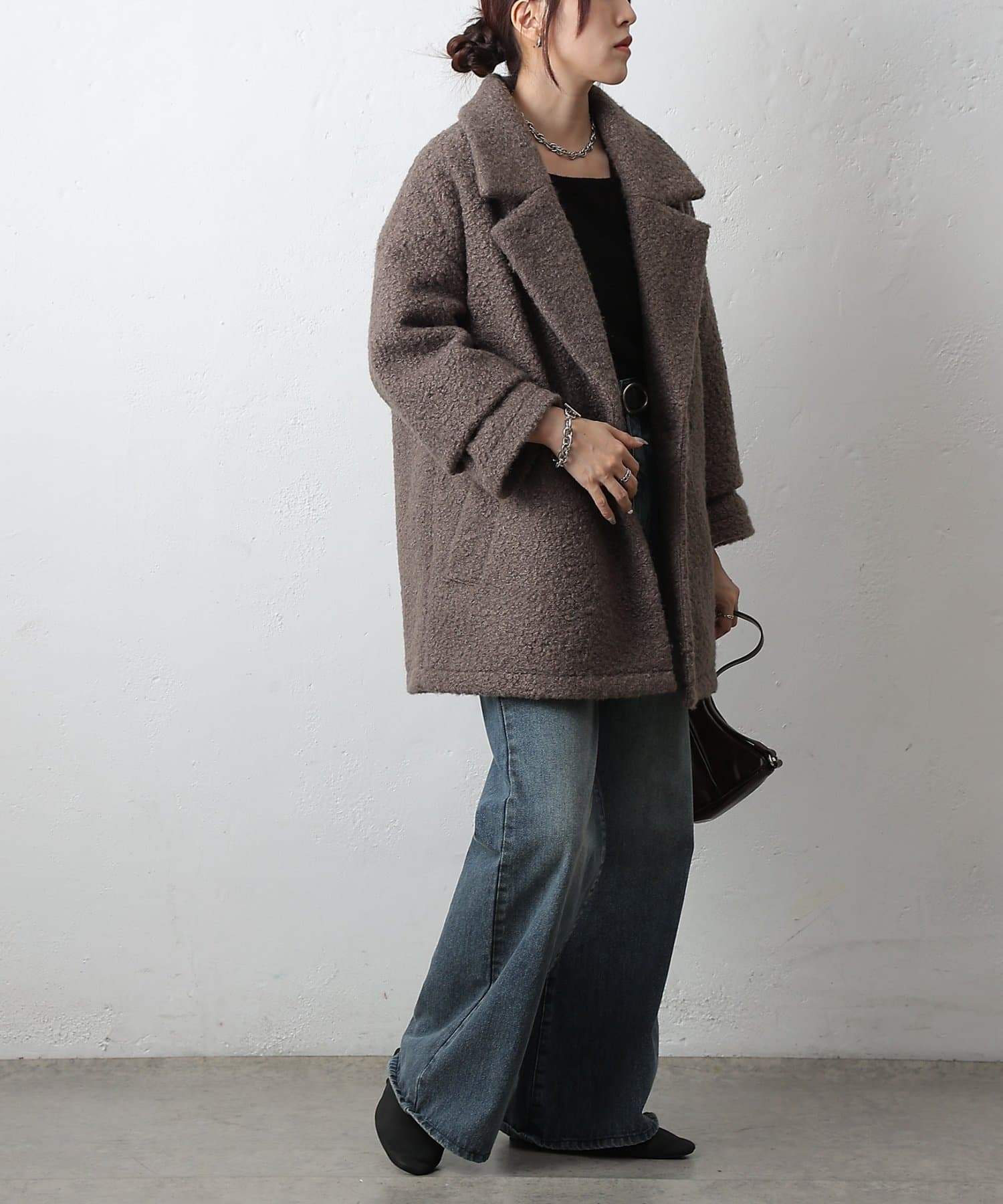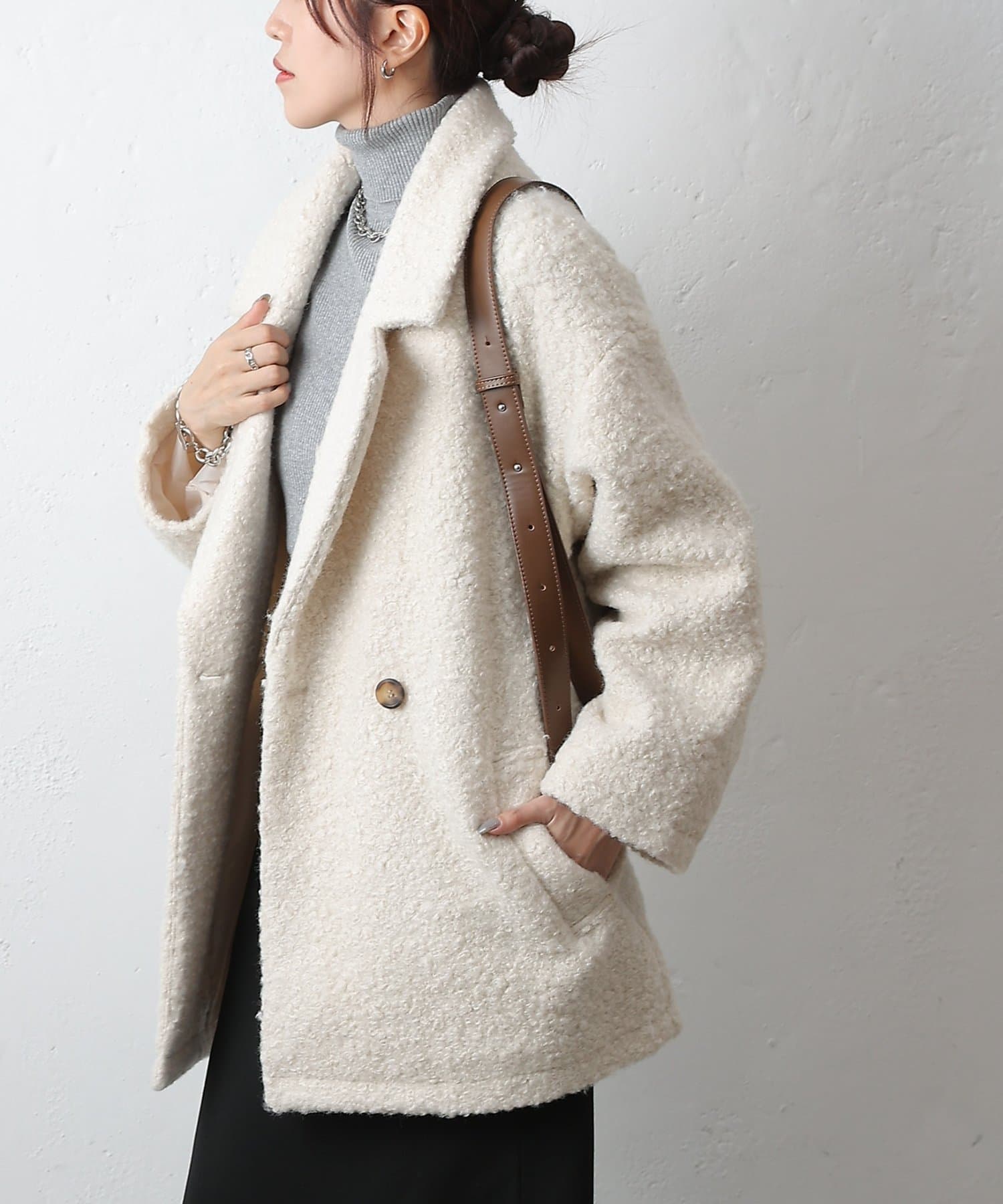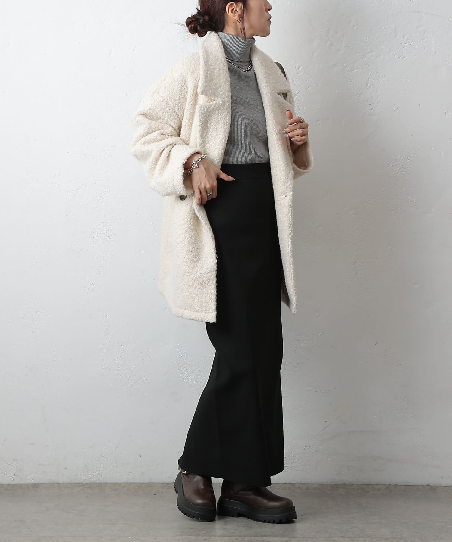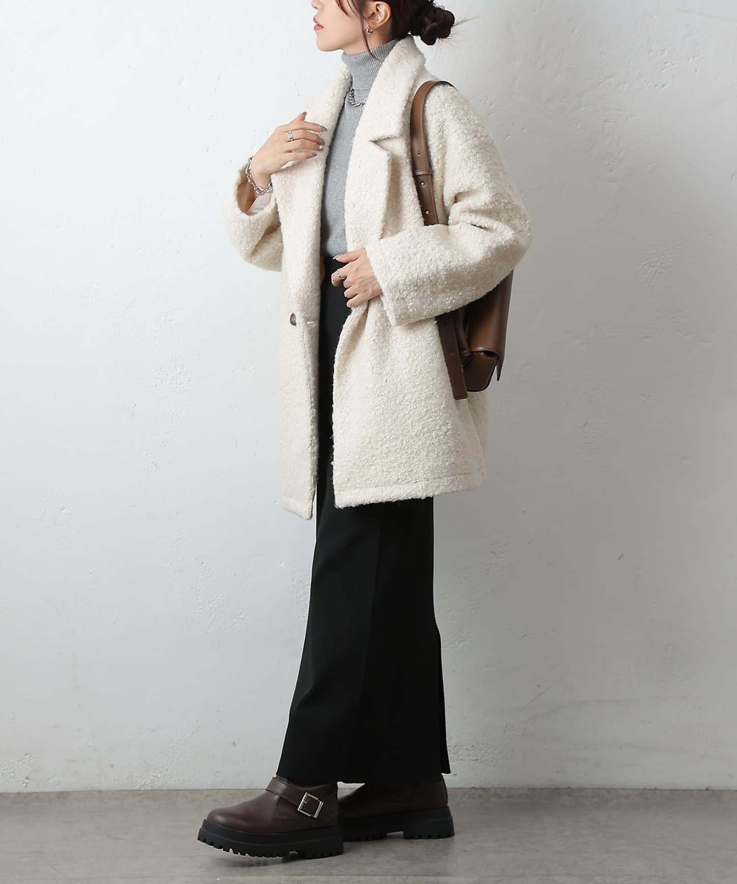 ハイネックなどと合わせてもバランスよく決まります。