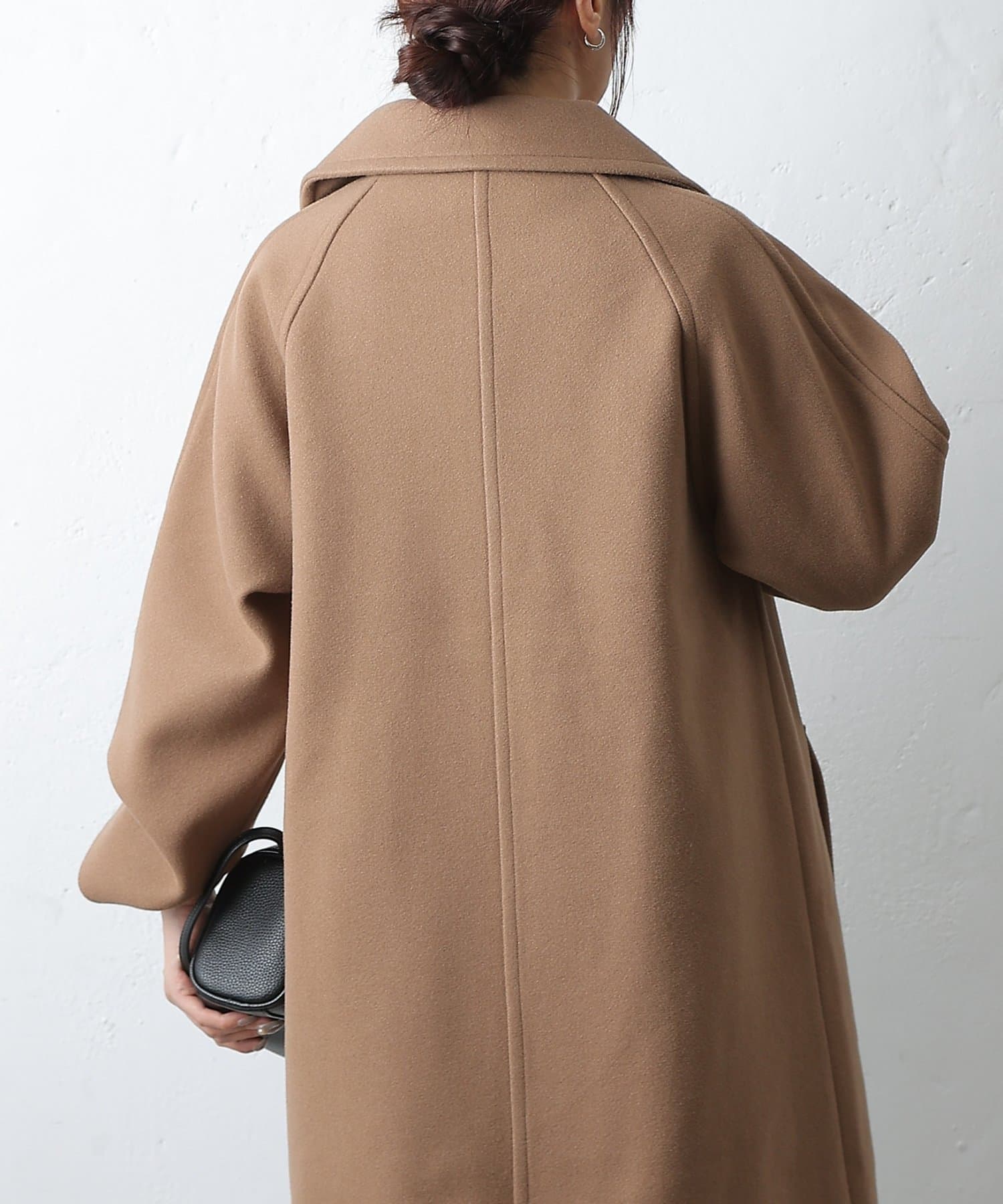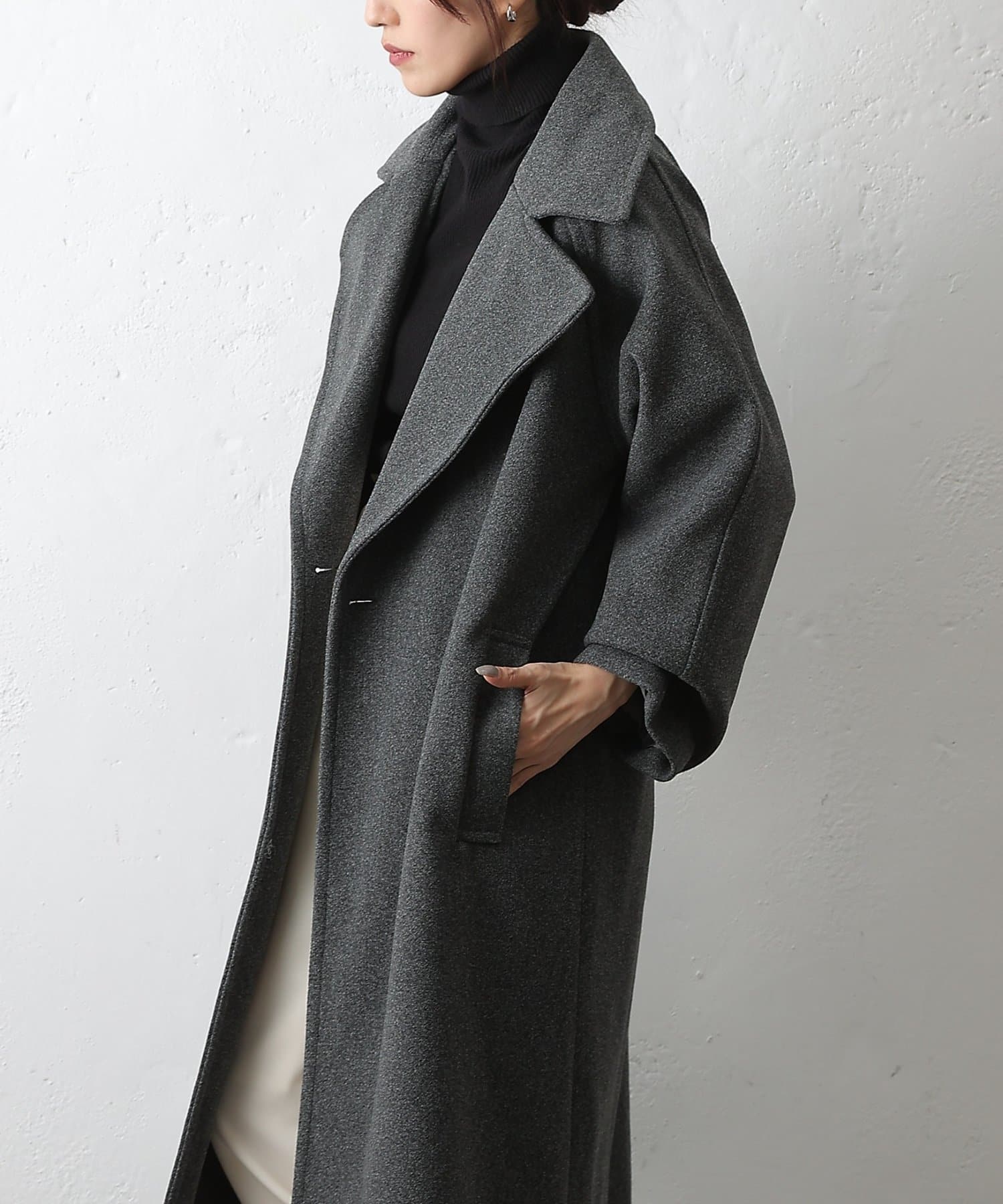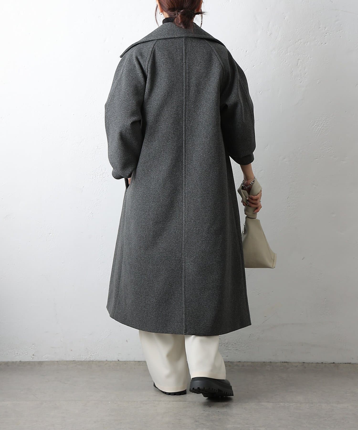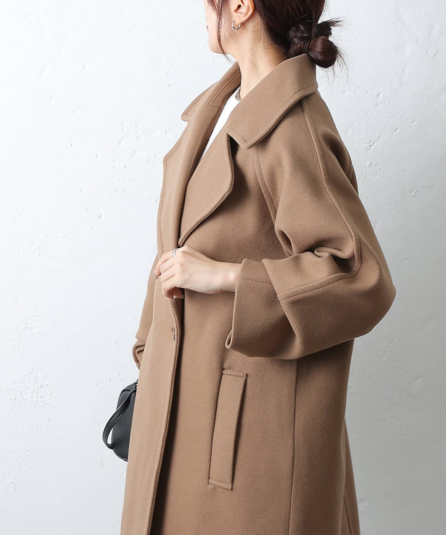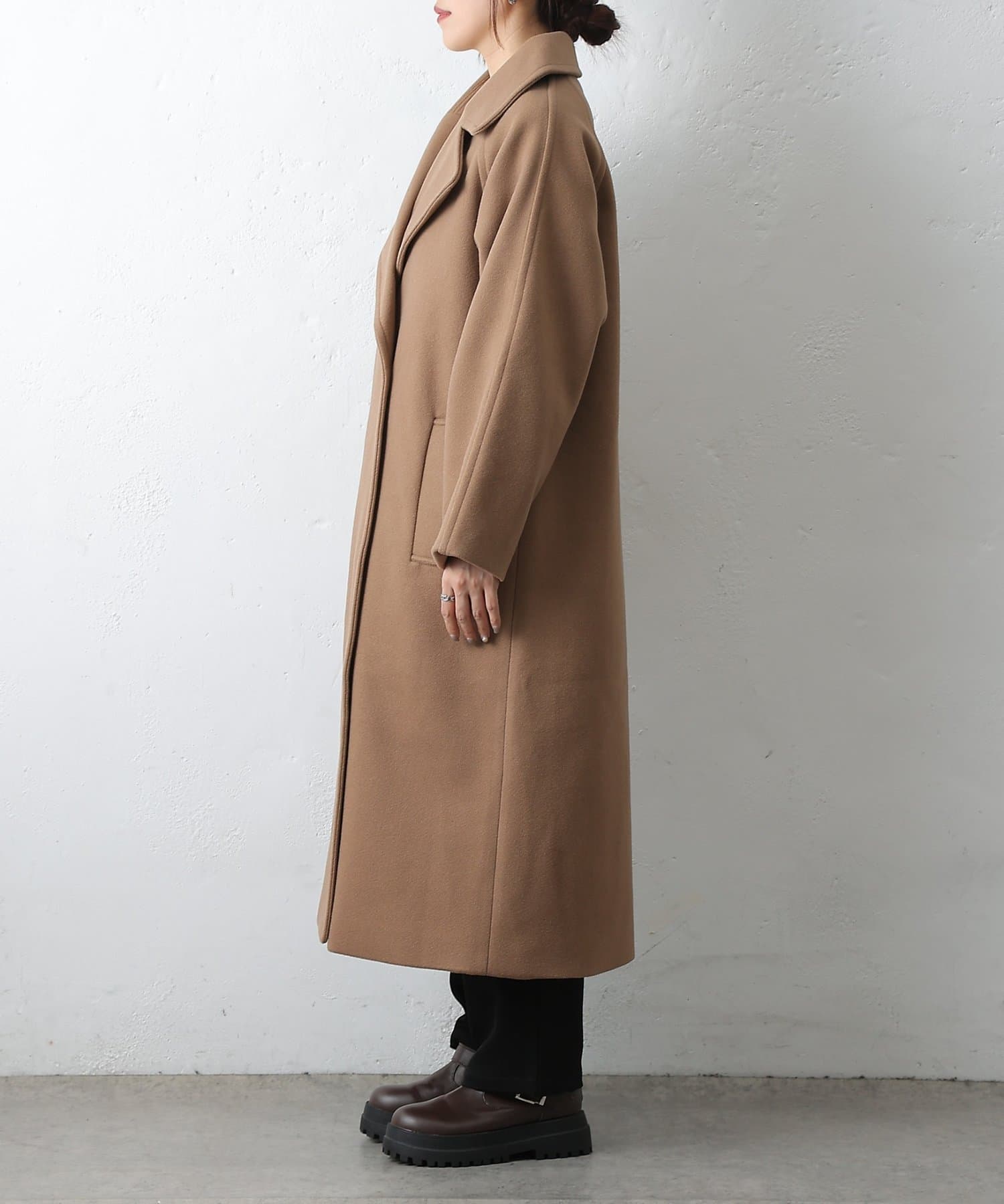 ラグランスリーブデザインが特徴的なテックウール素材のロングチェスターコートです。