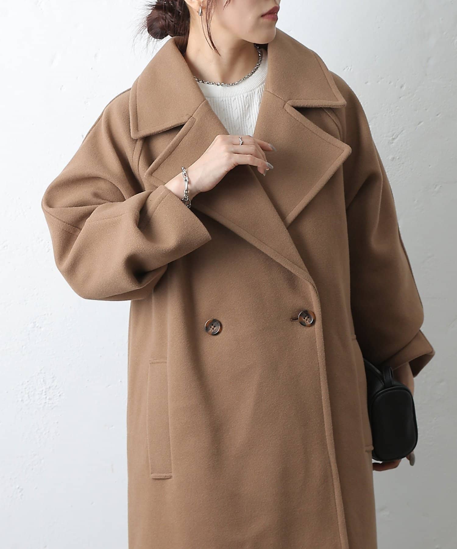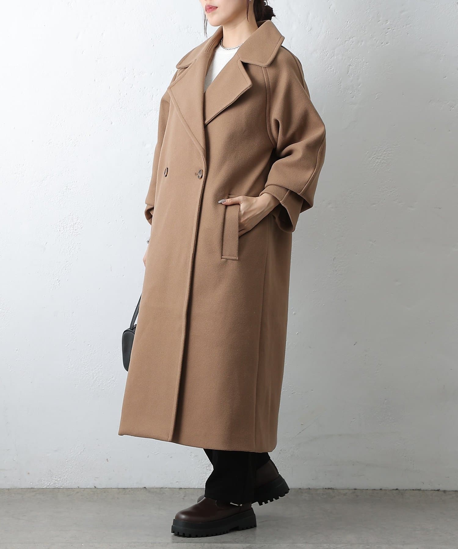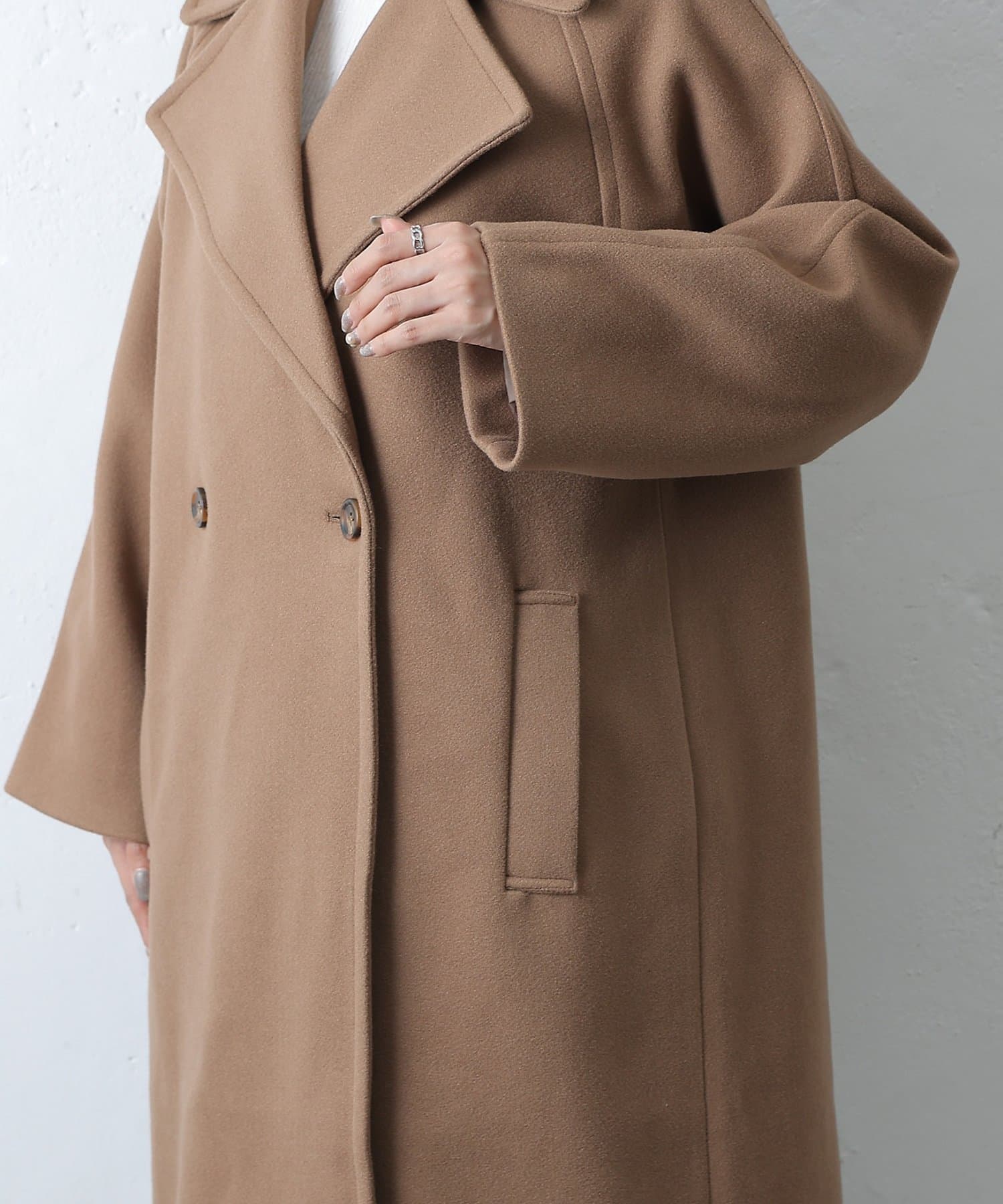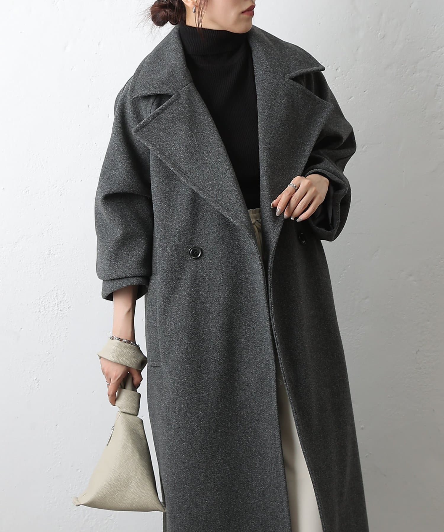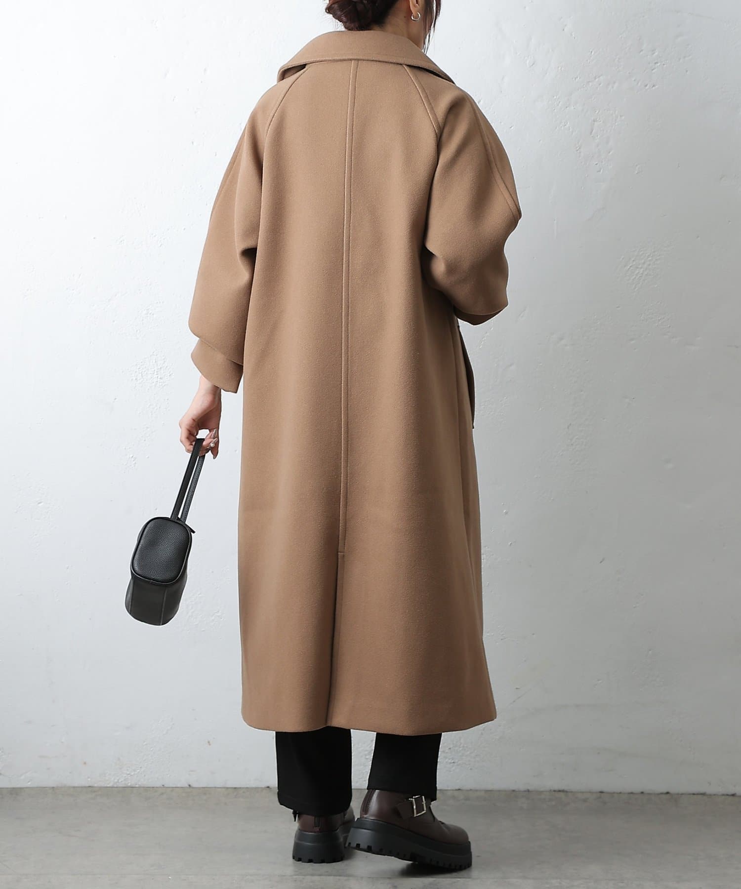 ラグランスリーブデザインが特徴的なテックウール素材のロングチェスターコートです。