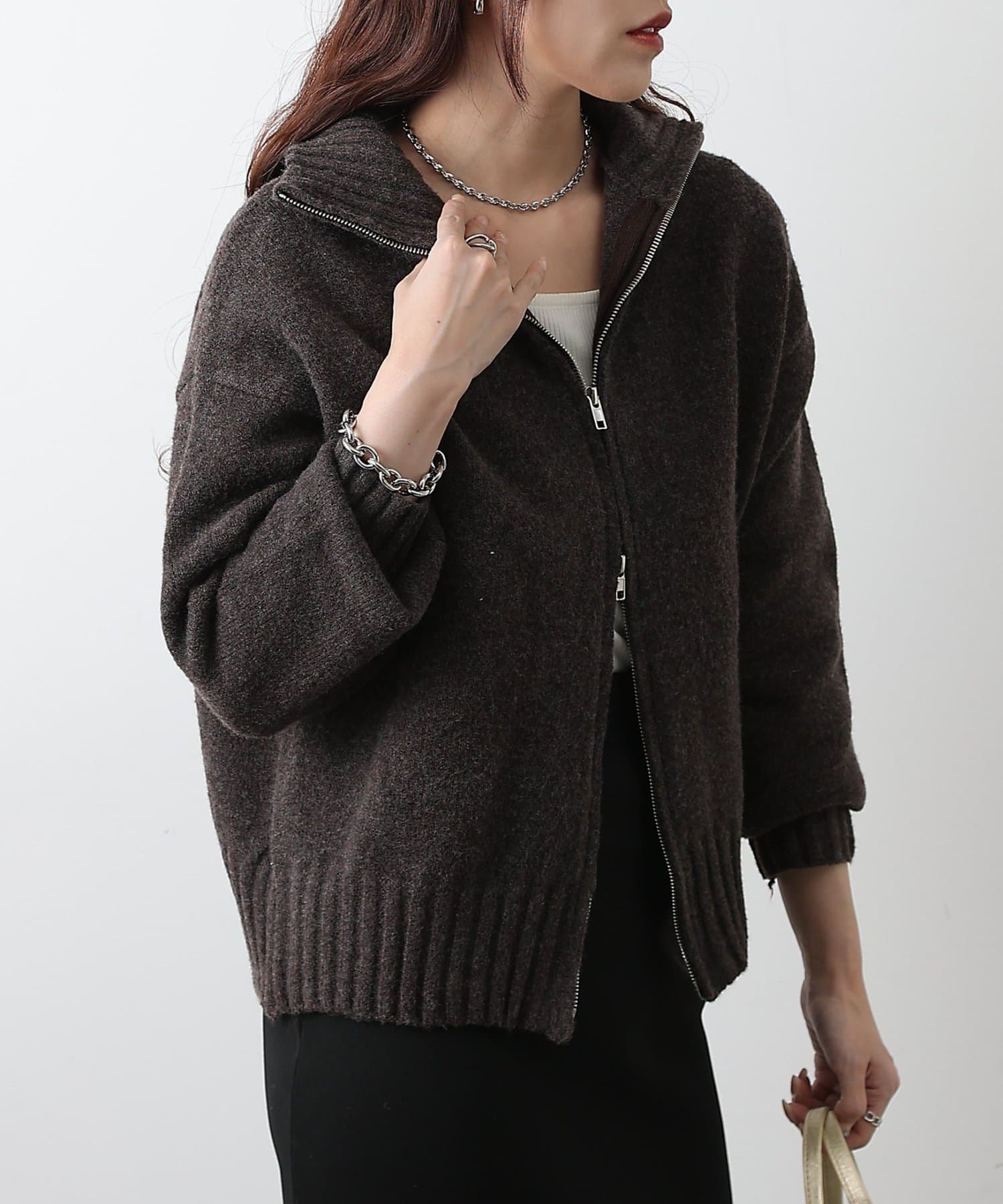 柔らかく暖かみのある素材感が魅力のダブルジップニットカーディガン。