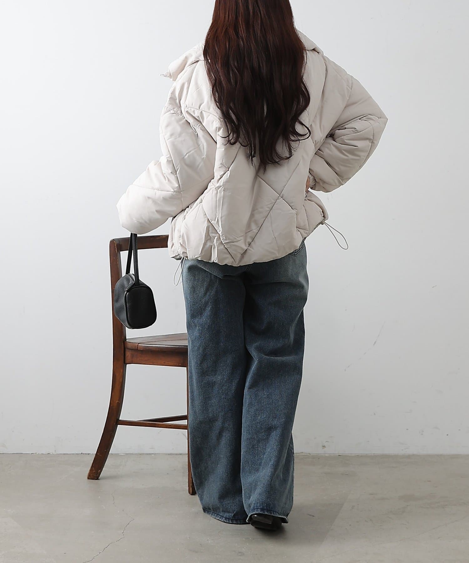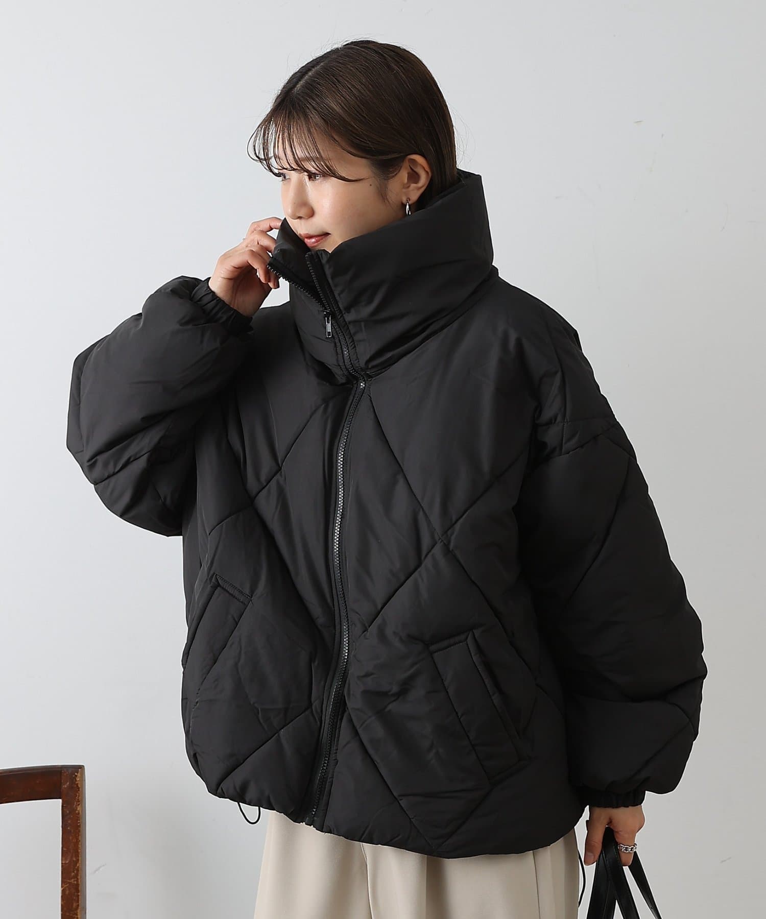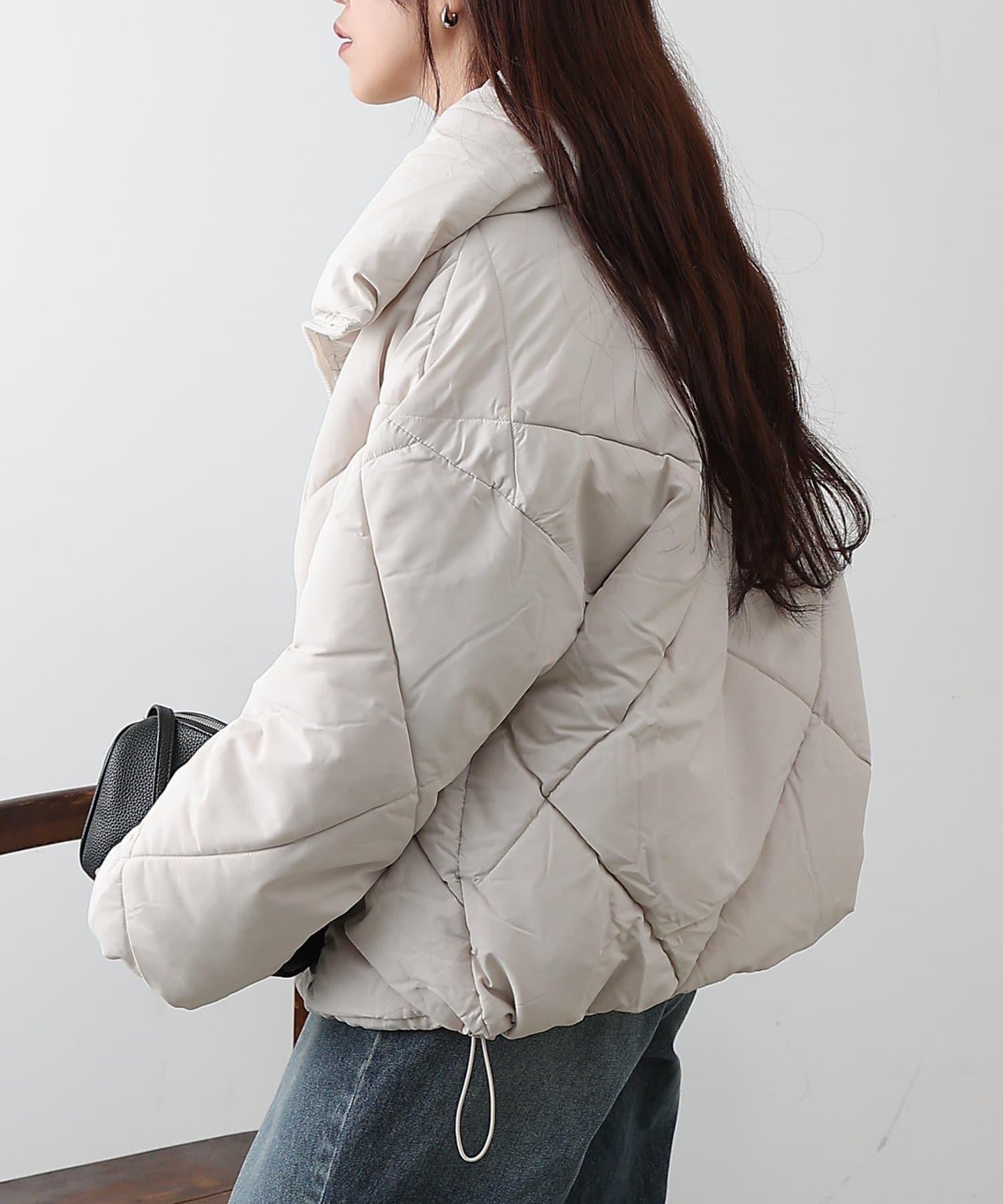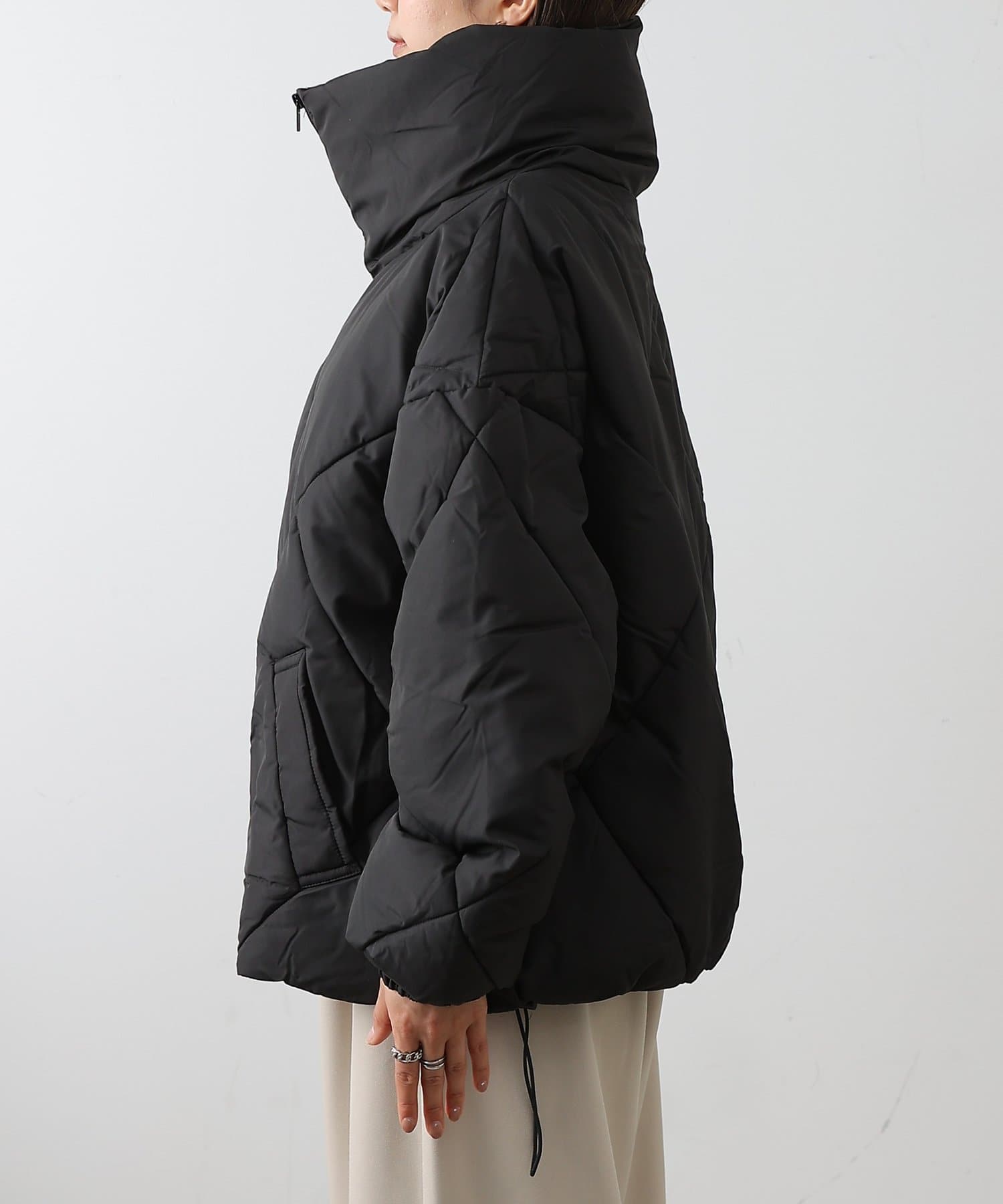 大きめのダイヤキルトの中綿ショートコートです。