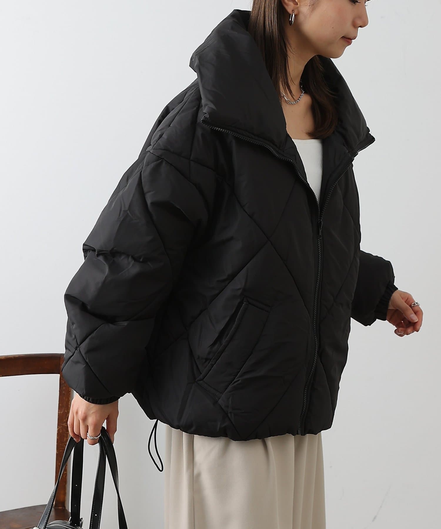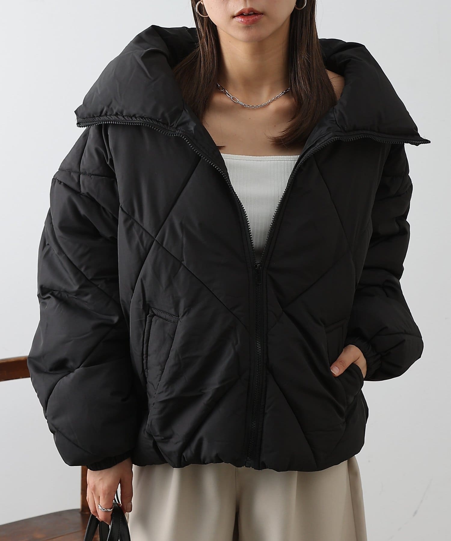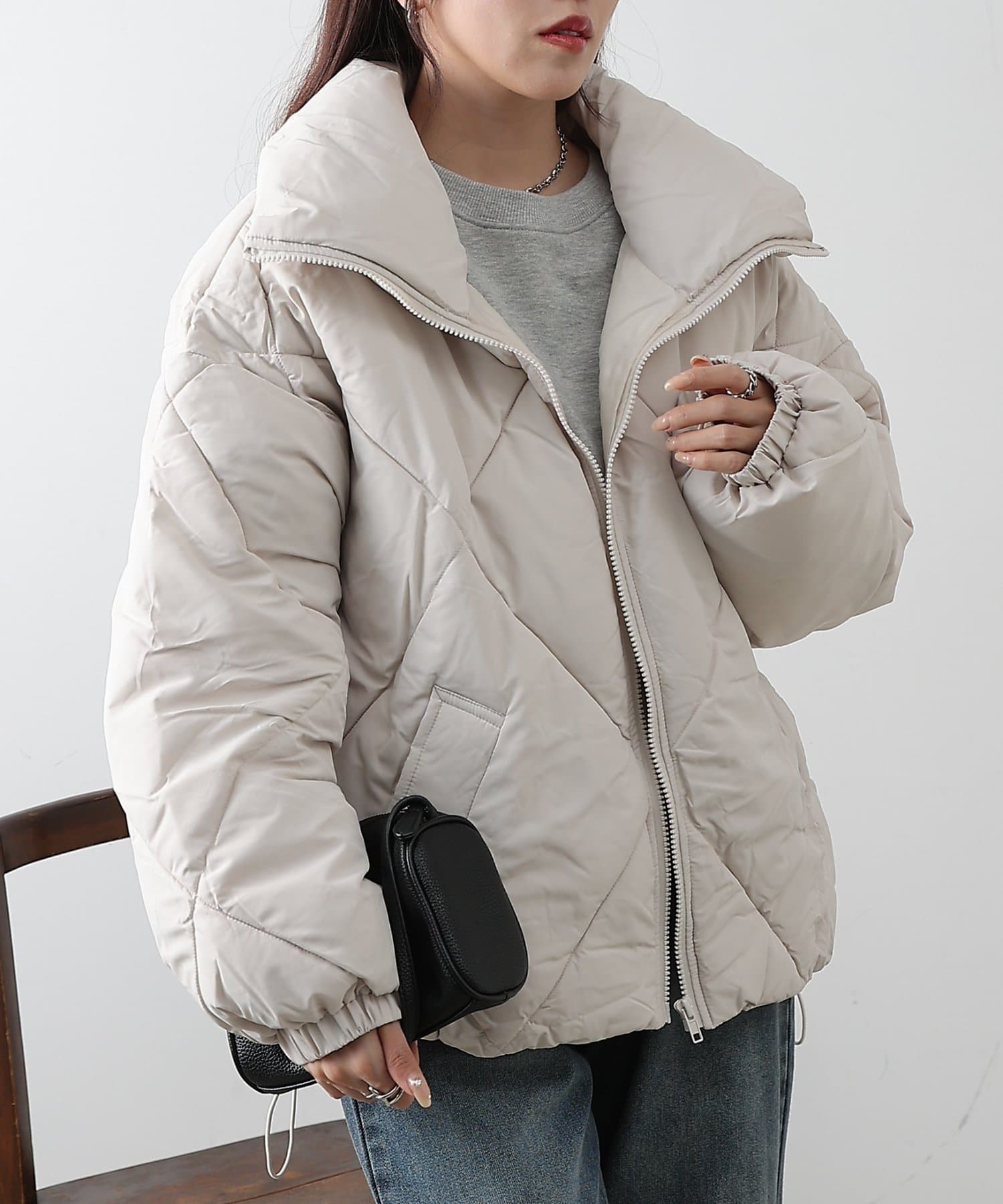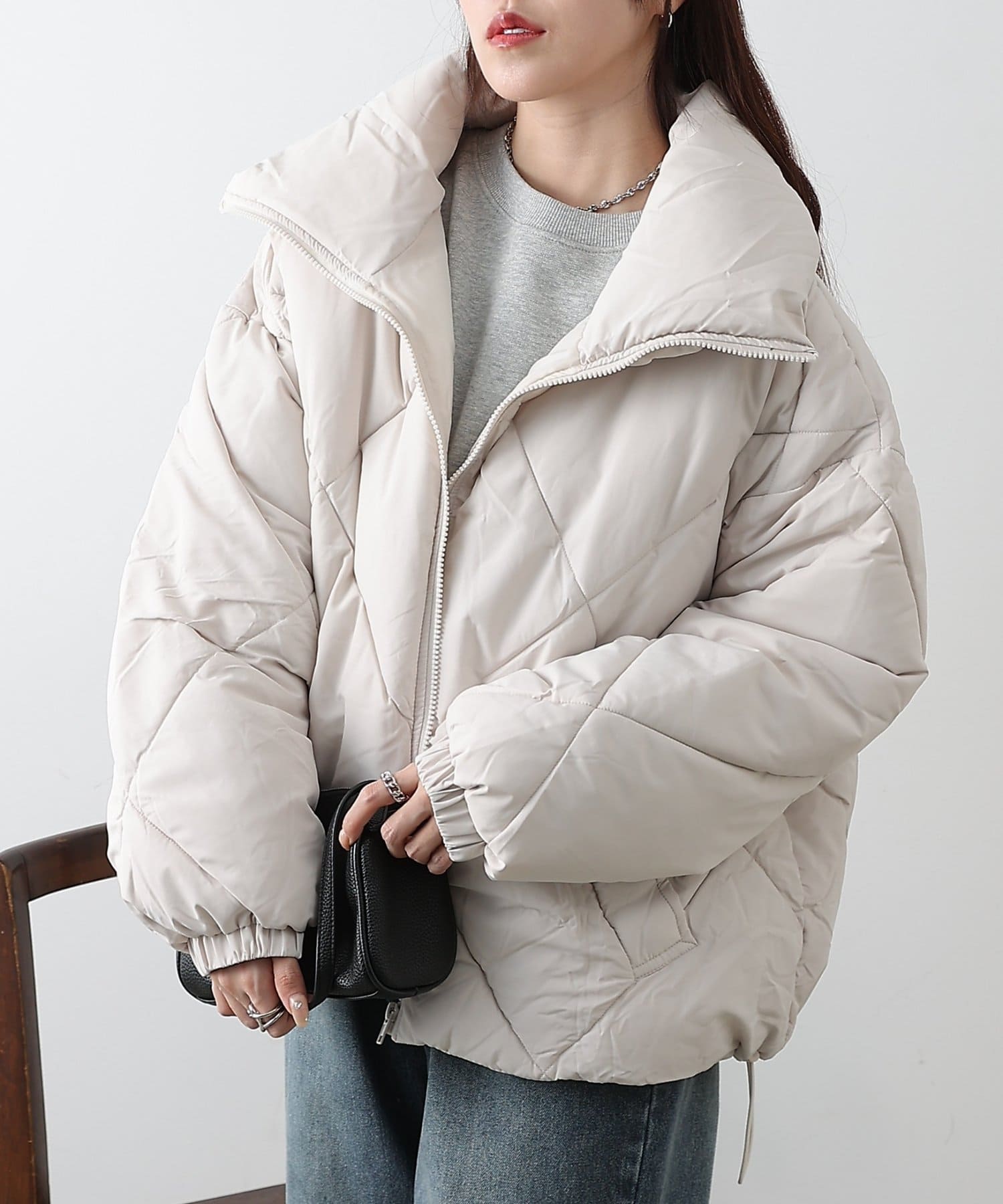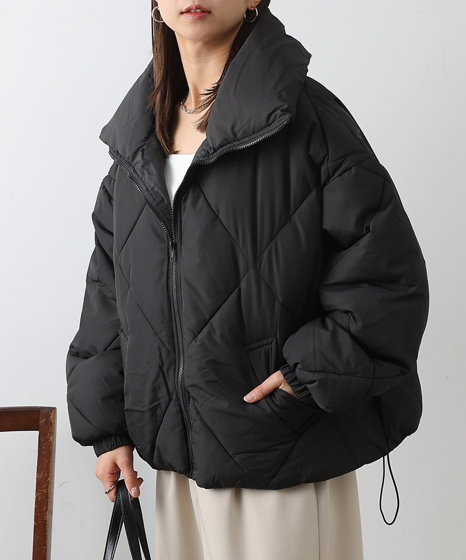 大きめのダイヤキルトの中綿ショートコートです。